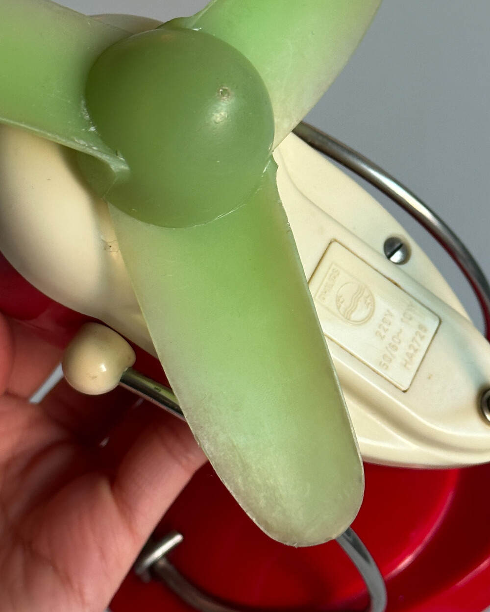 50년도 네덜란드에서 생산되었던 PHILIPS의 데스크 팬입니다. 레드 베이스와 그린 컬러의 3엽 날개으로 이루어져있는 매력적인 디자인입니다. 하단 손잡이를 통해 2단 풍량 조절이 가능합니다.