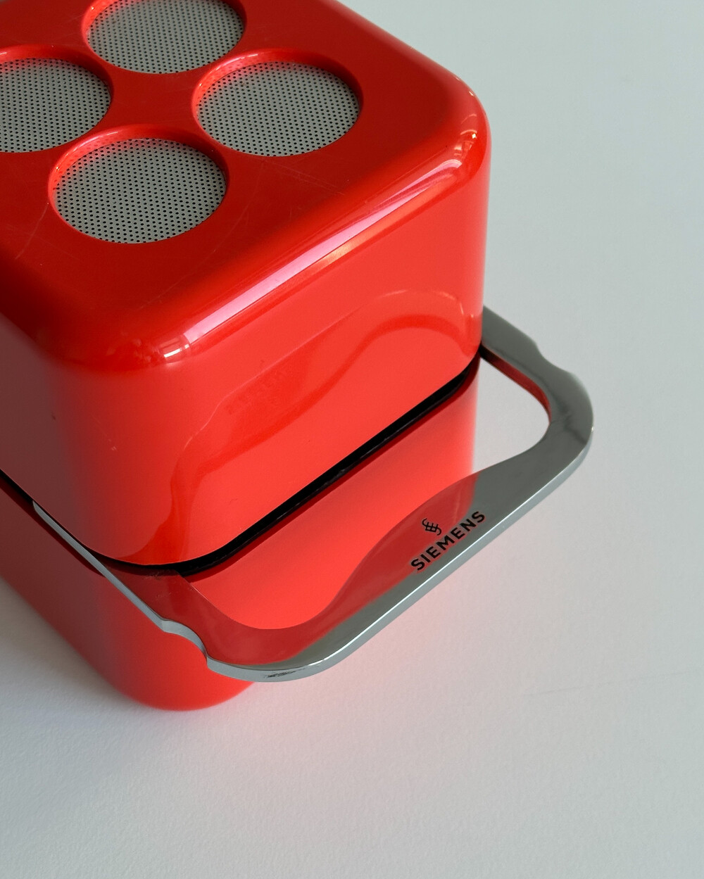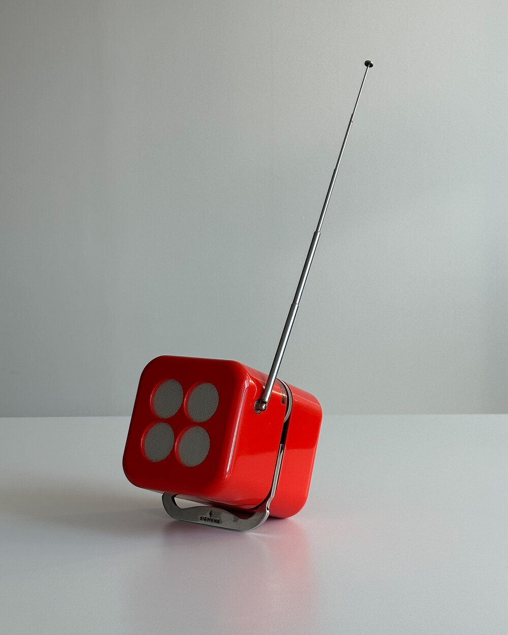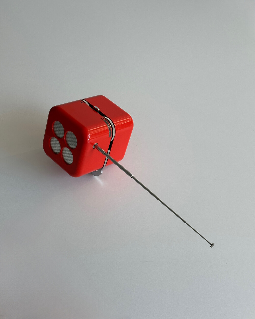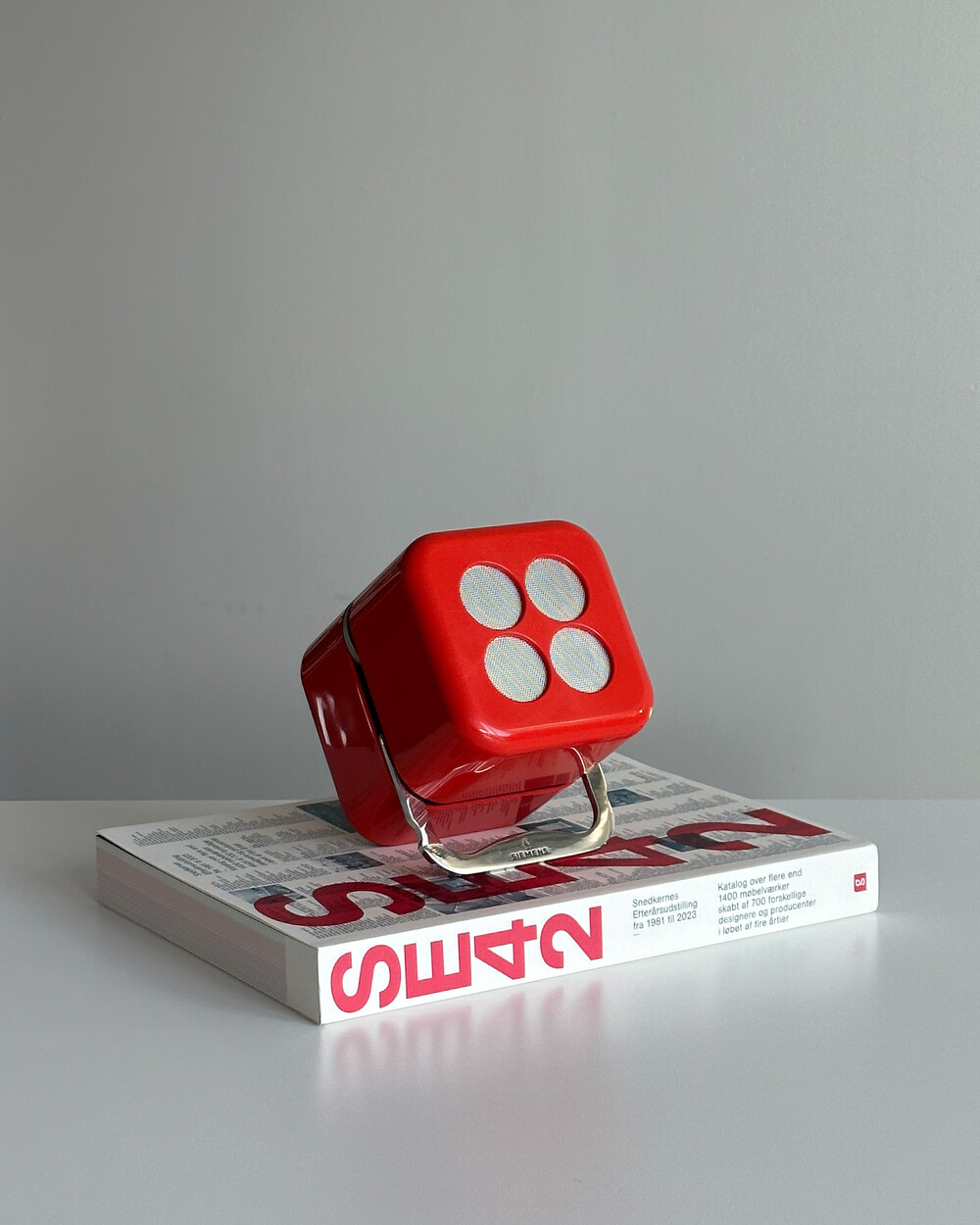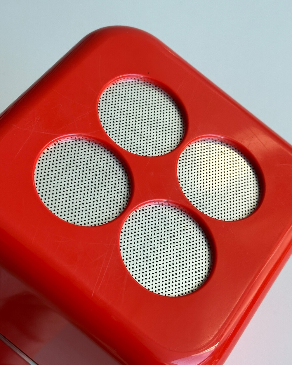 1970년도 SIEMENS 사에서 생산되었던 큐브 라디오Alpha 2입니다. 기술력과 함께 실용성과 조형적 가치 모두를 갖춘 희소한 아이템으로, 세계적인 산업디자이너 마리오 벨리니(Mario Bellini)에 의해 디자인되었습니다. 부드럽게 라운딩 처리된 정육면체 실루엣과 전면의 4개 스피커 그릴, 강렬한 레드 컬러 바디는 당시 스페이스 에이지 디자인의 미학을 잘 보여줍니다. 실사용 오디오 기기이자 디자인 오브제로서의 가치를 동시에 지니고 있습니다.