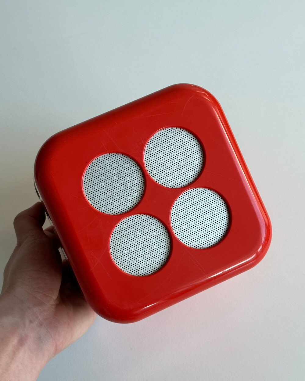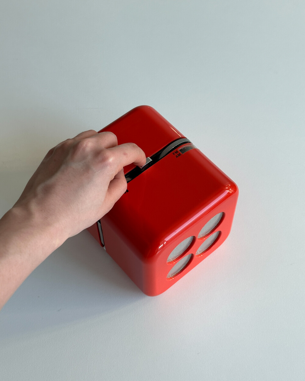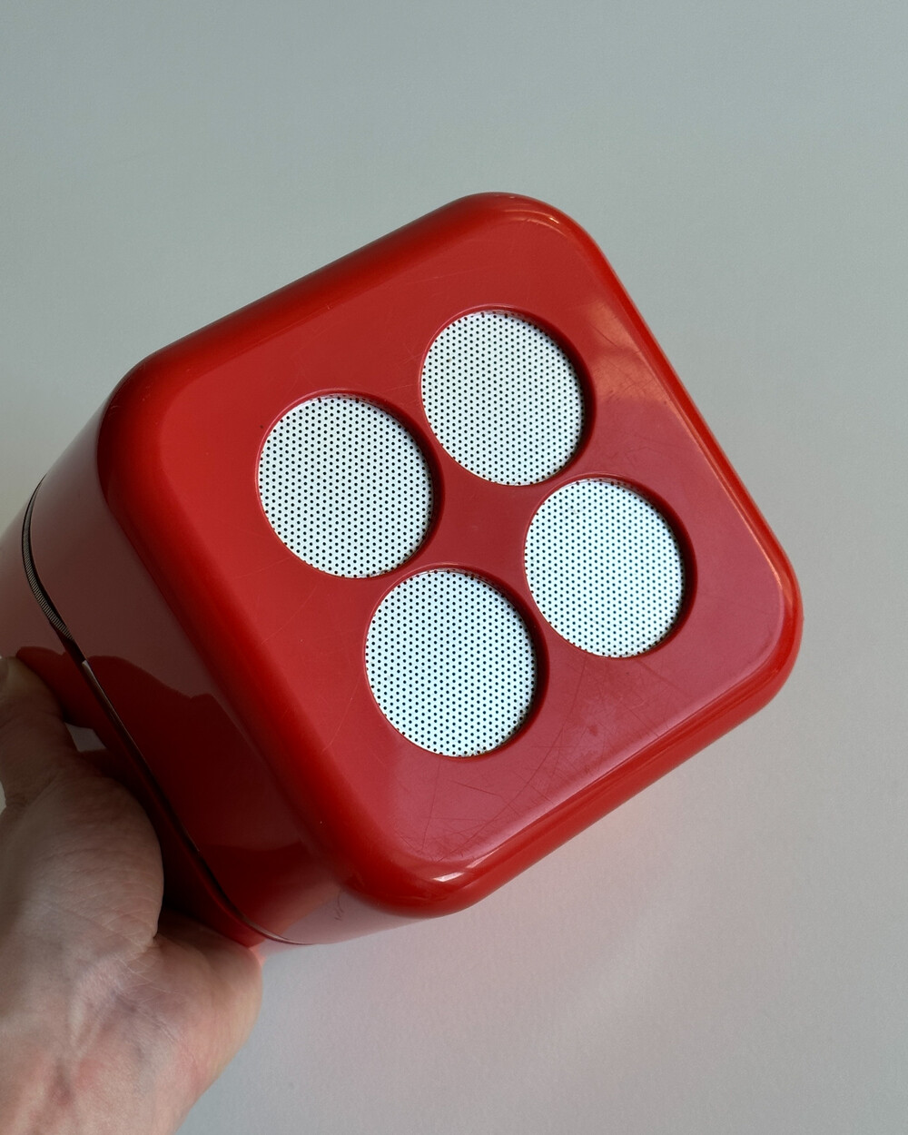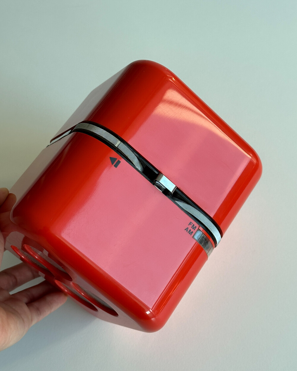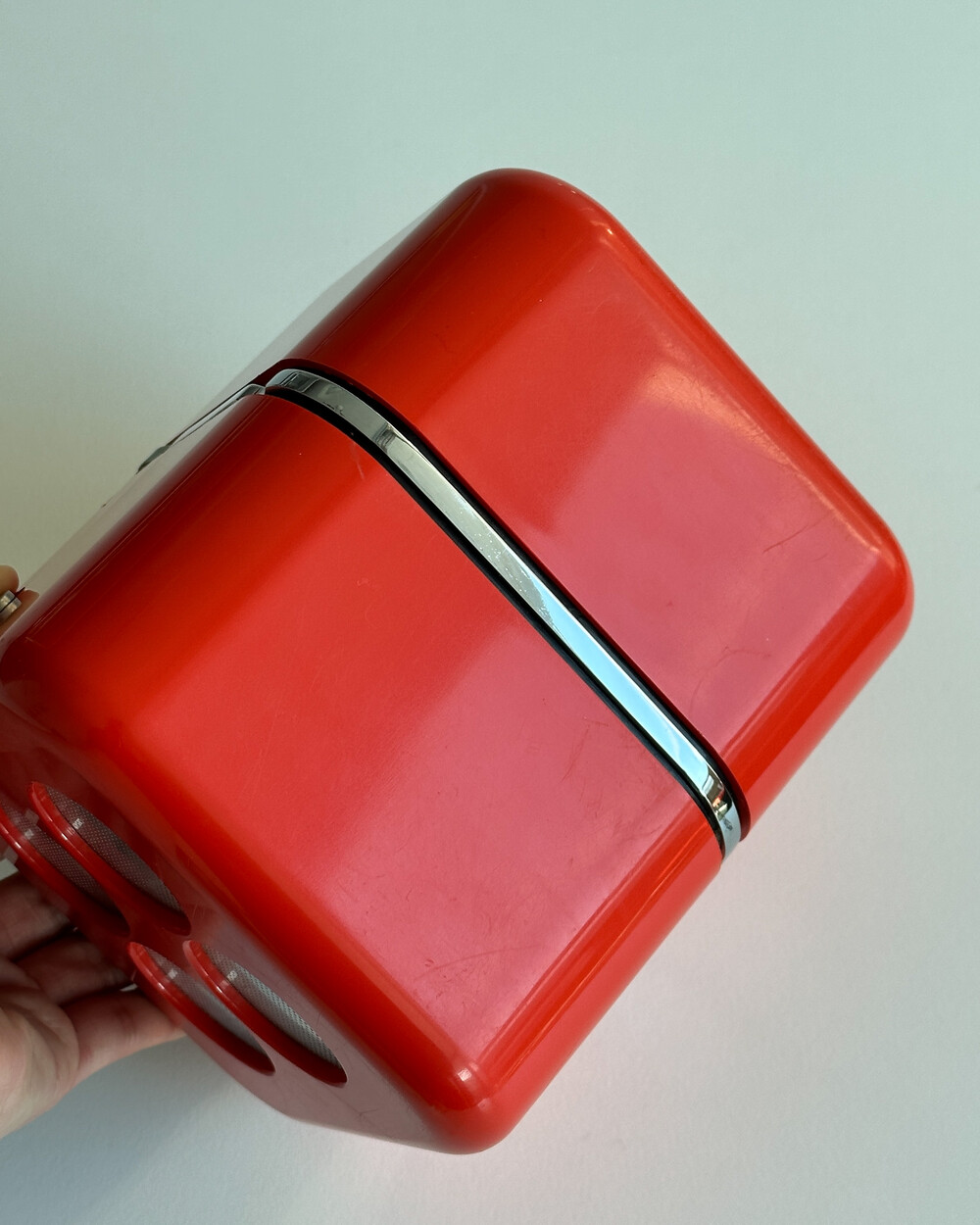 1970년도 SIEMENS 사에서 생산되었던 큐브 라디오Alpha 2입니다. 기술력과 함께 실용성과 조형적 가치 모두를 갖춘 희소한 아이템으로, 세계적인 산업디자이너 마리오 벨리니(Mario Bellini)에 의해 디자인되었습니다. 부드럽게 라운딩 처리된 정육면체 실루엣과 전면의 4개 스피커 그릴, 강렬한 레드 컬러 바디는 당시 스페이스 에이지 디자인의 미학을 잘 보여줍니다. 실사용 오디오 기기이자 디자인 오브제로서의 가치를 동시에 지니고 있습니다.