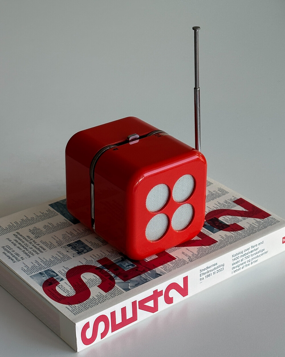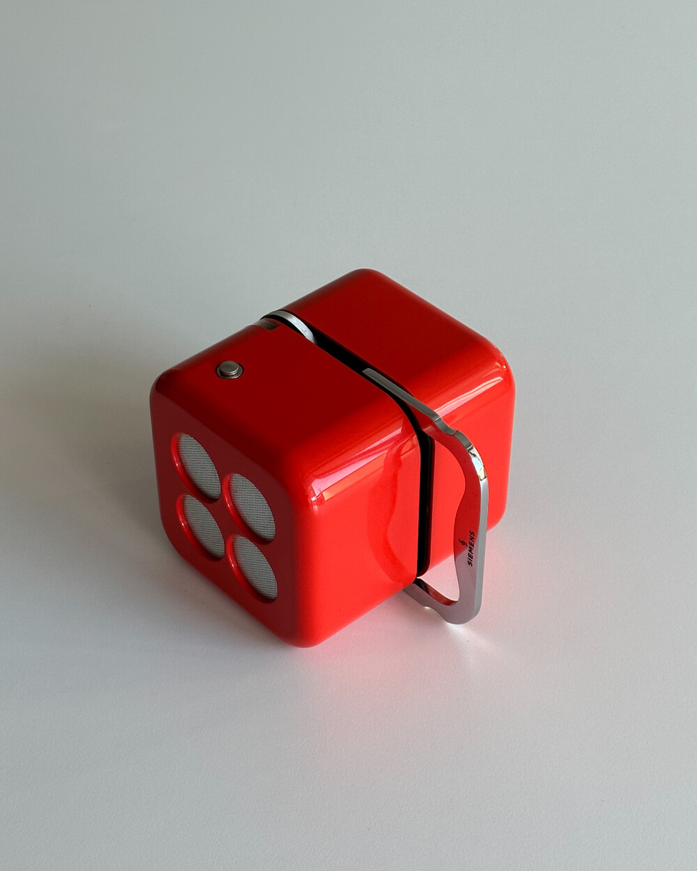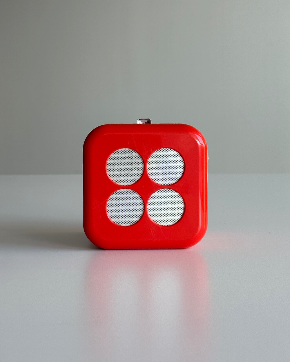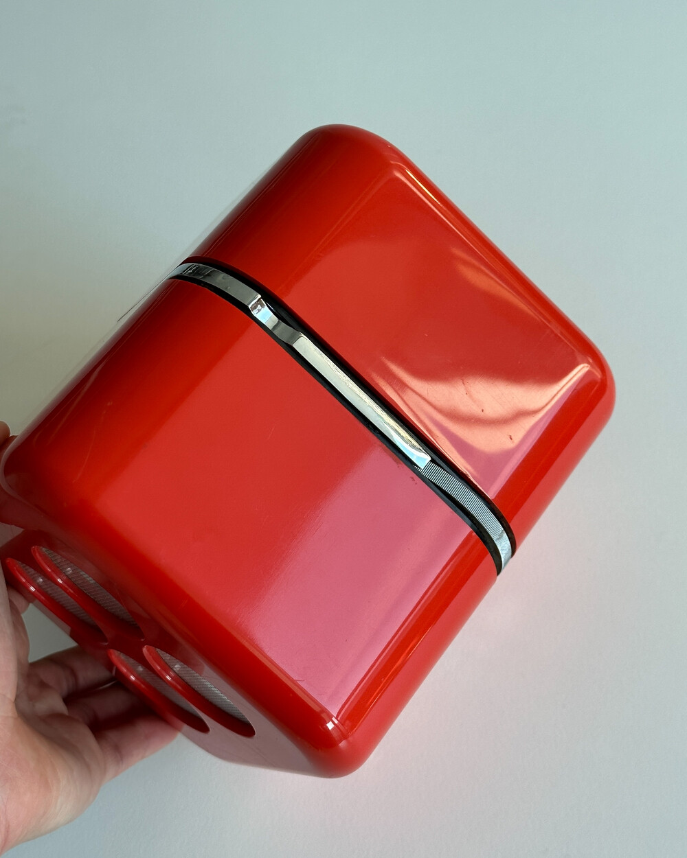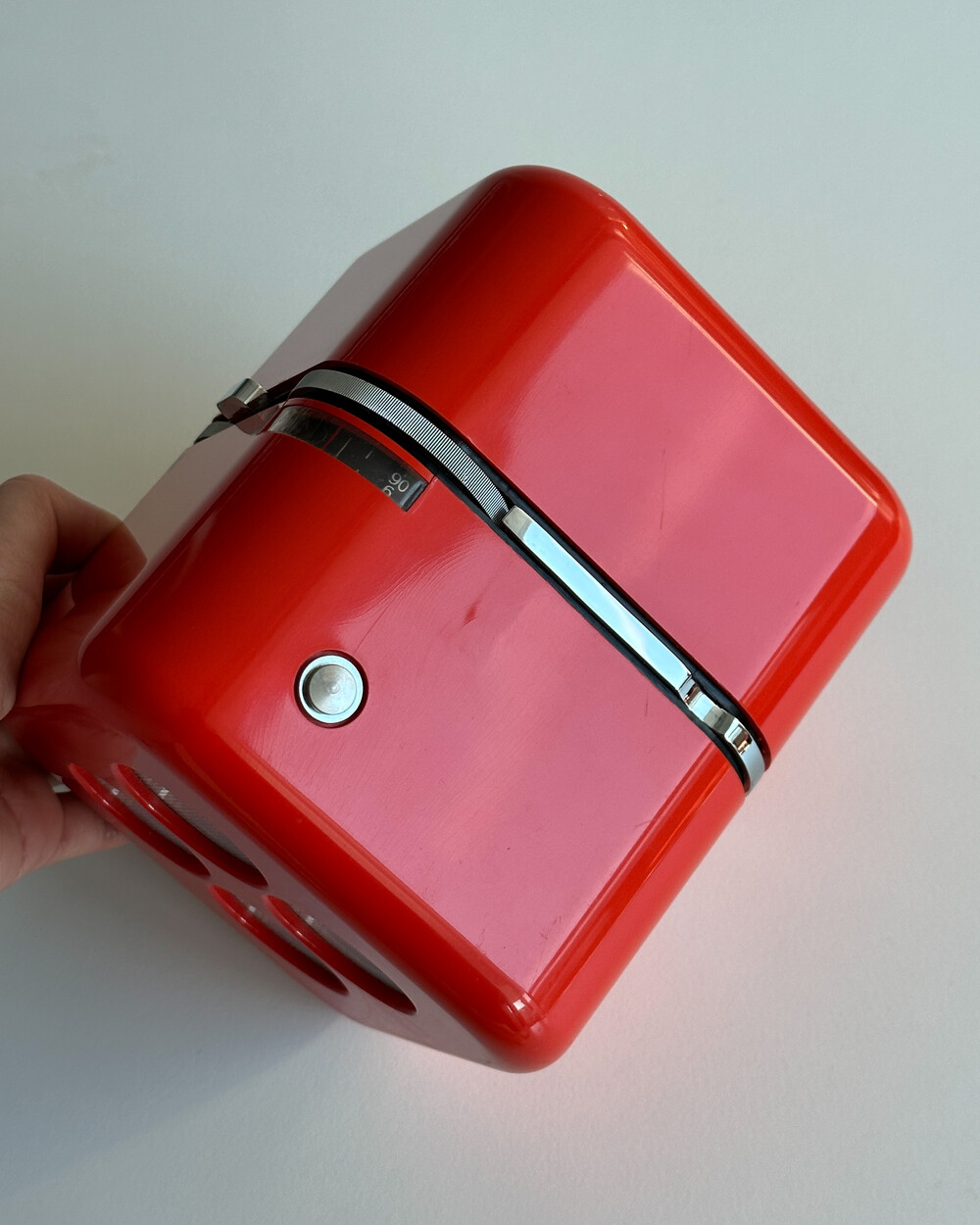1970년도 SIEMENS 사에서 생산되었던 큐브 라디오Alpha 2입니다. 기술력과 함께 실용성과 조형적 가치 모두를 갖춘 희소한 아이템으로, 세계적인 산업디자이너 마리오 벨리니(Mario Bellini)에 의해 디자인되었습니다. 부드럽게 라운딩 처리된 정육면체 실루엣과 전면의 4개 스피커 그릴, 강렬한 레드 컬러 바디는 당시 스페이스 에이지 디자인의 미학을 잘 보여줍니다. 실사용 오디오 기기이자 디자인 오브제로서의 가치를 동시에 지니고 있습니다.