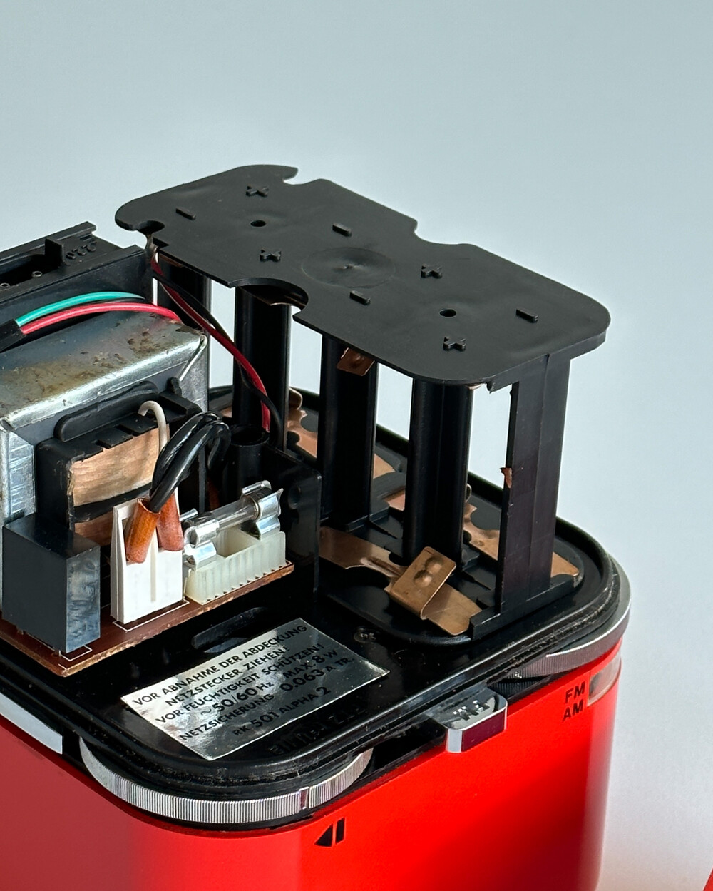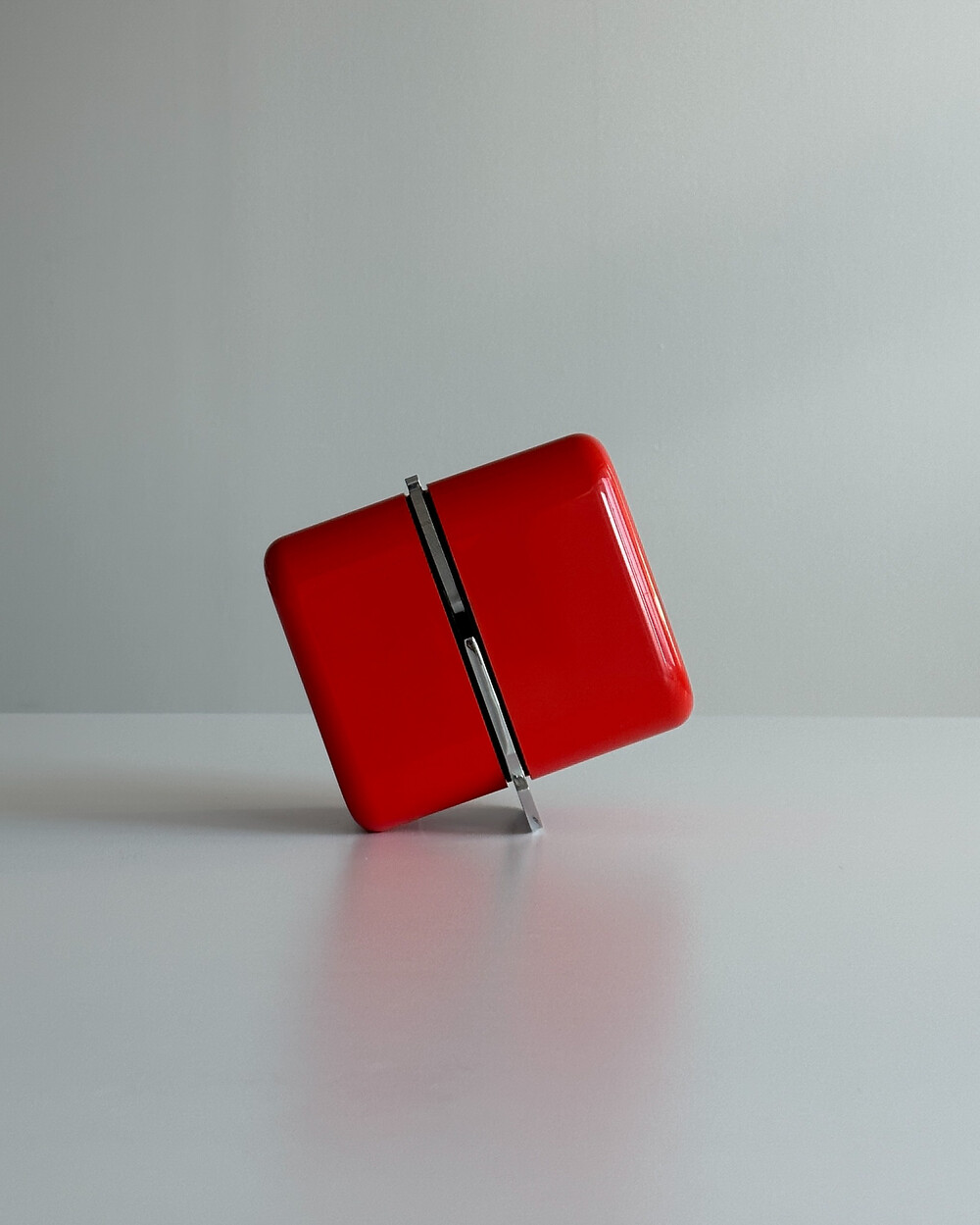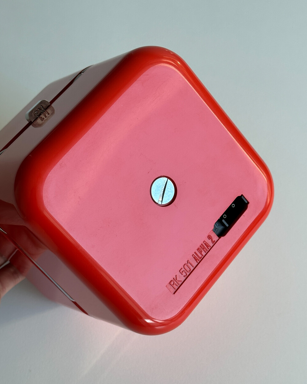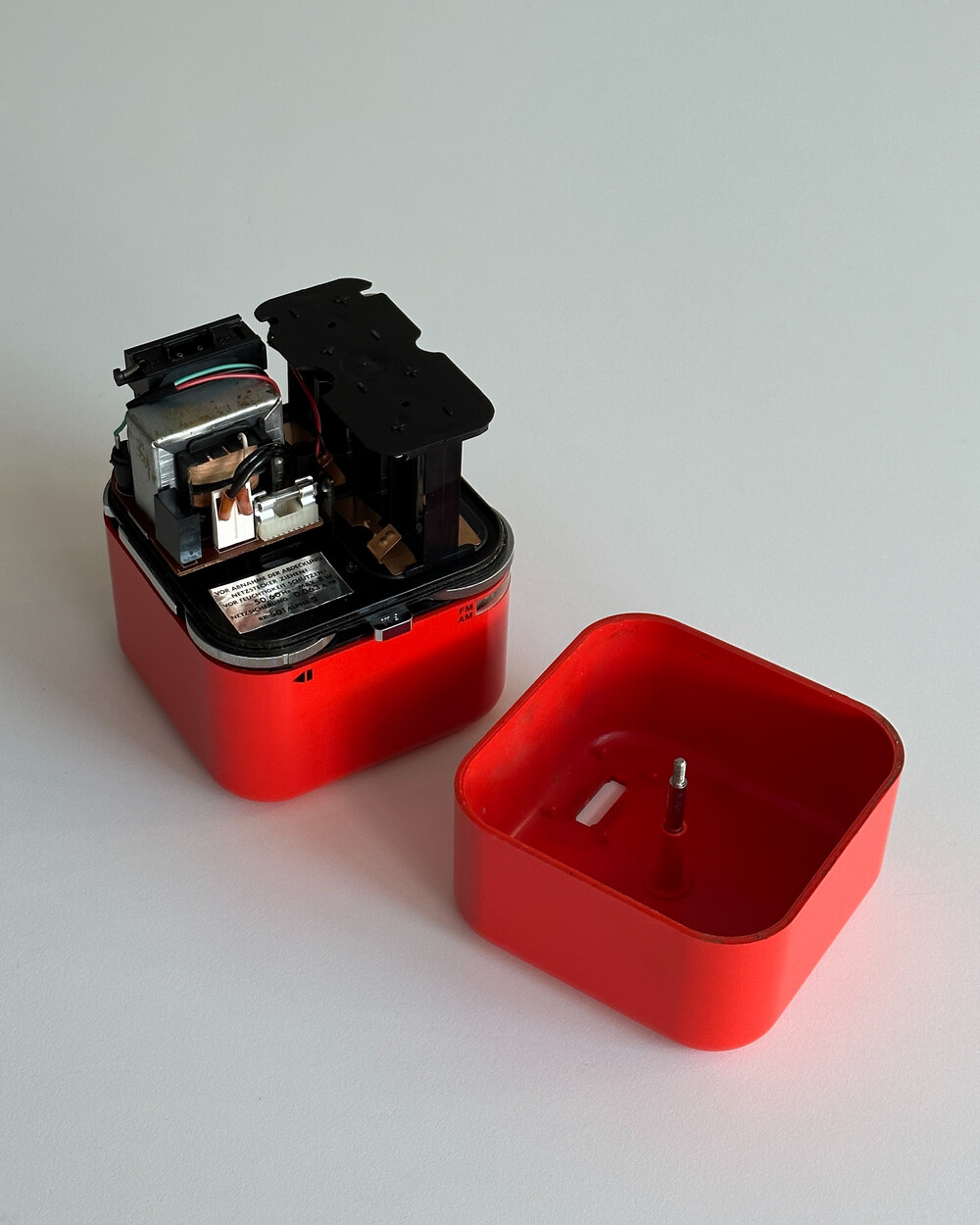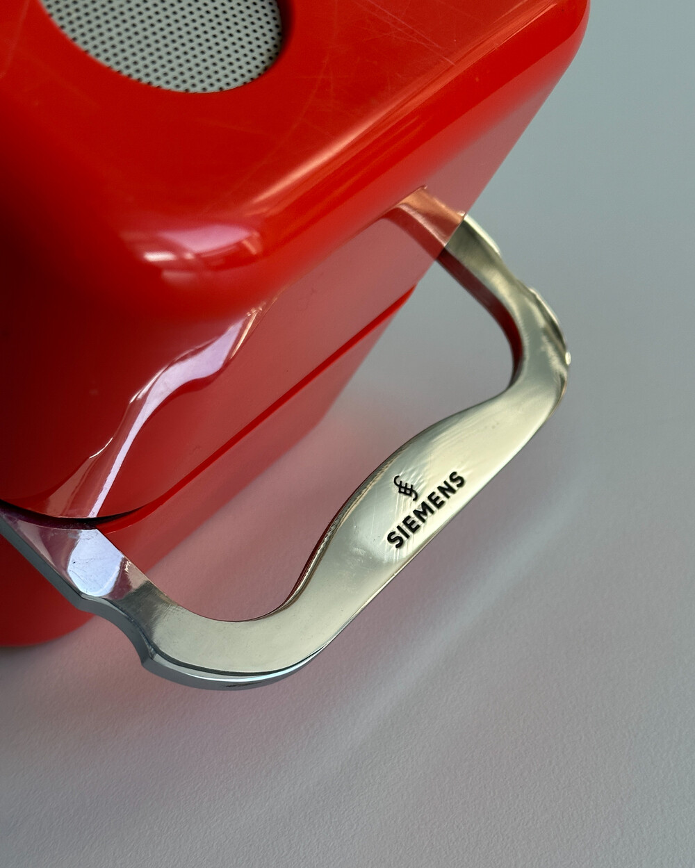 1970년도 SIEMENS 사에서 생산되었던 큐브 라디오Alpha 2입니다. 기술력과 함께 실용성과 조형적 가치 모두를 갖춘 희소한 아이템으로, 세계적인 산업디자이너 마리오 벨리니(Mario Bellini)에 의해 디자인되었습니다. 부드럽게 라운딩 처리된 정육면체 실루엣과 전면의 4개 스피커 그릴, 강렬한 레드 컬러 바디는 당시 스페이스 에이지 디자인의 미학을 잘 보여줍니다. 실사용 오디오 기기이자 디자인 오브제로서의 가치를 동시에 지니고 있습니다.