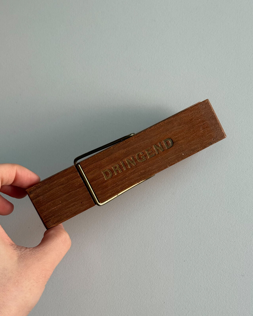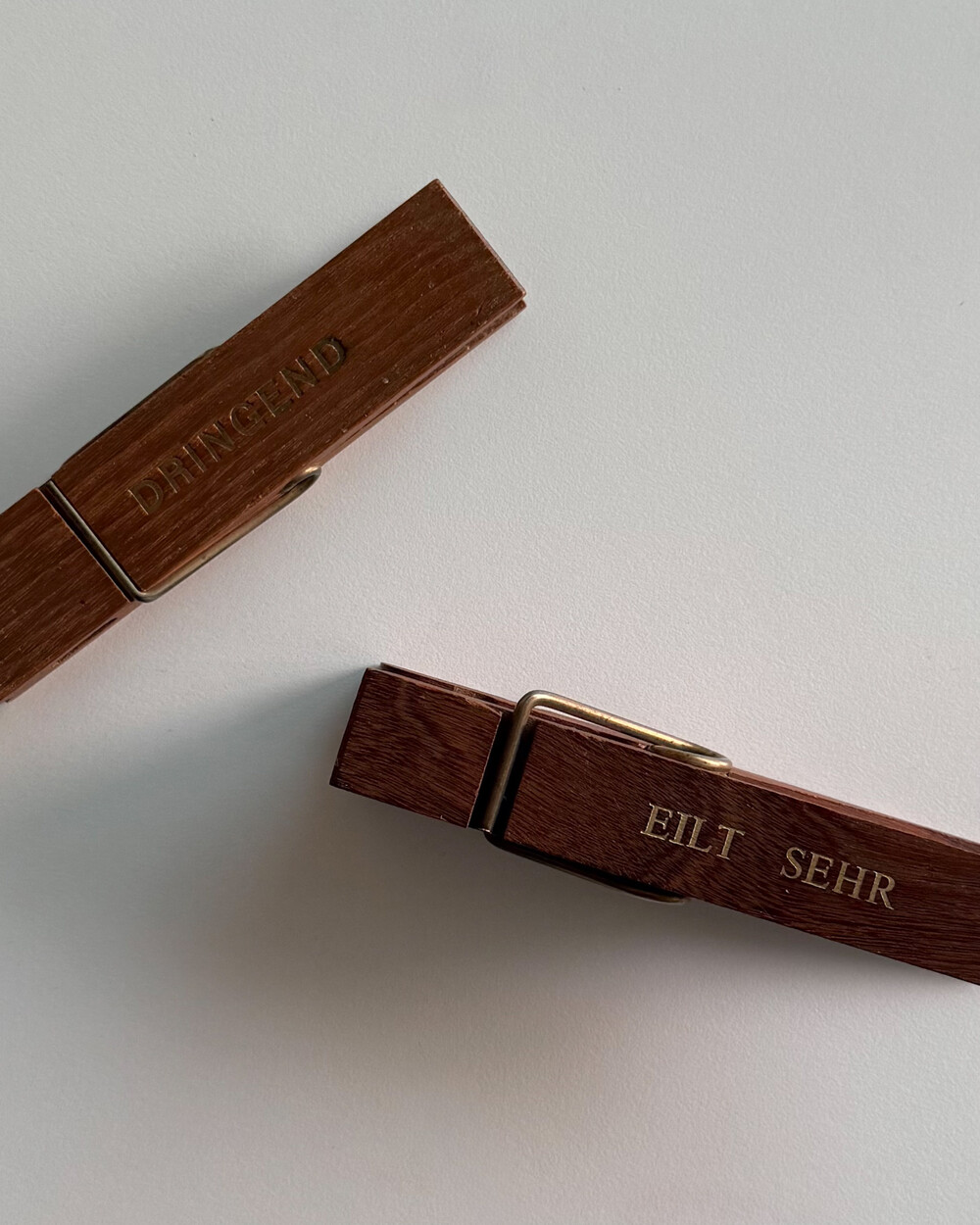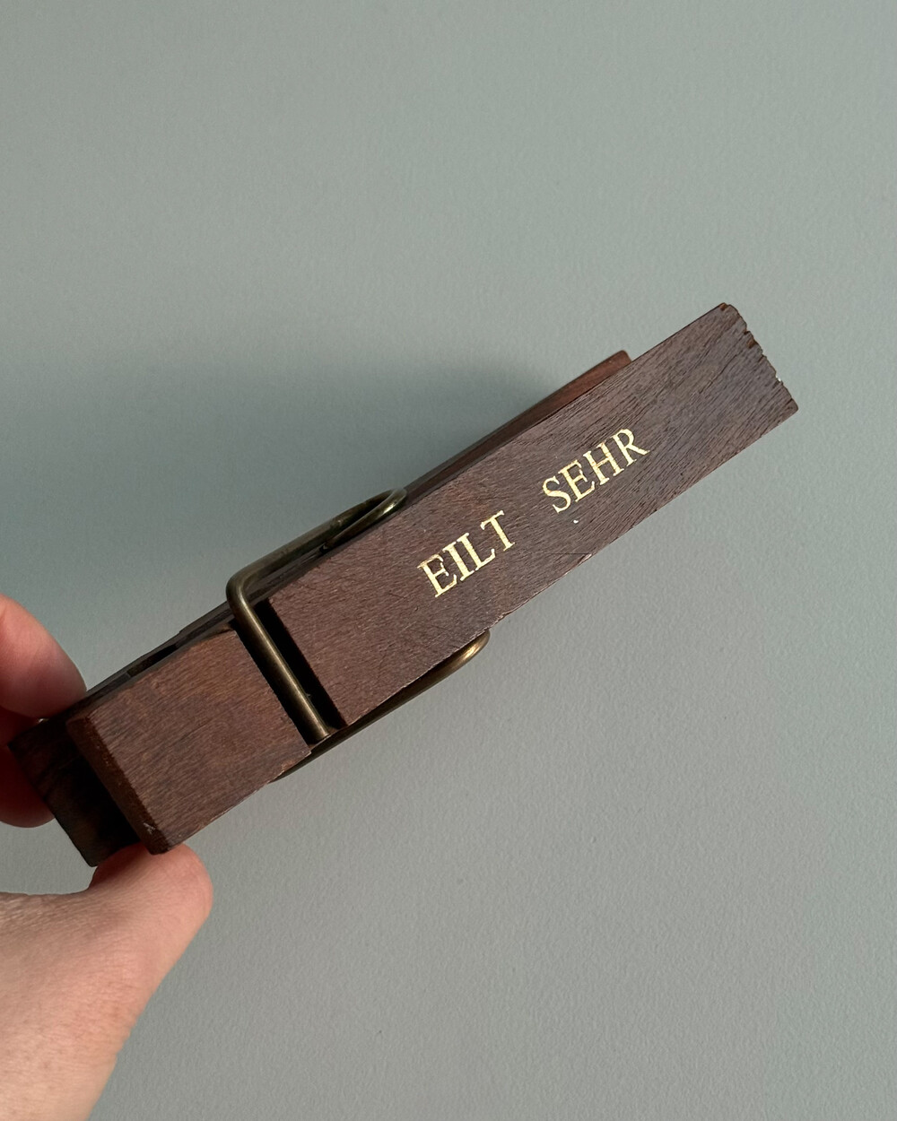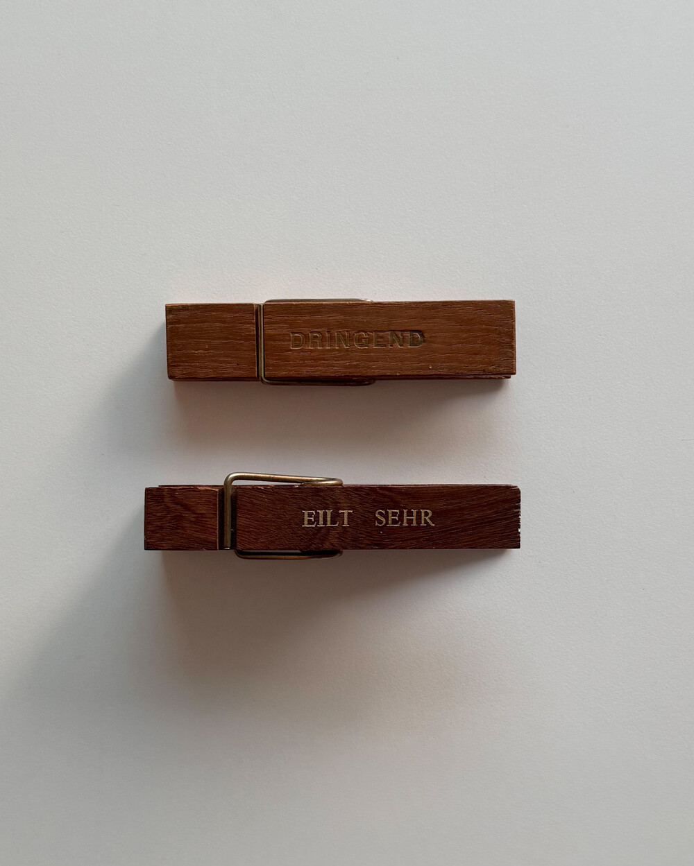 60년도 생산되었던 빈티지 클립입니다. 클립에 각인되어 있는 'DRINGEND, EILT SEHR'는 독일어로 각각 '긴급, 매우 급함'을 뜻합니다. 서류나 우편물 위쪽에 끼워 중요도를 표시하던 용도로 사용되었으며, 후면에 홈이 있어 벽에 걸어서도 인테리어 오브제로 활용이 가능합니다.
