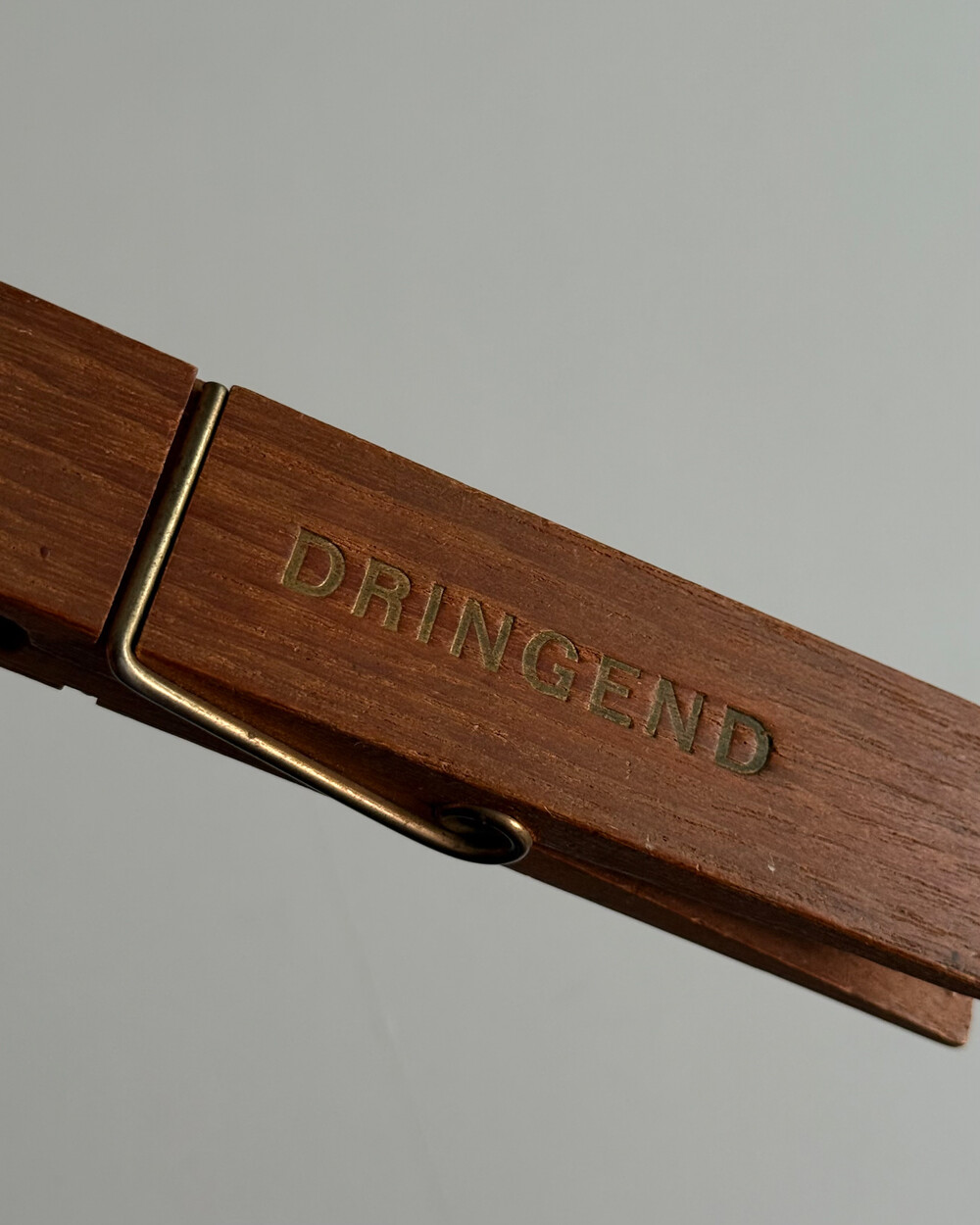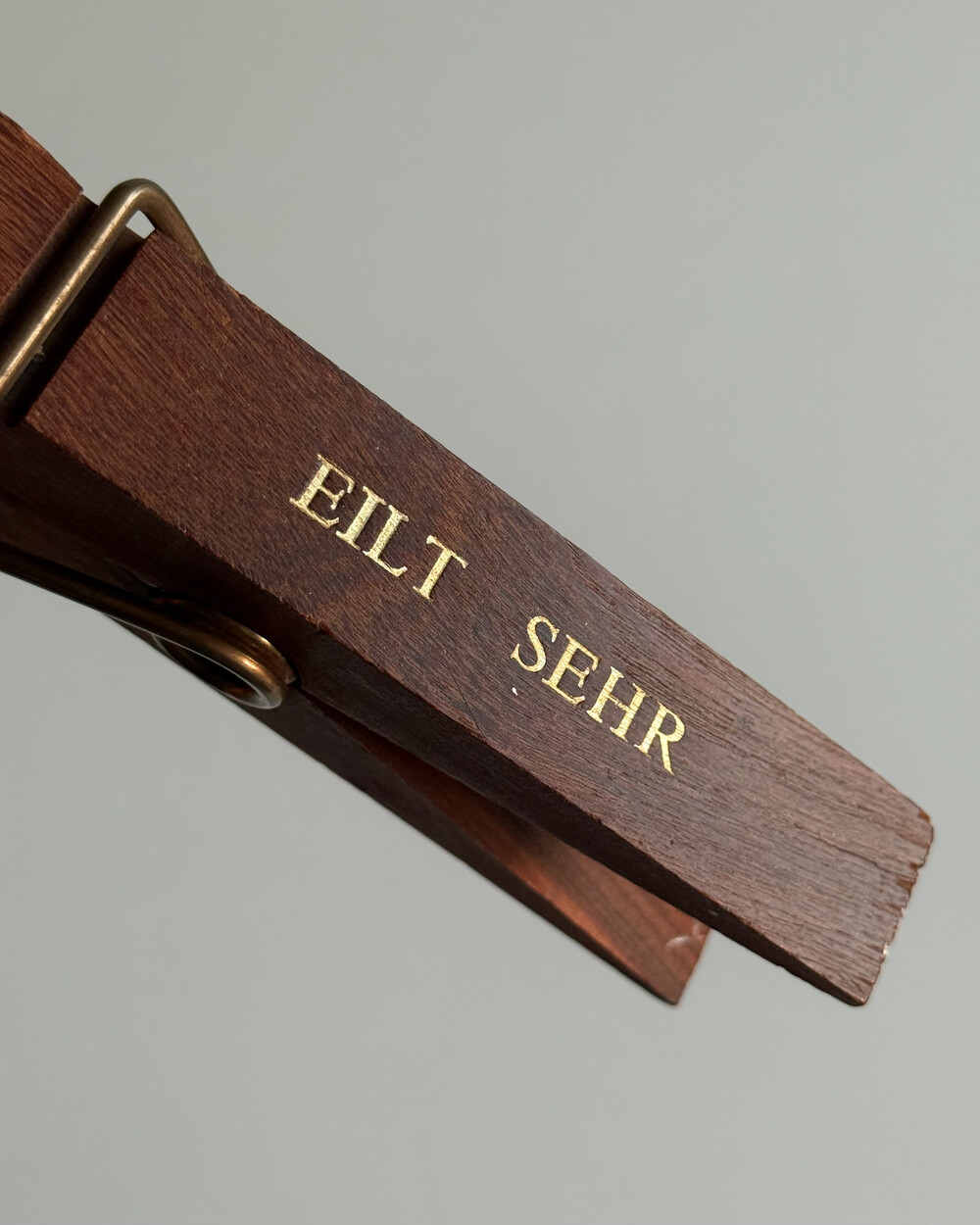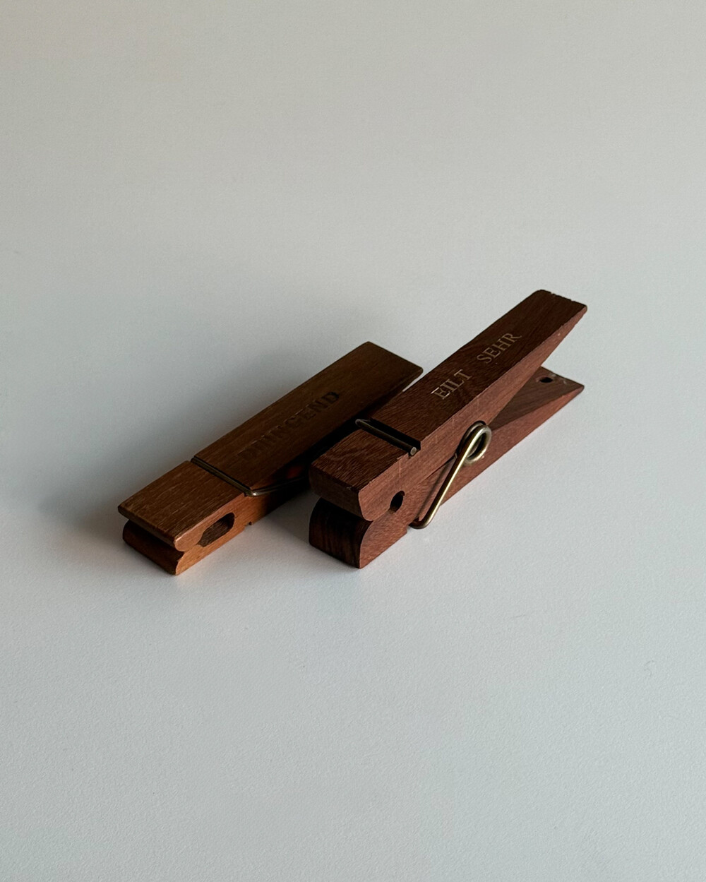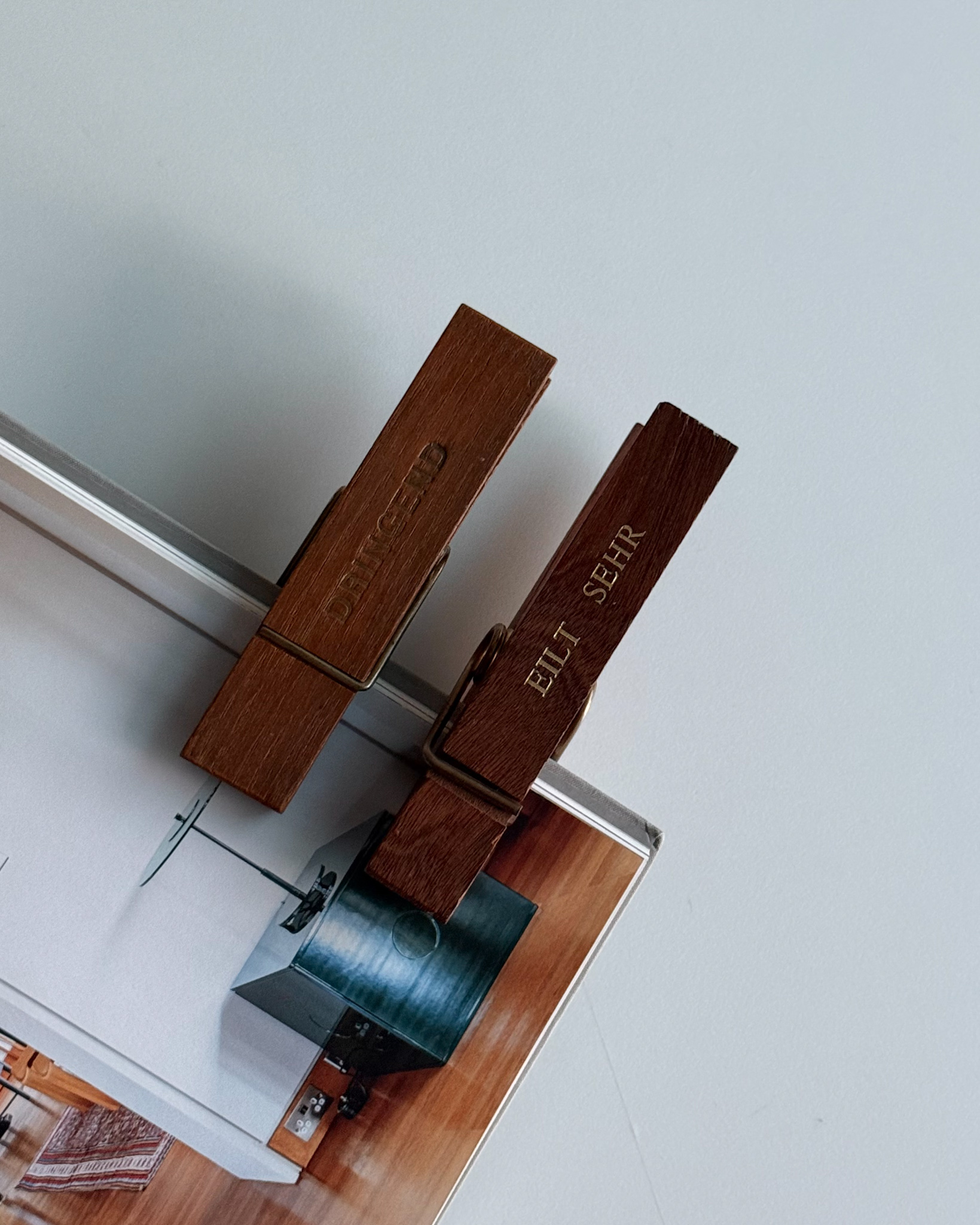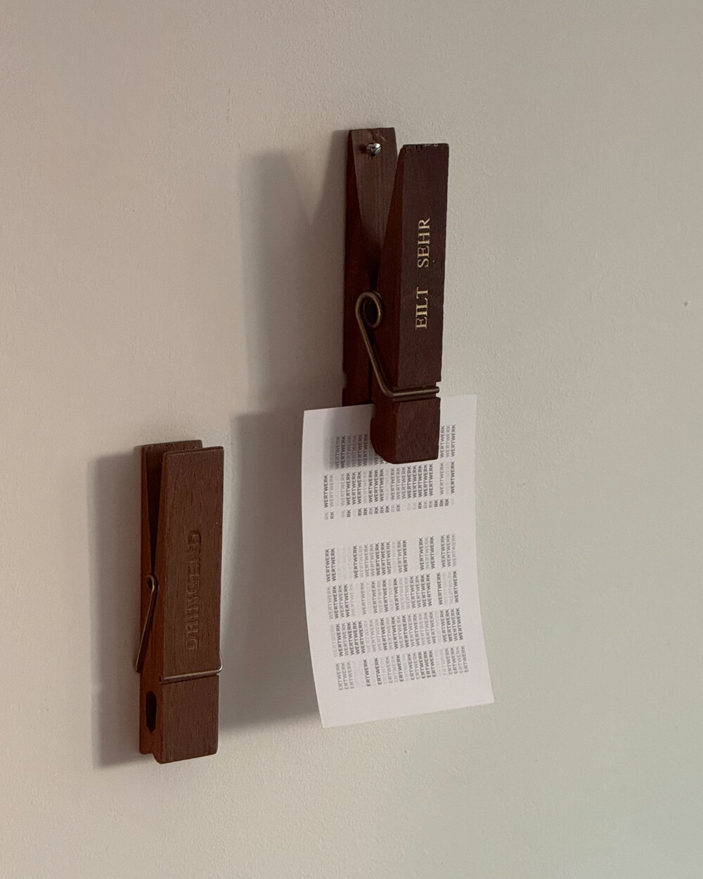 60년도 생산되었던 빈티지 클립입니다. 클립에 각인되어 있는 'DRINGEND, EILT SEHR'는 독일어로 각각 '긴급, 매우 급함'을 뜻합니다. 서류나 우편물 위쪽에 끼워 중요도를 표시하던 용도로 사용되었으며, 후면에 홈이 있어 벽에 걸어서도 인테리어 오브제로 활용이 가능합니다.