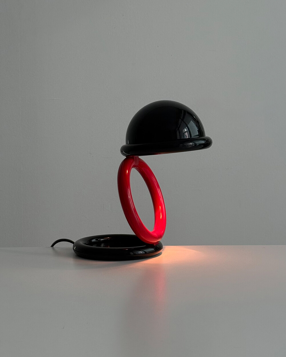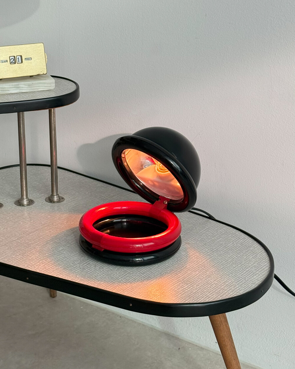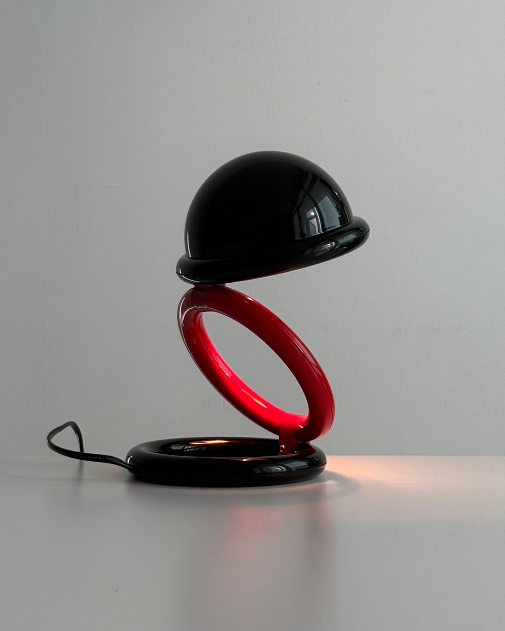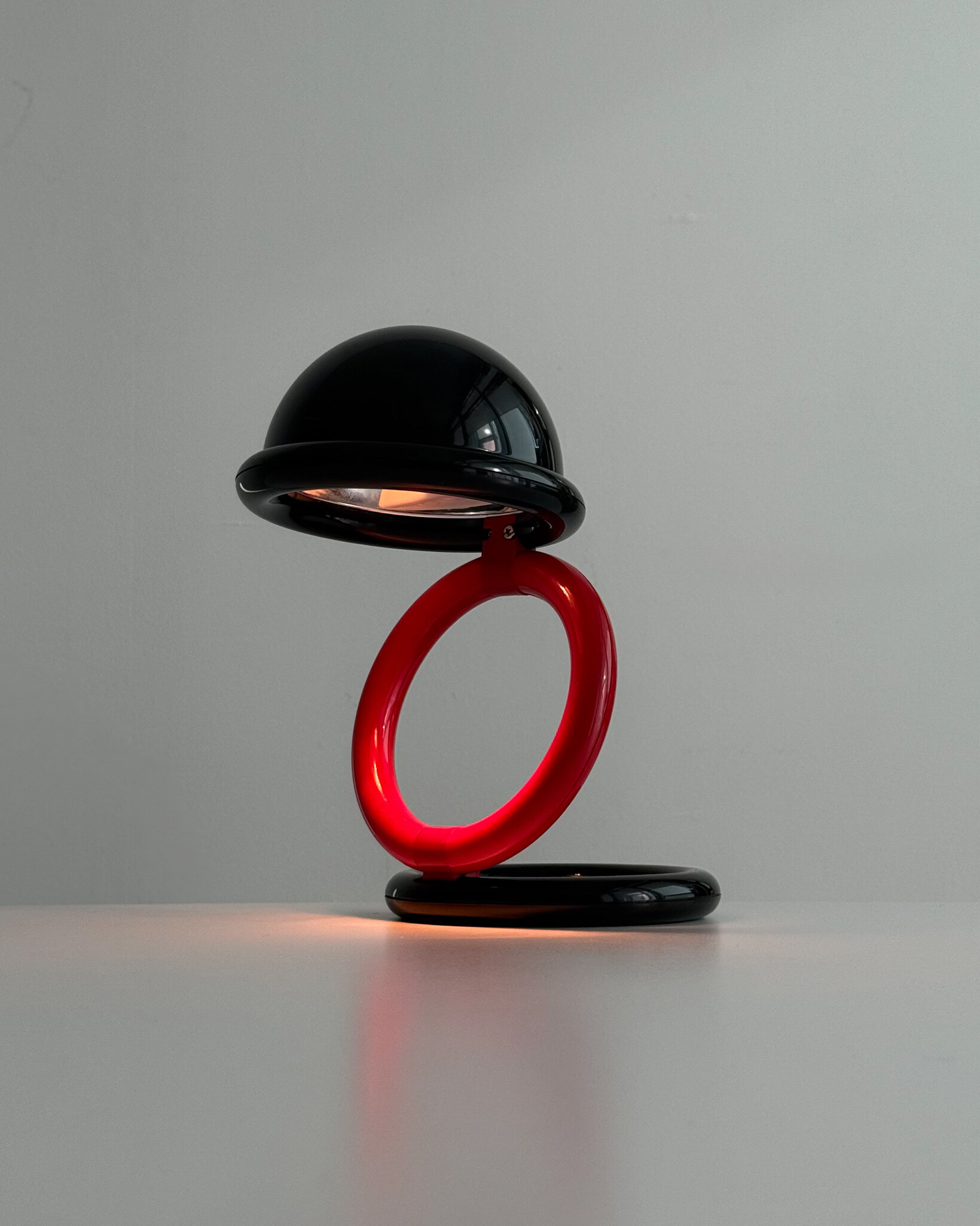1980년대 독일에서 제작된 빈티지 테이블 램프입니다. 블랙 컬러의 돔 형태 상부와 레드 컬러의 링 구조가 결합된 유선형태로 이루어져 있습니다. 상부를 열면 점등되고 닫으면 소등되는 클램셸 구조로, 각도 조절을 통해 빛을 제어할 수 있습니다. 블랙과 레드 컬러 대비와 독특한 형태가 어우러져 공간에 포인트를 더해줍니다.