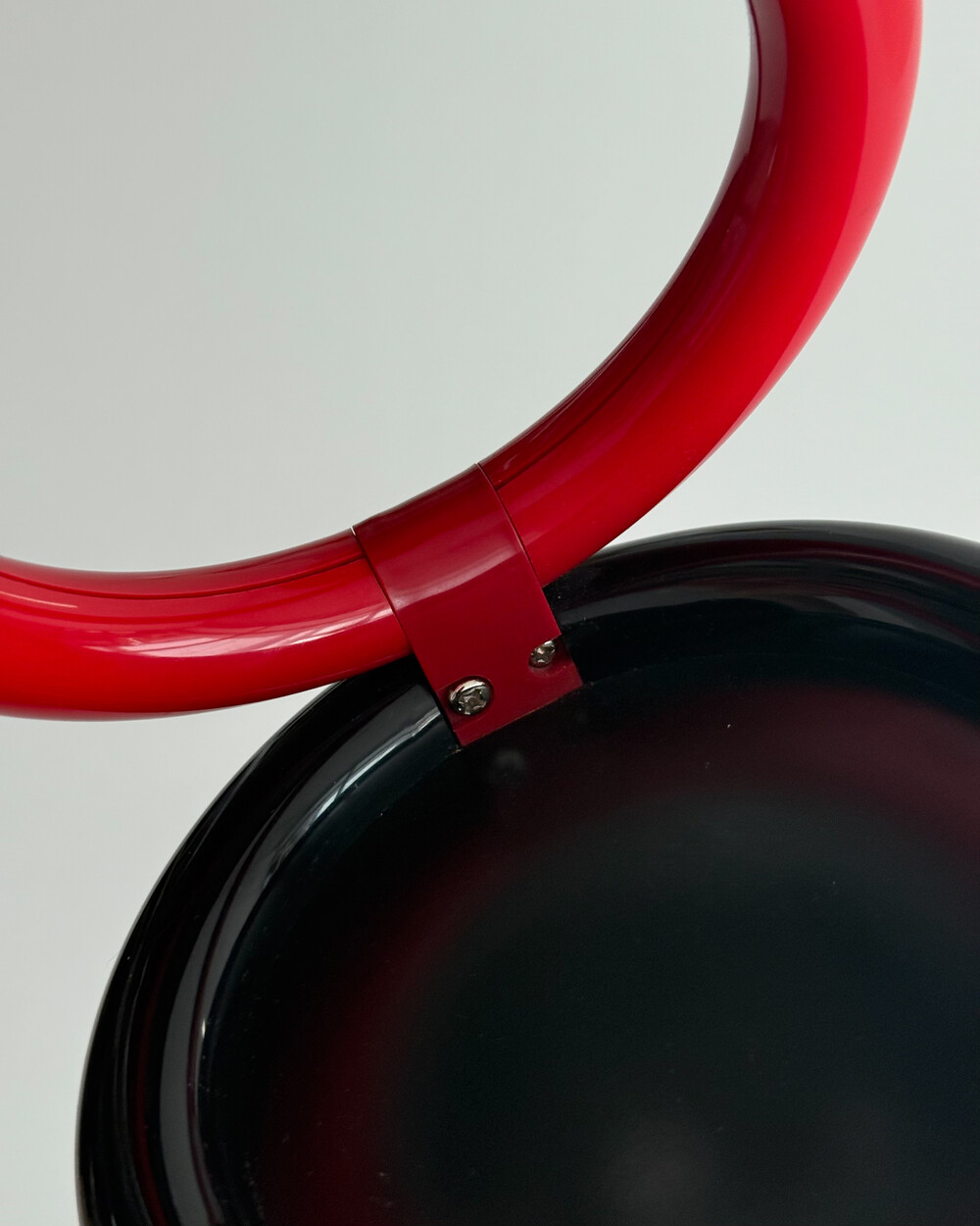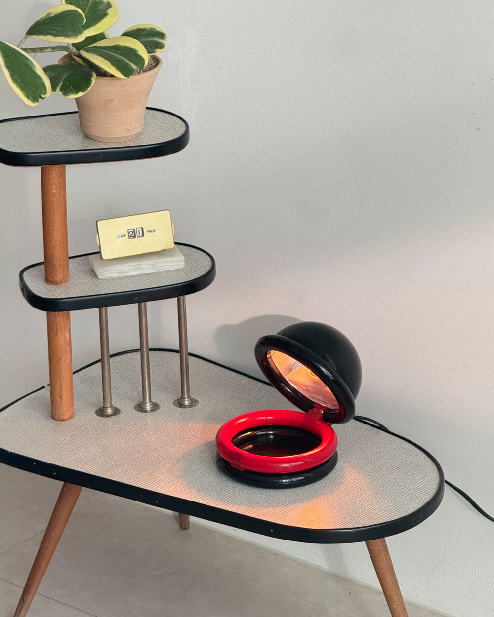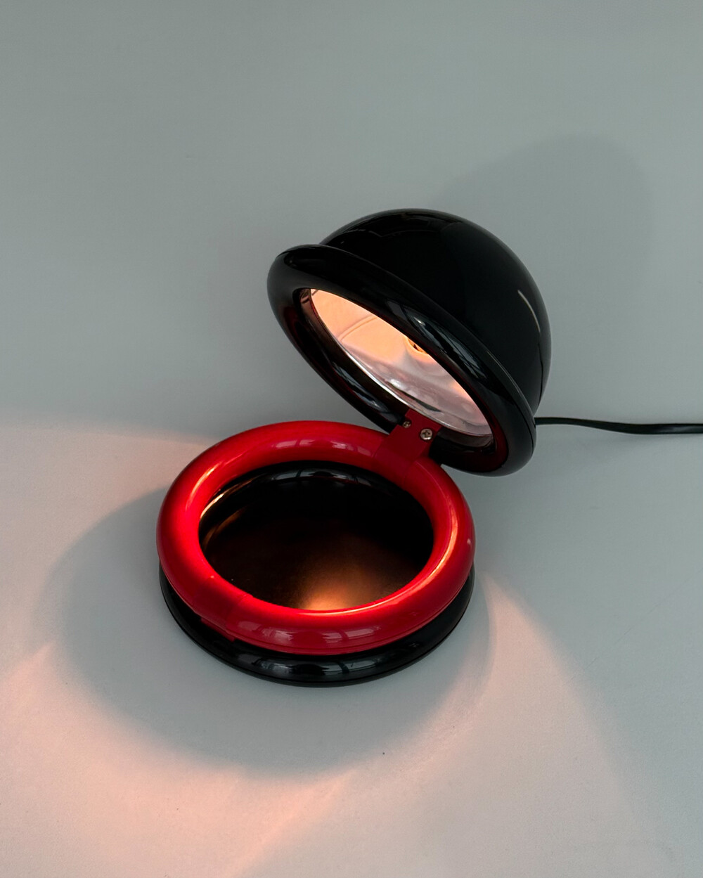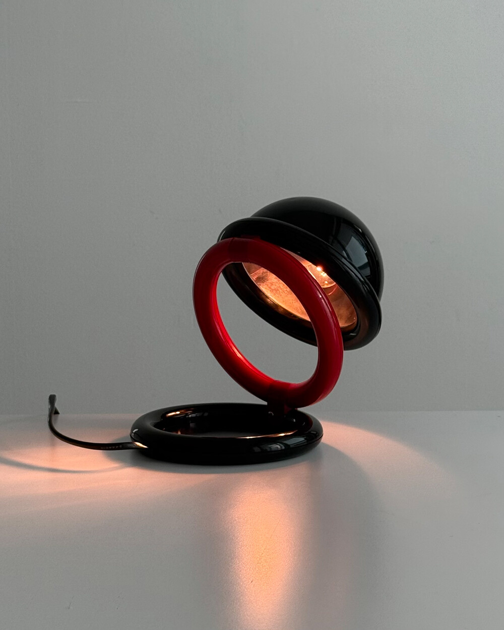1980년대 독일에서 제작된 빈티지 테이블 램프입니다. 블랙 컬러의 돔 형태 상부와 레드 컬러의 링 구조가 결합된 유선형태로 이루어져 있습니다. 상부를 열면 점등되고 닫으면 소등되는 클램셸 구조로, 각도 조절을 통해 빛을 제어할 수 있습니다. 블랙과 레드 컬러 대비와 독특한 형태가 어우러져 공간에 포인트를 더해줍니다.