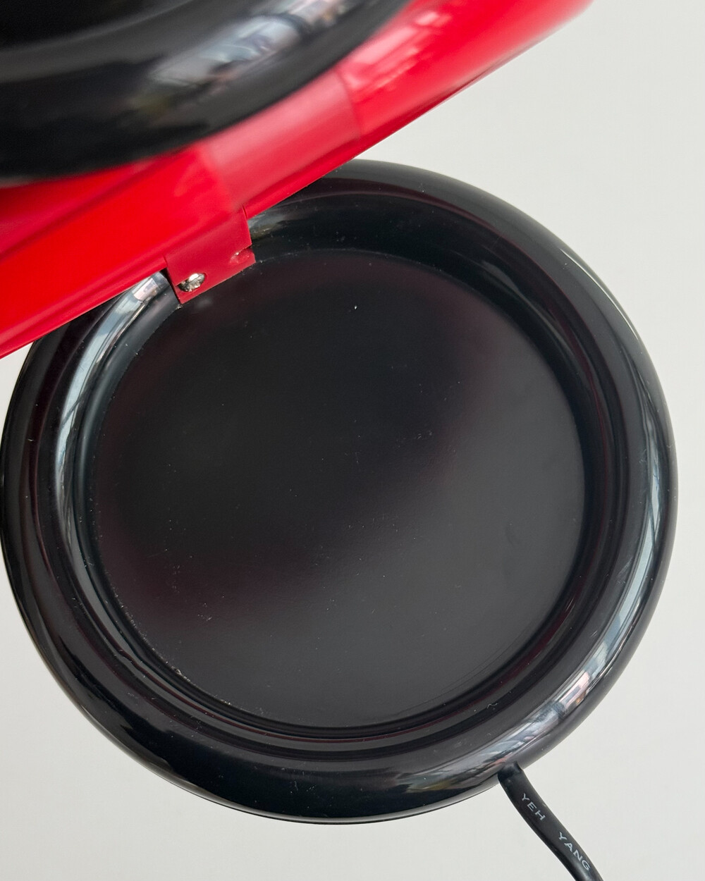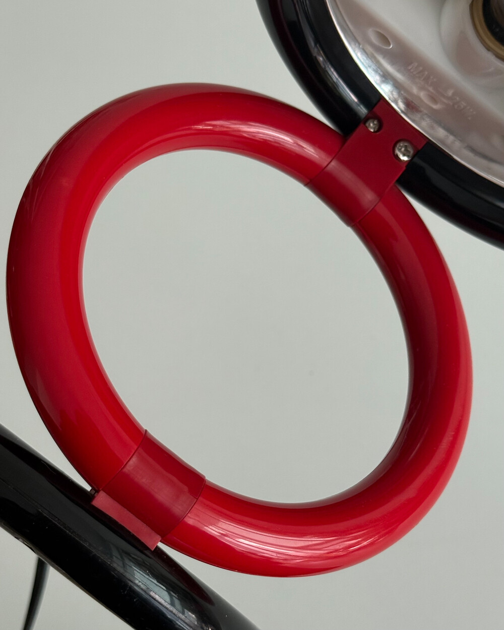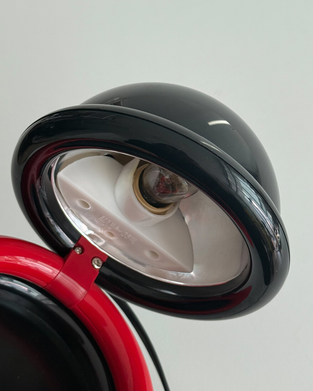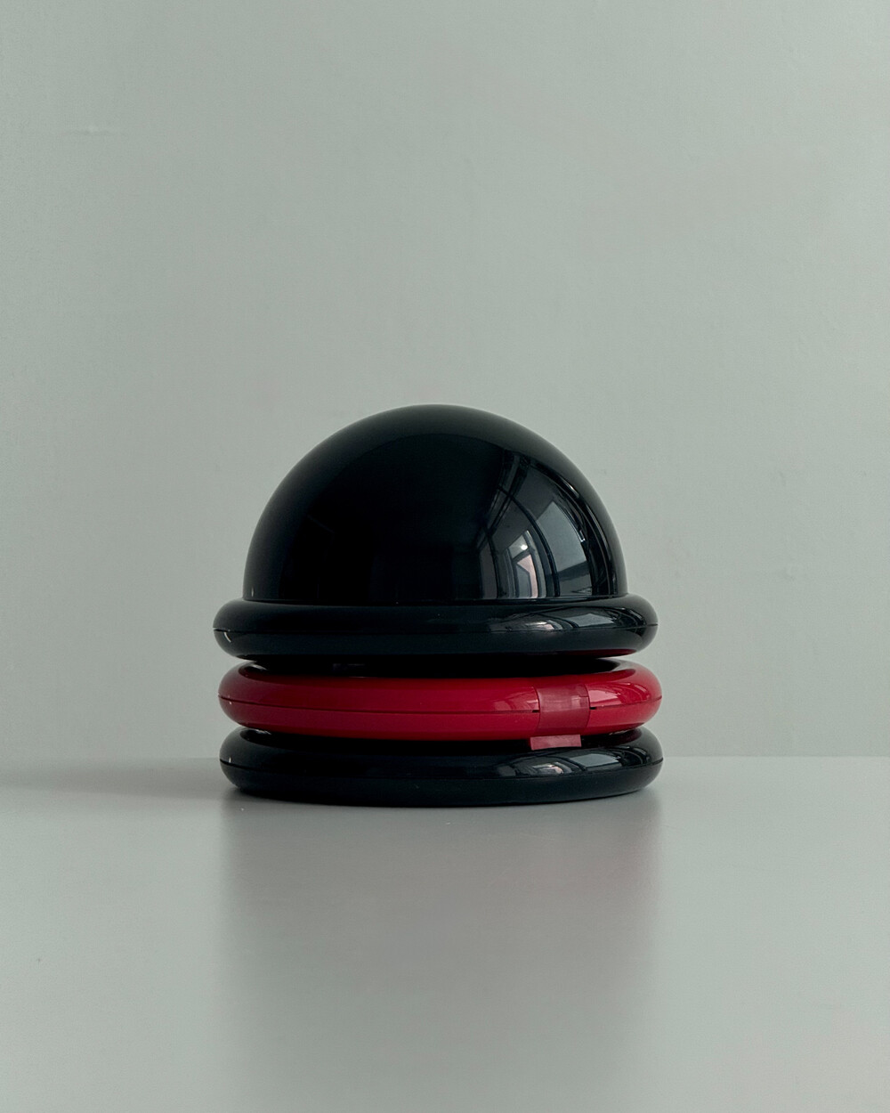 1980년대 독일에서 제작된 빈티지 테이블 램프입니다. 블랙 컬러의 돔 형태 상부와 레드 컬러의 링 구조가 결합된 유선형태로 이루어져 있습니다. 상부를 열면 점등되고 닫으면 소등되는 클램셸 구조로, 각도 조절을 통해 빛을 제어할 수 있습니다. 블랙과 레드 컬러 대비와 독특한 형태가 어우러져 공간에 포인트를 더해줍니다.