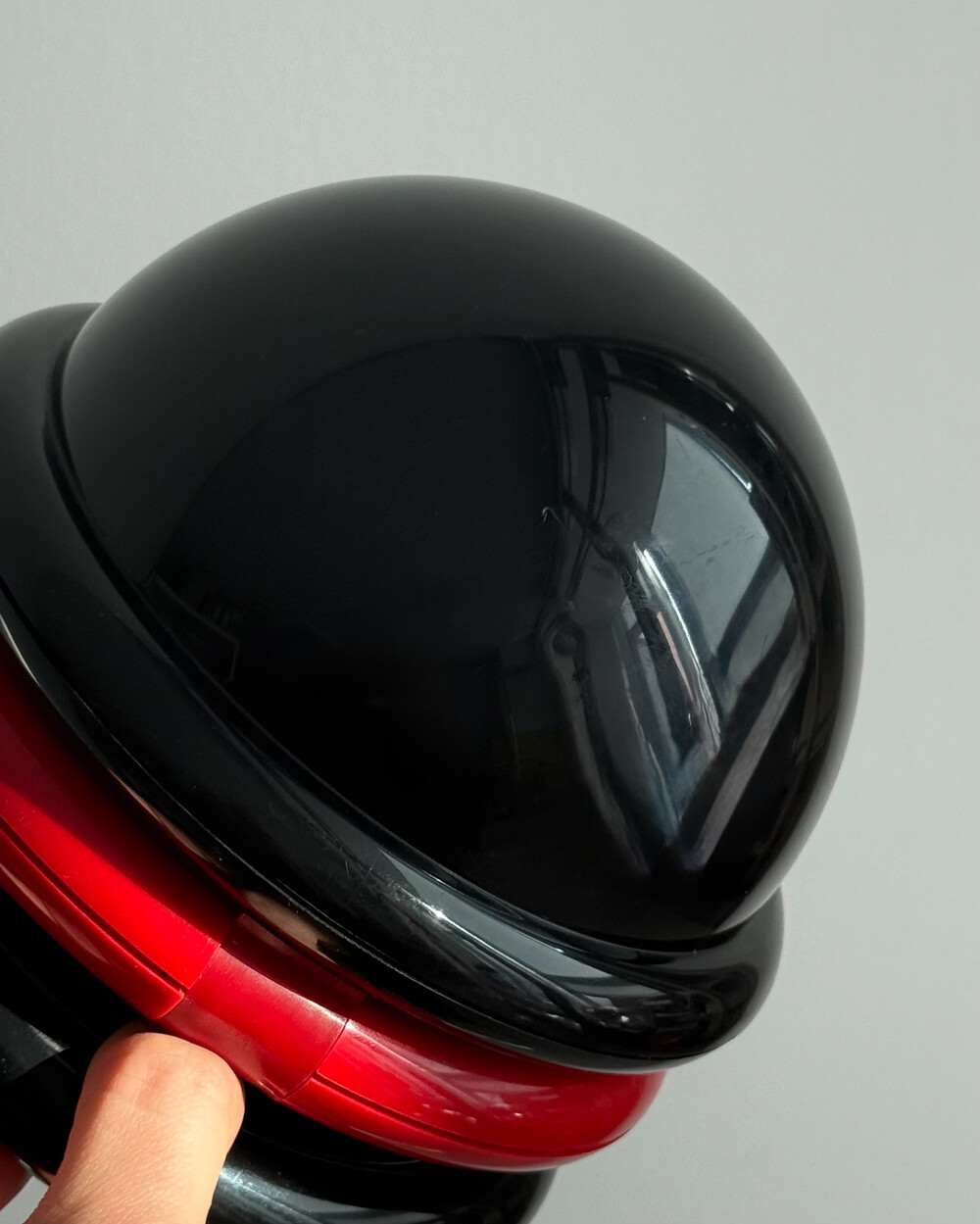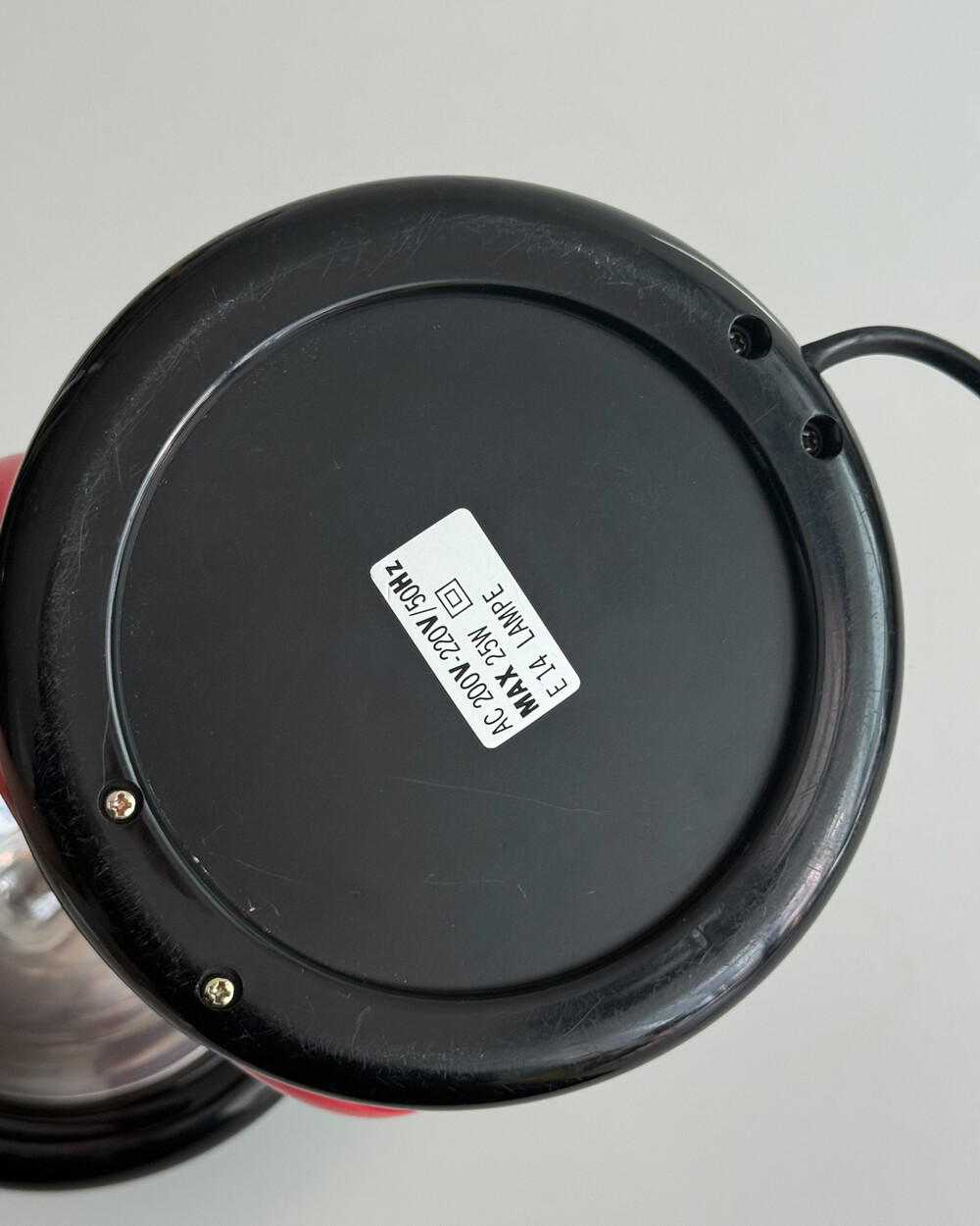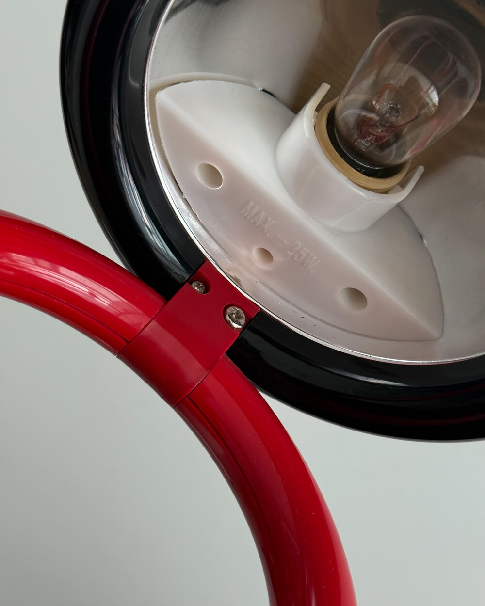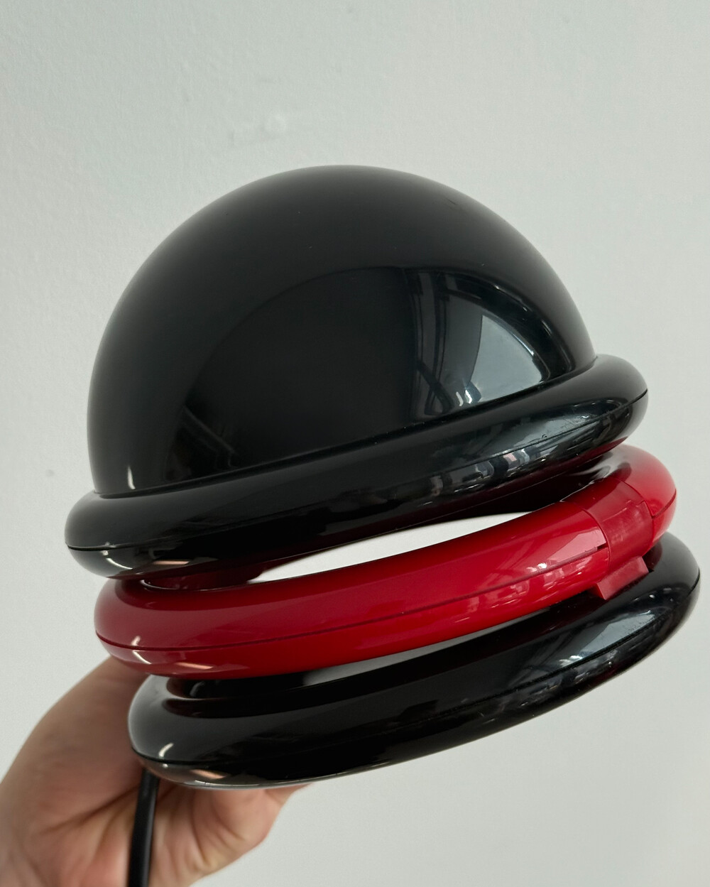 1980년대 독일에서 제작된 빈티지 테이블 램프입니다. 블랙 컬러의 돔 형태 상부와 레드 컬러의 링 구조가 결합된 유선형태로 이루어져 있습니다. 상부를 열면 점등되고 닫으면 소등되는 클램셸 구조로, 각도 조절을 통해 빛을 제어할 수 있습니다. 블랙과 레드 컬러 대비와 독특한 형태가 어우러져 공간에 포인트를 더해줍니다.