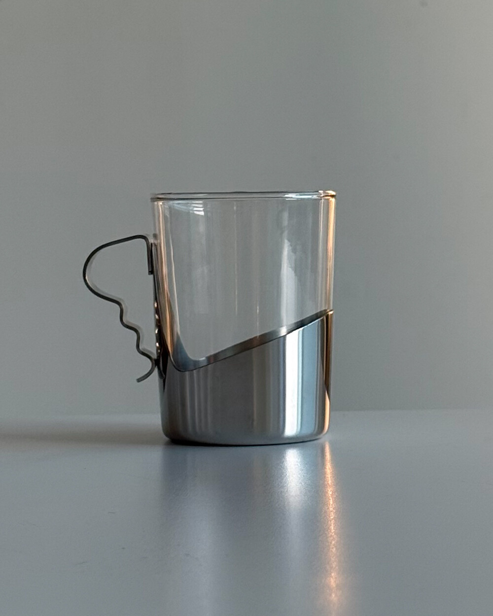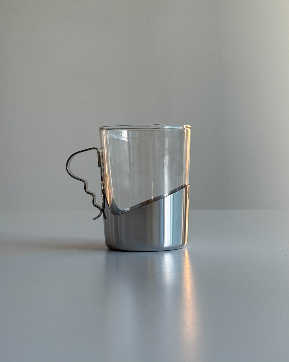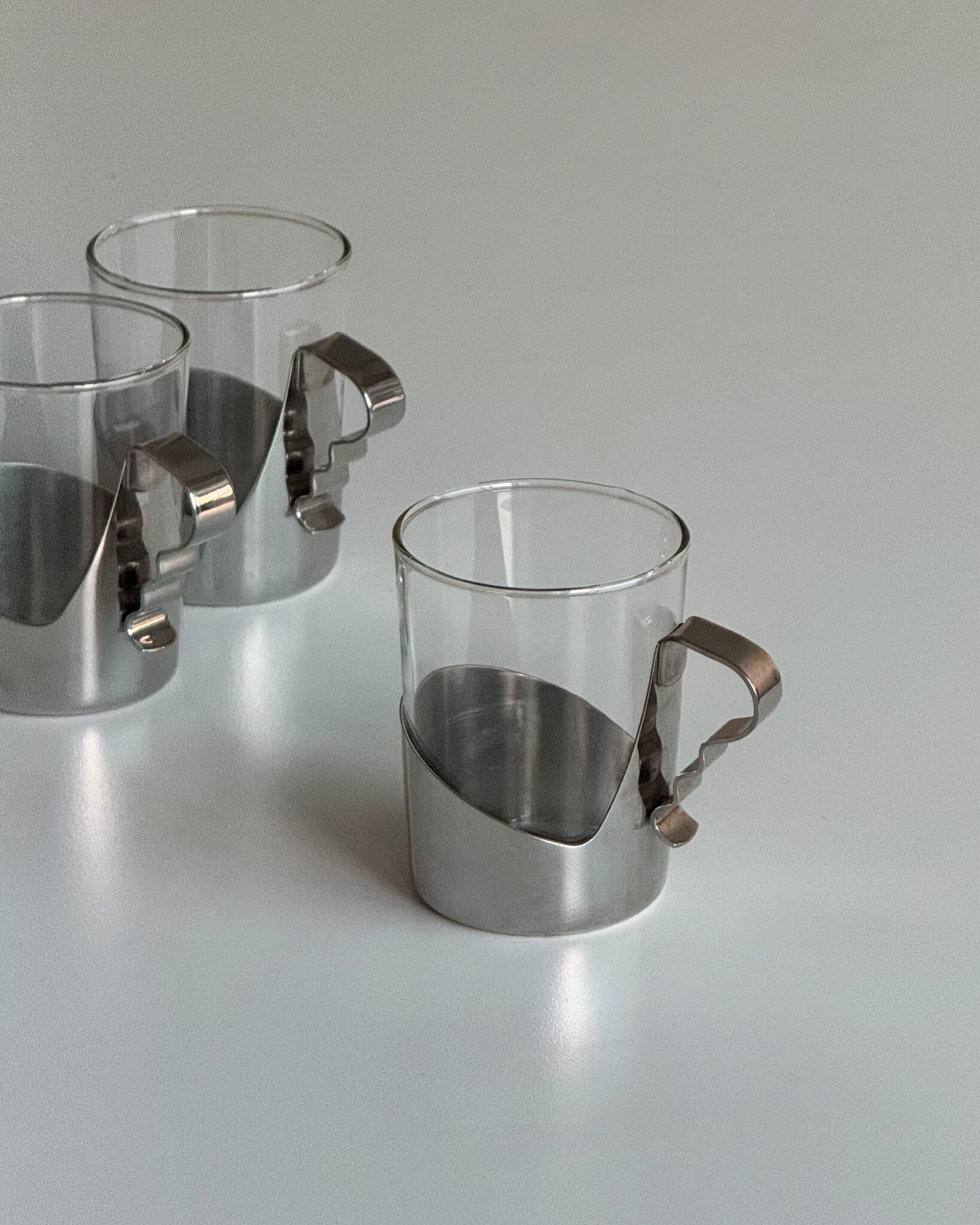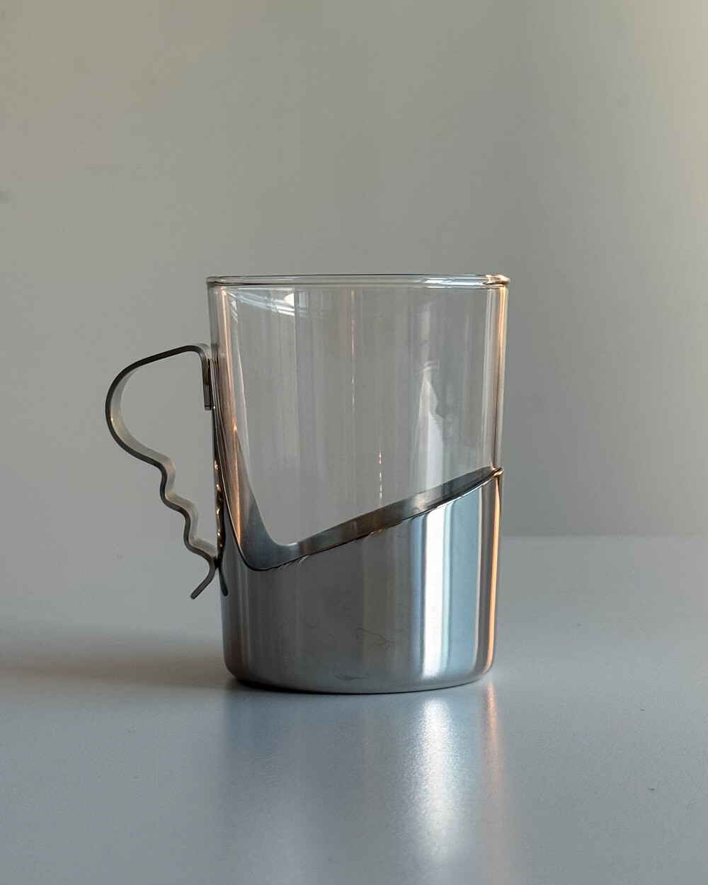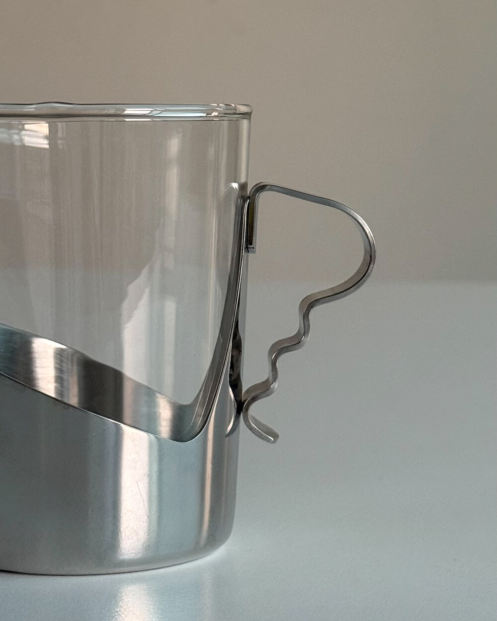 1970년대 독일 WMF에서 제작된 Cromargan 티 글라스 세트입니다. 내열(Feuerfest) 유리 컵과 크로마간 스테인리스 홀더가 결합된 구조로, 컵은 분리 가능하며 실사용과 관리가 용이합니다. 꼬임 형태의 핸들이 특징인 고급스러운 디자인입니다.