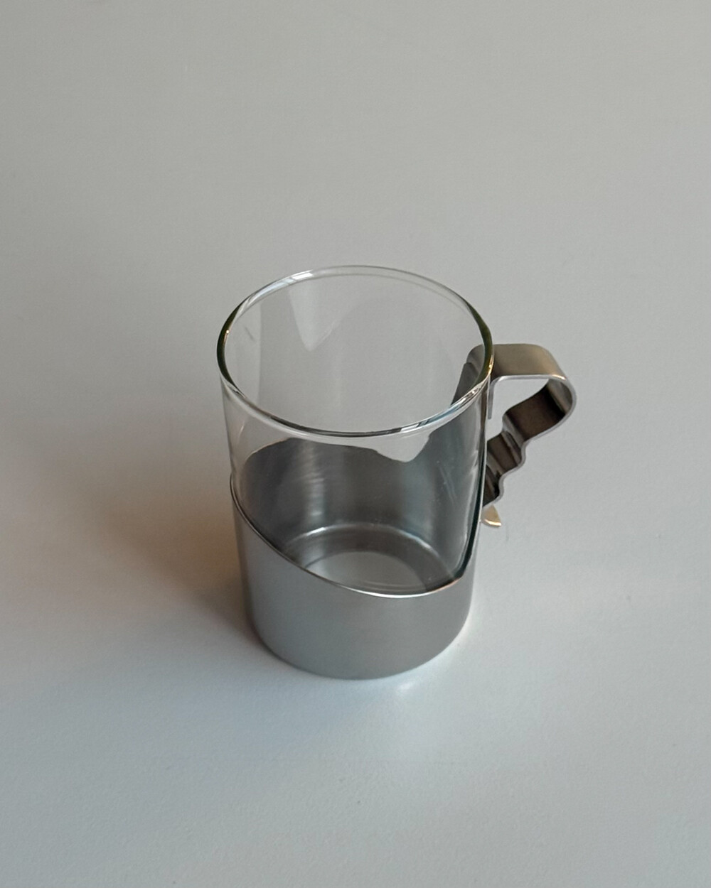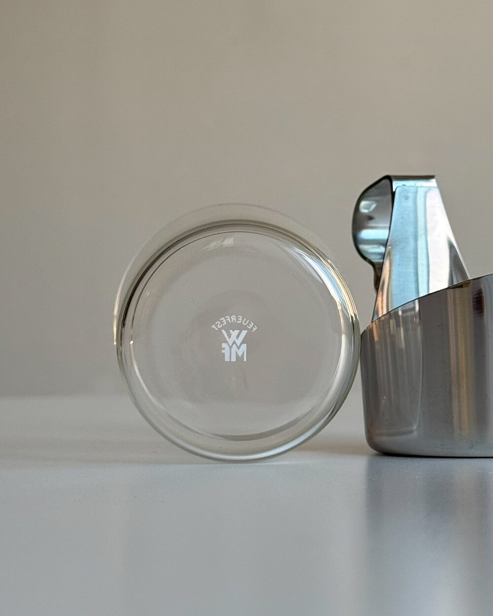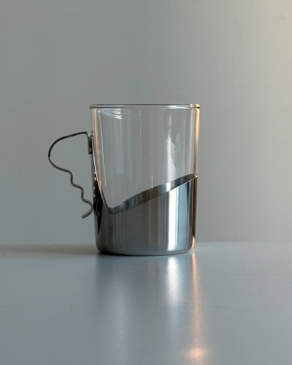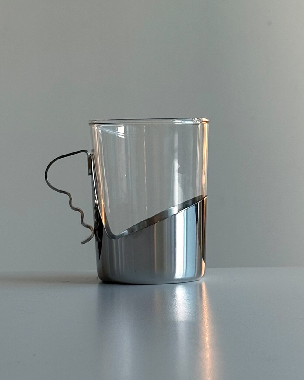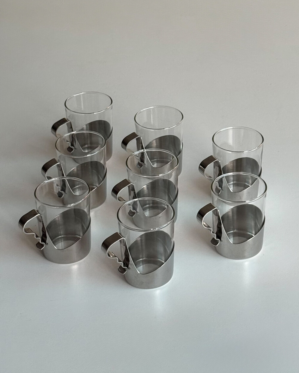 1970년대 독일 WMF에서 제작된 Cromargan 티 글라스 세트입니다. 내열(Feuerfest) 유리 컵과 크로마간 스테인리스 홀더가 결합된 구조로, 컵은 분리 가능하며 실사용과 관리가 용이합니다. 꼬임 형태의 핸들이 특징인 고급스러운 디자인입니다.