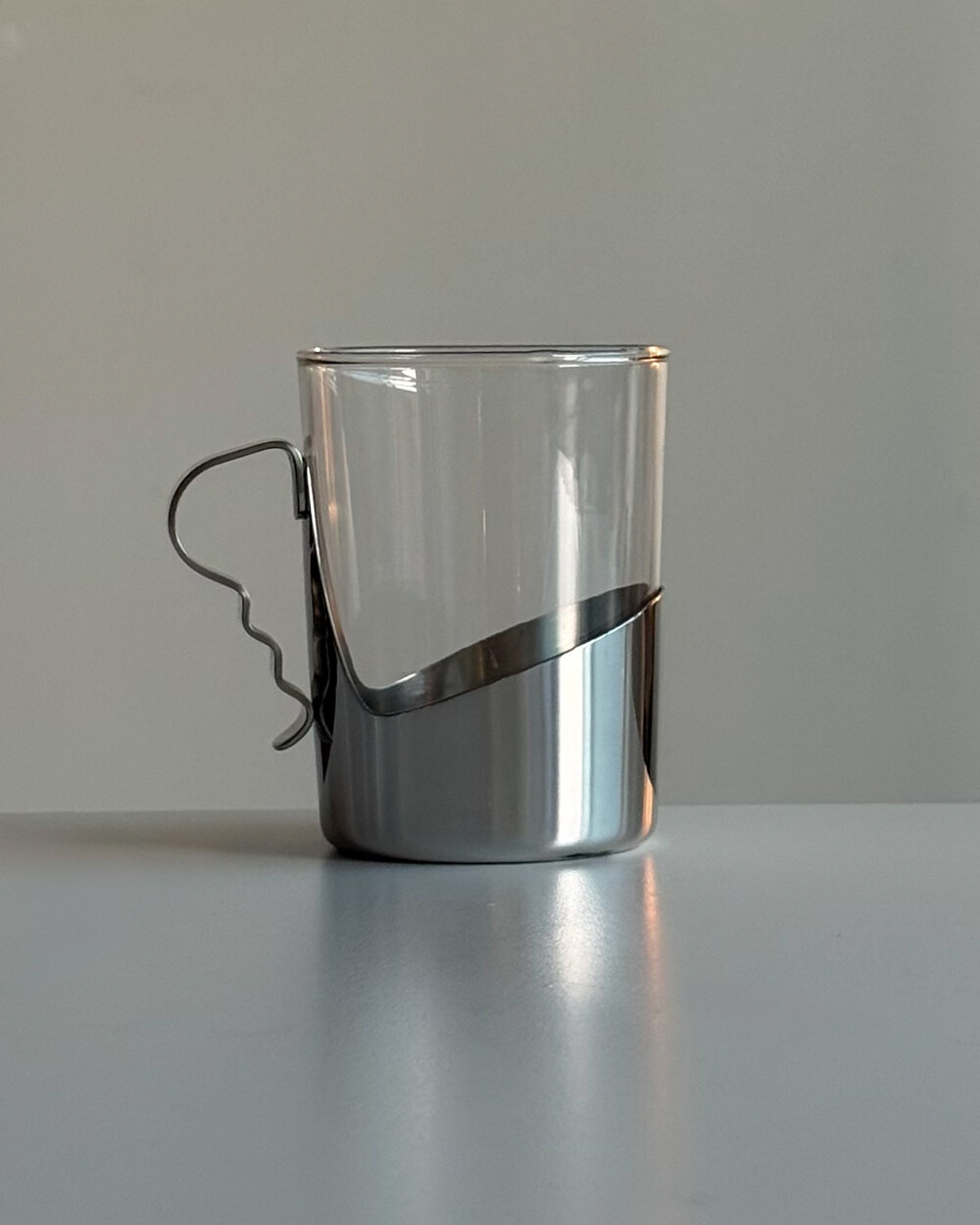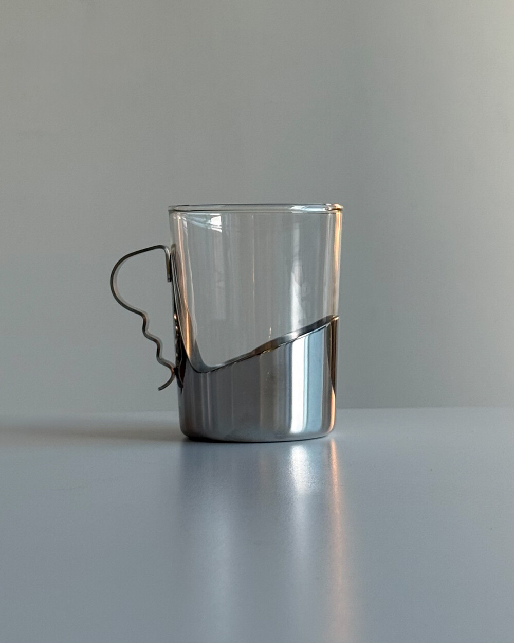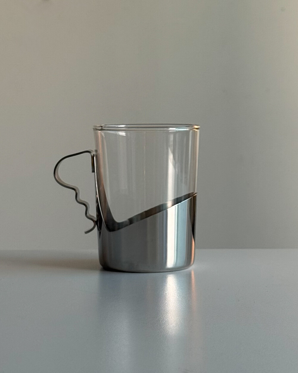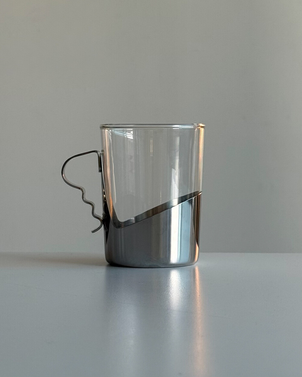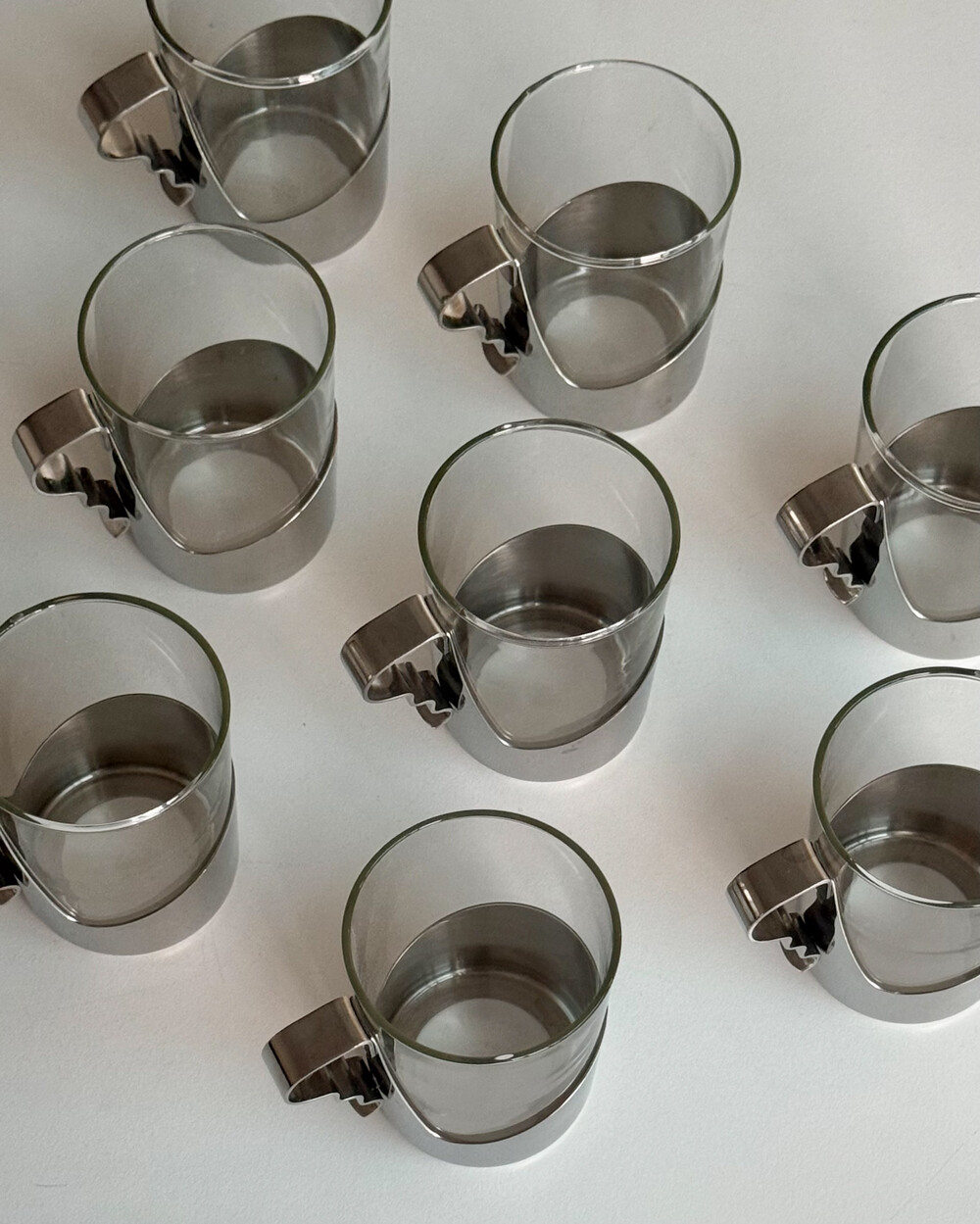 1970년대 독일 WMF에서 제작된 Cromargan 티 글라스 세트입니다. 내열(Feuerfest) 유리 컵과 크로마간 스테인리스 홀더가 결합된 구조로, 컵은 분리 가능하며 실사용과 관리가 용이합니다. 꼬임 형태의 핸들이 특징인 고급스러운 디자인입니다.