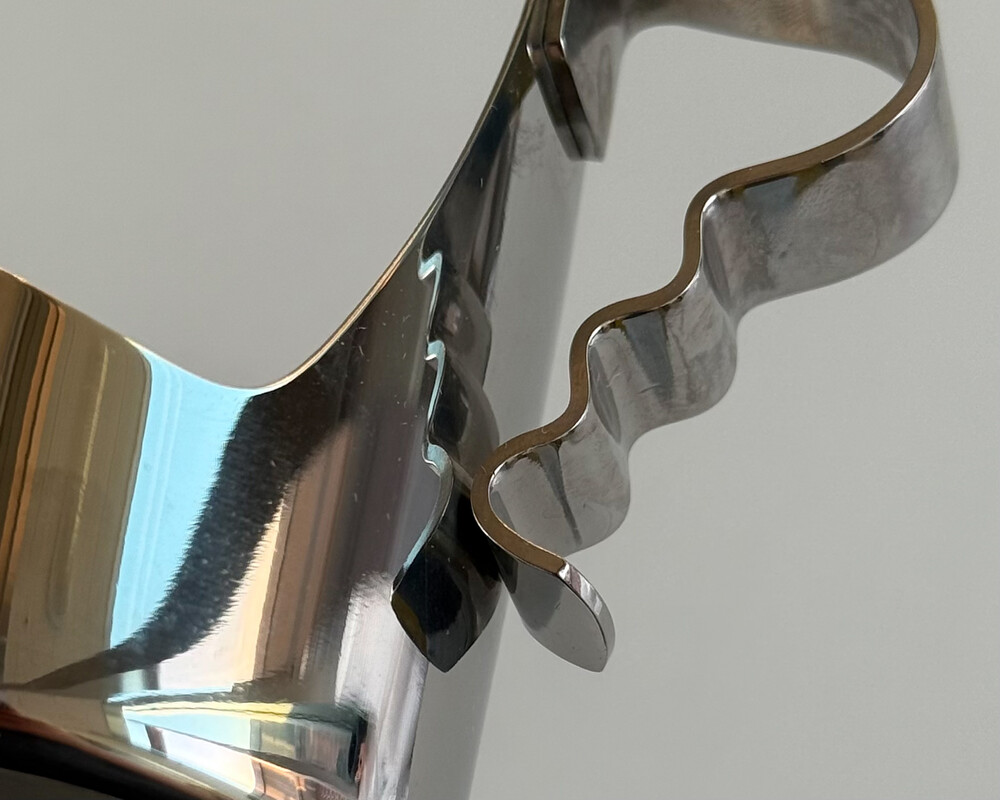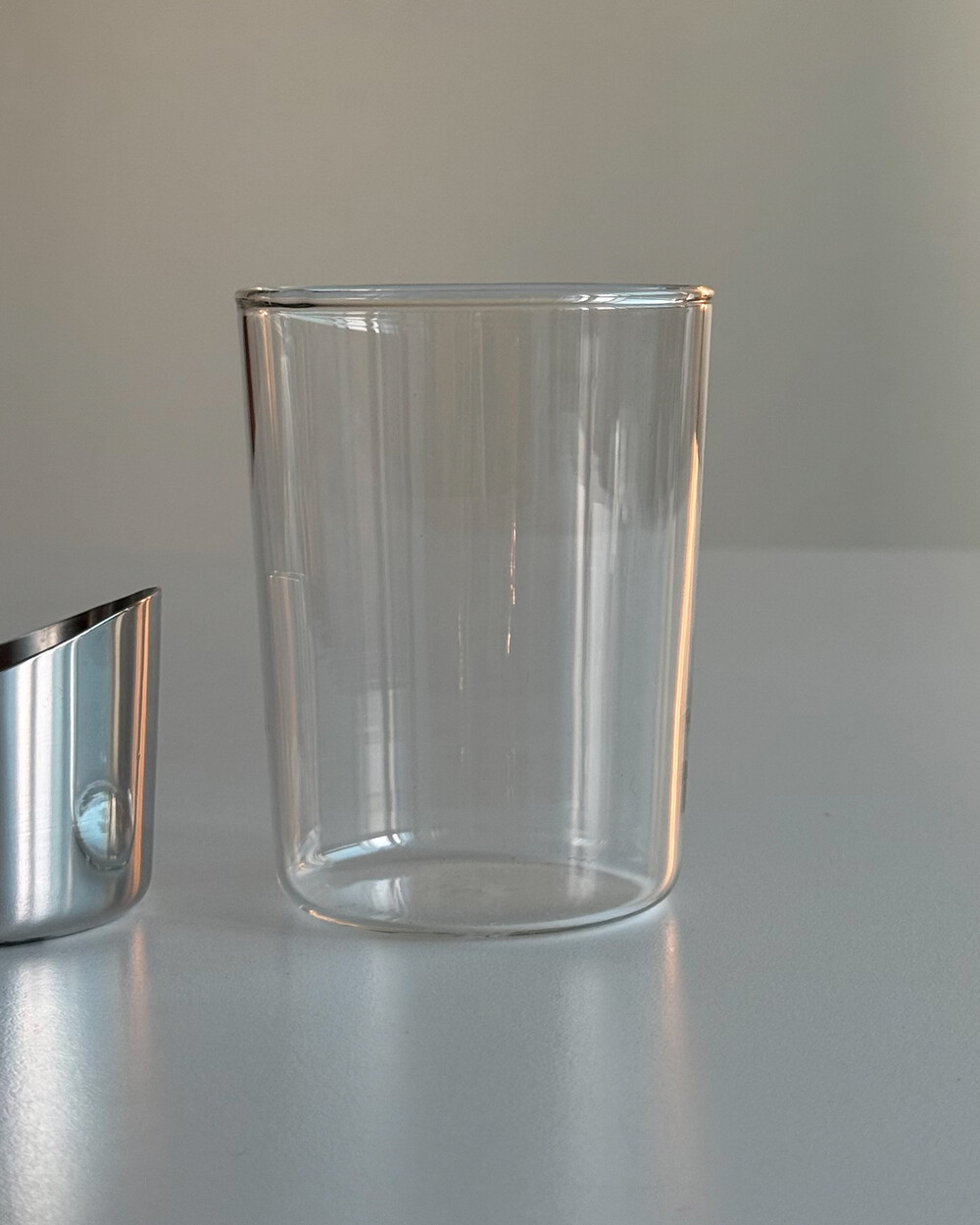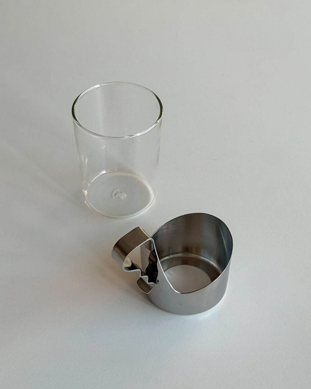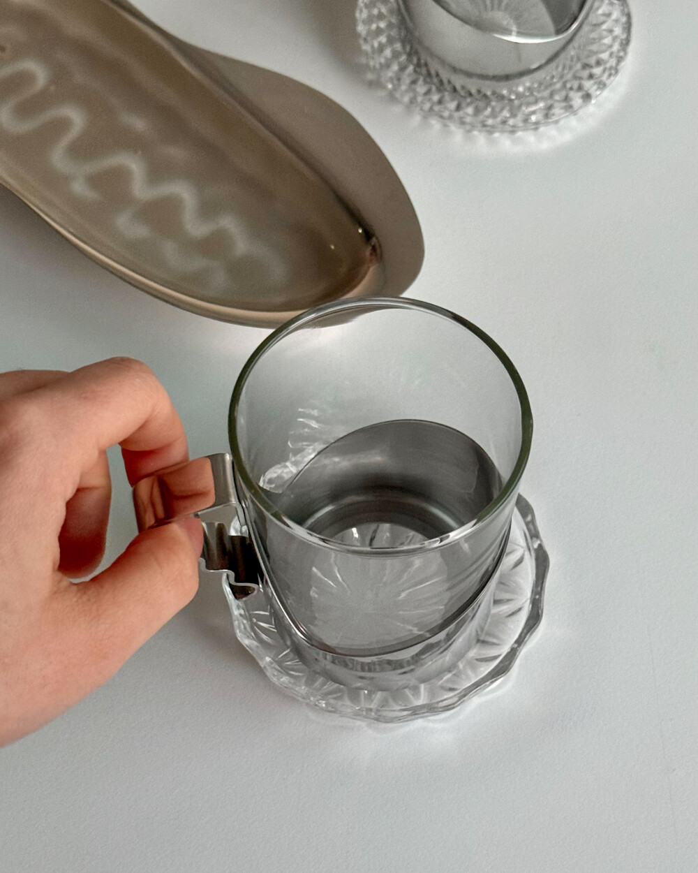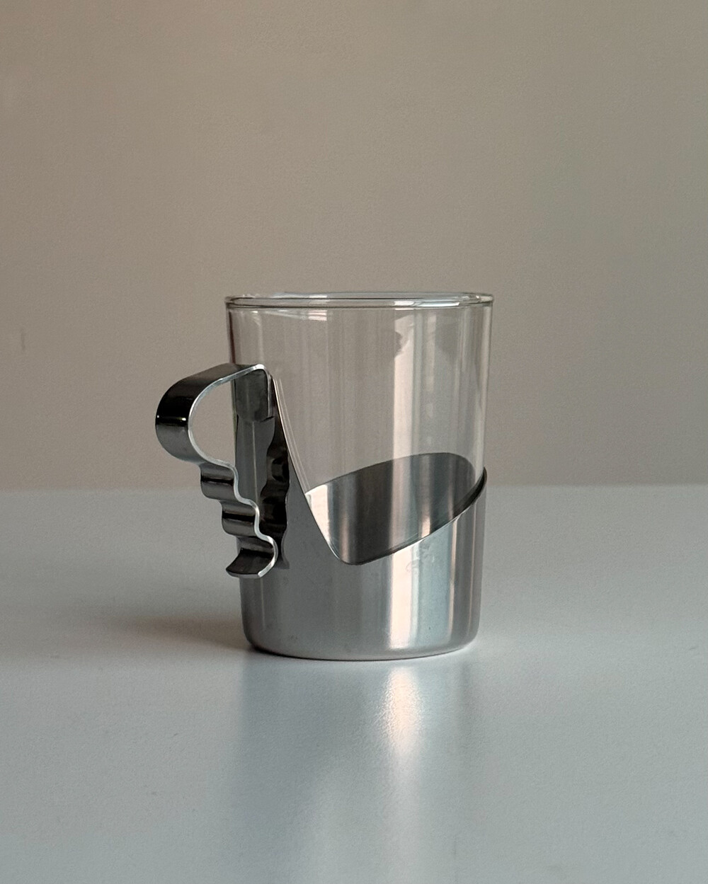 1970년대 독일 WMF에서 제작된 Cromargan 티 글라스 세트입니다. 내열(Feuerfest) 유리 컵과 크로마간 스테인리스 홀더가 결합된 구조로, 컵은 분리 가능하며 실사용과 관리가 용이합니다. 꼬임 형태의 핸들이 특징인 고급스러운 디자인입니다.