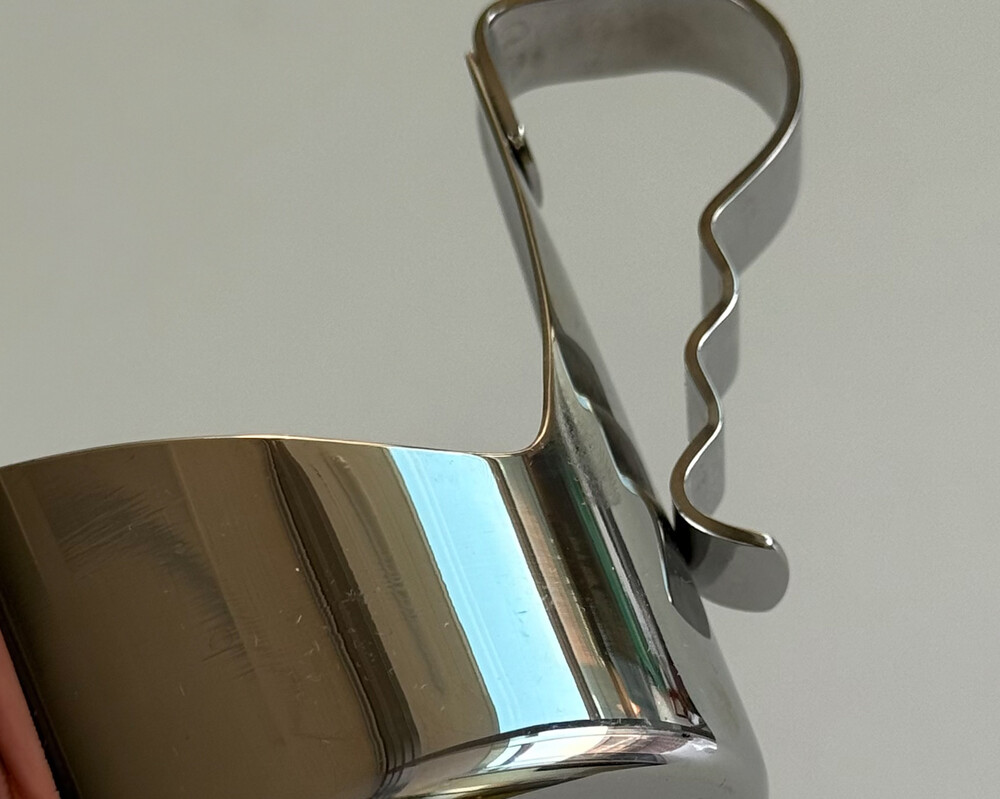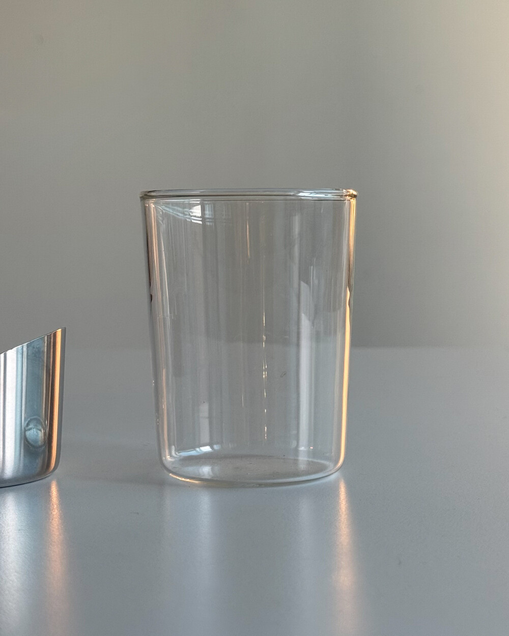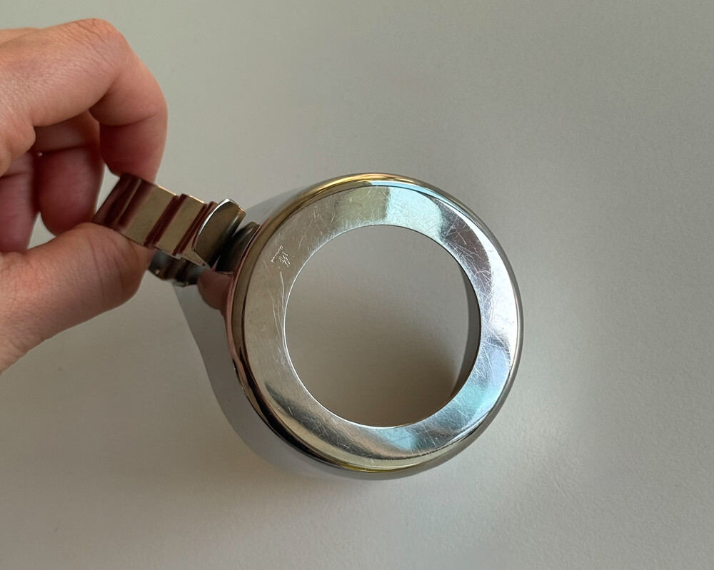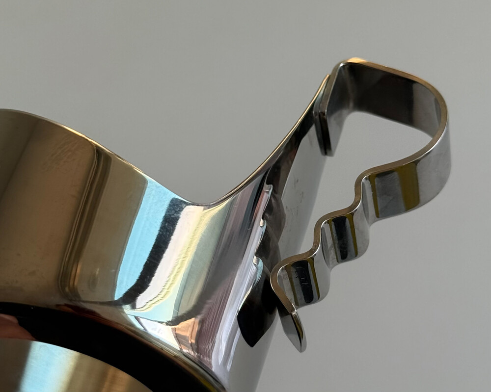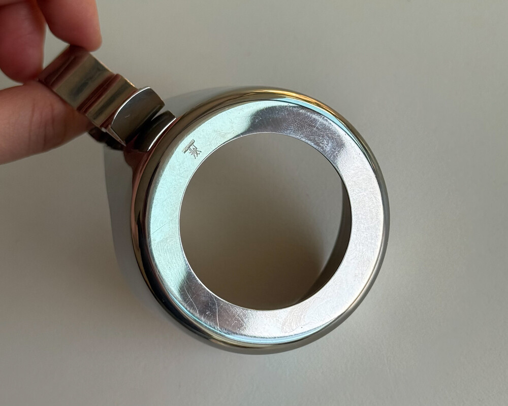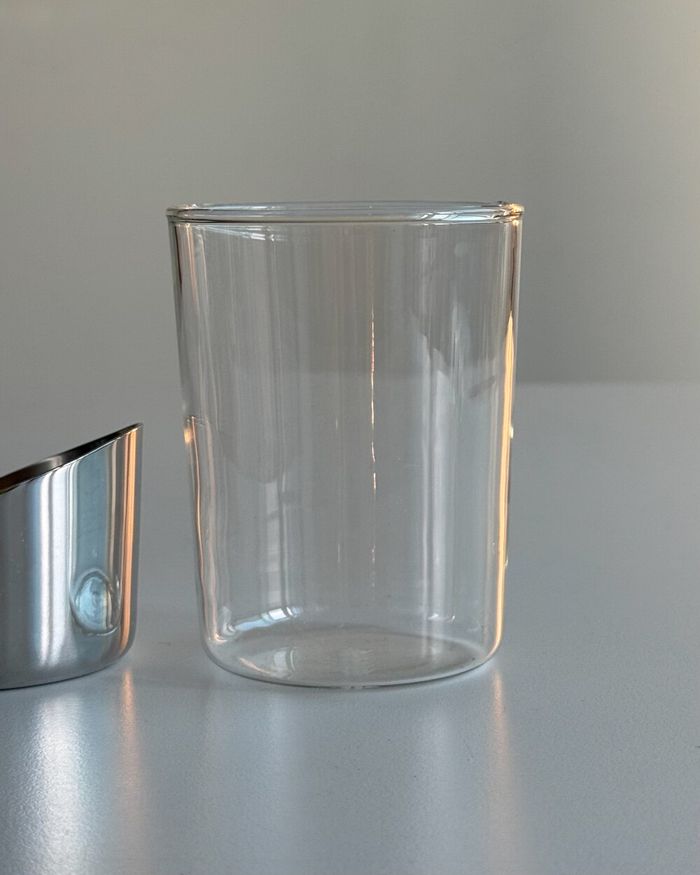 1970년대 독일 WMF에서 제작된 Cromargan 티 글라스 세트입니다. 내열(Feuerfest) 유리 컵과 크로마간 스테인리스 홀더가 결합된 구조로, 컵은 분리 가능하며 실사용과 관리가 용이합니다. 꼬임 형태의 핸들이 특징인 고급스러운 디자인입니다.
