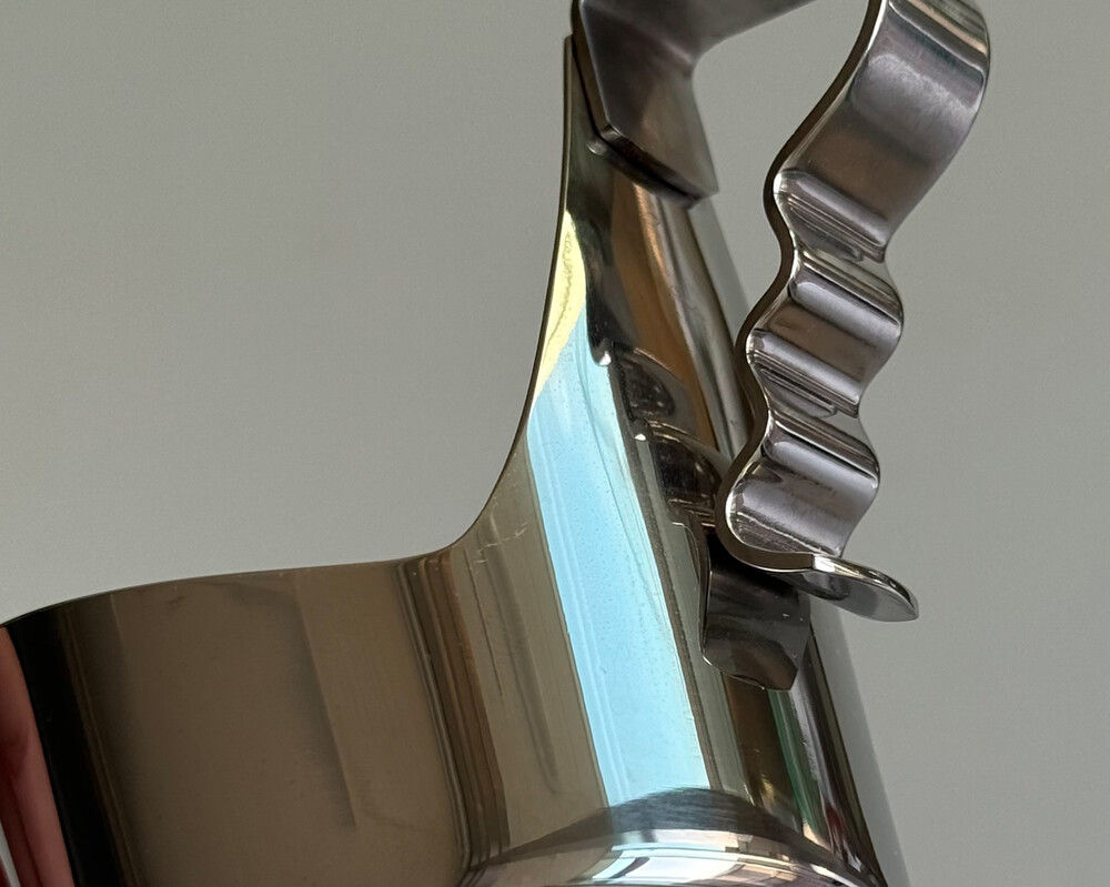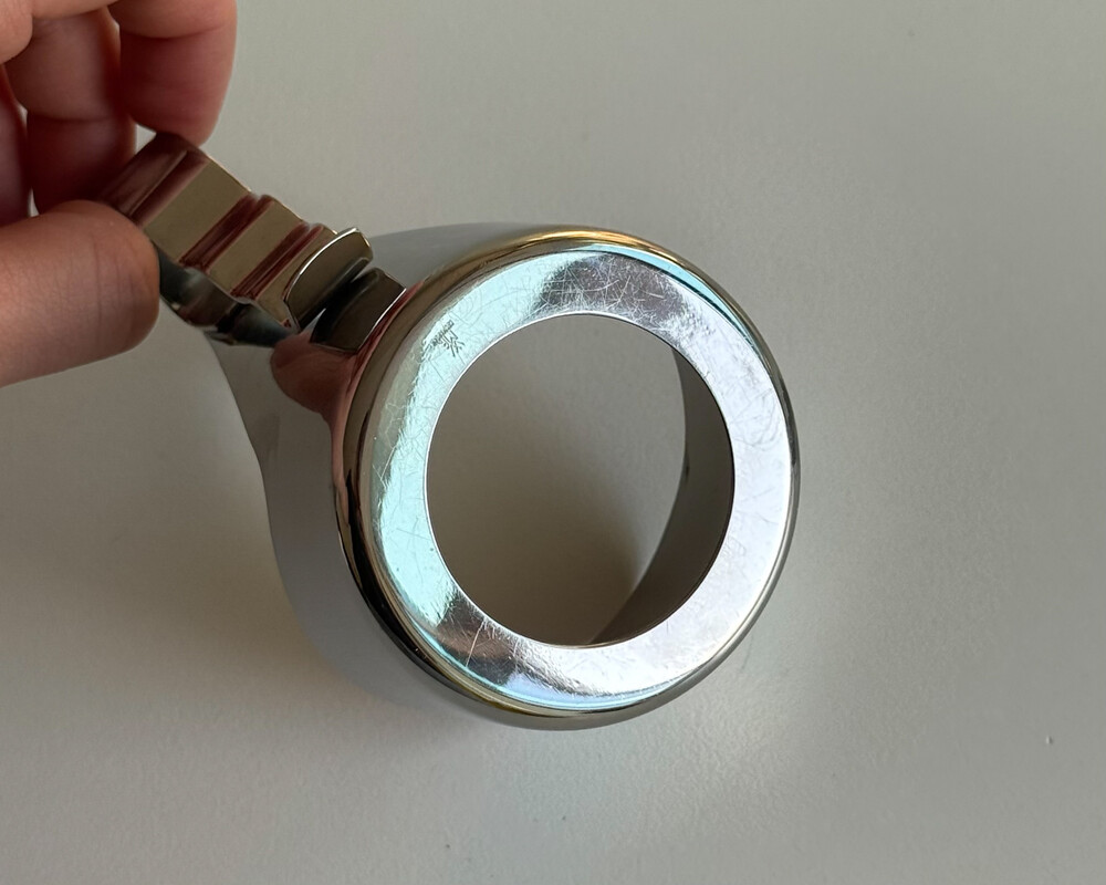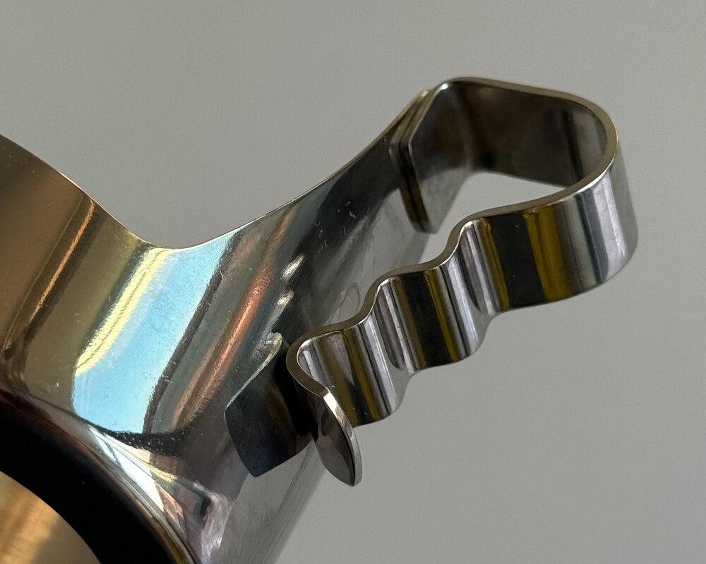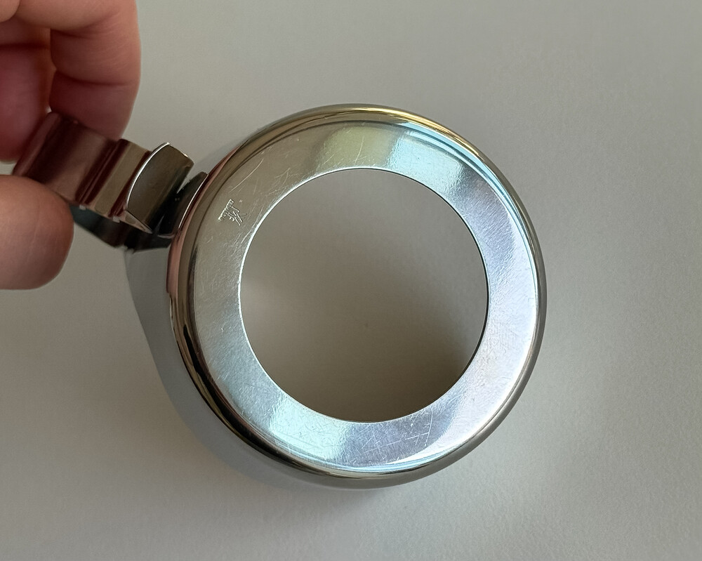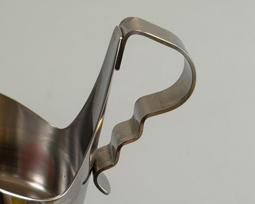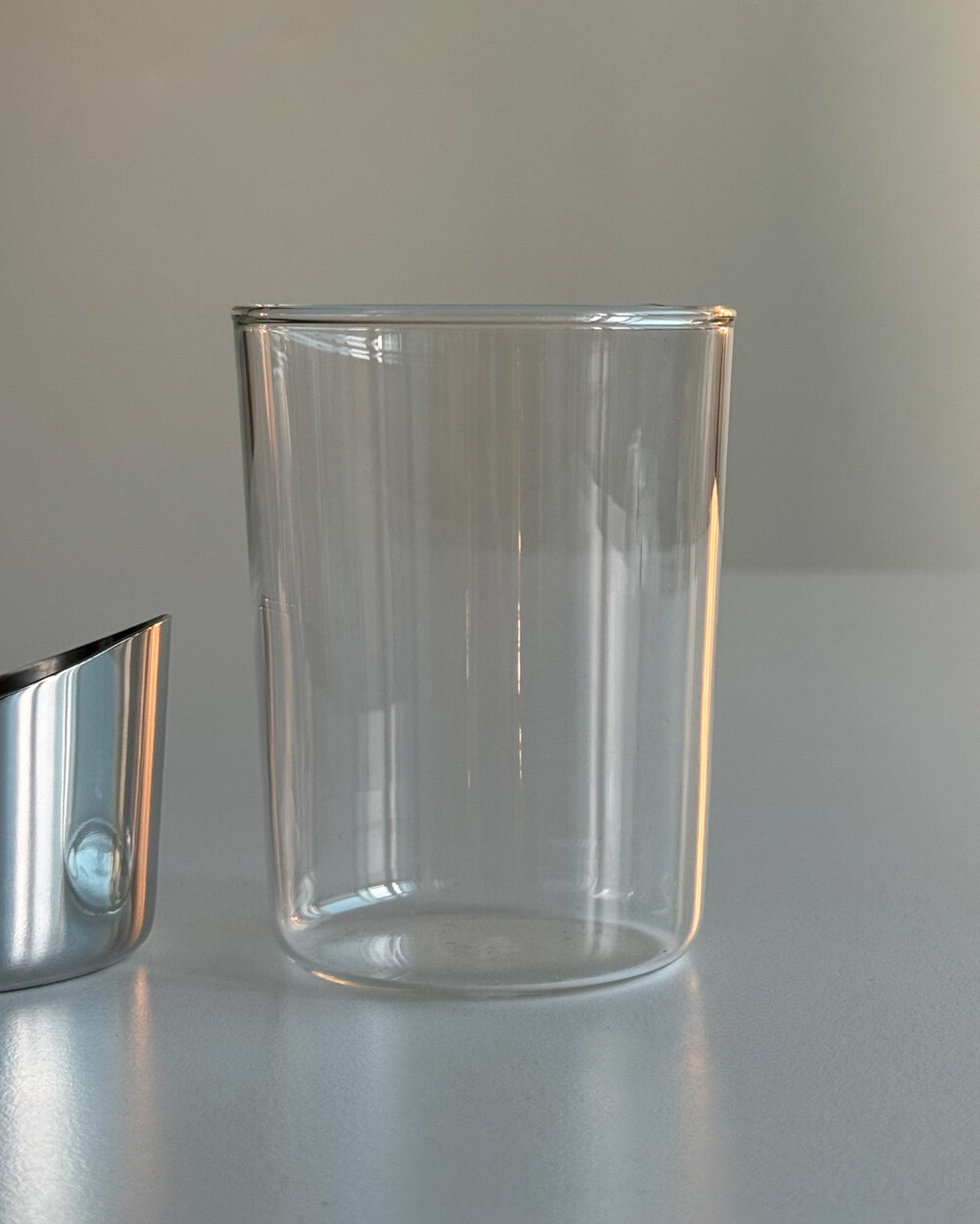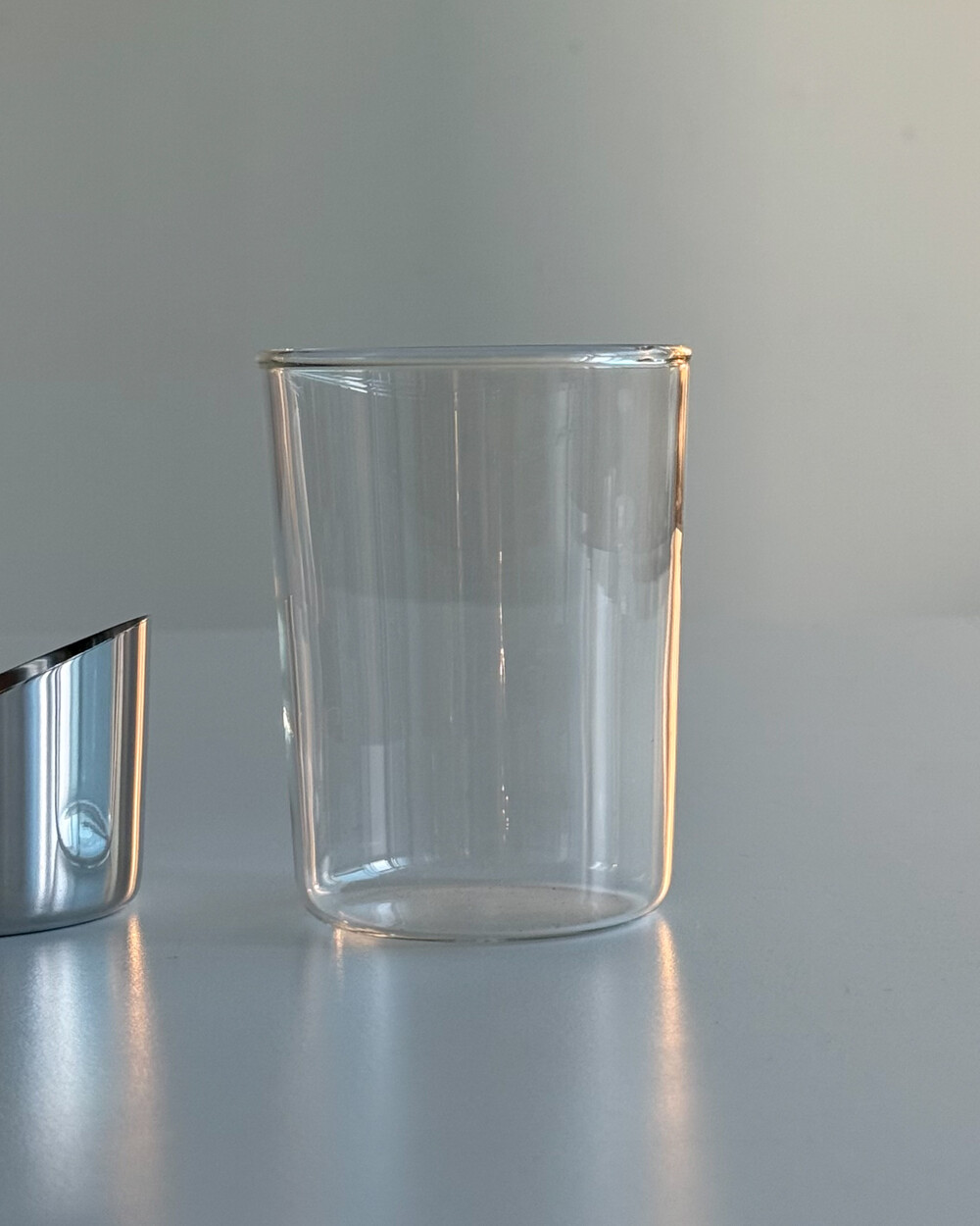 1970년대 독일 WMF에서 제작된 Cromargan 티 글라스 세트입니다. 내열(Feuerfest) 유리 컵과 크로마간 스테인리스 홀더가 결합된 구조로, 컵은 분리 가능하며 실사용과 관리가 용이합니다. 꼬임 형태의 핸들이 특징인 고급스러운 디자인입니다.