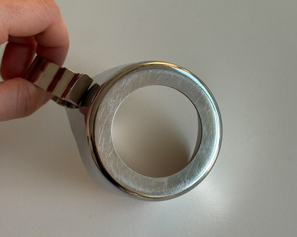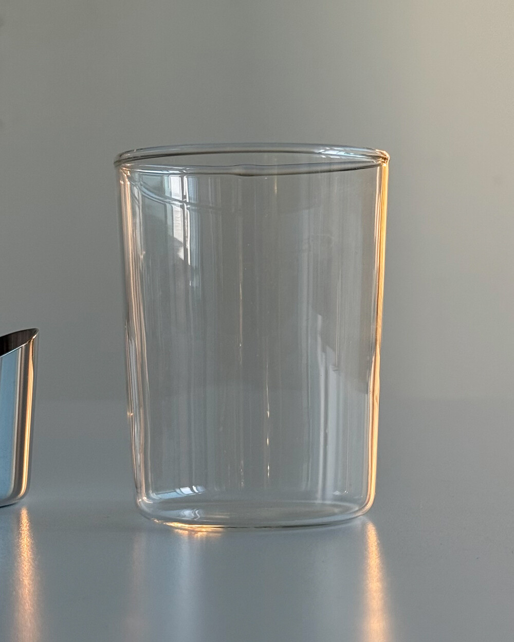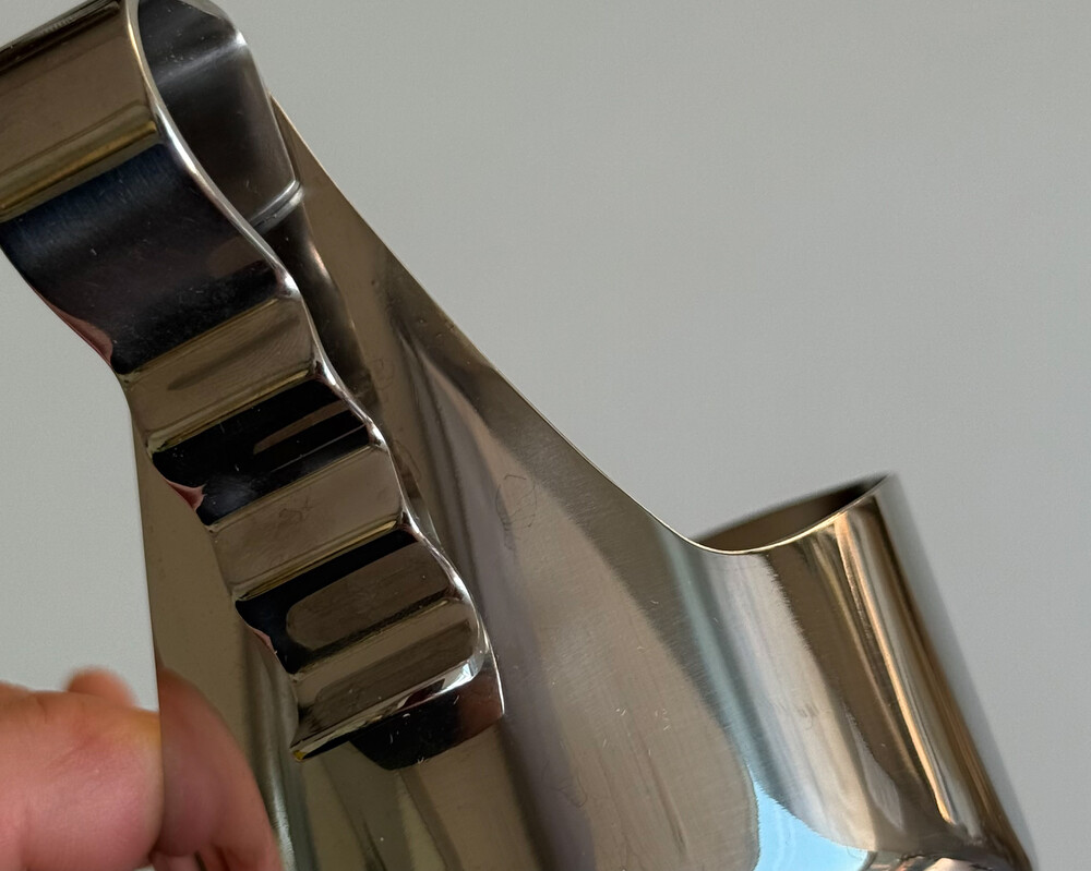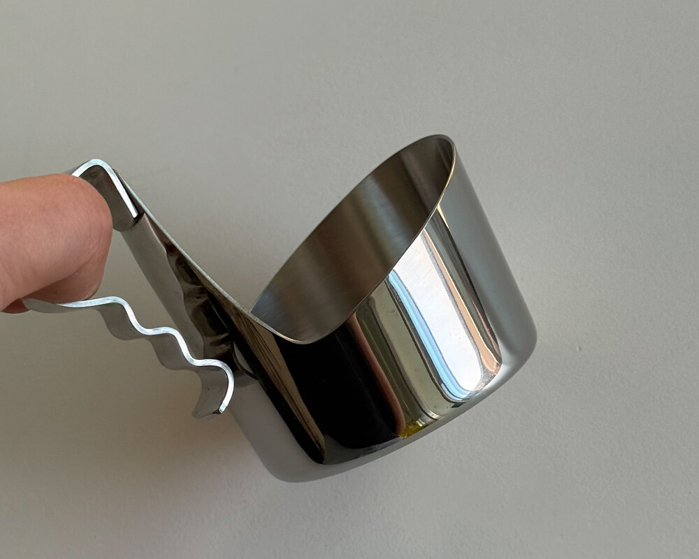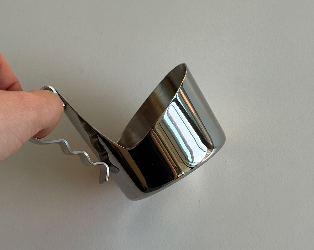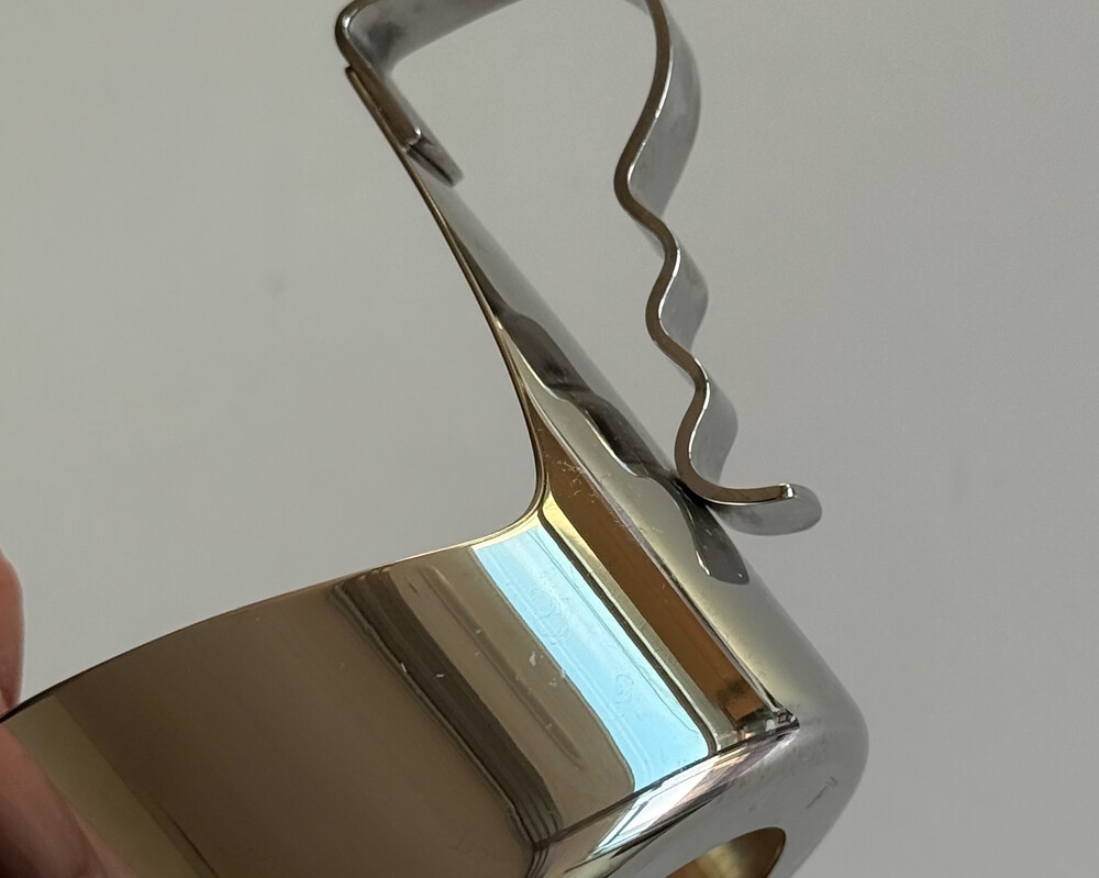 1970년대 독일 WMF에서 제작된 Cromargan 티 글라스 세트입니다. 내열(Feuerfest) 유리 컵과 크로마간 스테인리스 홀더가 결합된 구조로, 컵은 분리 가능하며 실사용과 관리가 용이합니다. 꼬임 형태의 핸들이 특징인 고급스러운 디자인입니다.