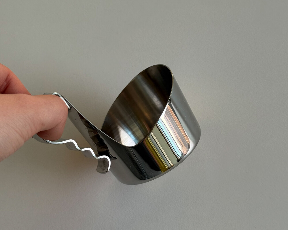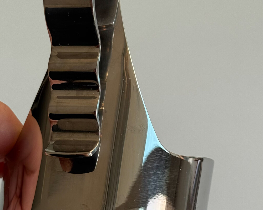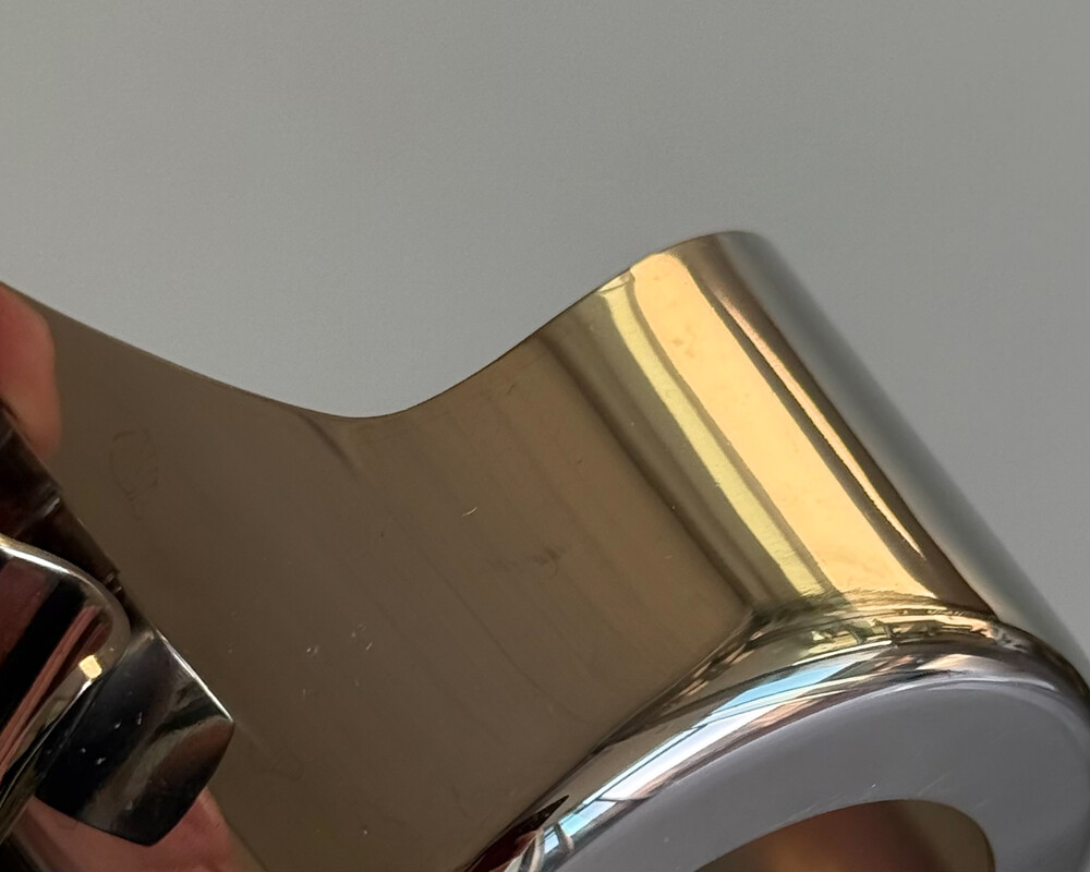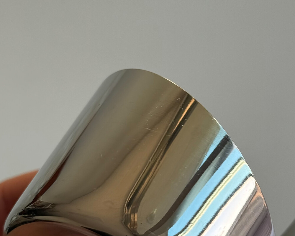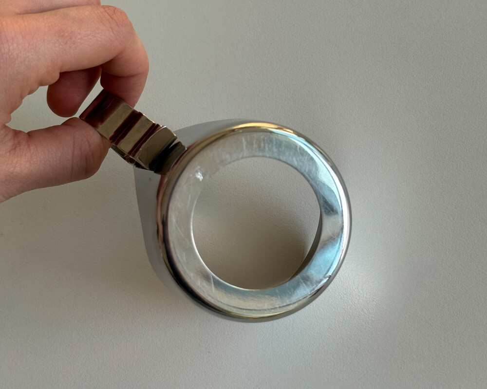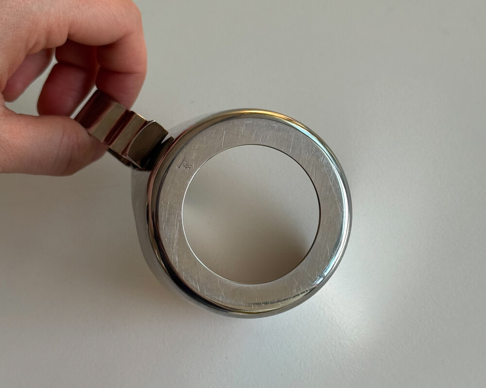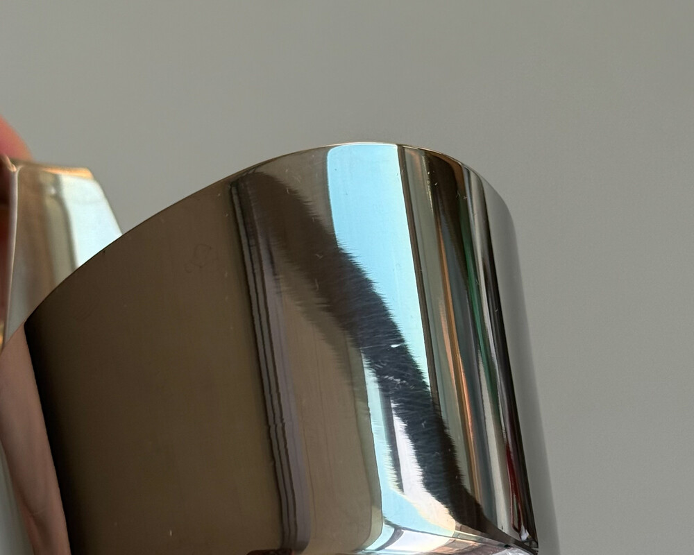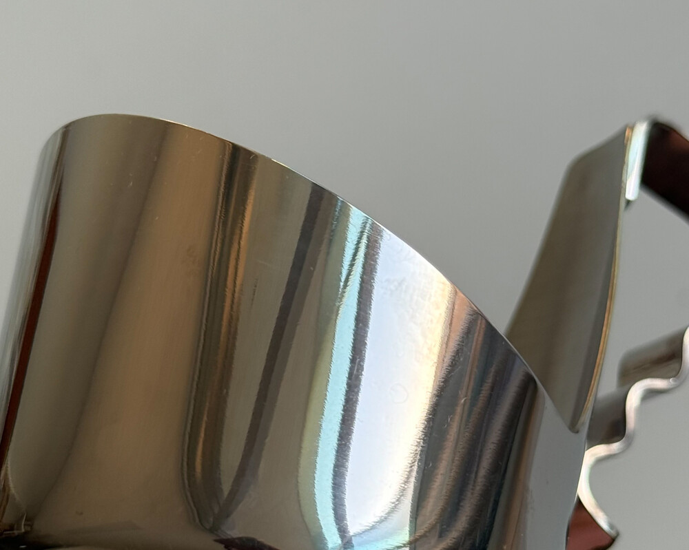 1970년대 독일 WMF에서 제작된 Cromargan 티 글라스 세트입니다. 내열(Feuerfest) 유리 컵과 크로마간 스테인리스 홀더가 결합된 구조로, 컵은 분리 가능하며 실사용과 관리가 용이합니다. 꼬임 형태의 핸들이 특징인 고급스러운 디자인입니다.