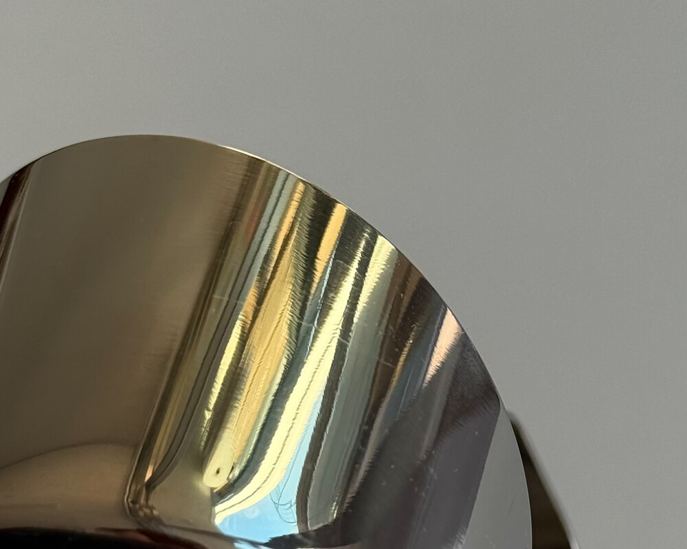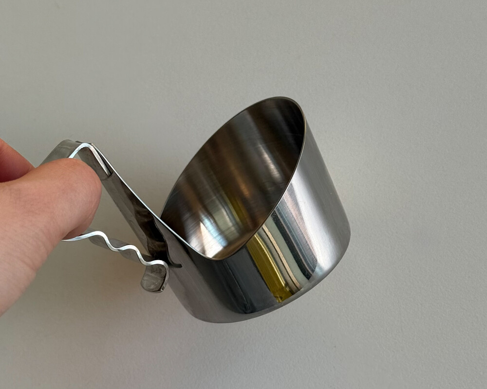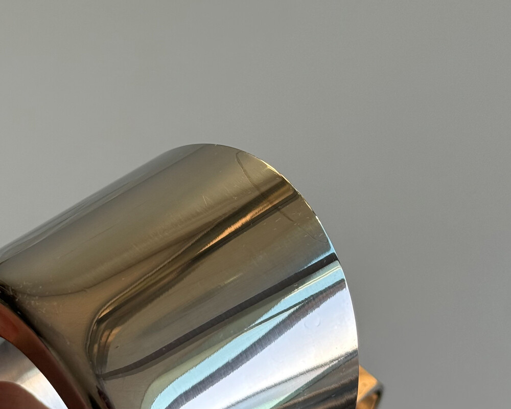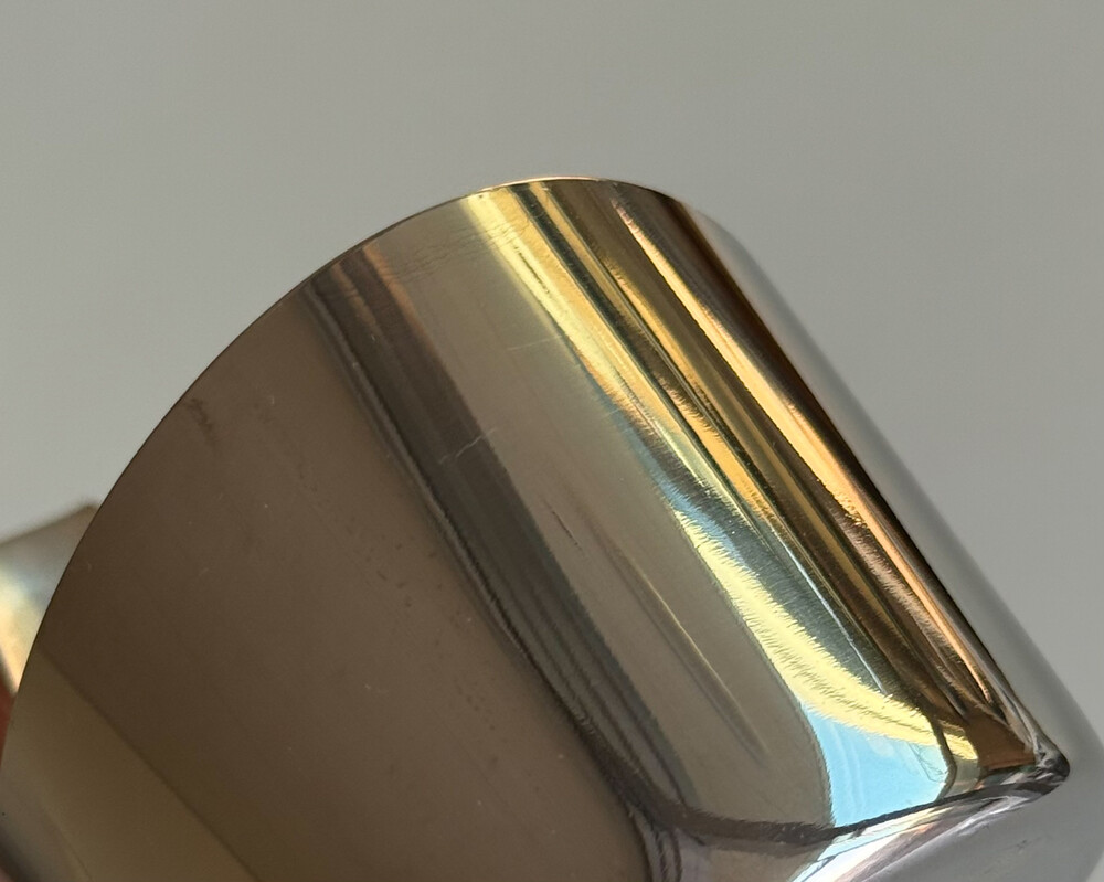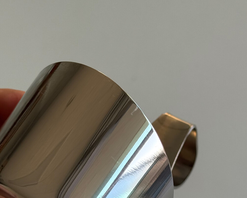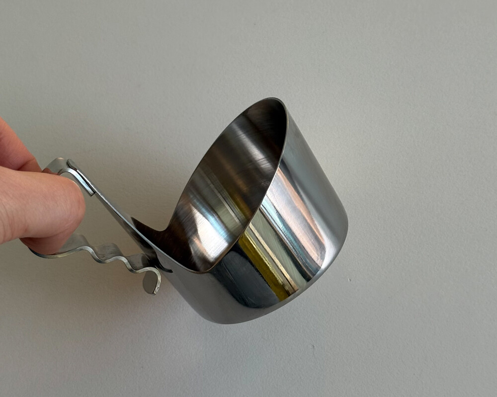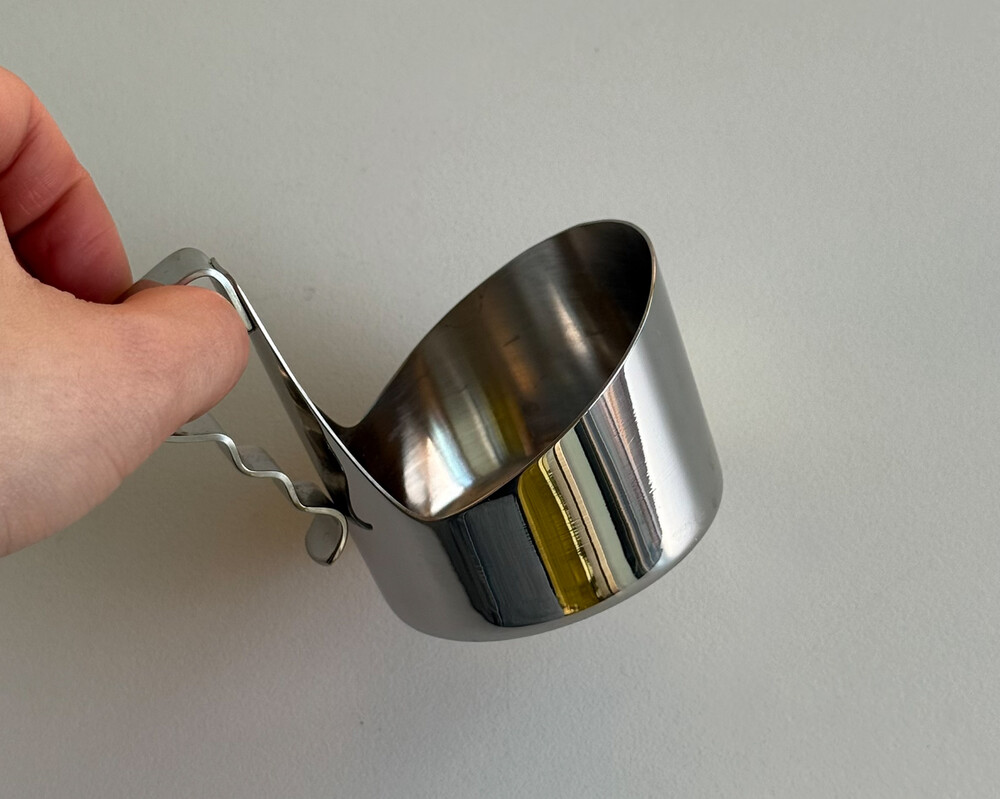 1970년대 독일 WMF에서 제작된 Cromargan 티 글라스 세트입니다. 내열(Feuerfest) 유리 컵과 크로마간 스테인리스 홀더가 결합된 구조로, 컵은 분리 가능하며 실사용과 관리가 용이합니다. 꼬임 형태의 핸들이 특징인 고급스러운 디자인입니다.