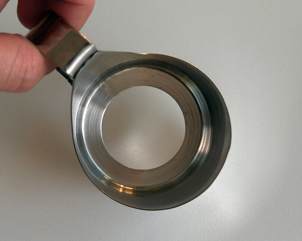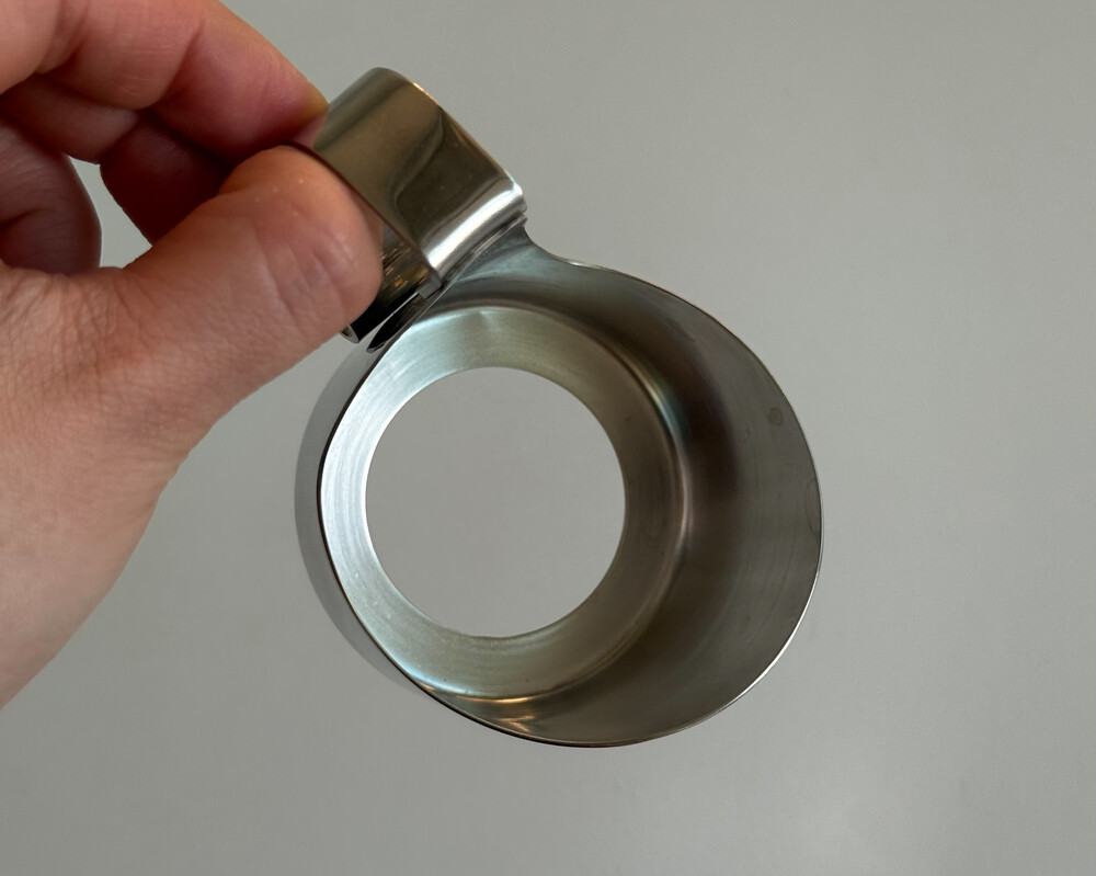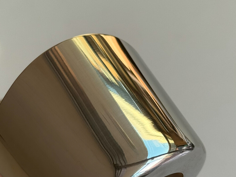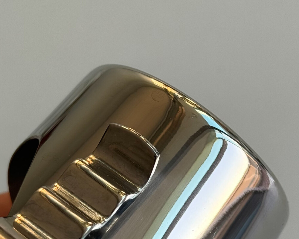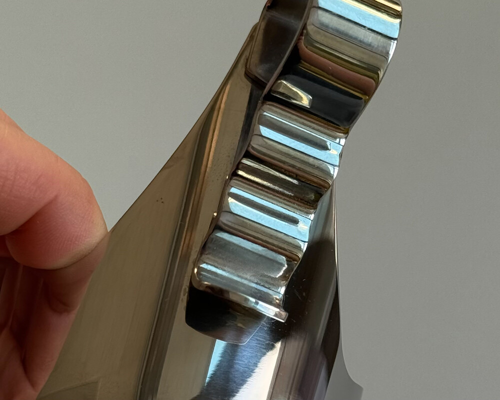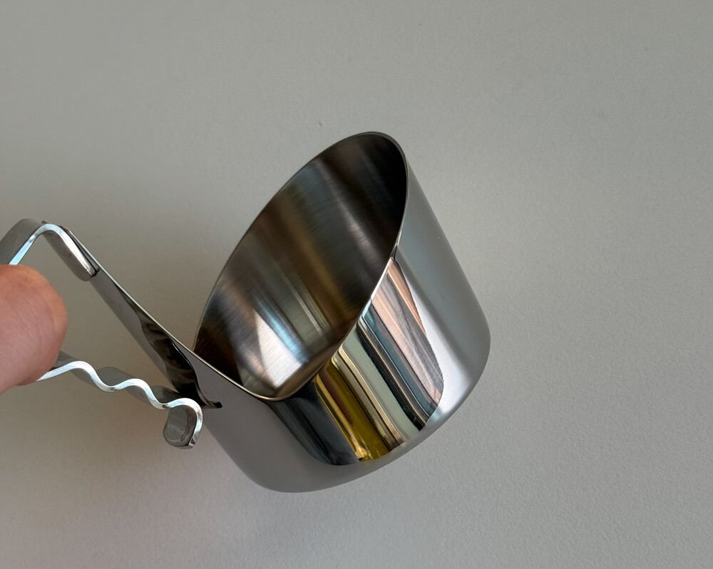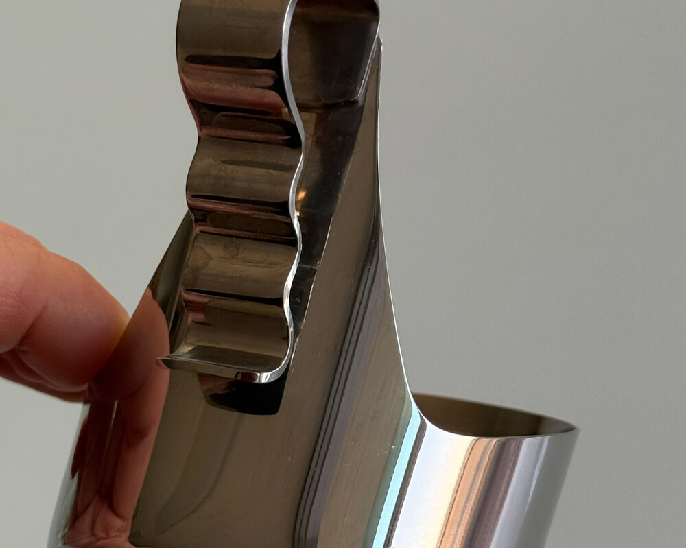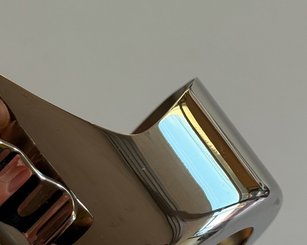 1970년대 독일 WMF에서 제작된 Cromargan 티 글라스 세트입니다. 내열(Feuerfest) 유리 컵과 크로마간 스테인리스 홀더가 결합된 구조로, 컵은 분리 가능하며 실사용과 관리가 용이합니다. 꼬임 형태의 핸들이 특징인 고급스러운 디자인입니다.