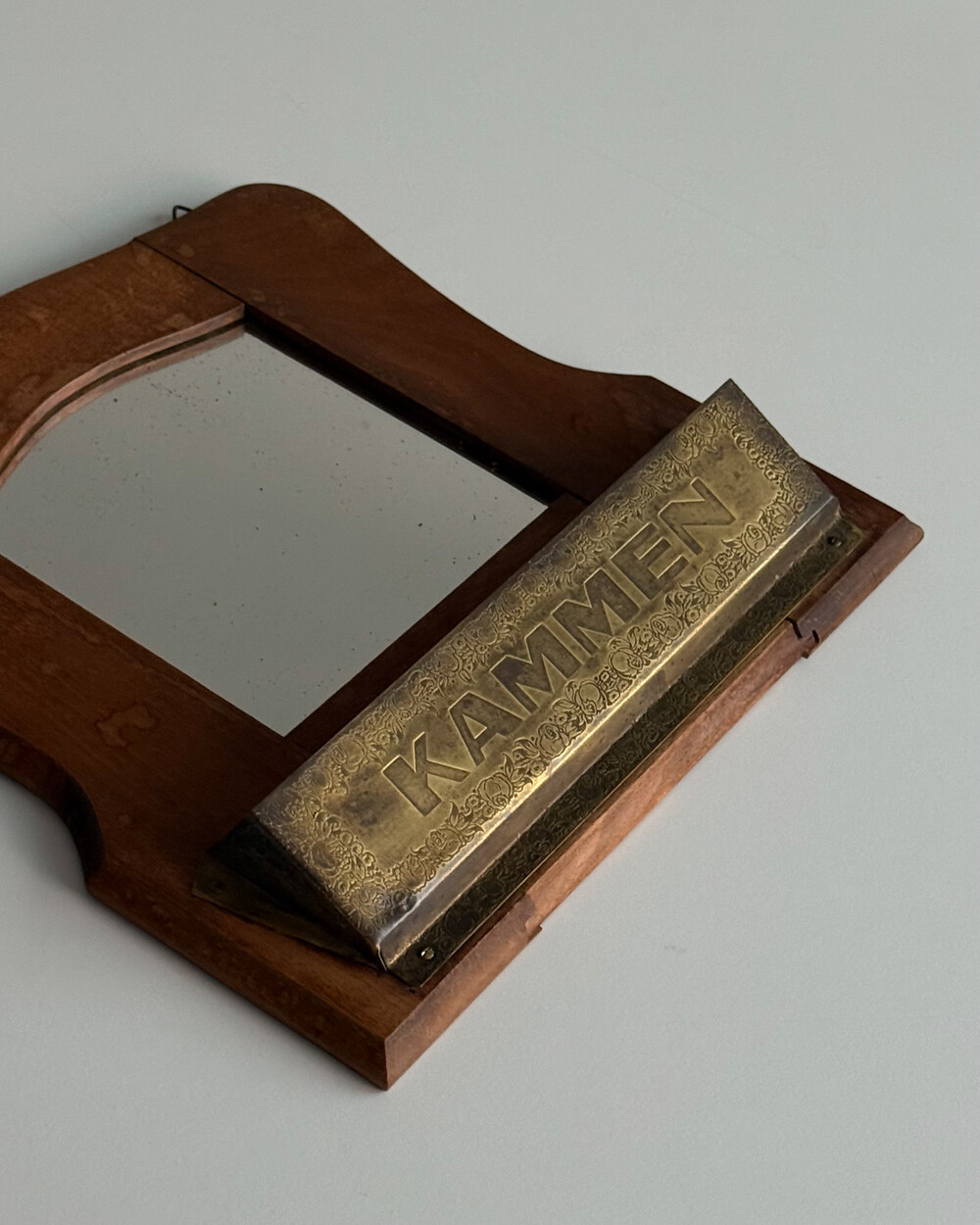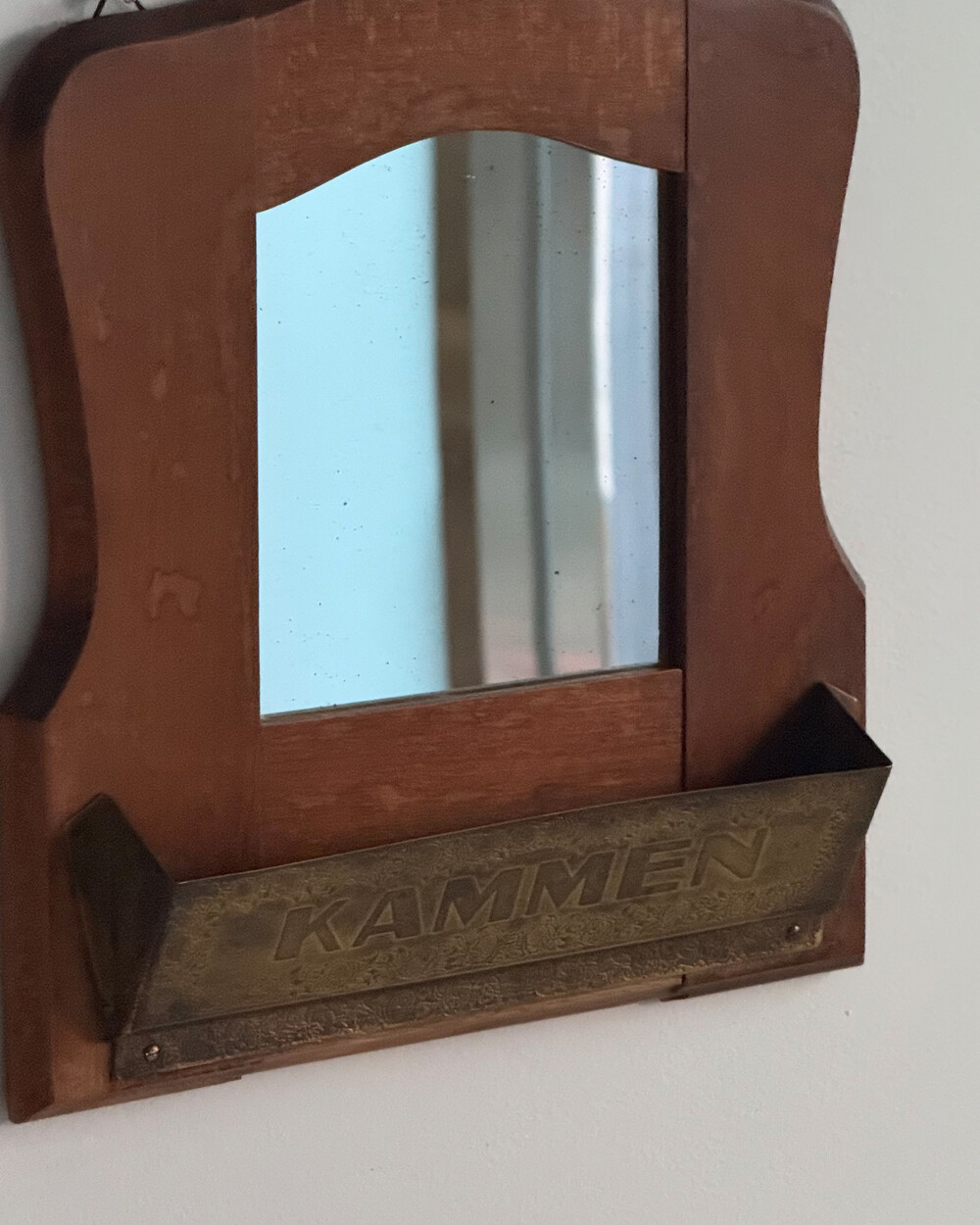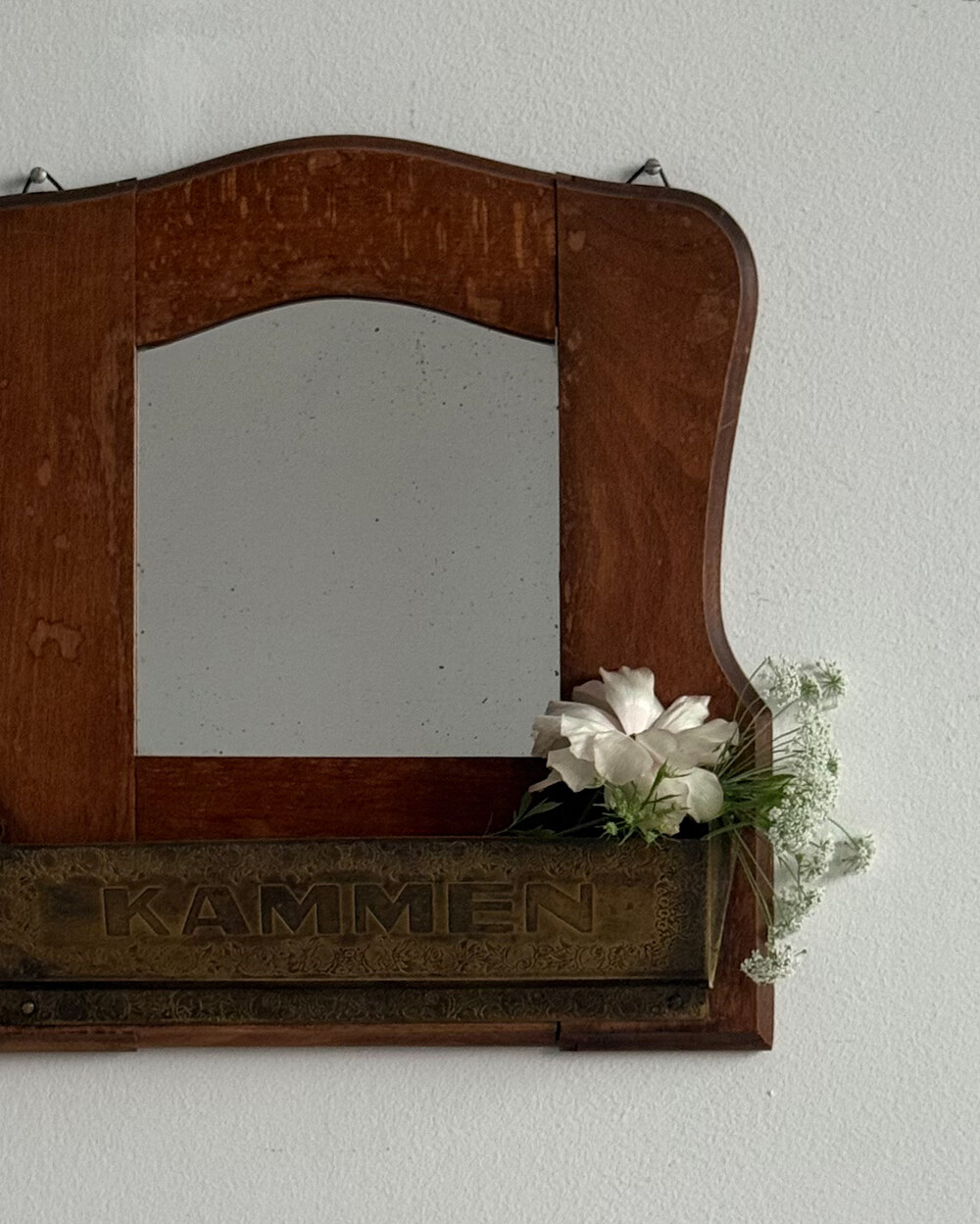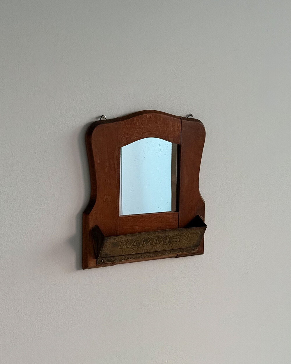 1960년대 독일에서 제작된 빈티지 벽걸이 거울입니다. 따뜻한 톤의 원목 프레임과 하단의 브라스 수납부가 조화를 이루는 디자인으로, 빗이나 작은 오브제를 함께 정리할 수 있는 실용적인 구조를 갖추고 있습니다.