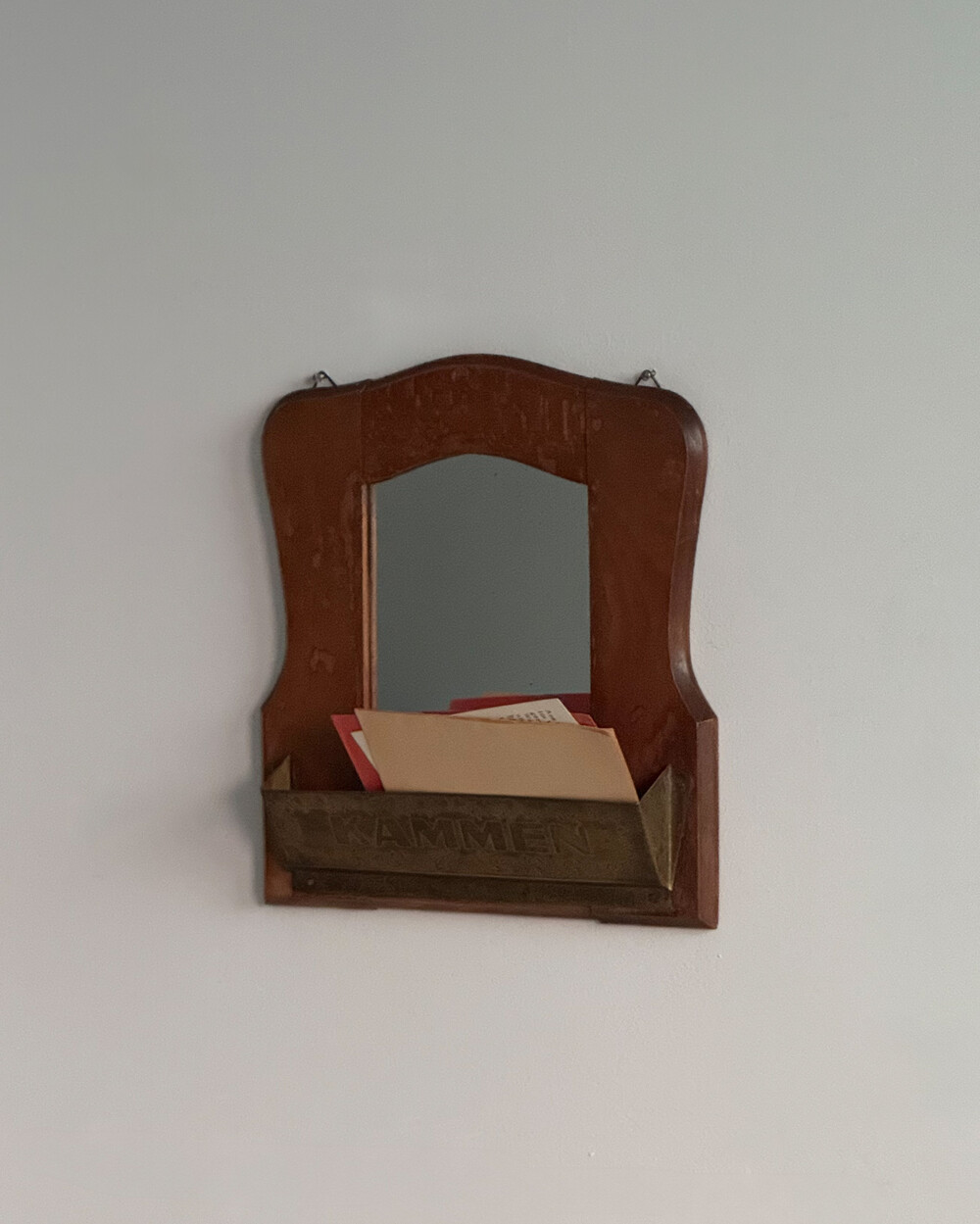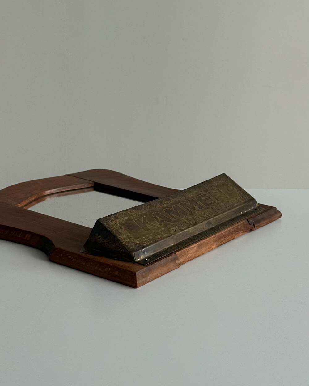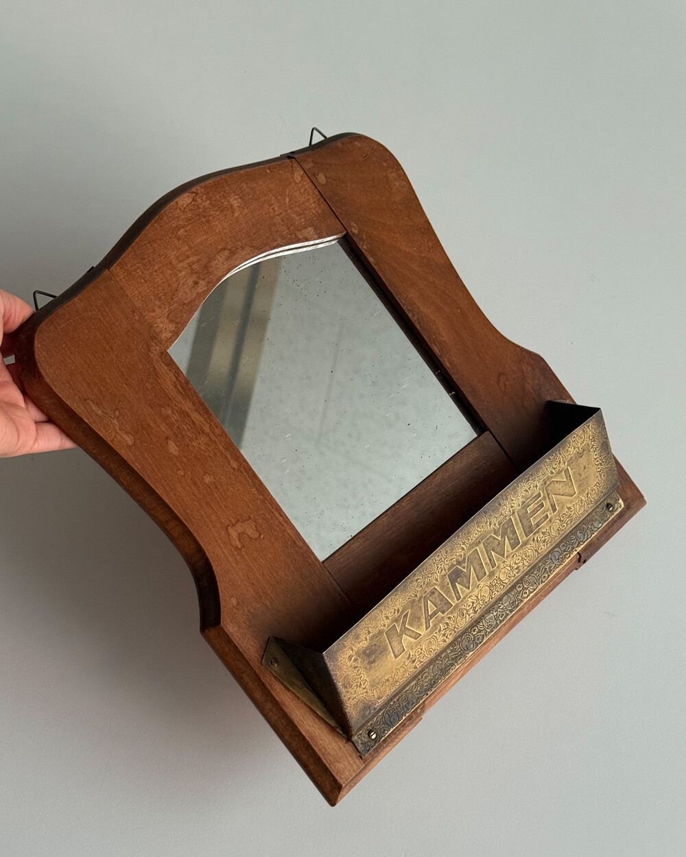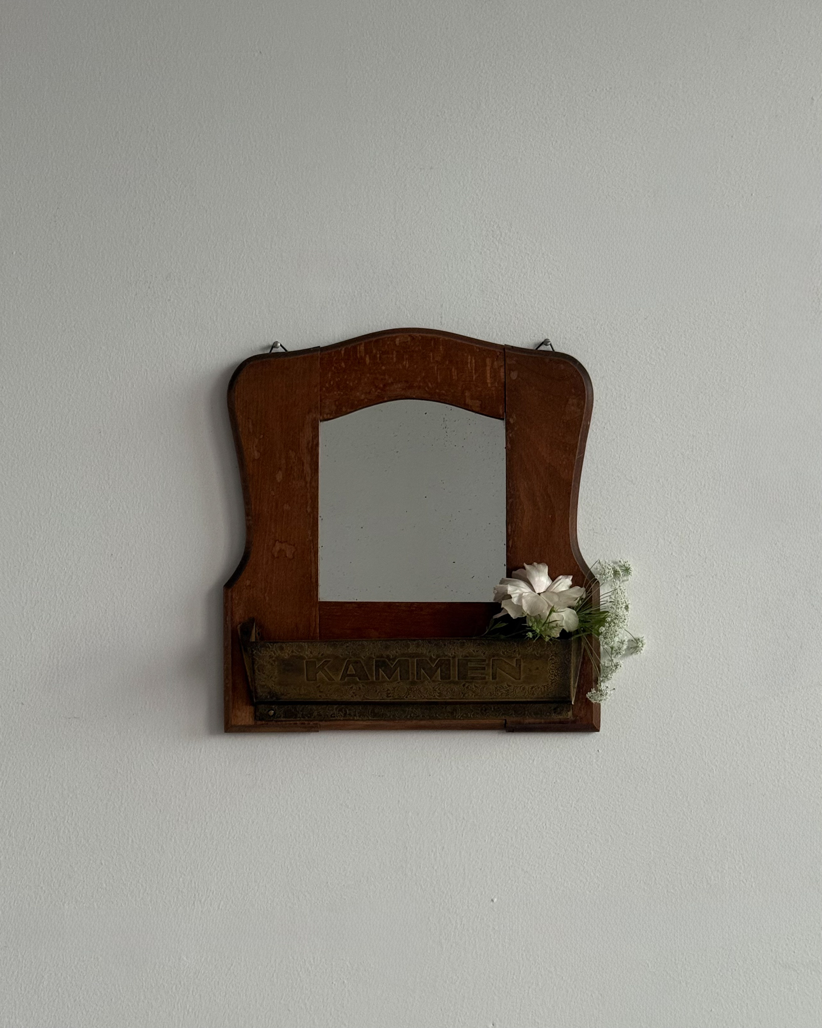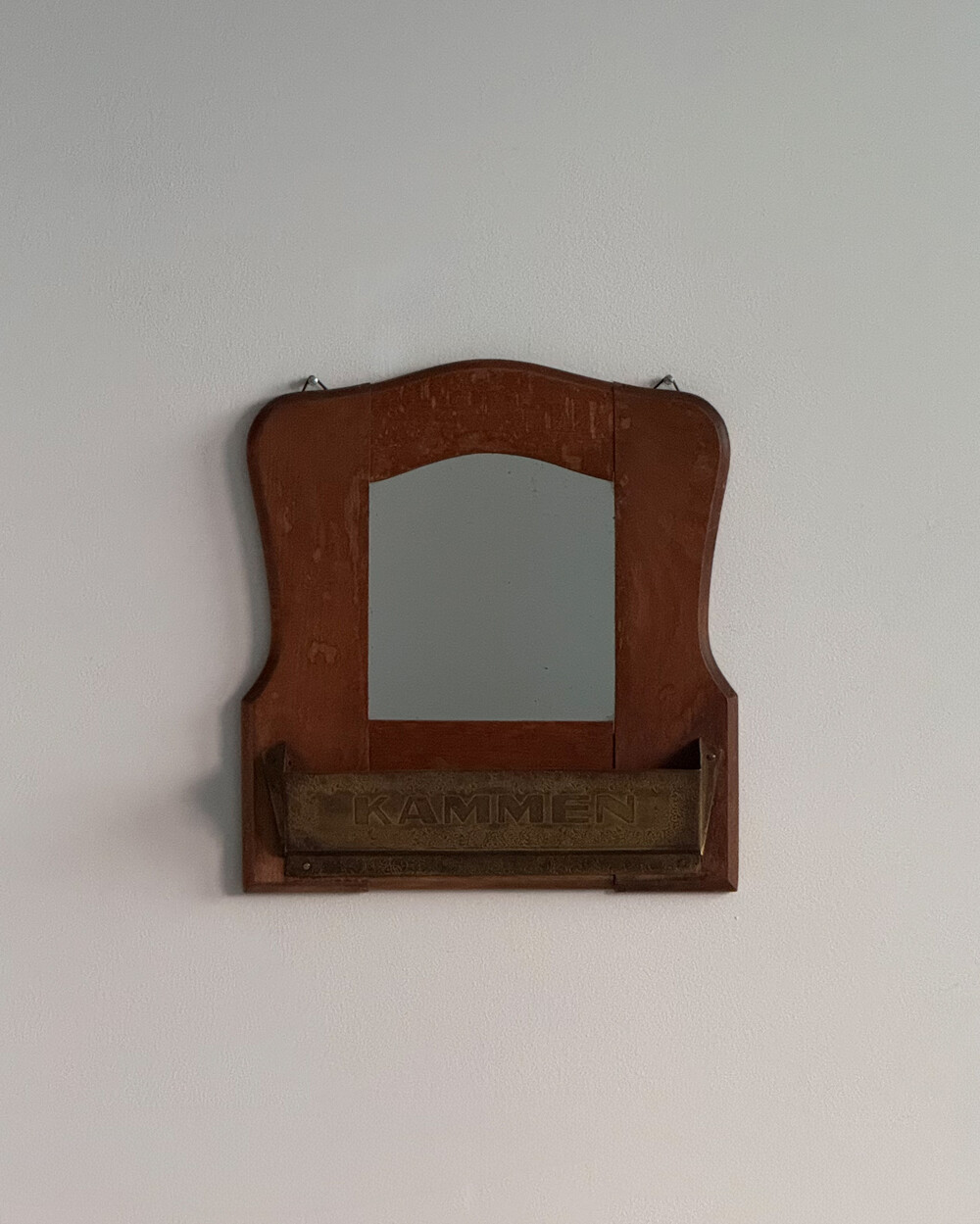 1960년대 독일에서 제작된 빈티지 벽걸이 거울입니다. 따뜻한 톤의 원목 프레임과 하단의 브라스 수납부가 조화를 이루는 디자인으로, 빗이나 작은 오브제를 함께 정리할 수 있는 실용적인 구조를 갖추고 있습니다.
