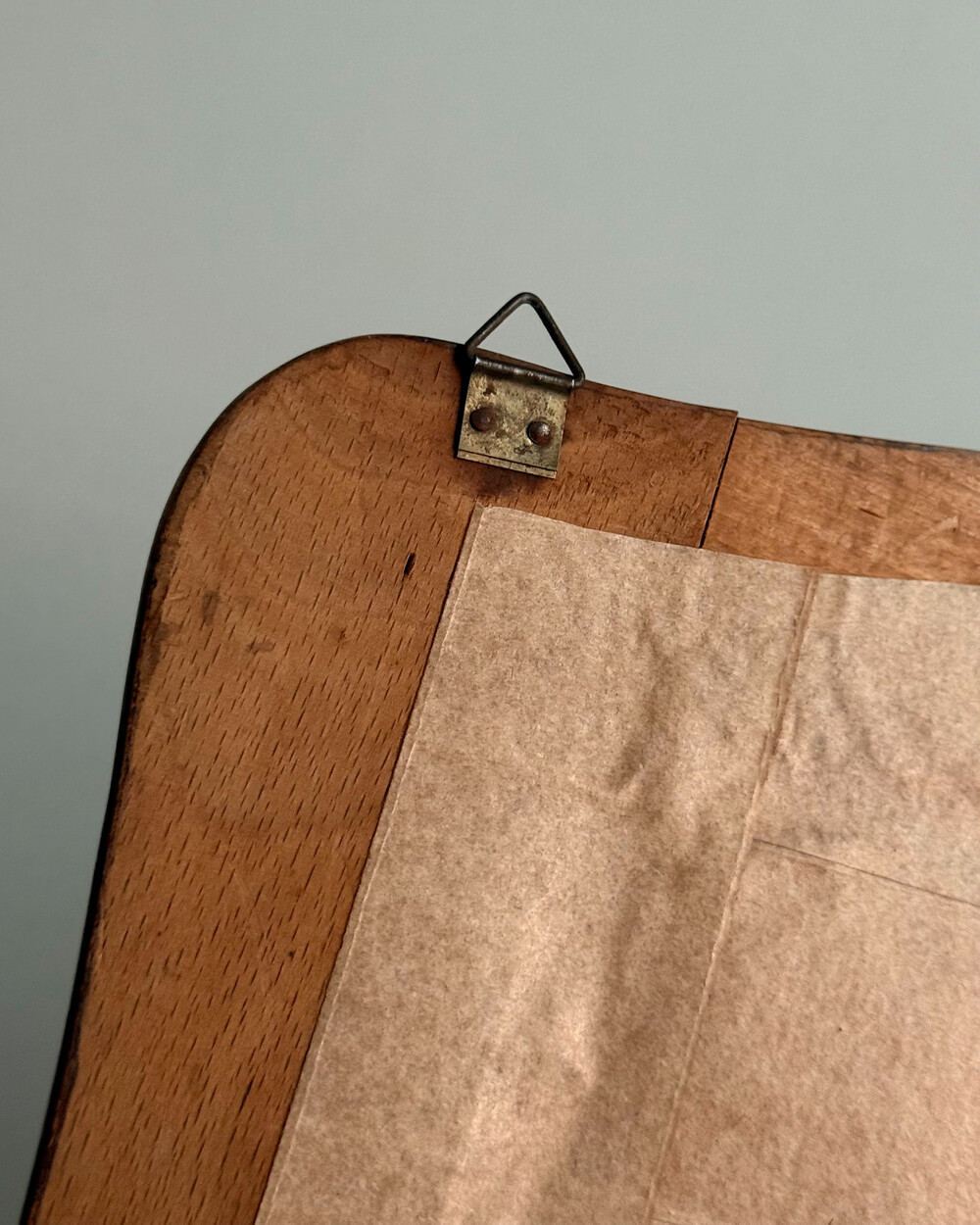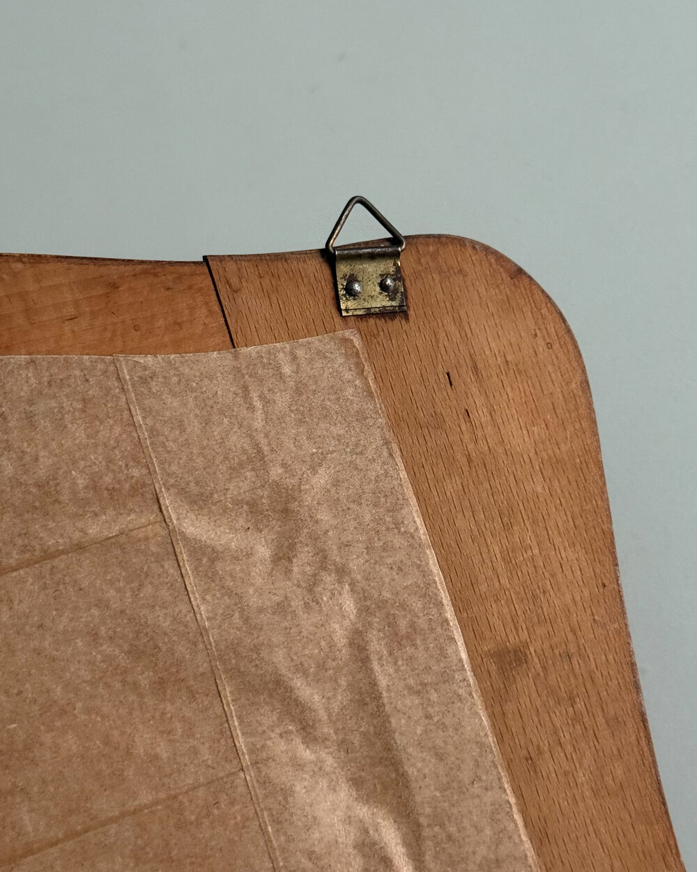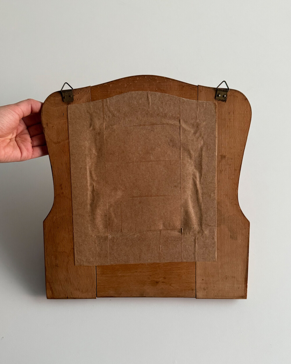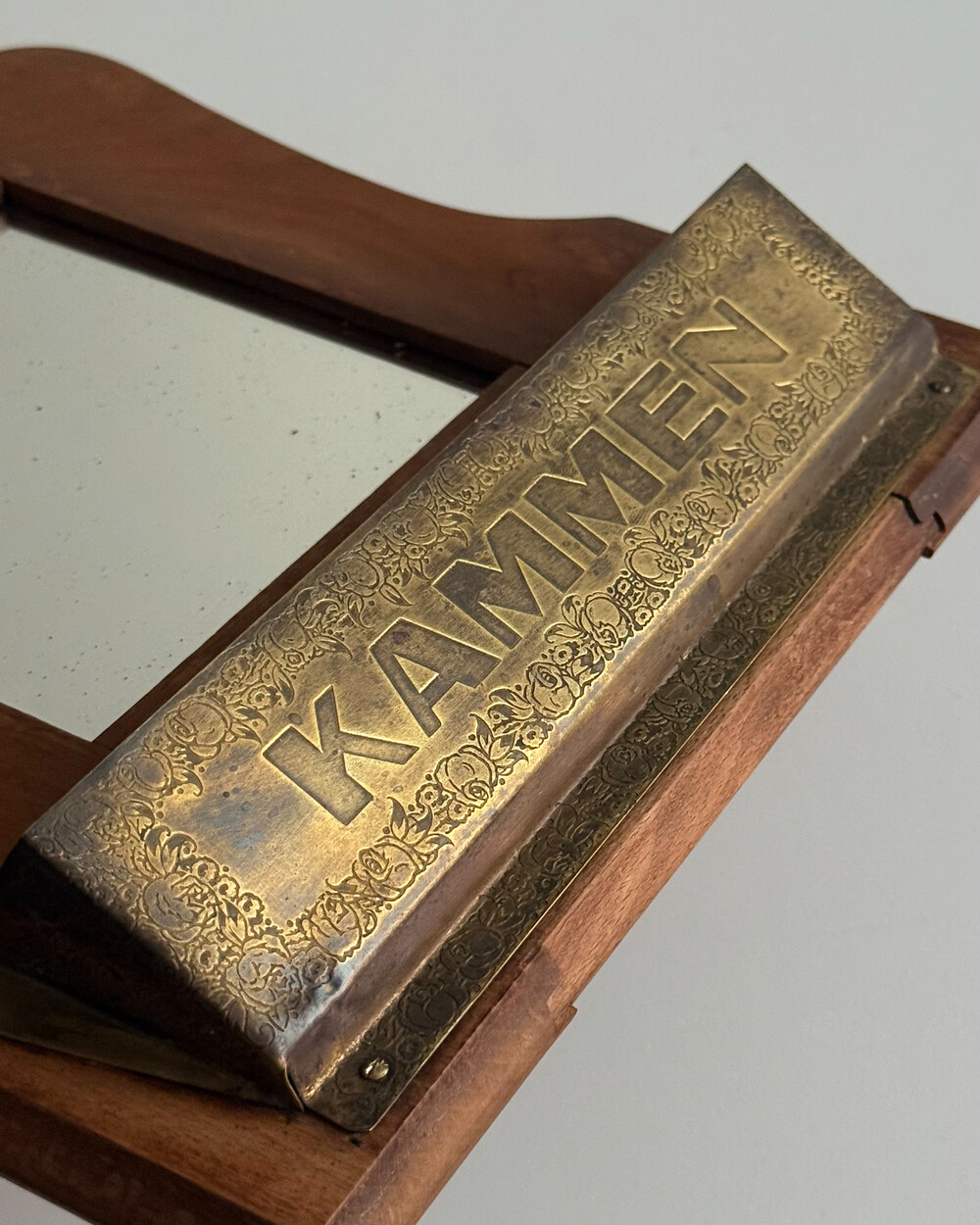1960년대 독일에서 제작된 빈티지 벽걸이 거울입니다. 따뜻한 톤의 원목 프레임과 하단의 브라스 수납부가 조화를 이루는 디자인으로, 빗이나 작은 오브제를 함께 정리할 수 있는 실용적인 구조를 갖추고 있습니다.