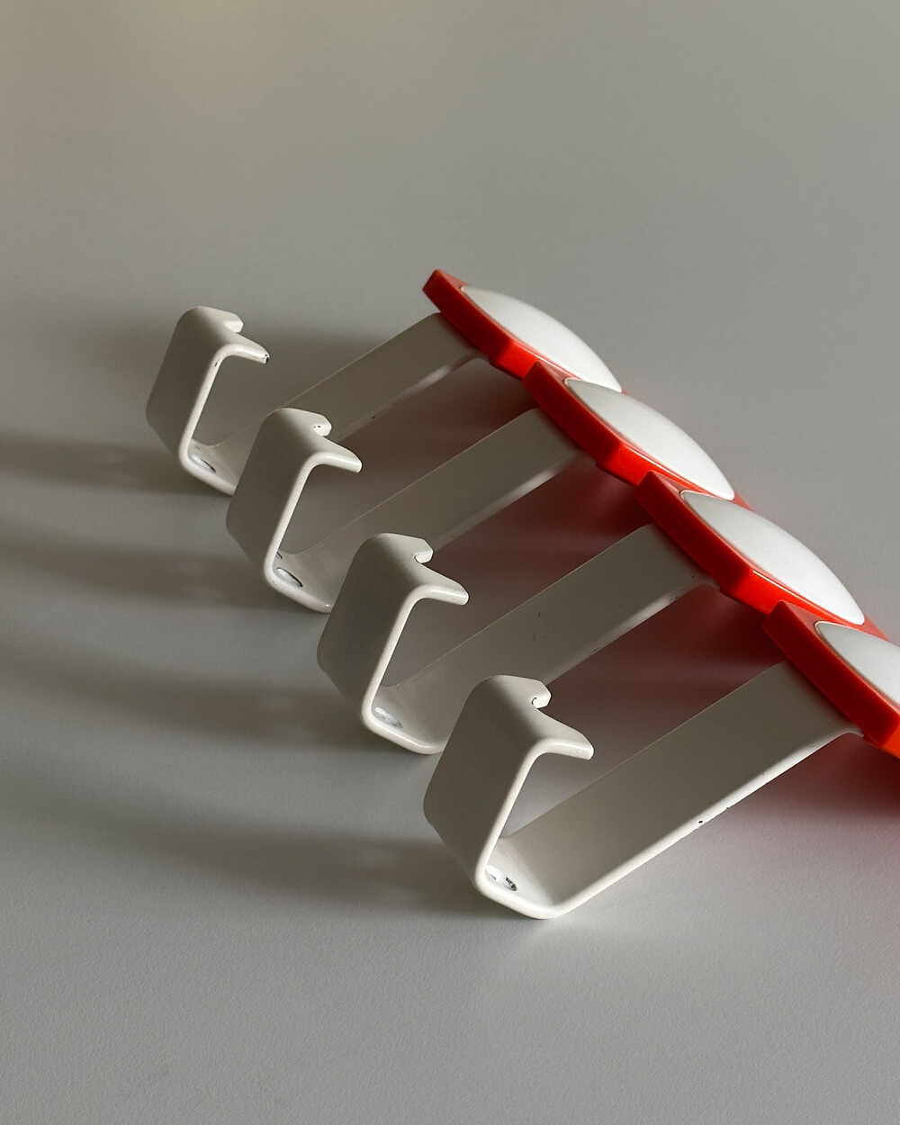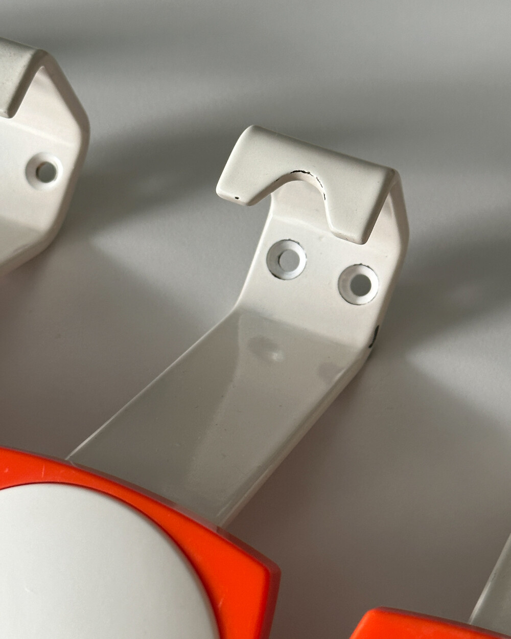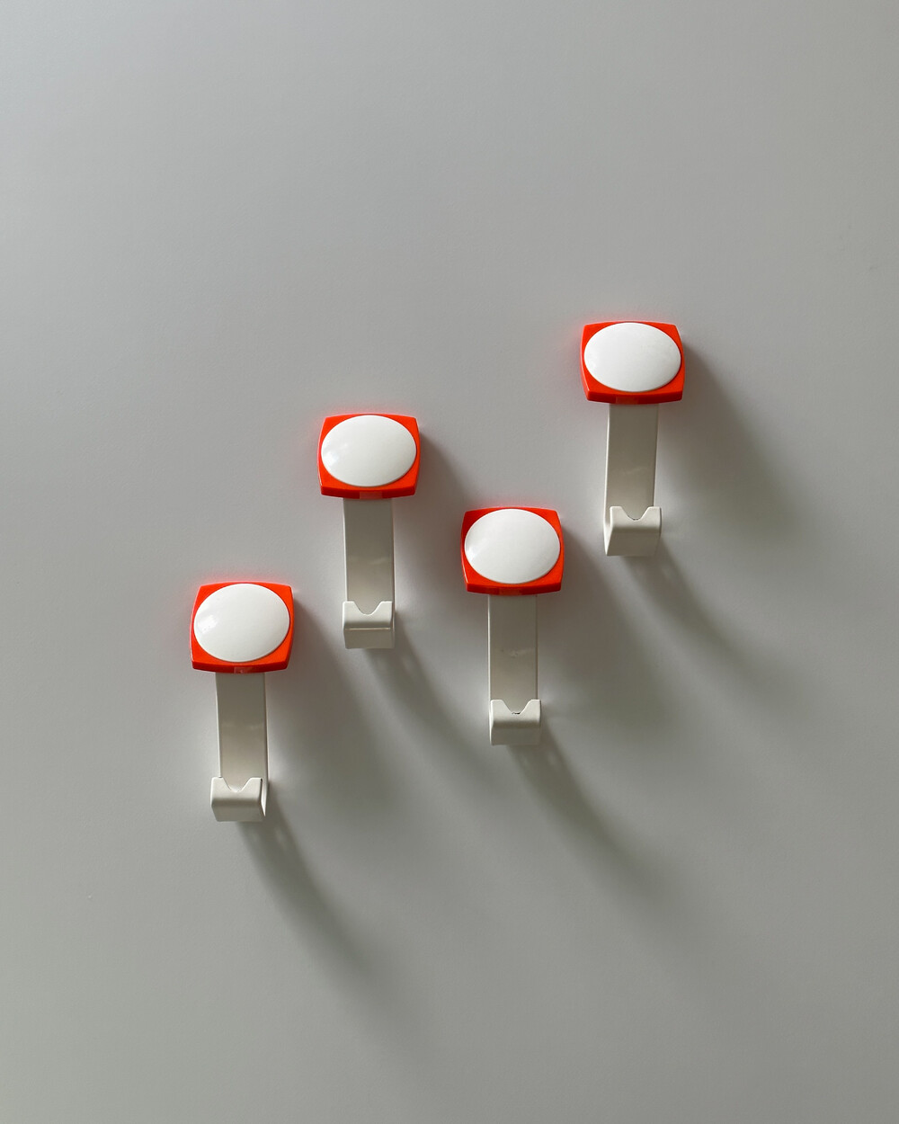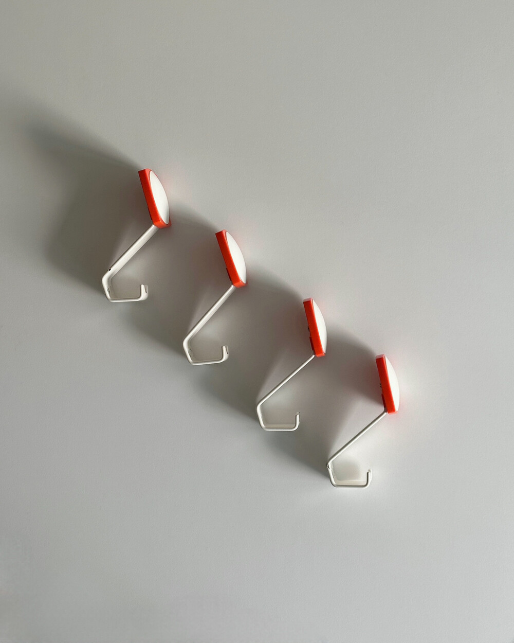 독일 빈티지 벽걸이 후크 세트입니다. 오렌지 컬러가 포인트가 되는 귀여운 디자인으로, 묵직한 메탈 소재로 이루어져 있습니다. 4개 세트로 판매되며, 후크를 배치하는 위치에 따라 다양한 연출이 가능합니다.