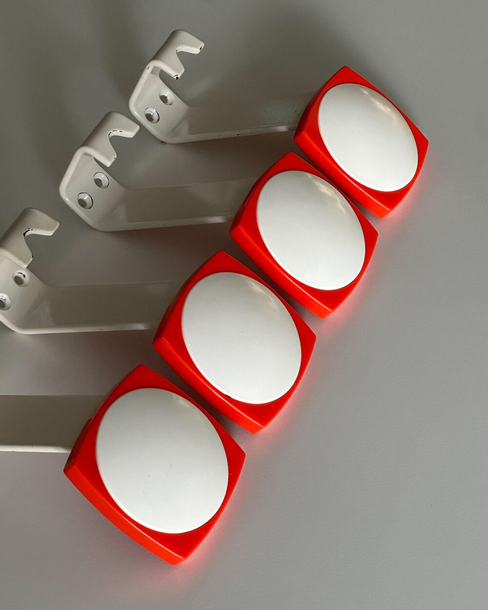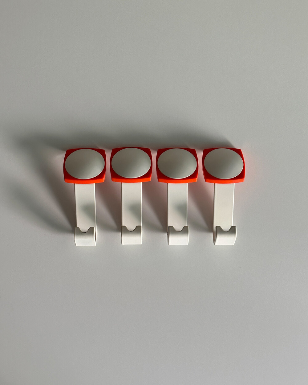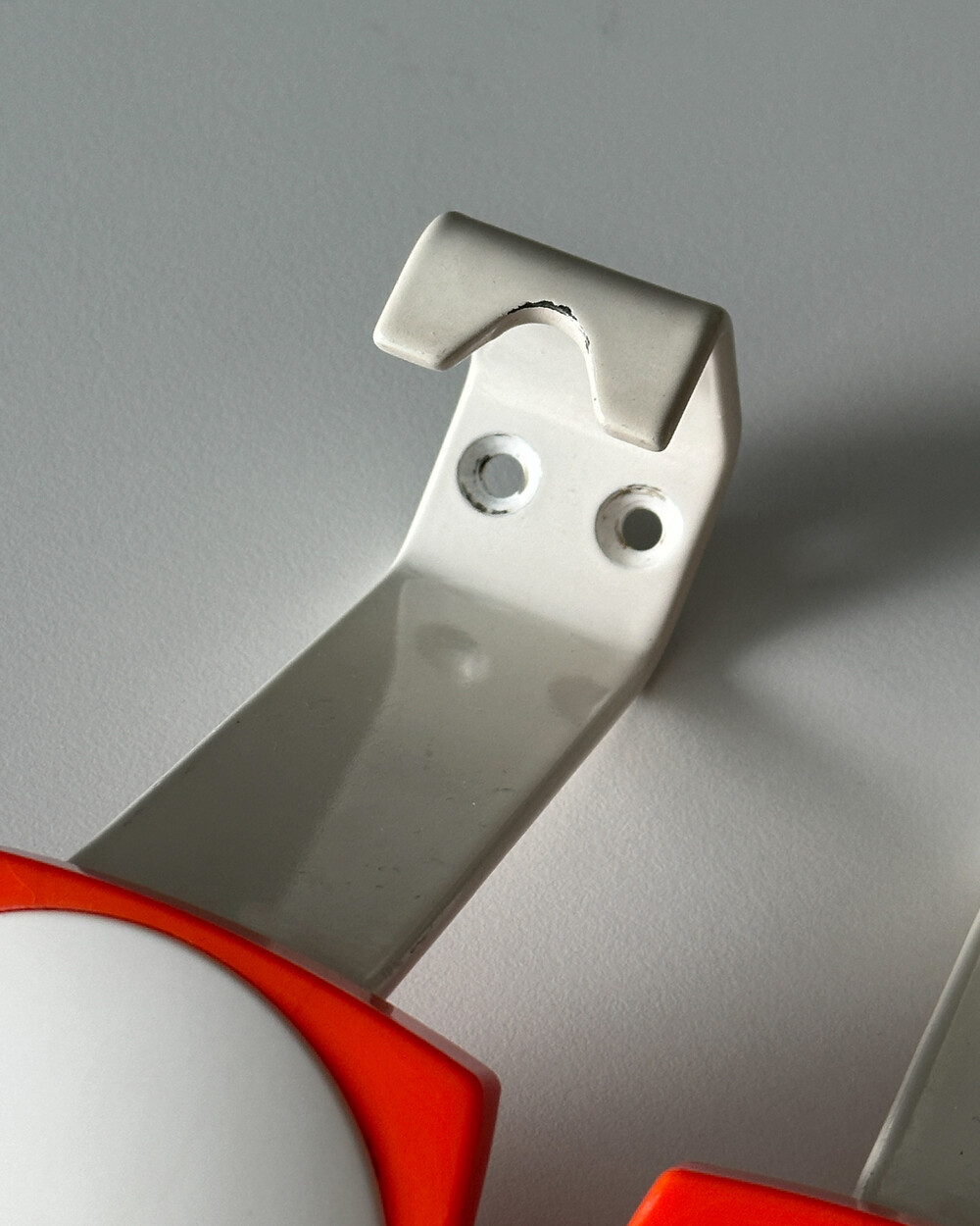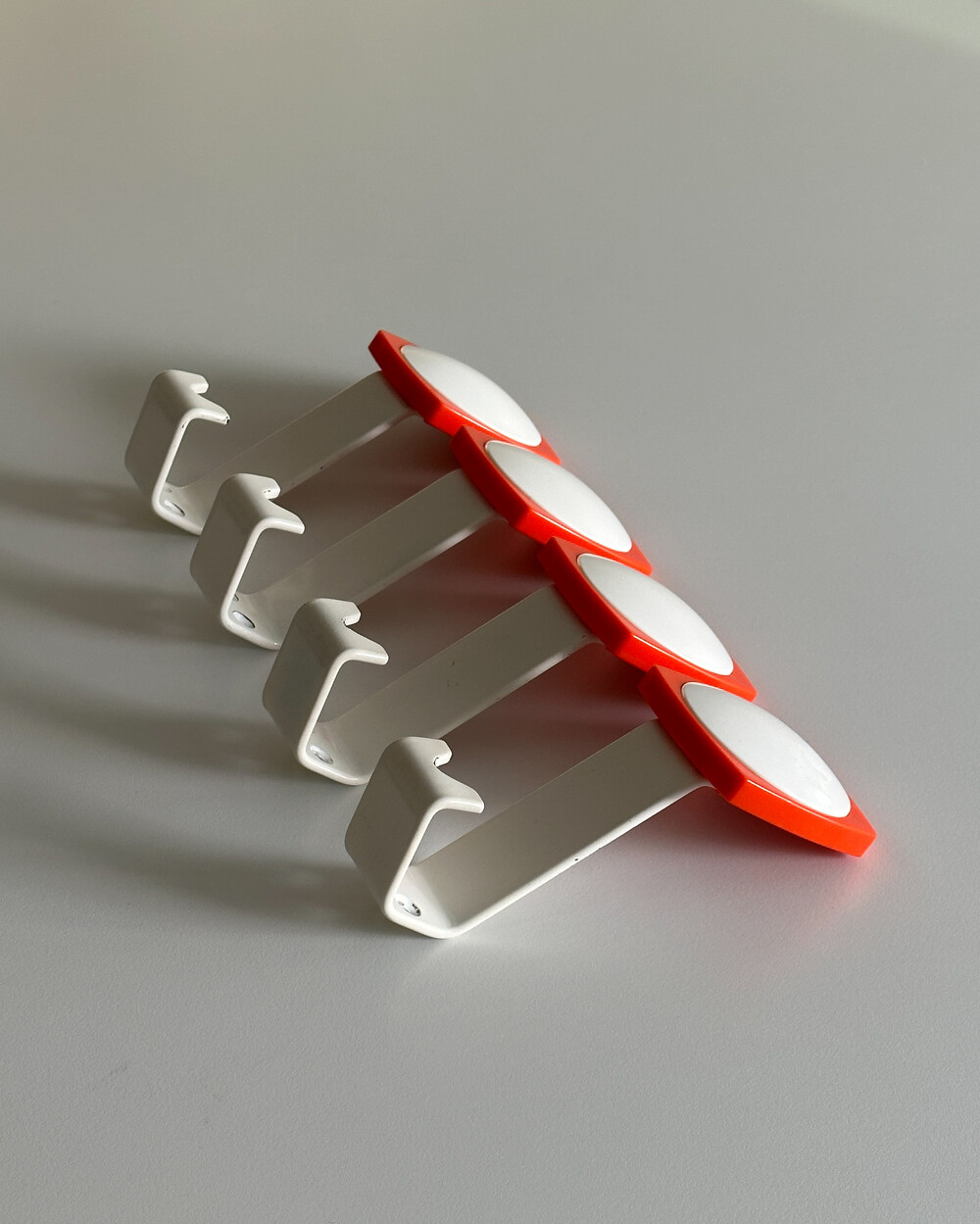 독일 빈티지 벽걸이 후크 세트입니다. 오렌지 컬러가 포인트가 되는 귀여운 디자인으로, 묵직한 메탈 소재로 이루어져 있습니다. 4개 세트로 판매되며, 후크를 배치하는 위치에 따라 다양한 연출이 가능합니다.