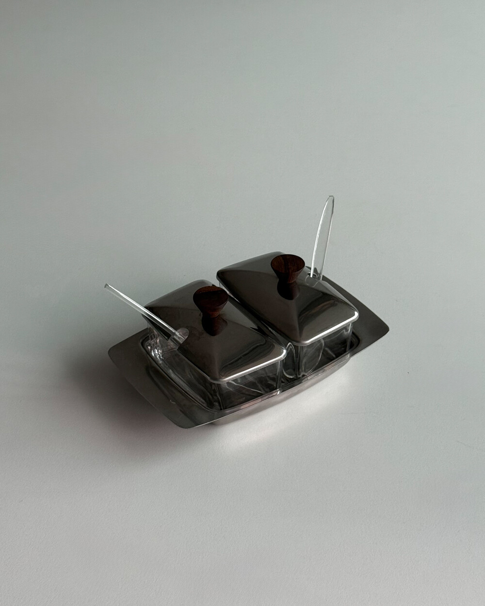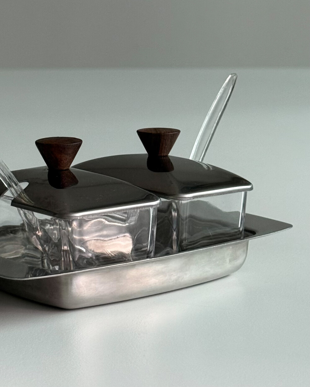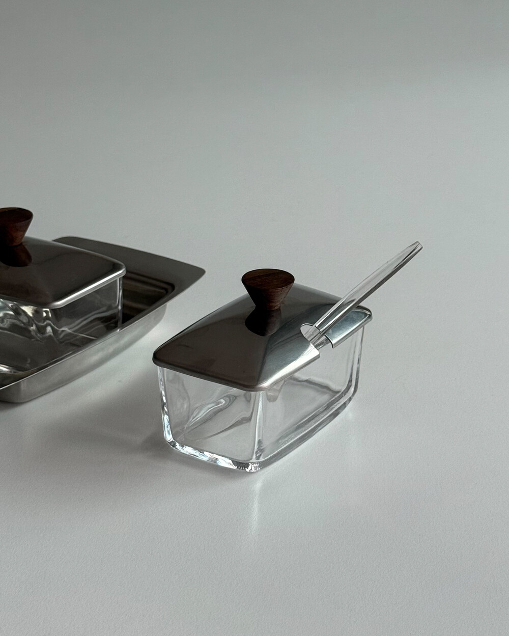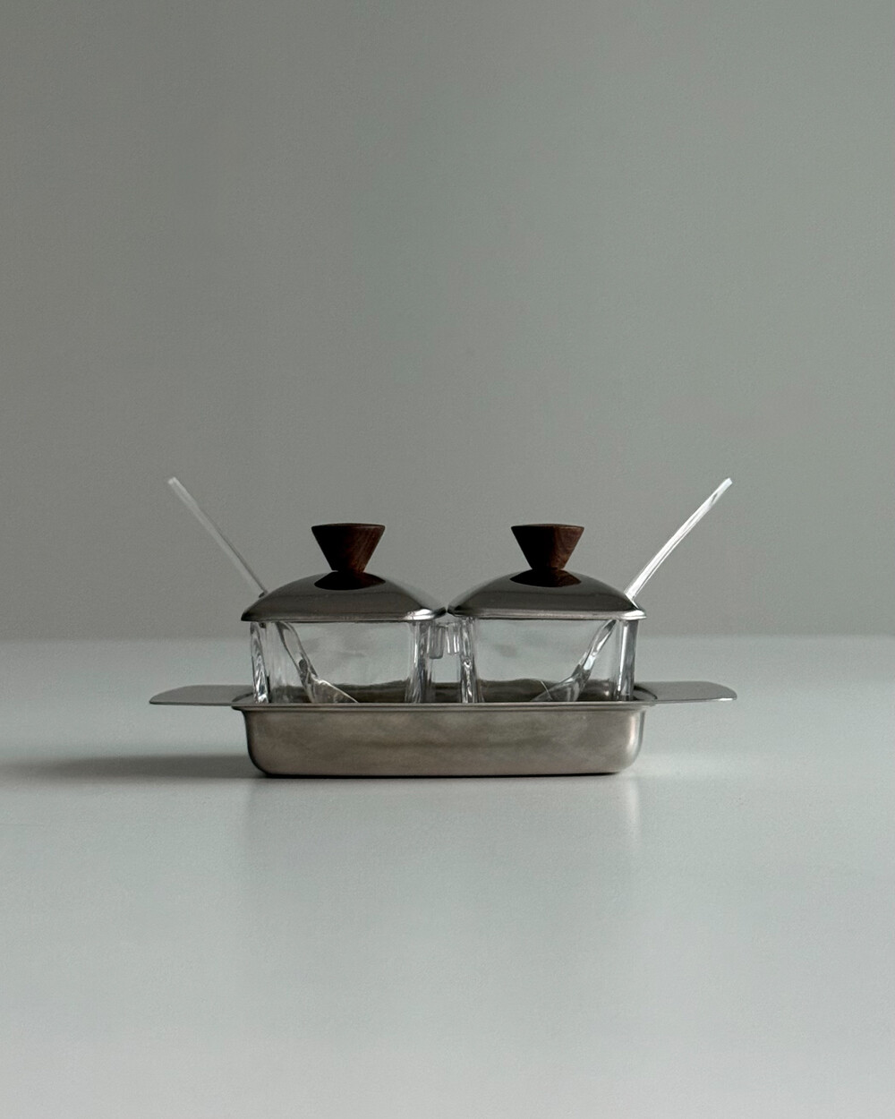 60년대 독일 BRAUN & KEMMLER에서 제작된 빈티지 팟 세트입니다. 두 개의 유리 용기와 티크 우드 손잡이 뚜껑, 아크릴 스푼, 그리고 스테인리스 트레이로 구성되어 있습니다. 잼, 꿀, 소스 등을 덜어 위생적으로 보관할 수 있습니다.
