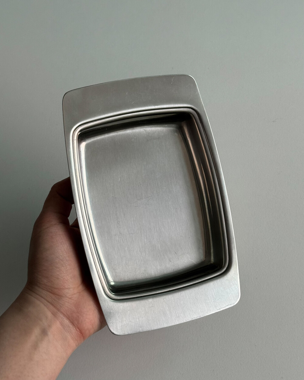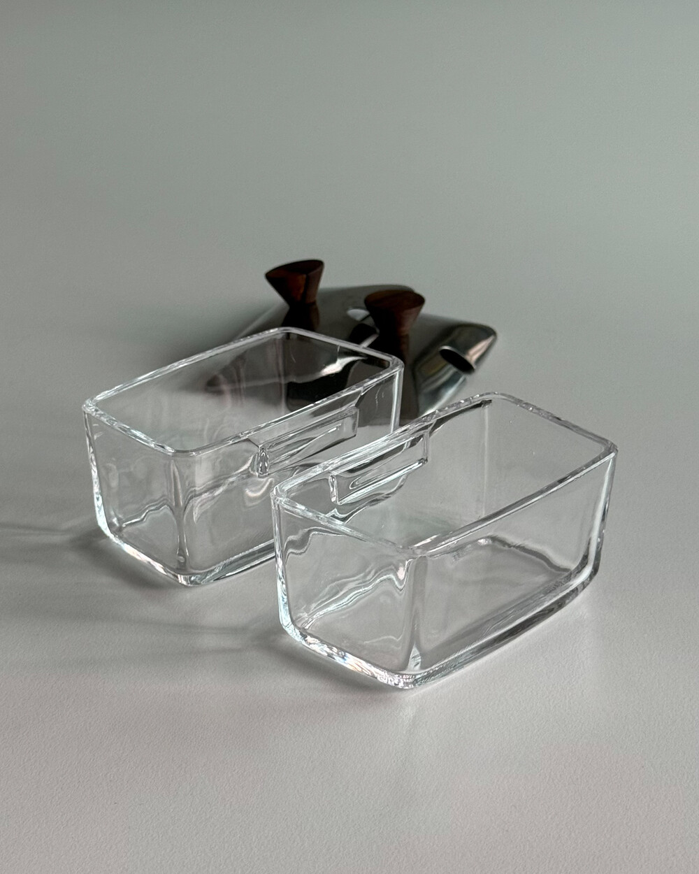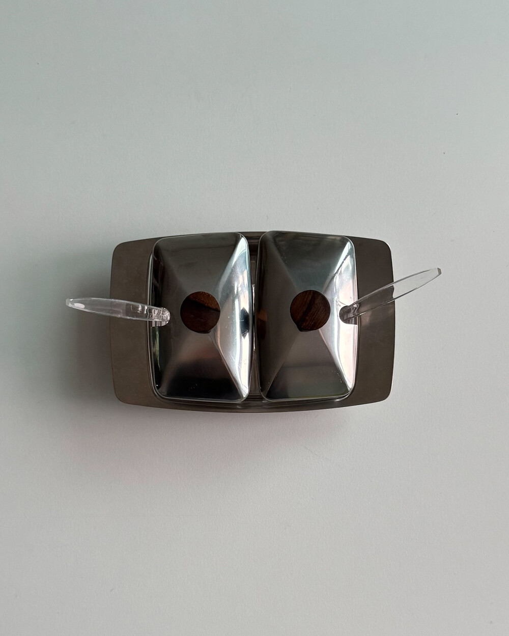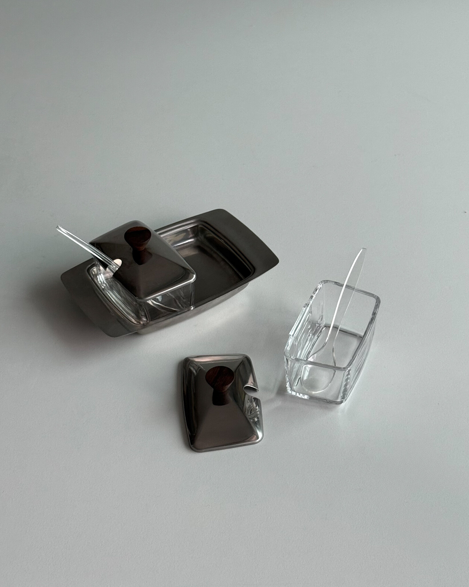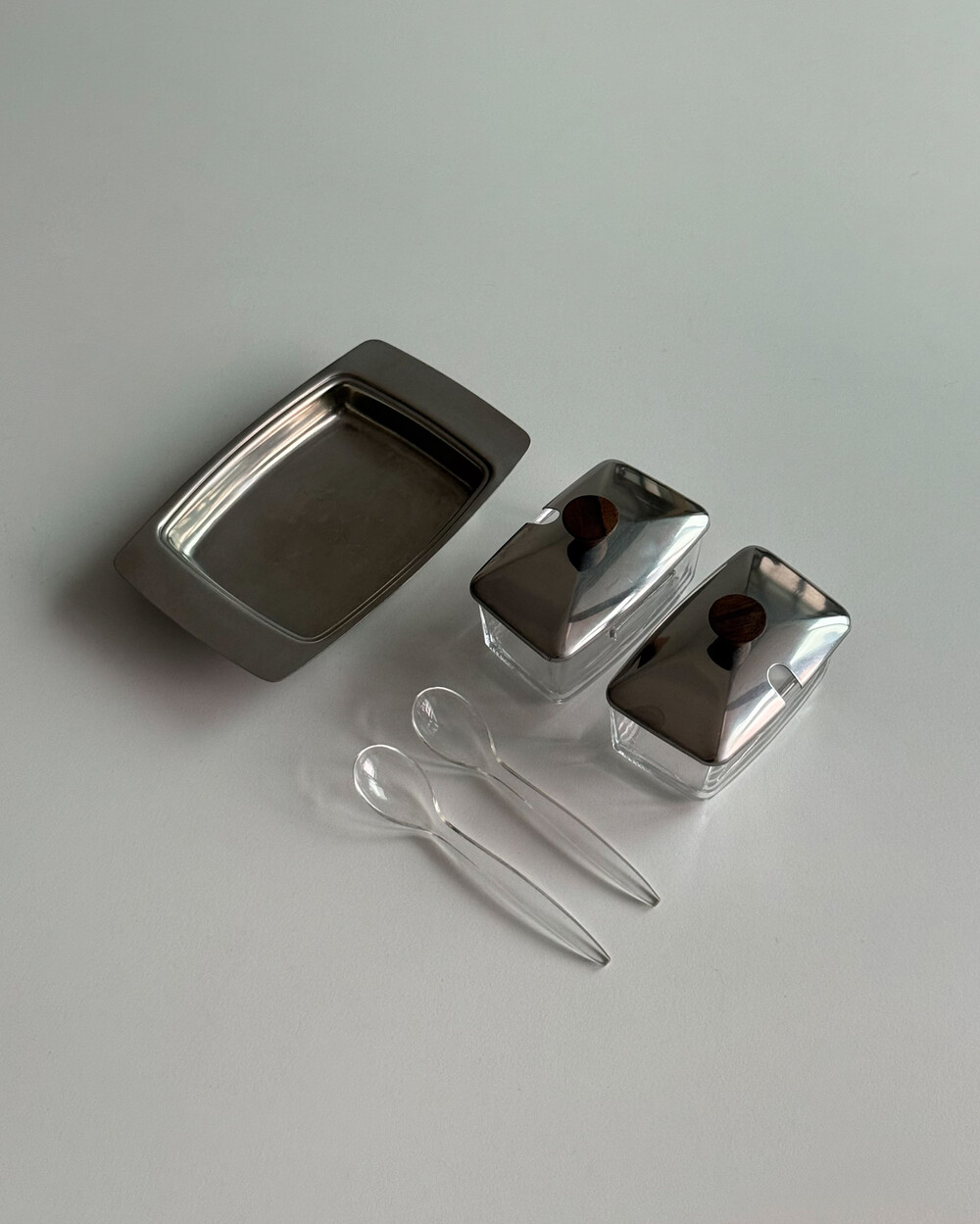 60년대 독일 BRAUN & KEMMLER에서 제작된 빈티지 팟 세트입니다. 두 개의 유리 용기와 티크 우드 손잡이 뚜껑, 아크릴 스푼, 그리고 스테인리스 트레이로 구성되어 있습니다. 잼, 꿀, 소스 등을 덜어 위생적으로 보관할 수 있습니다.