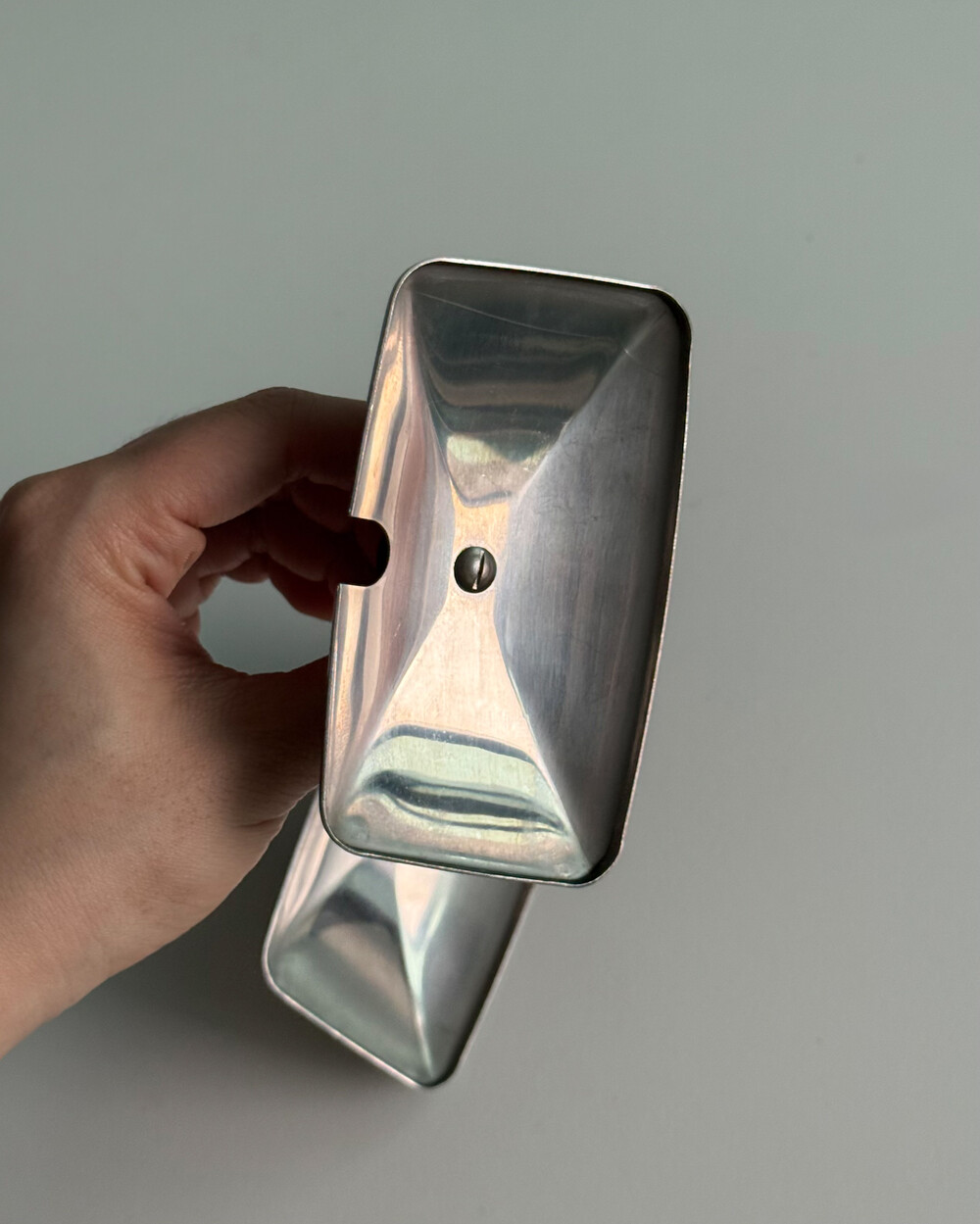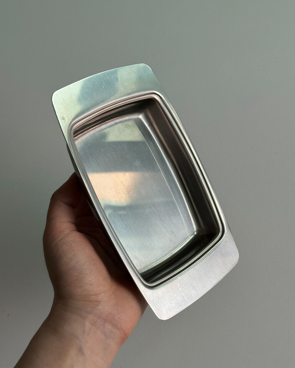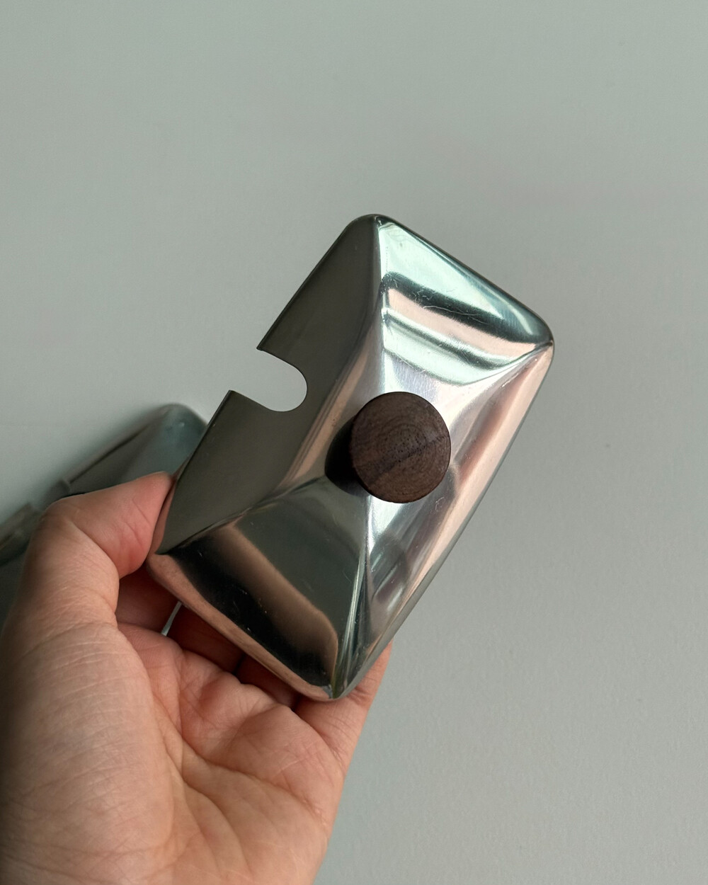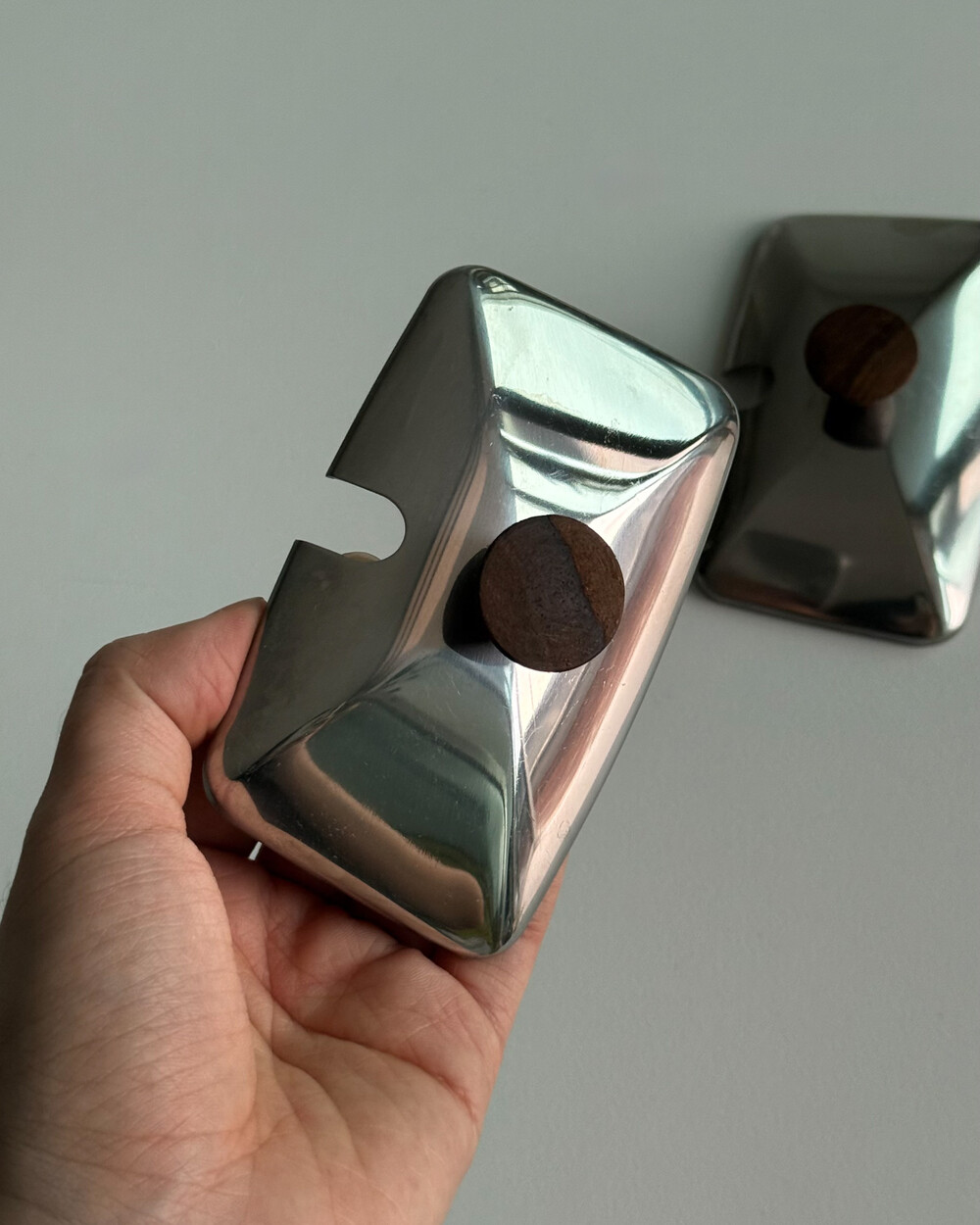 60년대 독일 BRAUN & KEMMLER에서 제작된 빈티지 팟 세트입니다. 두 개의 유리 용기와 티크 우드 손잡이 뚜껑, 아크릴 스푼, 그리고 스테인리스 트레이로 구성되어 있습니다. 잼, 꿀, 소스 등을 덜어 위생적으로 보관할 수 있습니다.