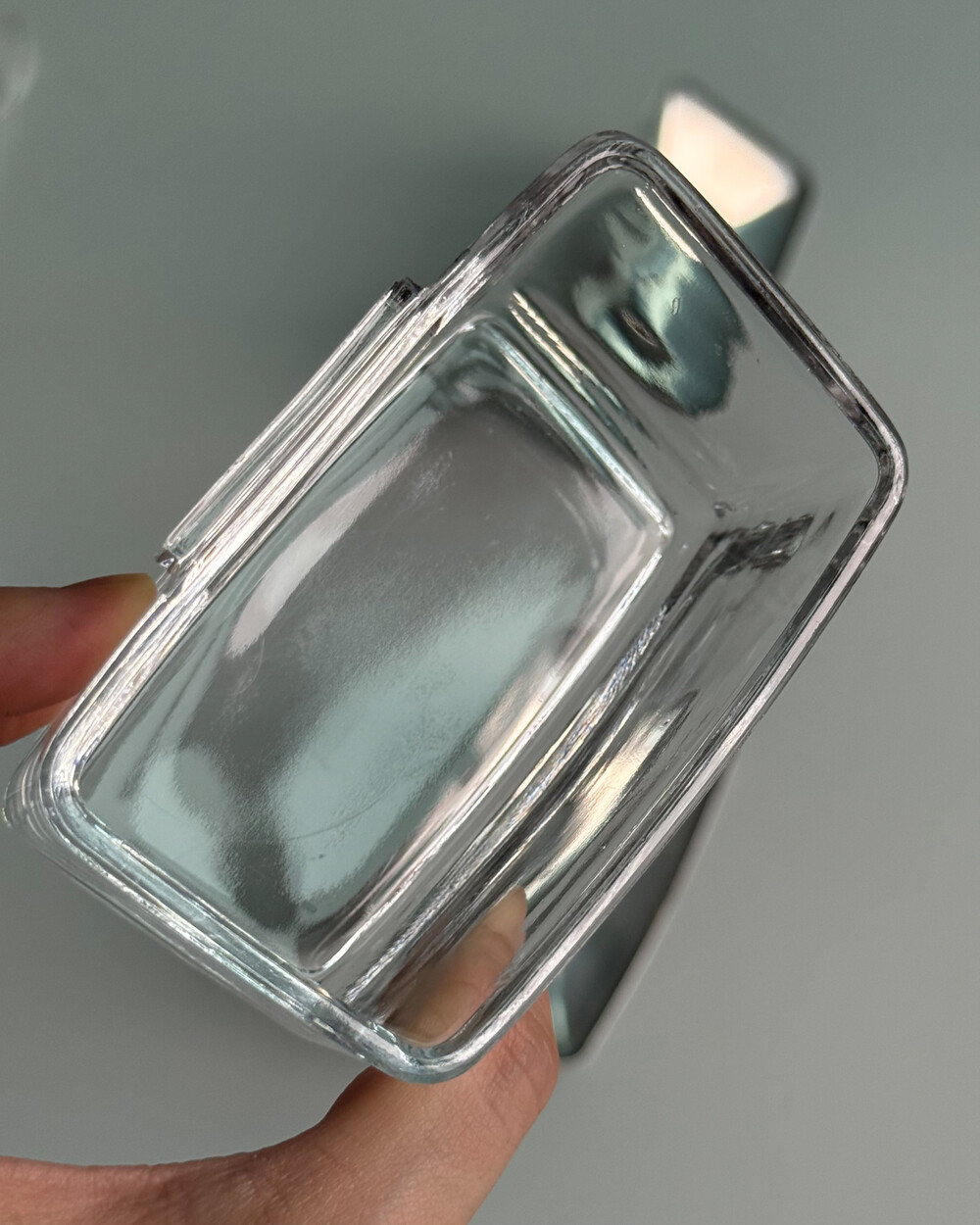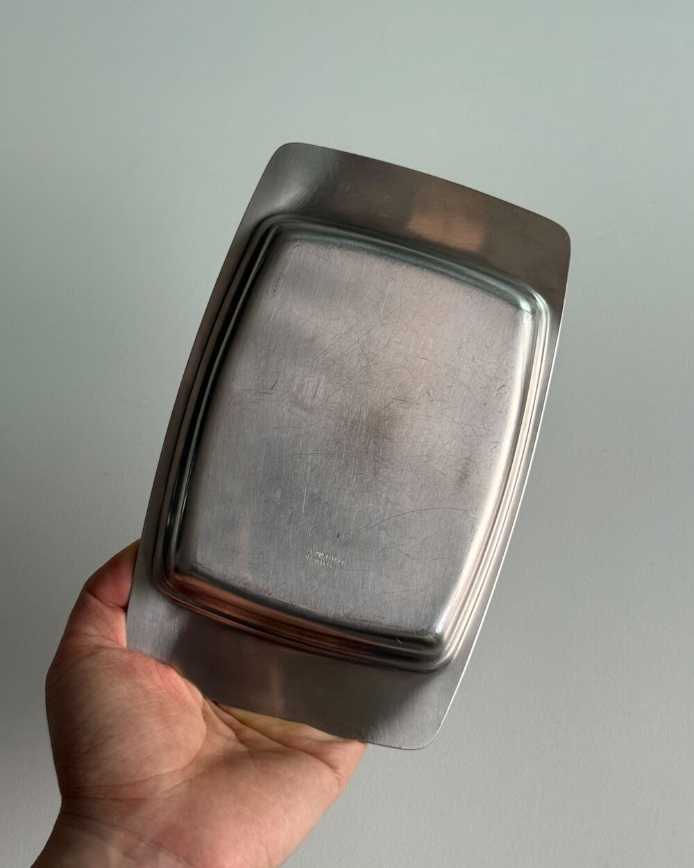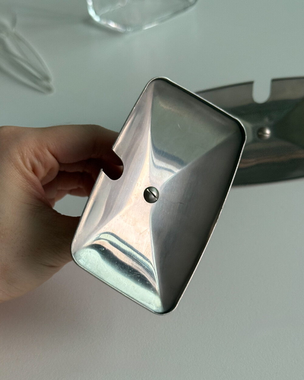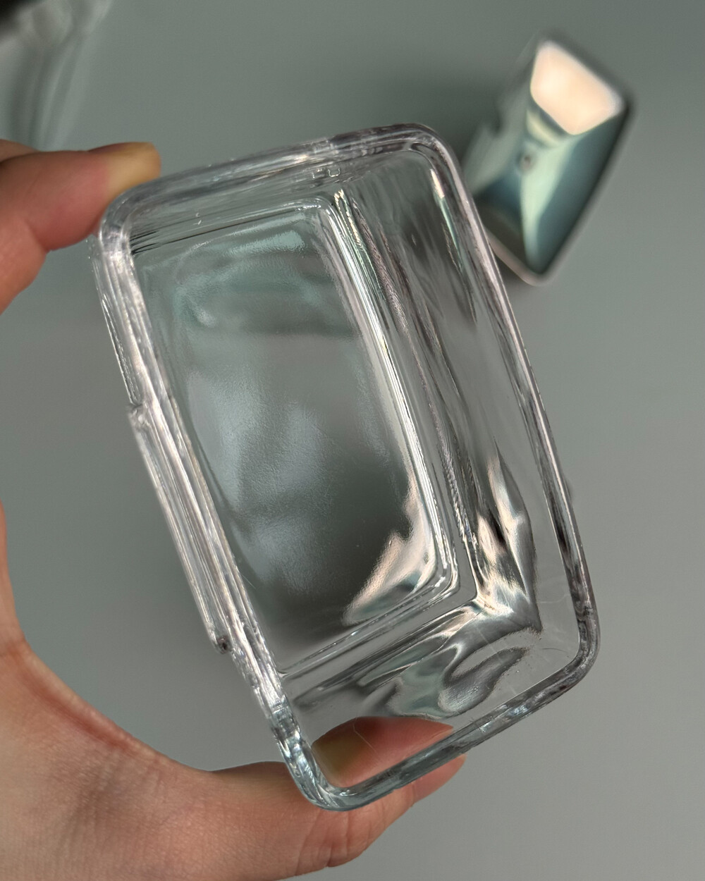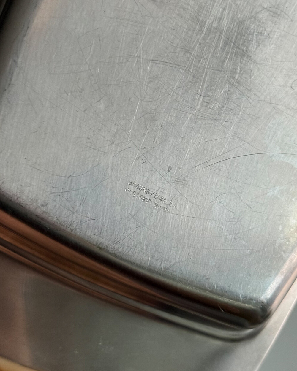 60년대 독일 BRAUN & KEMMLER에서 제작된 빈티지 팟 세트입니다. 두 개의 유리 용기와 티크 우드 손잡이 뚜껑, 아크릴 스푼, 그리고 스테인리스 트레이로 구성되어 있습니다. 잼, 꿀, 소스 등을 덜어 위생적으로 보관할 수 있습니다.