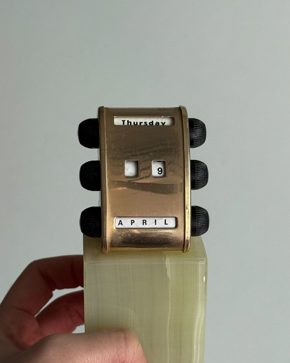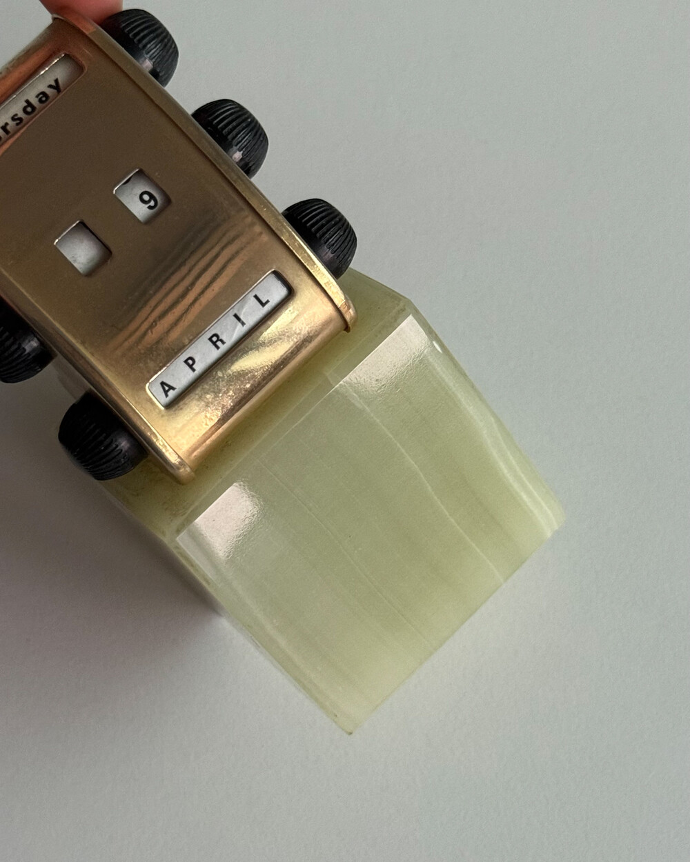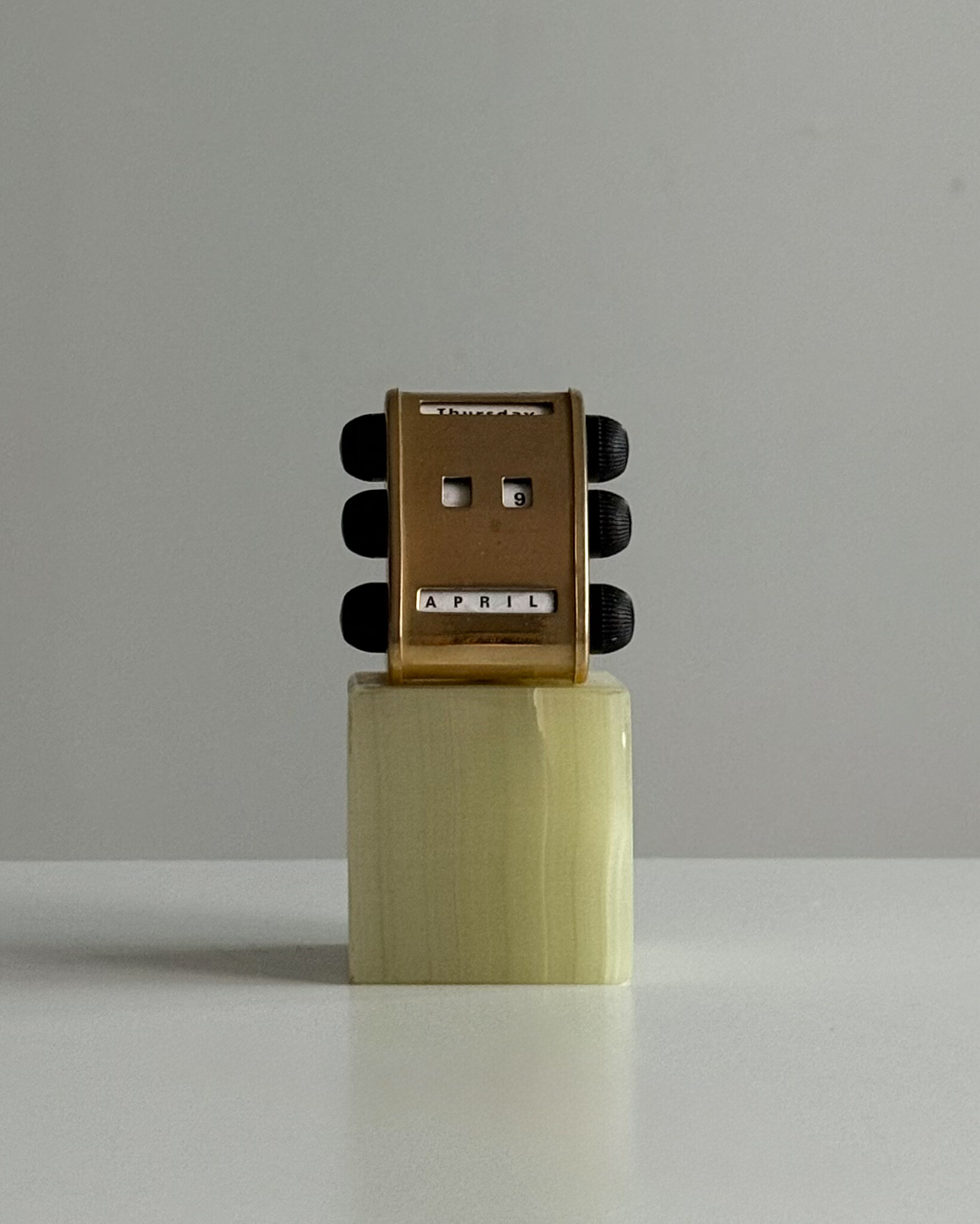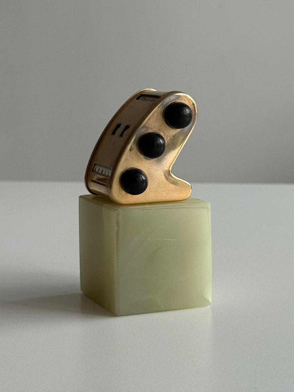 1970년대 영국에서 제작된 퍼페추얼 캘린더입니다. 묵직하고 은은한 광택을 지닌 천연 오닉스 원석 베이스와 상단 금속 달력 본체가 결합되어 있는 고급스러운 디자인입니다.