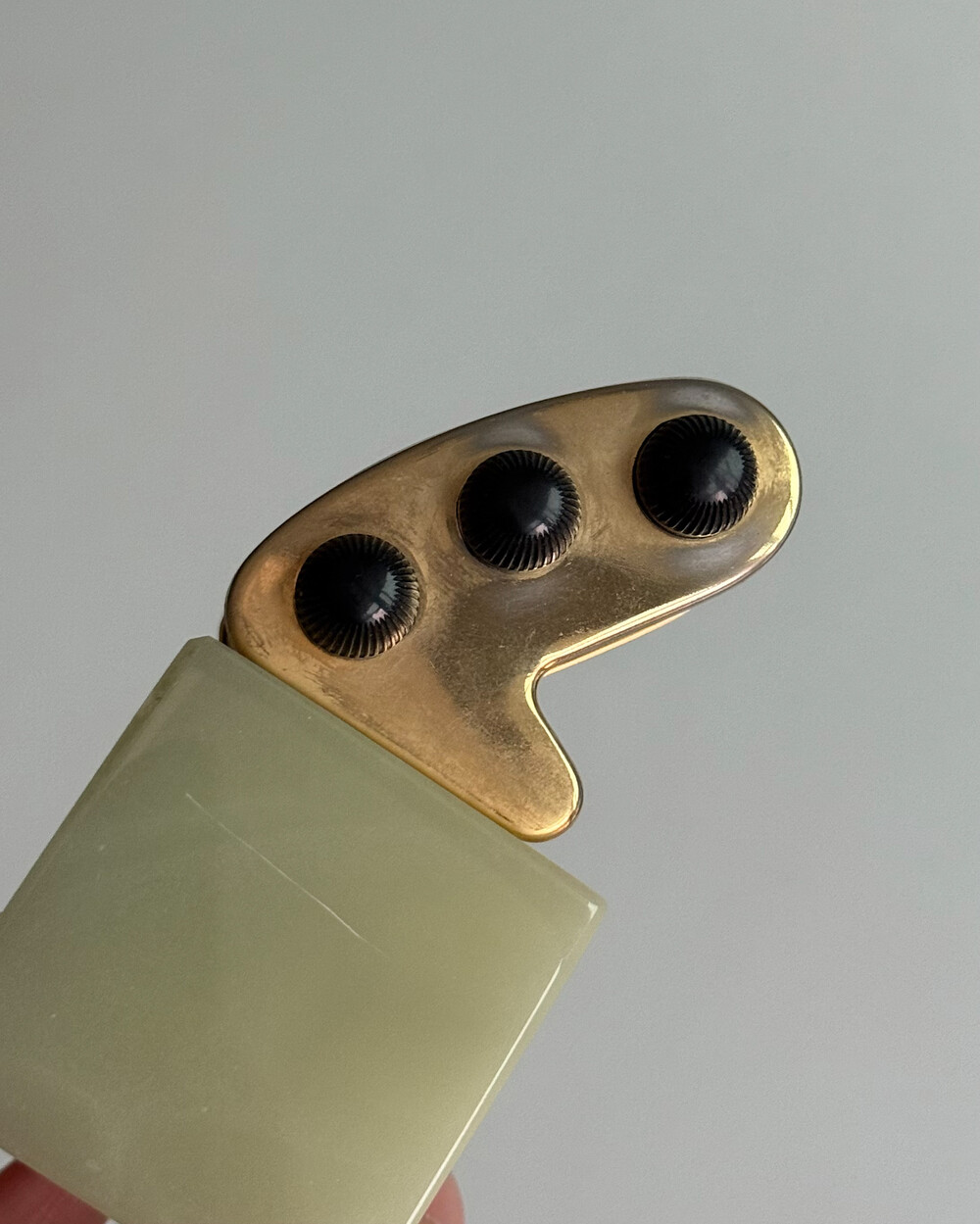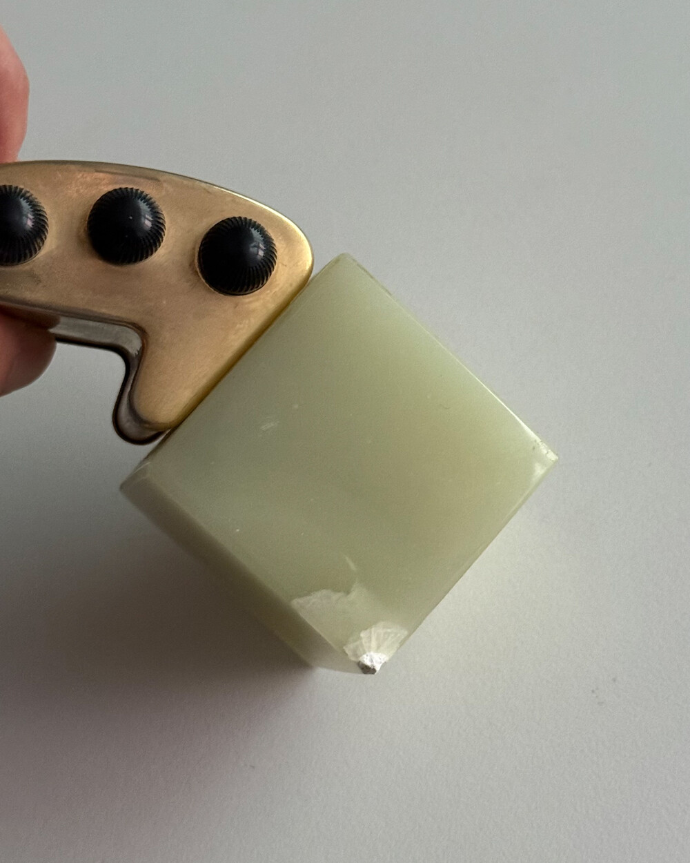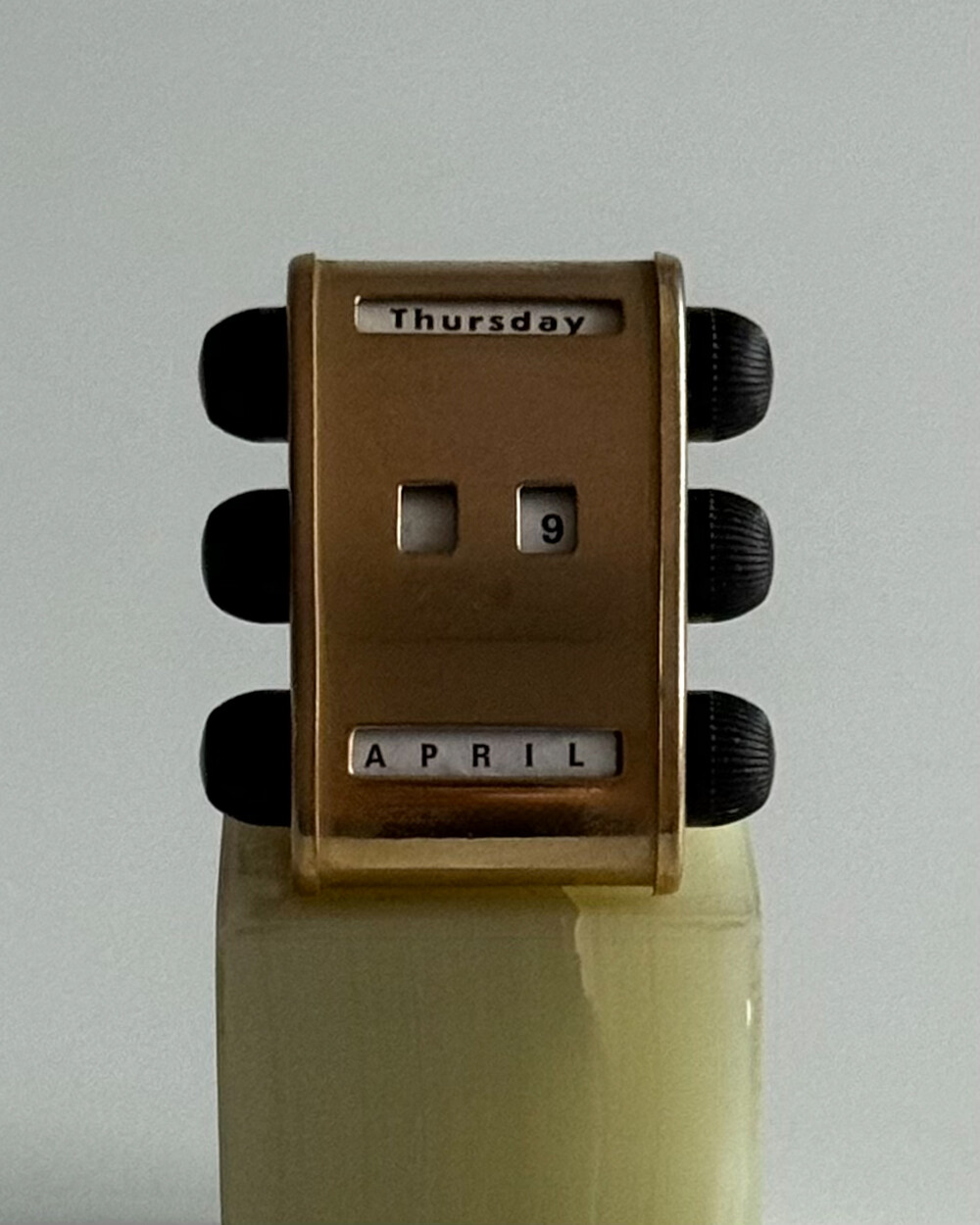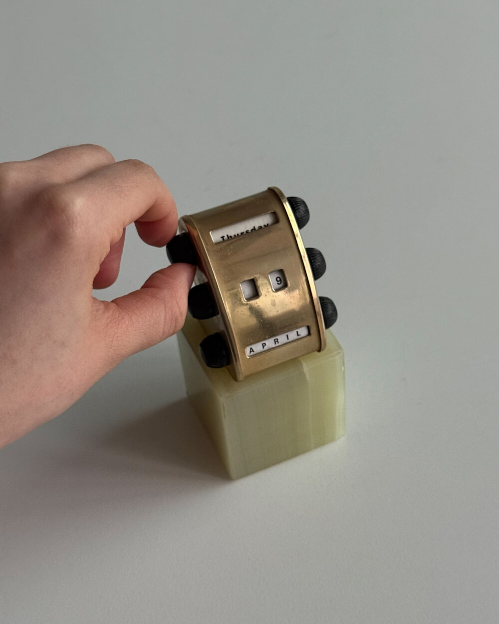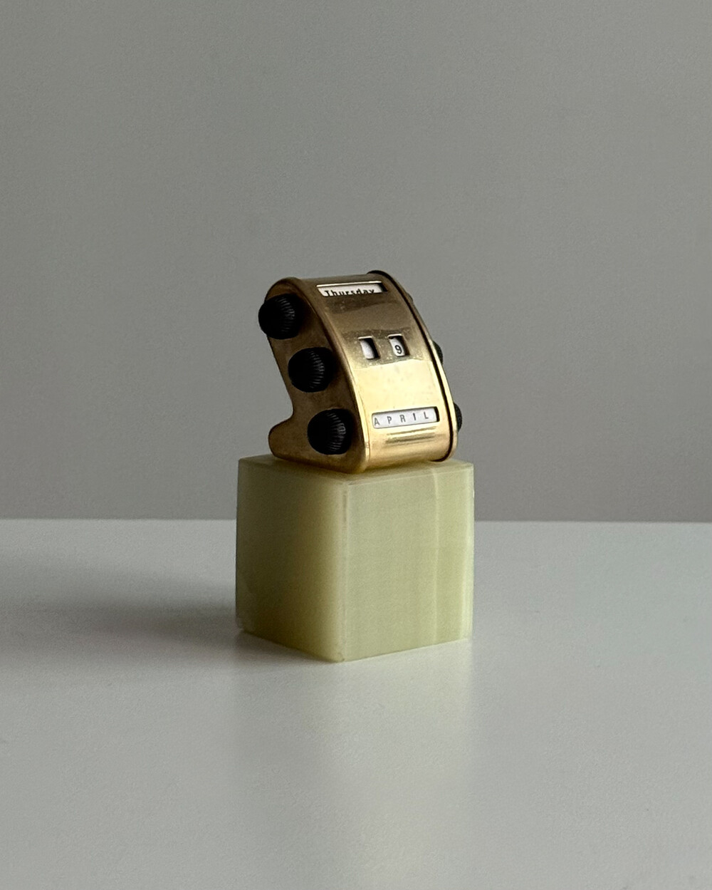 1970년대 영국에서 제작된 퍼페추얼 캘린더입니다. 묵직하고 은은한 광택을 지닌 천연 오닉스 원석 베이스와 상단 금속 달력 본체가 결합되어 있는 고급스러운 디자인입니다.