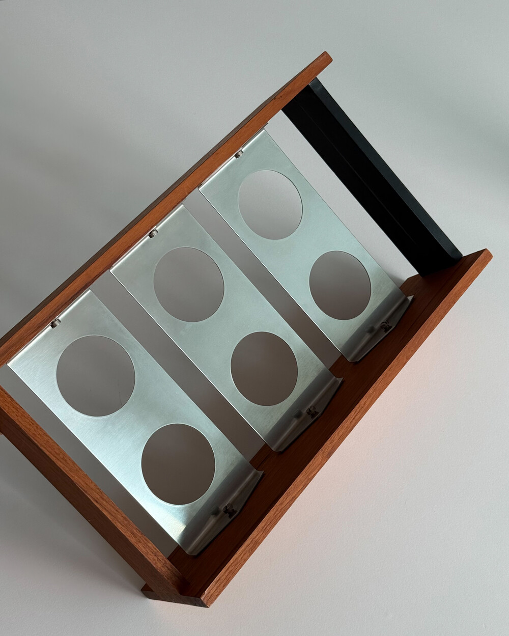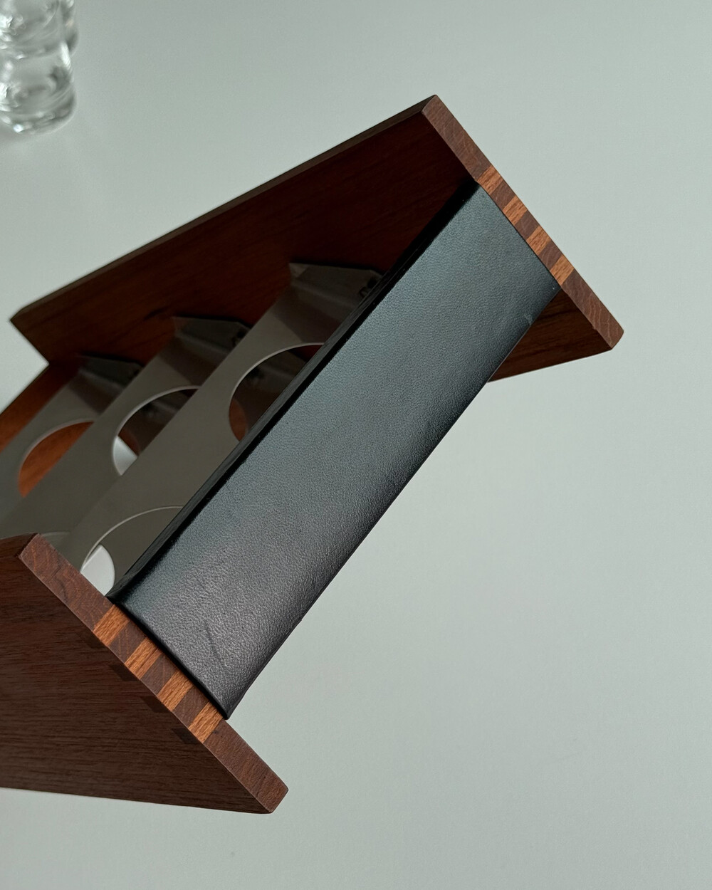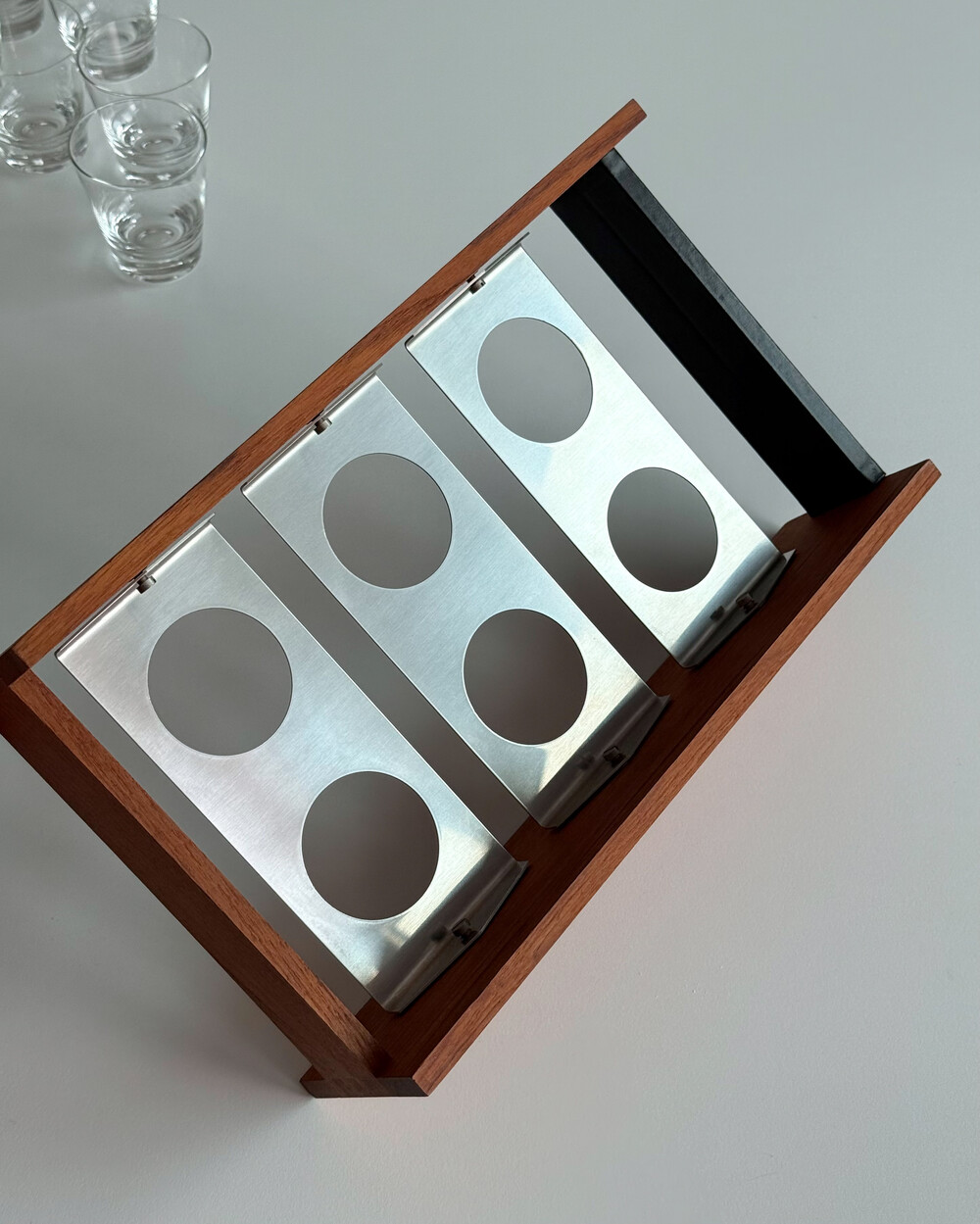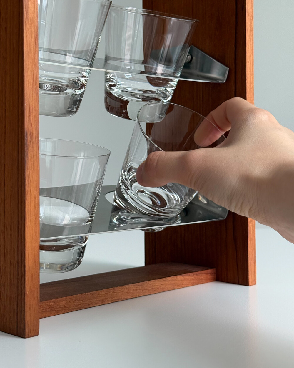 1960년대 독일GRASOLI 사의 글라스 홀더 세트입니다. 고급 티크 원목 프레임, 스테인리스 18/8 홀더, 그리고 6개의 글라스 잔으로 구성되어 있습니다. 중앙 구조는 스윙형 구조로 이루어져, 수평과 수직 두 가지 방식으로 유연하게 연출할 수 있습니다. 기울이면 중력에 따라 부드럽고 자연스럽게 각도가 이동합니다.