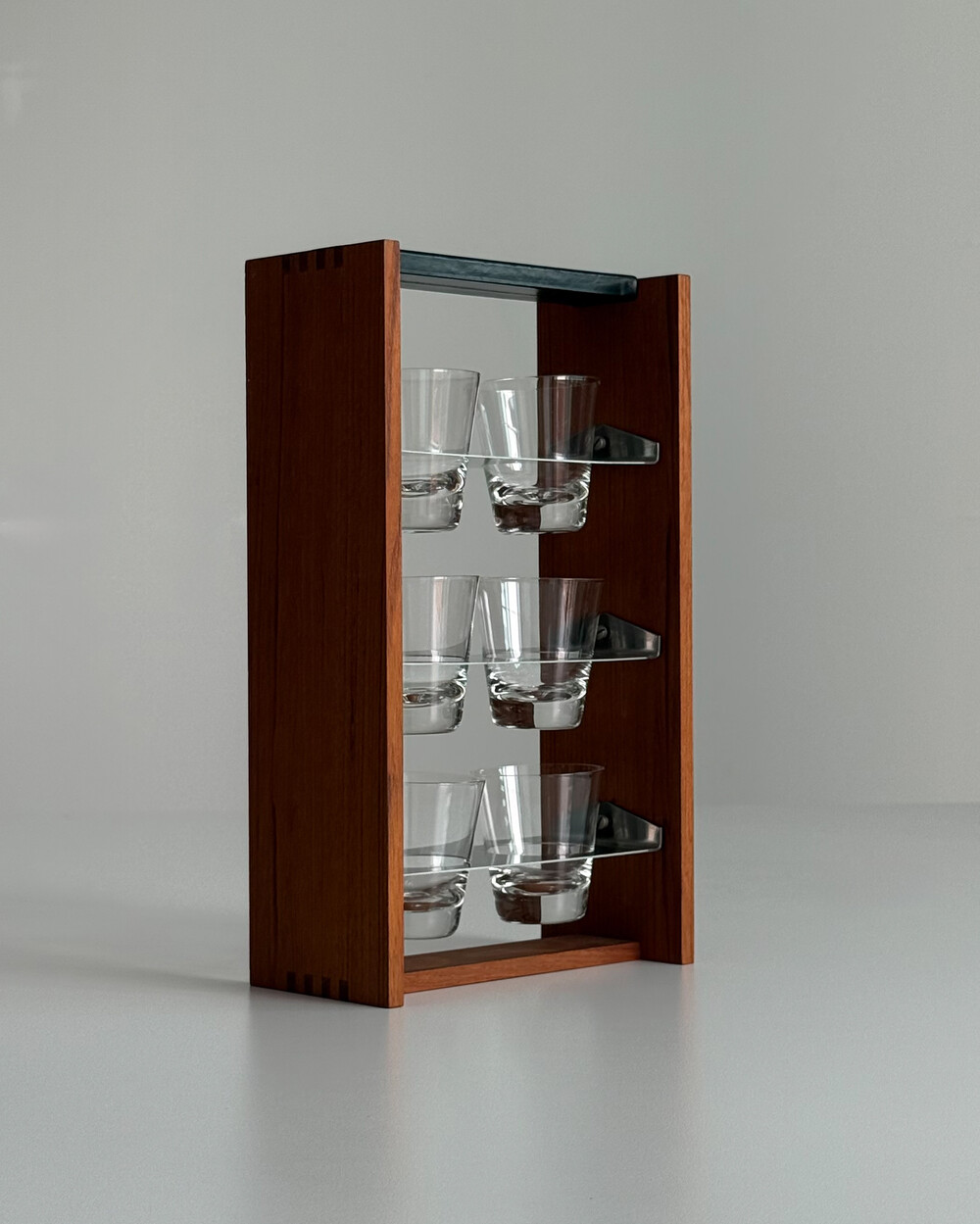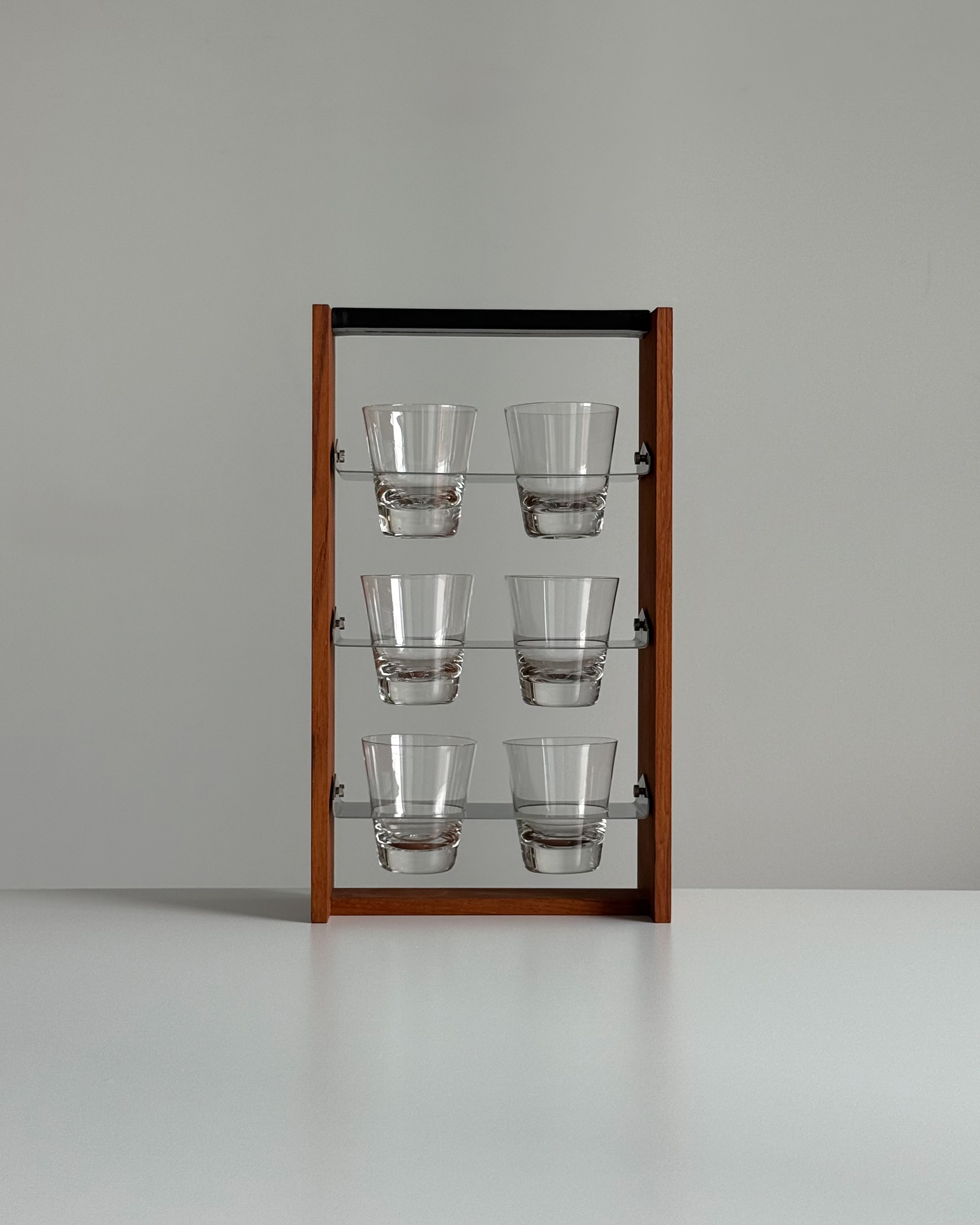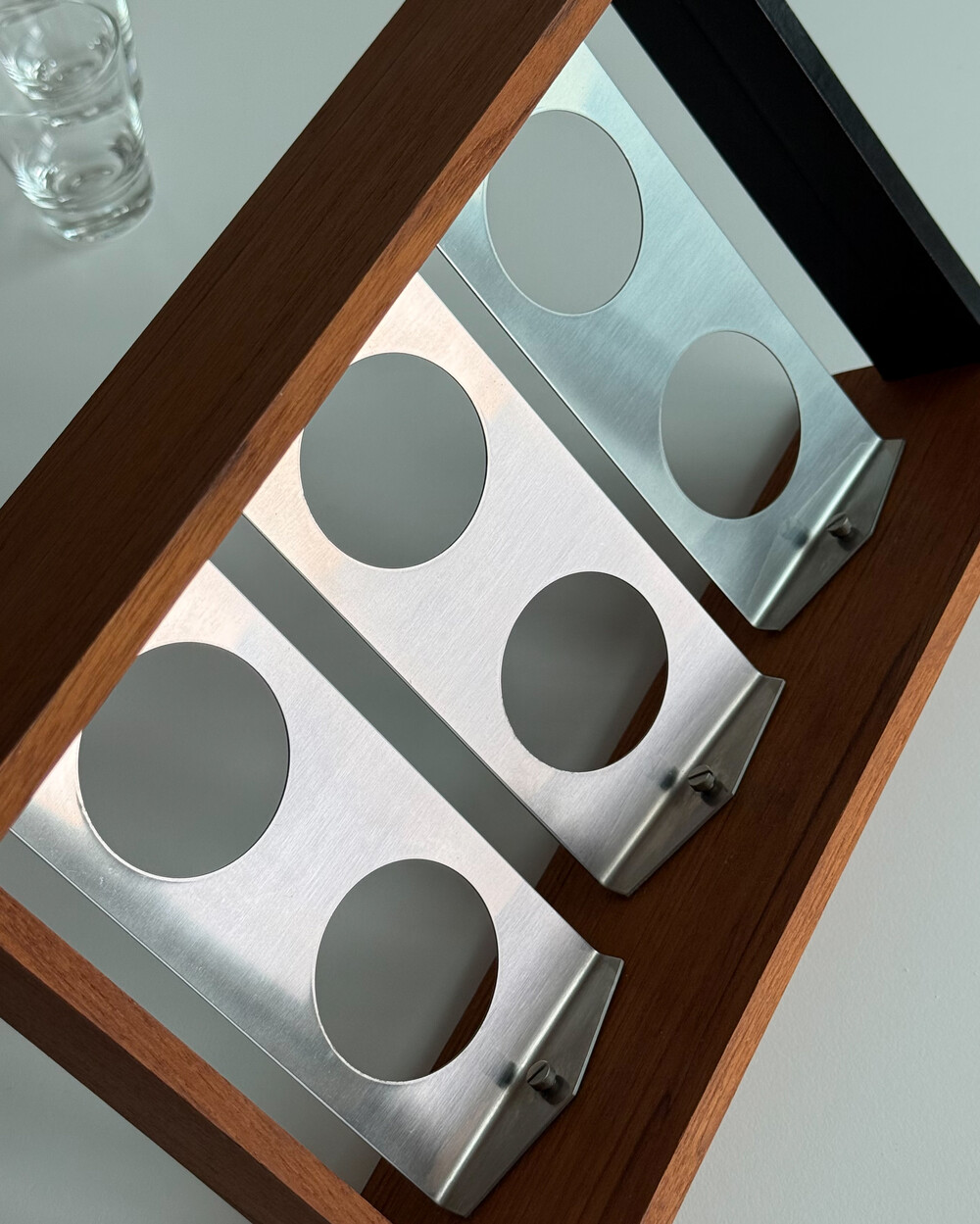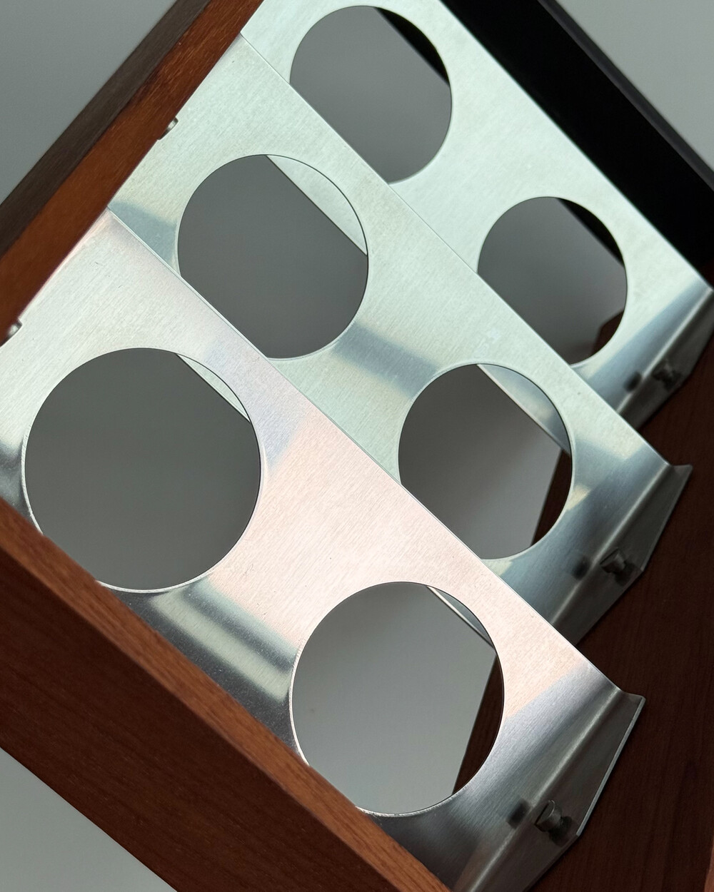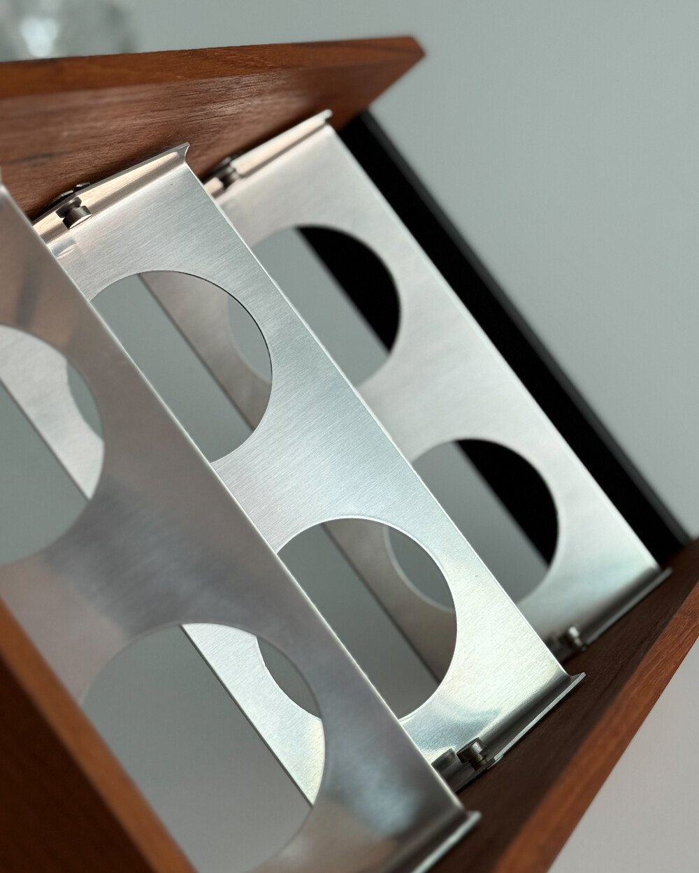1960년대 독일GRASOLI 사의 글라스 홀더 세트입니다. 고급 티크 원목 프레임, 스테인리스 18/8 홀더, 그리고 6개의 글라스 잔으로 구성되어 있습니다. 중앙 구조는 스윙형 구조로 이루어져, 수평과 수직 두 가지 방식으로 유연하게 연출할 수 있습니다. 기울이면 중력에 따라 부드럽고 자연스럽게 각도가 이동합니다.