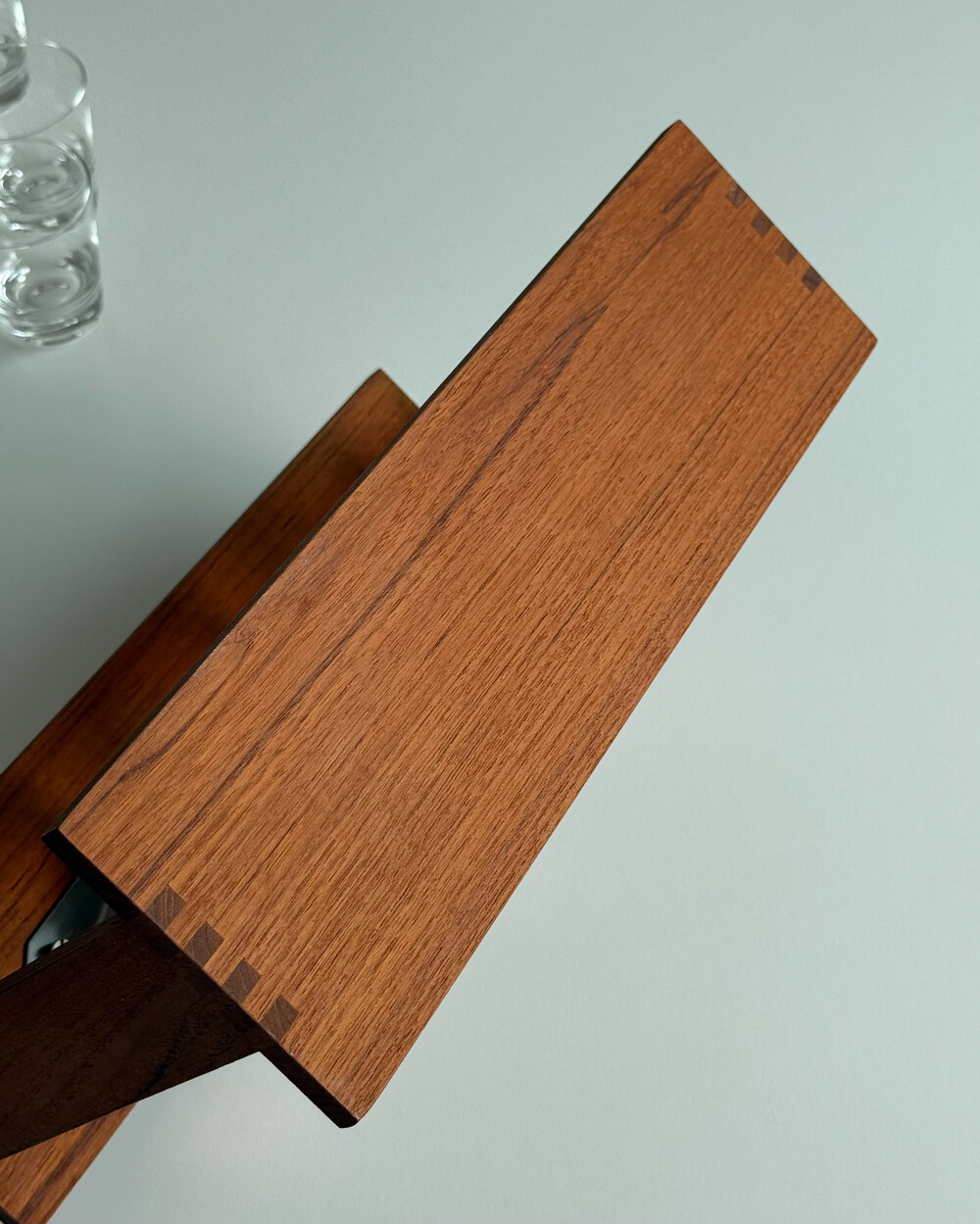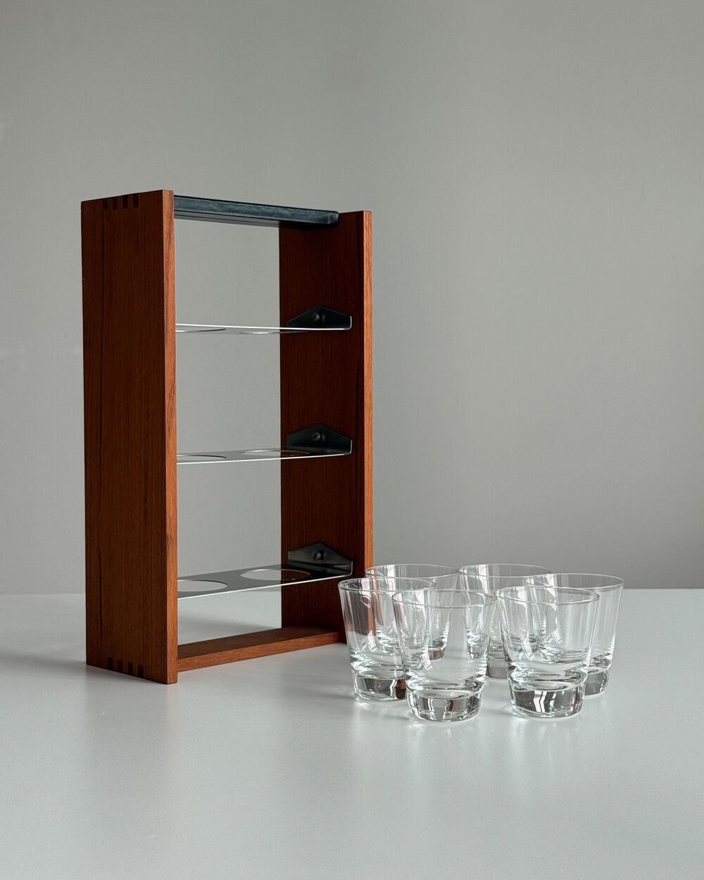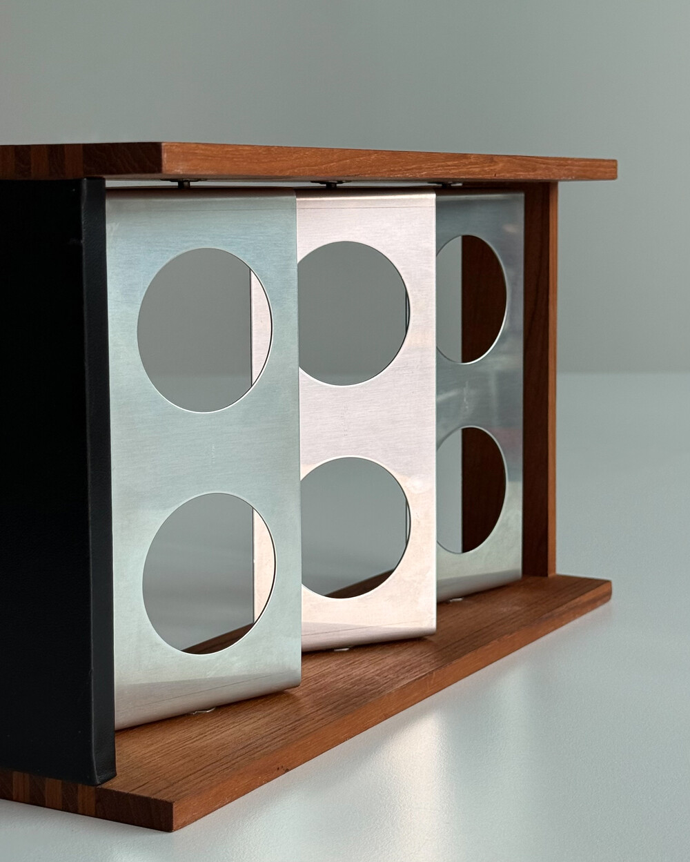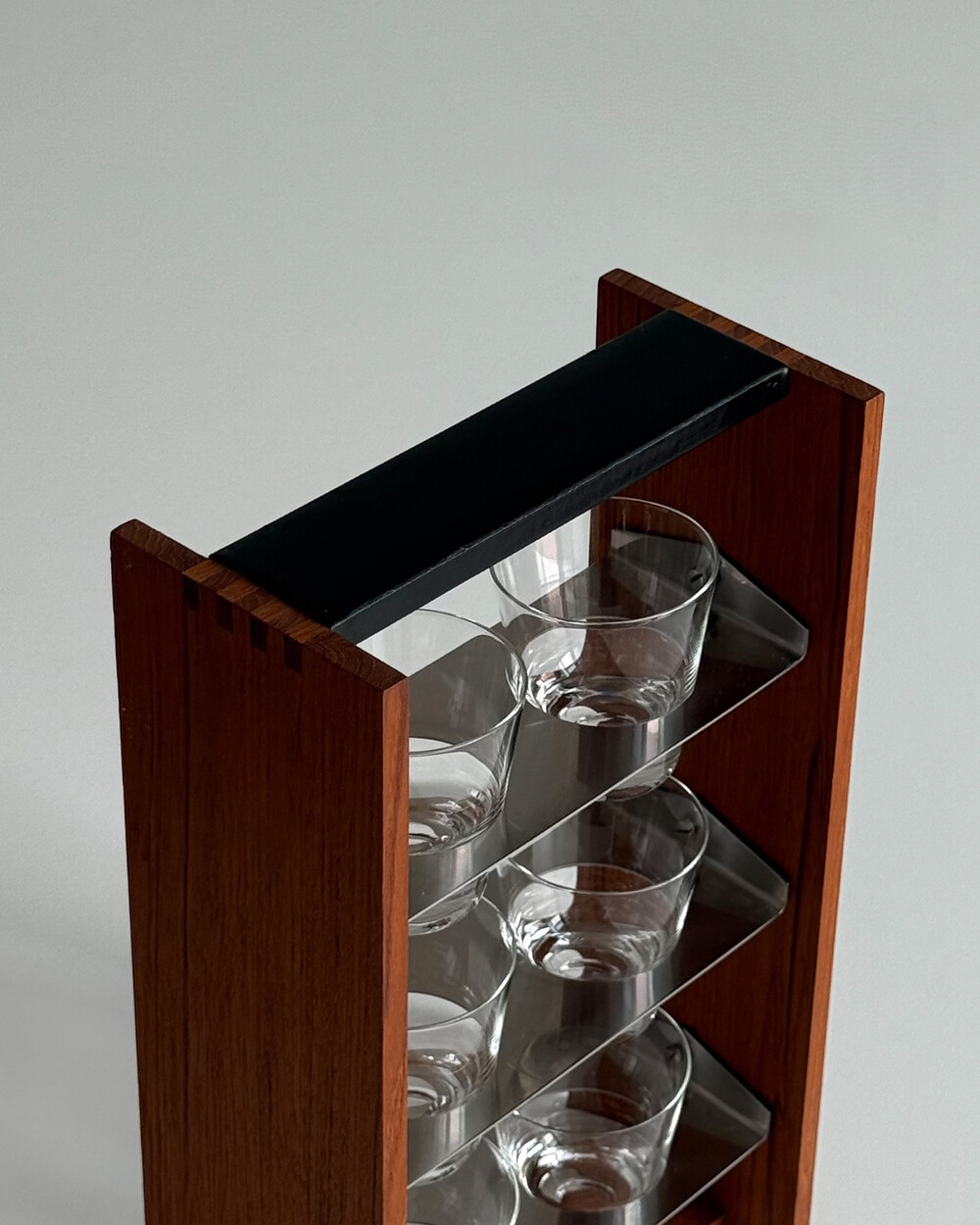 1960년대 독일GRASOLI 사의 글라스 홀더 세트입니다. 고급 티크 원목 프레임, 스테인리스 18/8 홀더, 그리고 6개의 글라스 잔으로 구성되어 있습니다. 중앙 구조는 스윙형 구조로 이루어져, 수평과 수직 두 가지 방식으로 유연하게 연출할 수 있습니다. 기울이면 중력에 따라 부드럽고 자연스럽게 각도가 이동합니다.