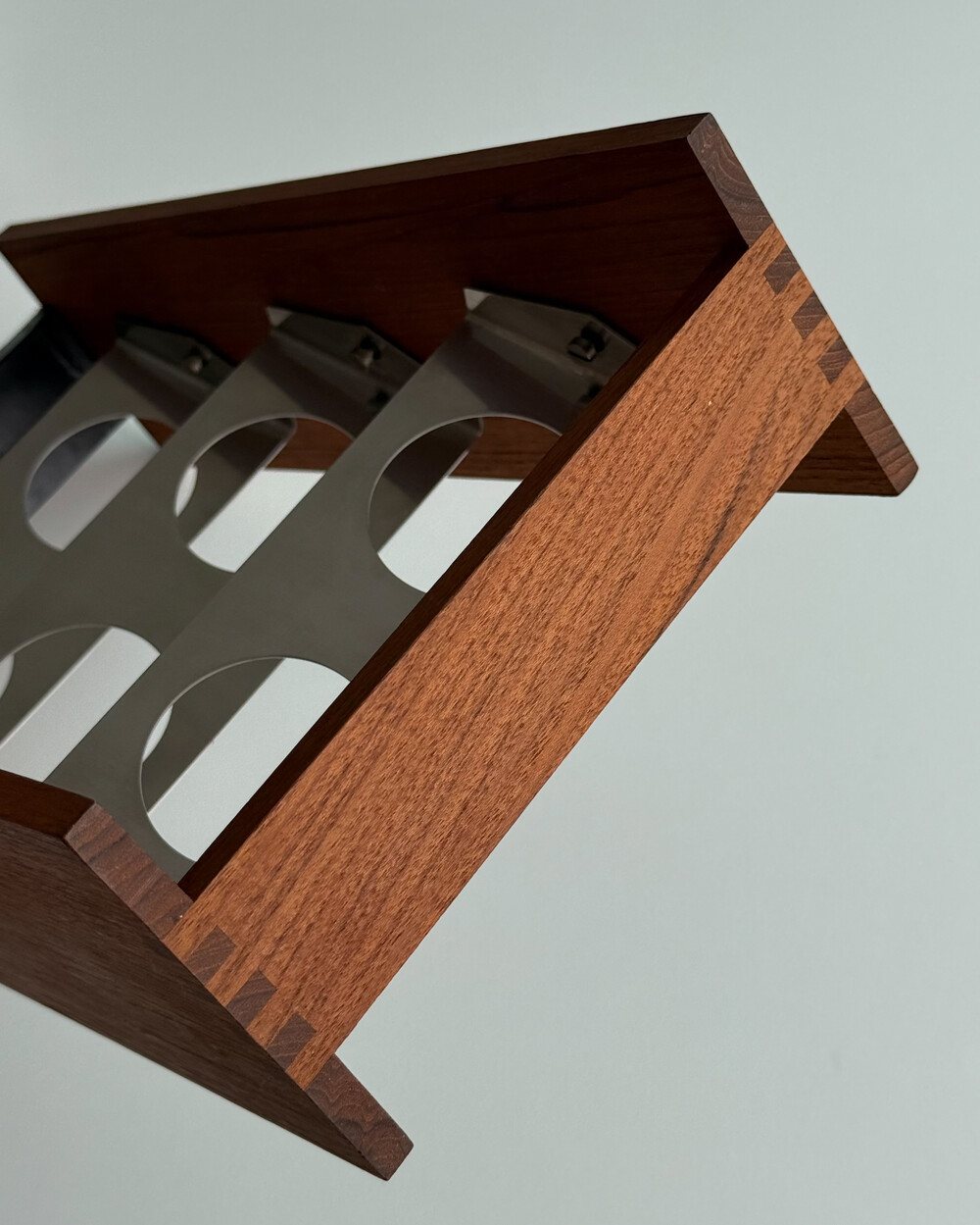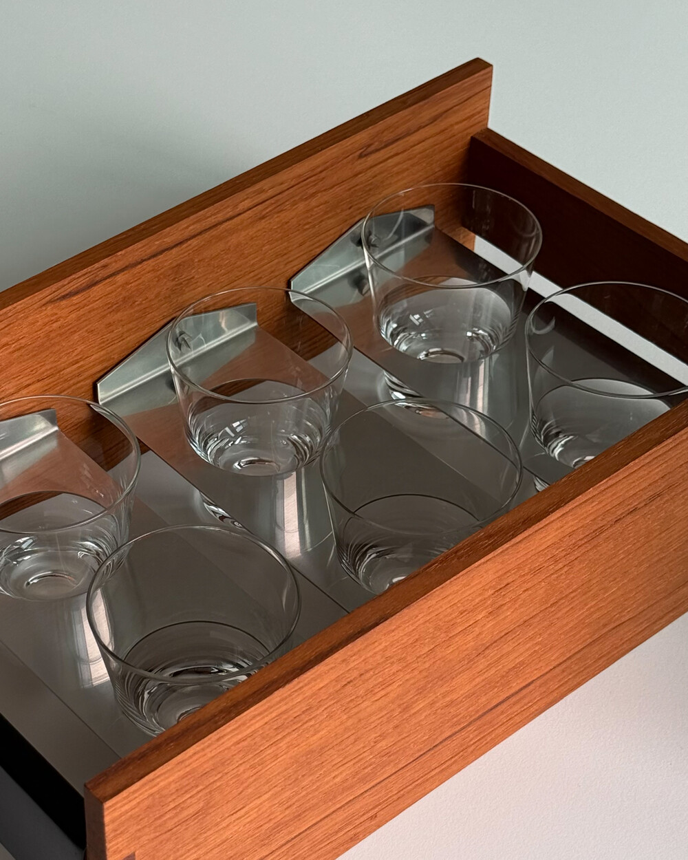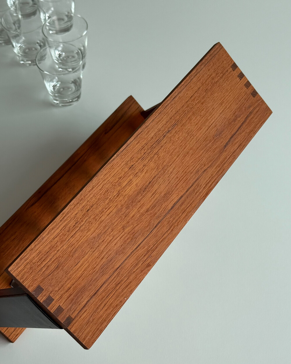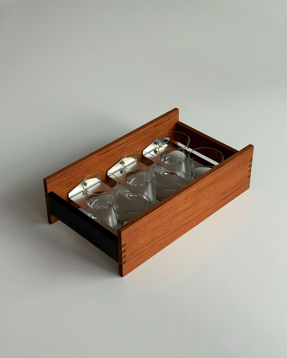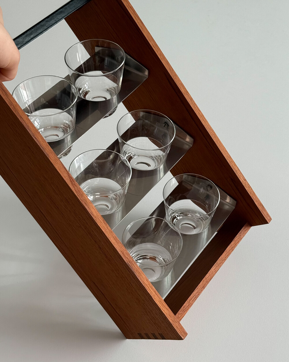 1960년대 독일GRASOLI 사의 글라스 홀더 세트입니다. 고급 티크 원목 프레임, 스테인리스 18/8 홀더, 그리고 6개의 글라스 잔으로 구성되어 있습니다. 중앙 구조는 스윙형 구조로 이루어져, 수평과 수직 두 가지 방식으로 유연하게 연출할 수 있습니다. 기울이면 중력에 따라 부드럽고 자연스럽게 각도가 이동합니다.