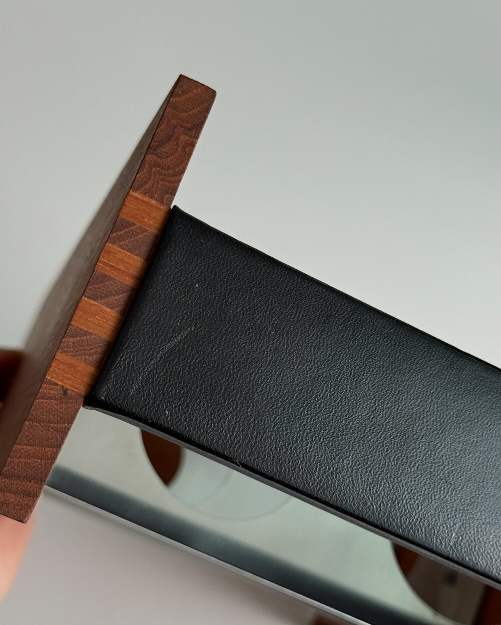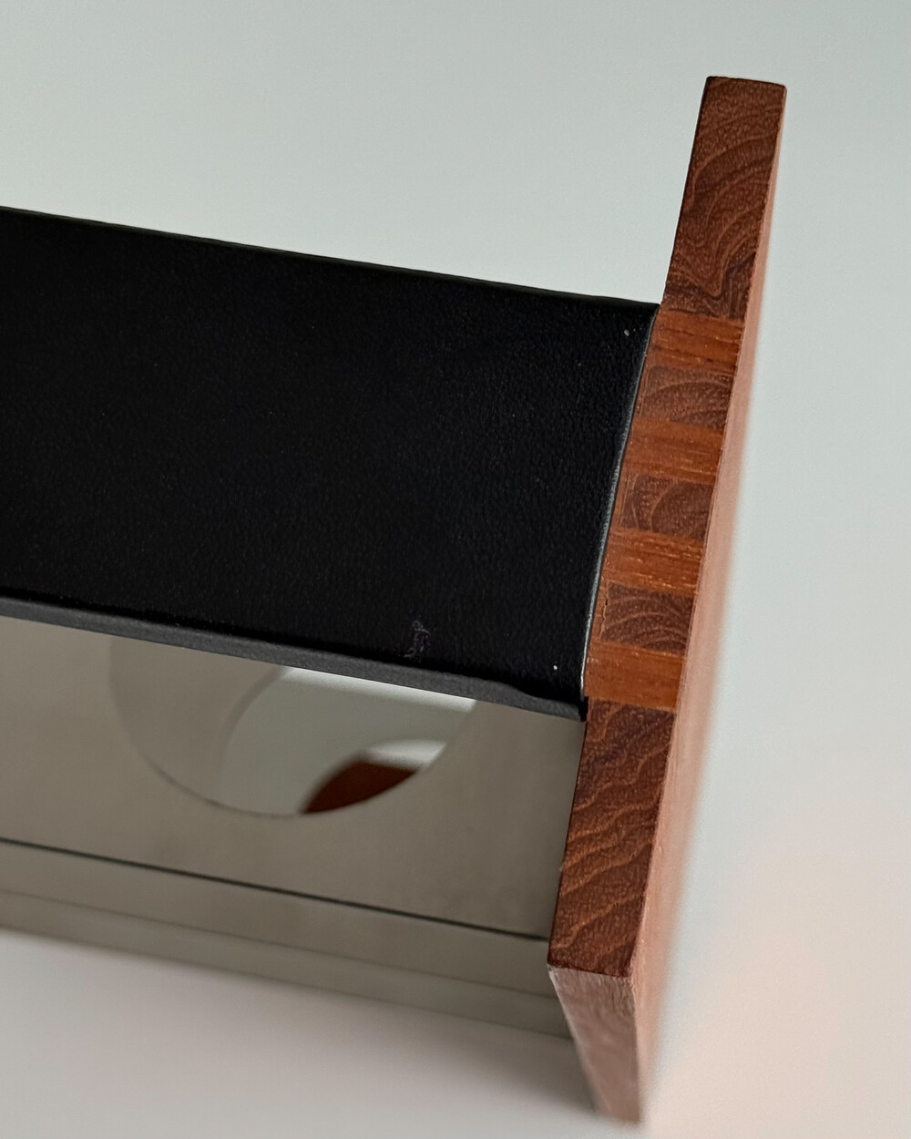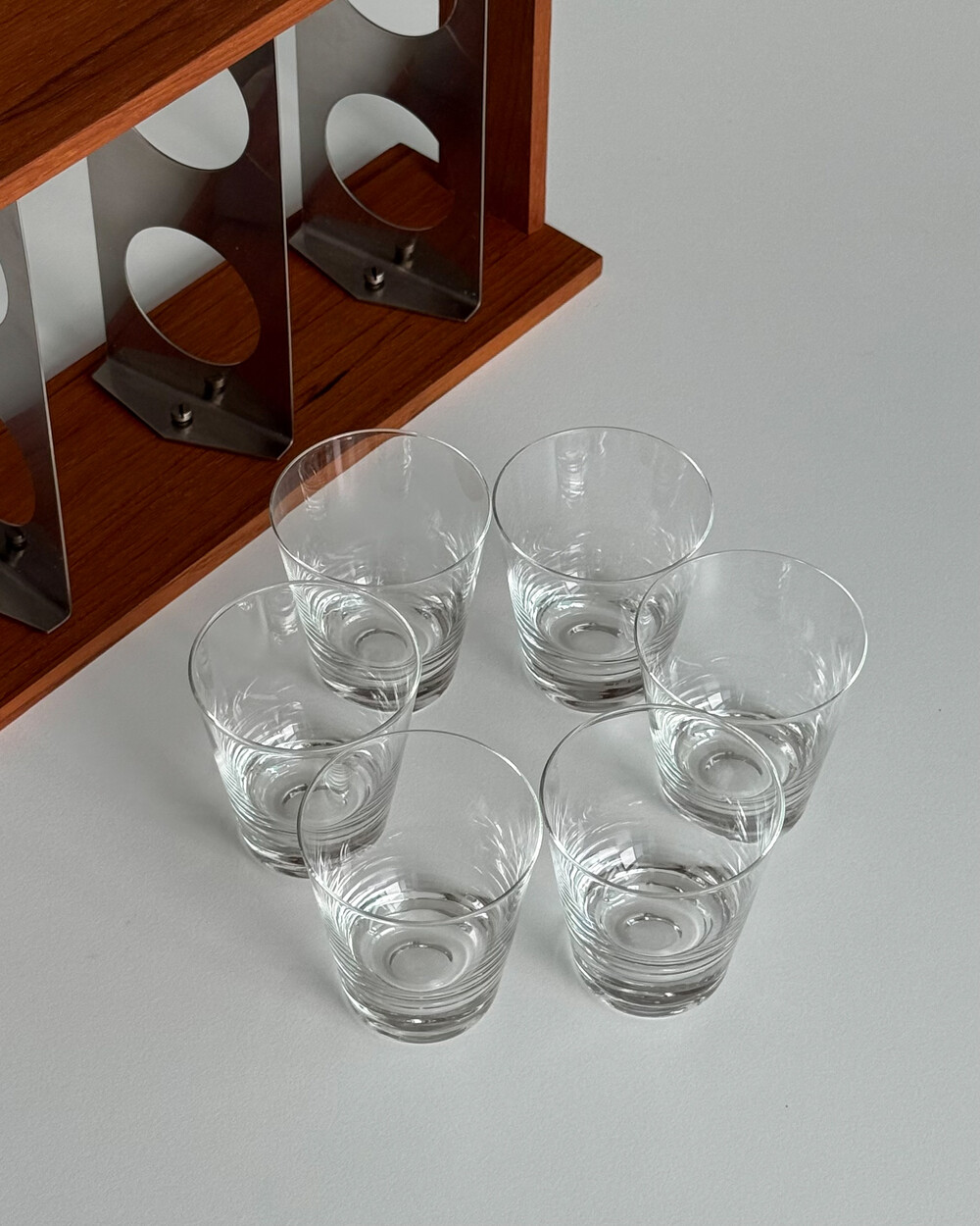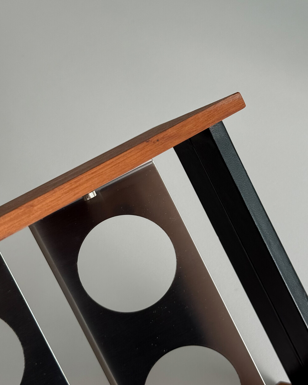 1960년대 독일GRASOLI 사의 글라스 홀더 세트입니다. 고급 티크 원목 프레임, 스테인리스 18/8 홀더, 그리고 6개의 글라스 잔으로 구성되어 있습니다. 중앙 구조는 스윙형 구조로 이루어져, 수평과 수직 두 가지 방식으로 유연하게 연출할 수 있습니다. 기울이면 중력에 따라 부드럽고 자연스럽게 각도가 이동합니다.