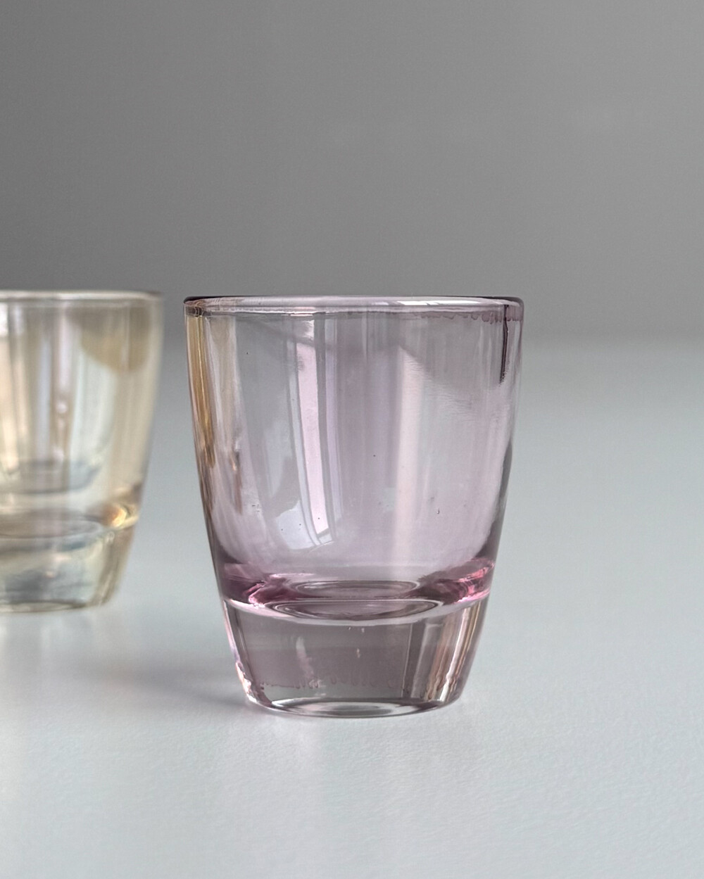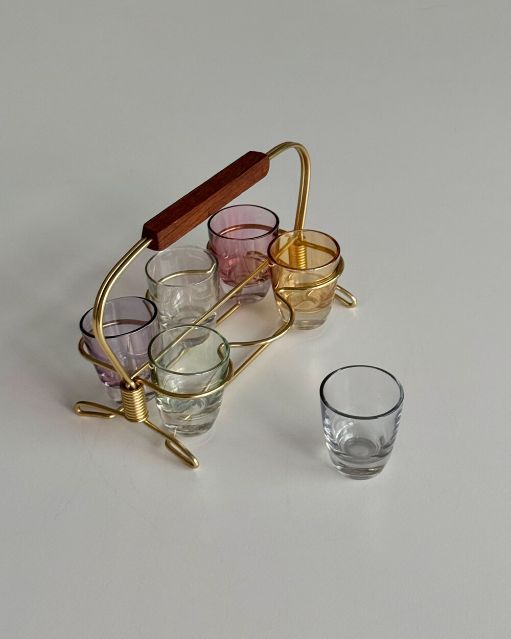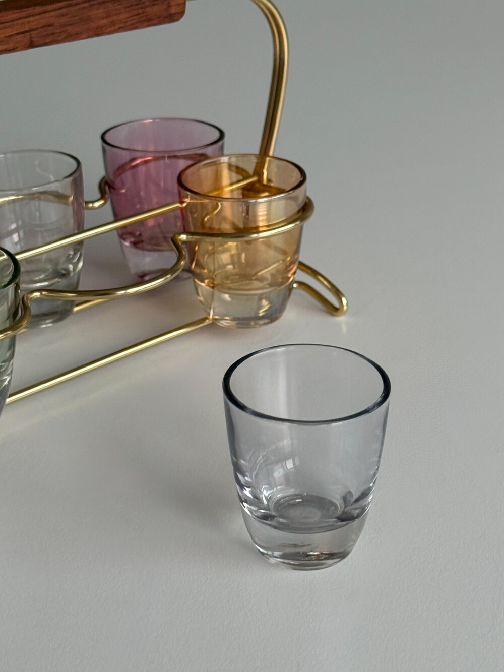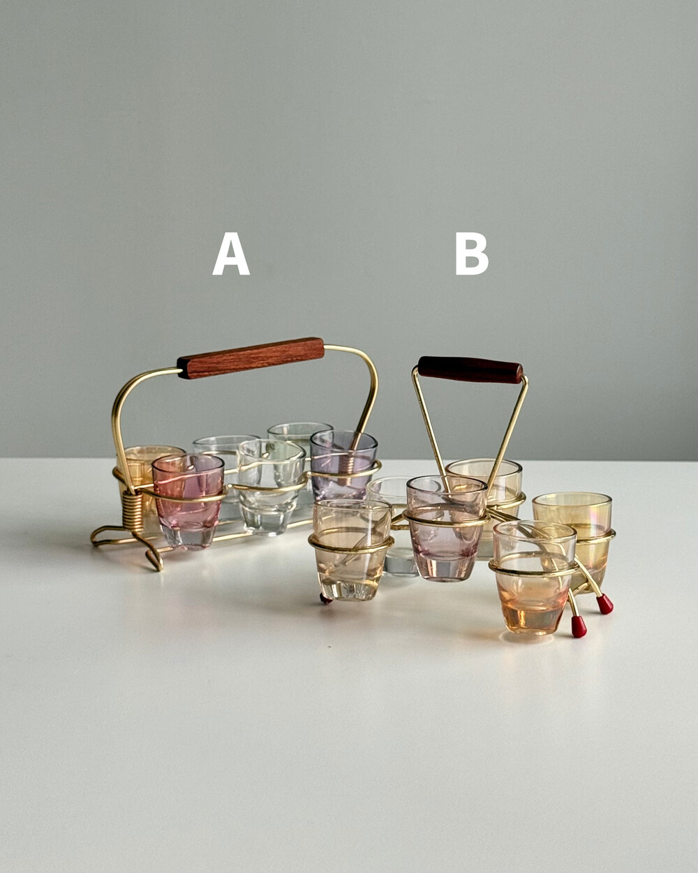 1960년대 동독에서 제작된 빈티지 쁘띠 글라스 잔 세트입니다. 당시 독일에서 손님 접대용으로 식전주 또는 디저트 리큐어를 소량씩 즐기기 위한 슈냅스(Schnaps) 잔으로 사용되었습니다. 앙증맞은 사이즈(약 30ml)로 소주잔이나 리큐르잔으로 사용은 물론, 작은 디저트나 앙트레를 담아 서빙하는 용도로 활용하기에도 좋습니다. 컬러감 있는 유리잔 하나하나가 독특한 존재감을 지니고 있어 테이블 위에 놓기만 해도 특별한 분위기를 더해주는 매력적인 오브제가 되어줍니다. 2가지 타입의 디자인으로 입고되었습니다.