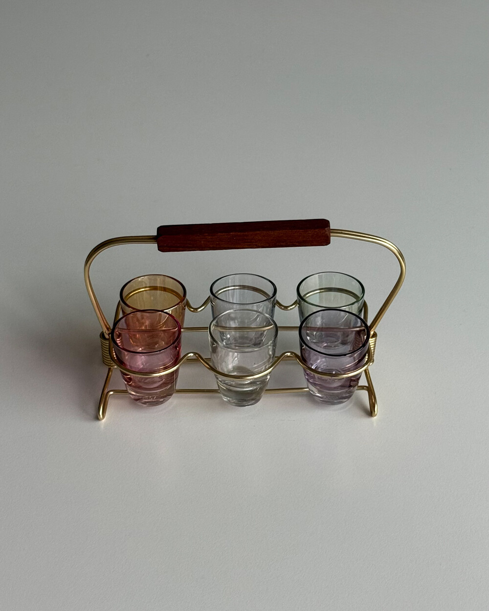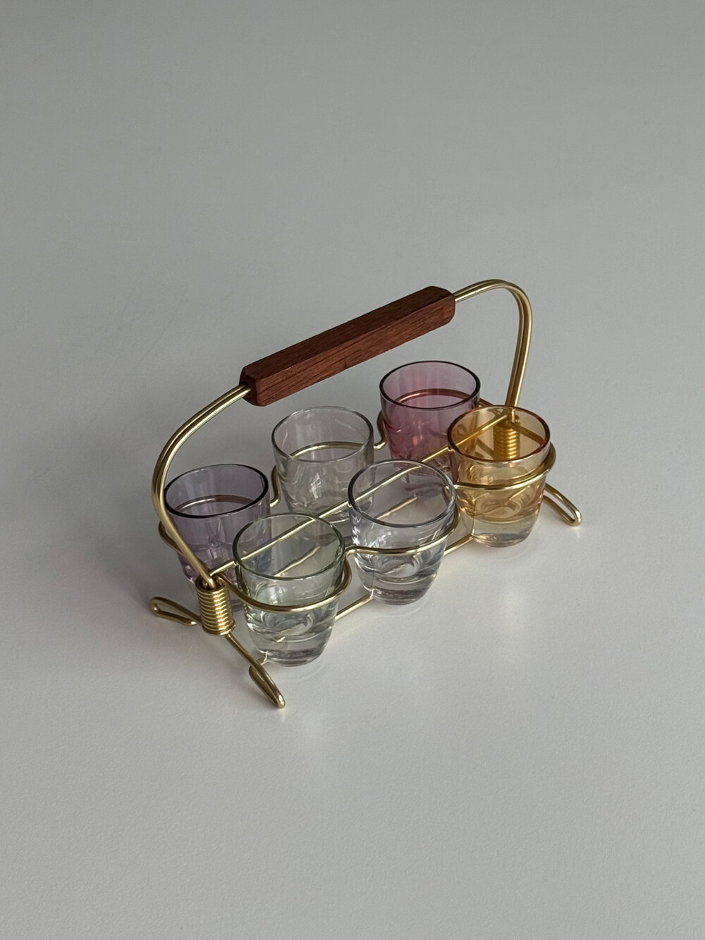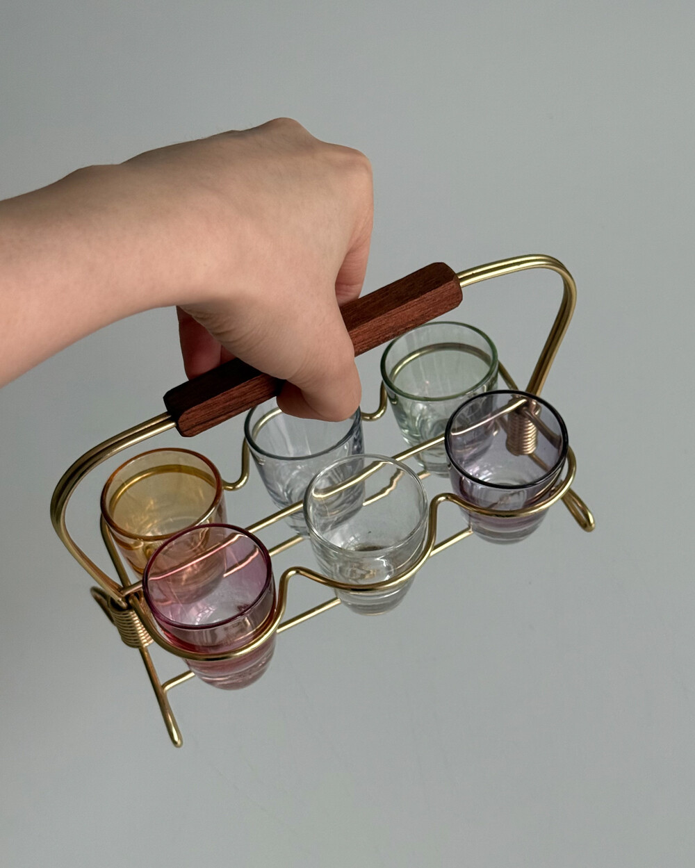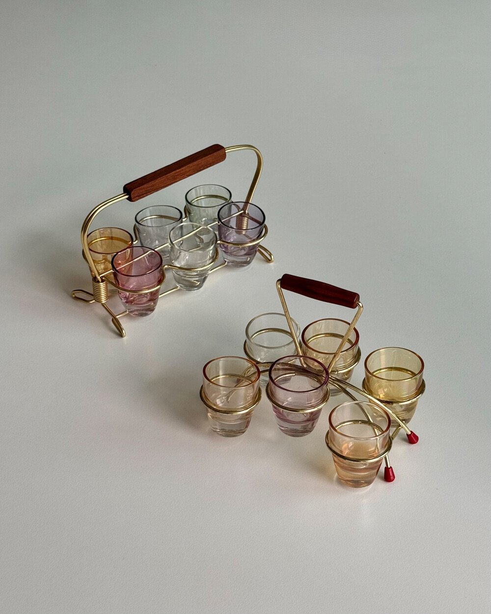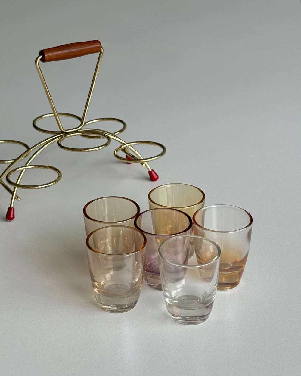 1960년대 동독에서 제작된 빈티지 쁘띠 글라스 잔 세트입니다. 당시 독일에서 손님 접대용으로 식전주 또는 디저트 리큐어를 소량씩 즐기기 위한 슈냅스(Schnaps) 잔으로 사용되었습니다. 앙증맞은 사이즈(약 30ml)로 소주잔이나 리큐르잔으로 사용은 물론, 작은 디저트나 앙트레를 담아 서빙하는 용도로 활용하기에도 좋습니다. 컬러감 있는 유리잔 하나하나가 독특한 존재감을 지니고 있어 테이블 위에 놓기만 해도 특별한 분위기를 더해주는 매력적인 오브제가 되어줍니다. 2가지 타입의 디자인으로 입고되었습니다.