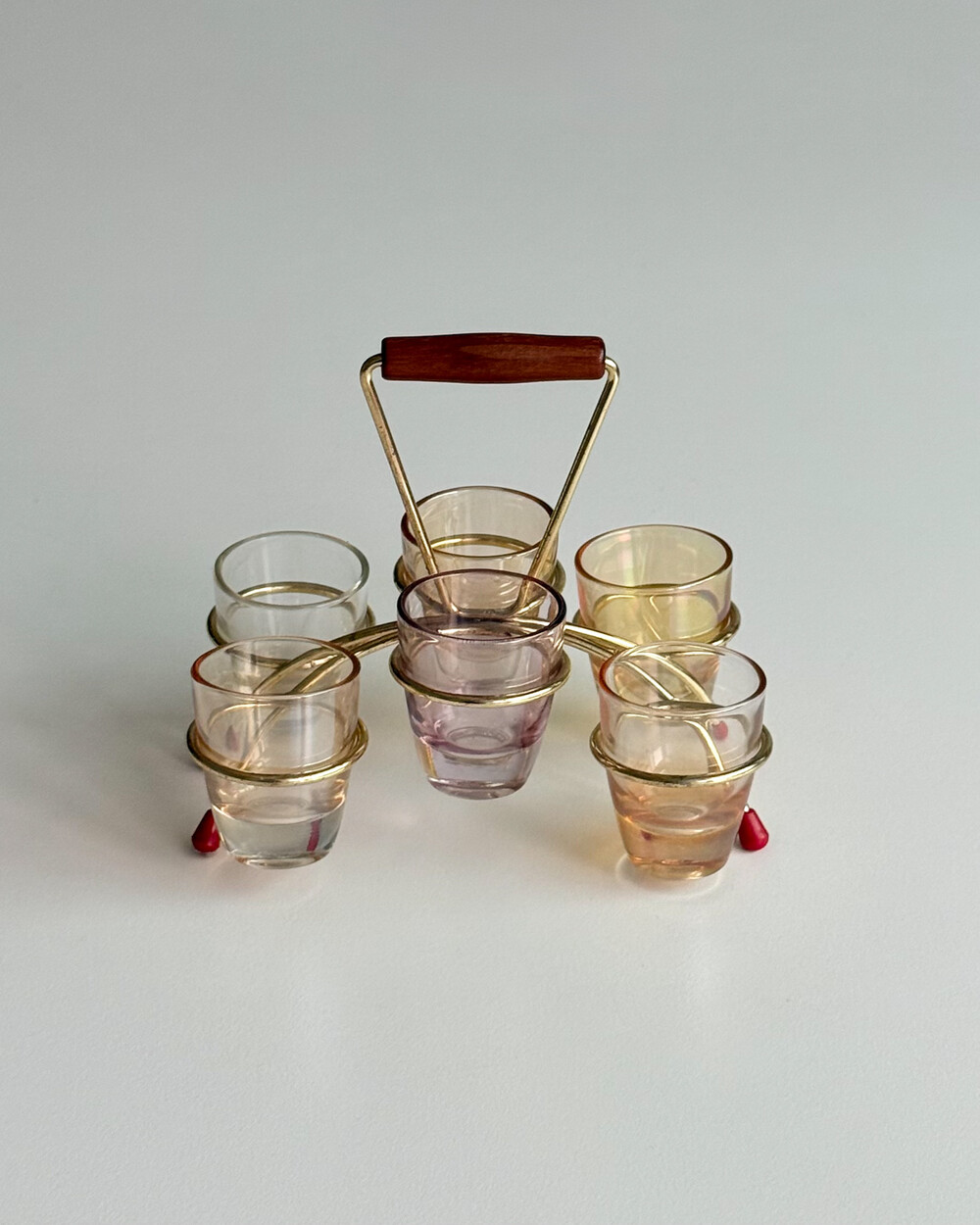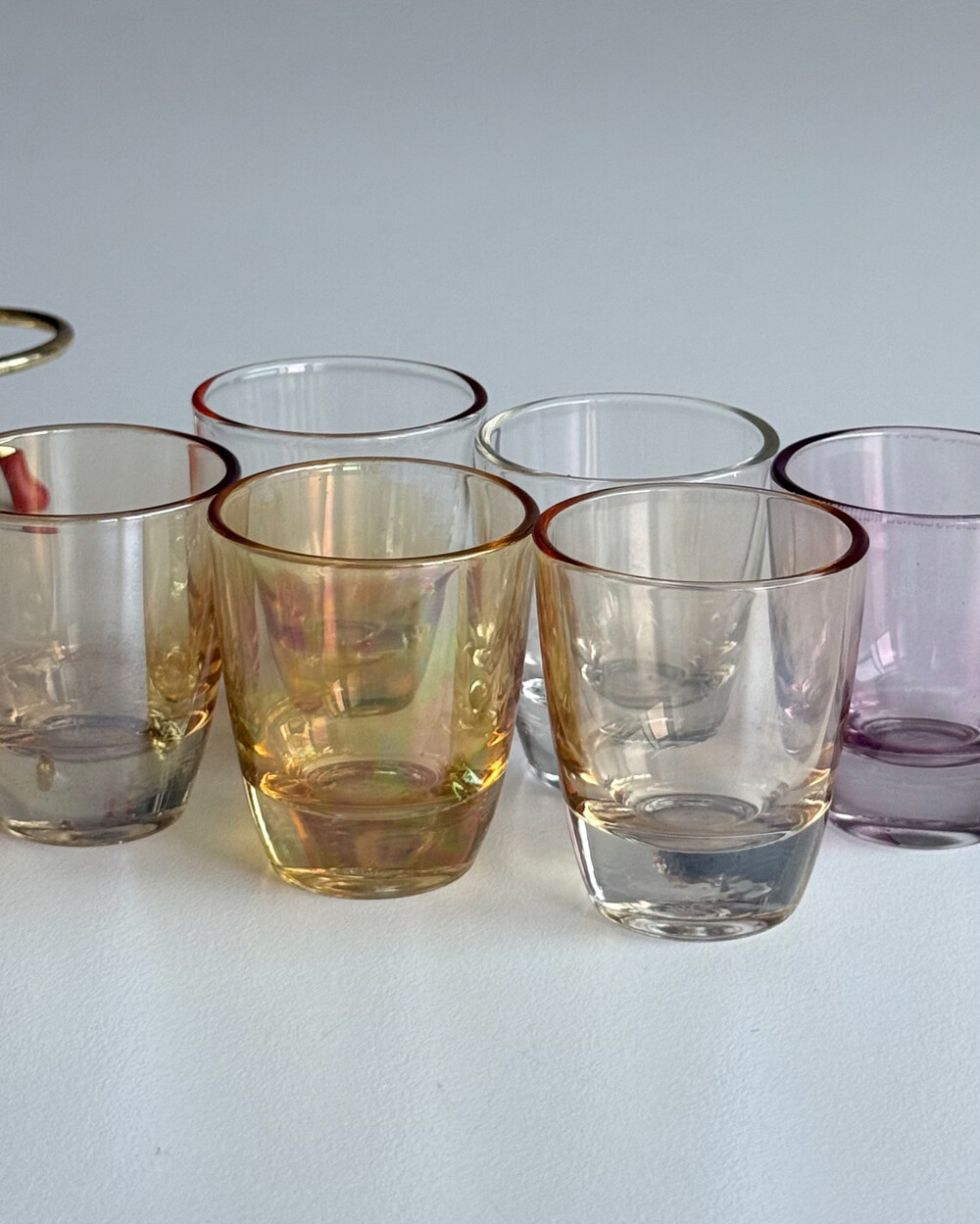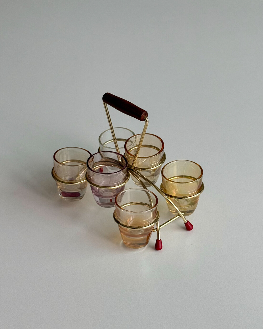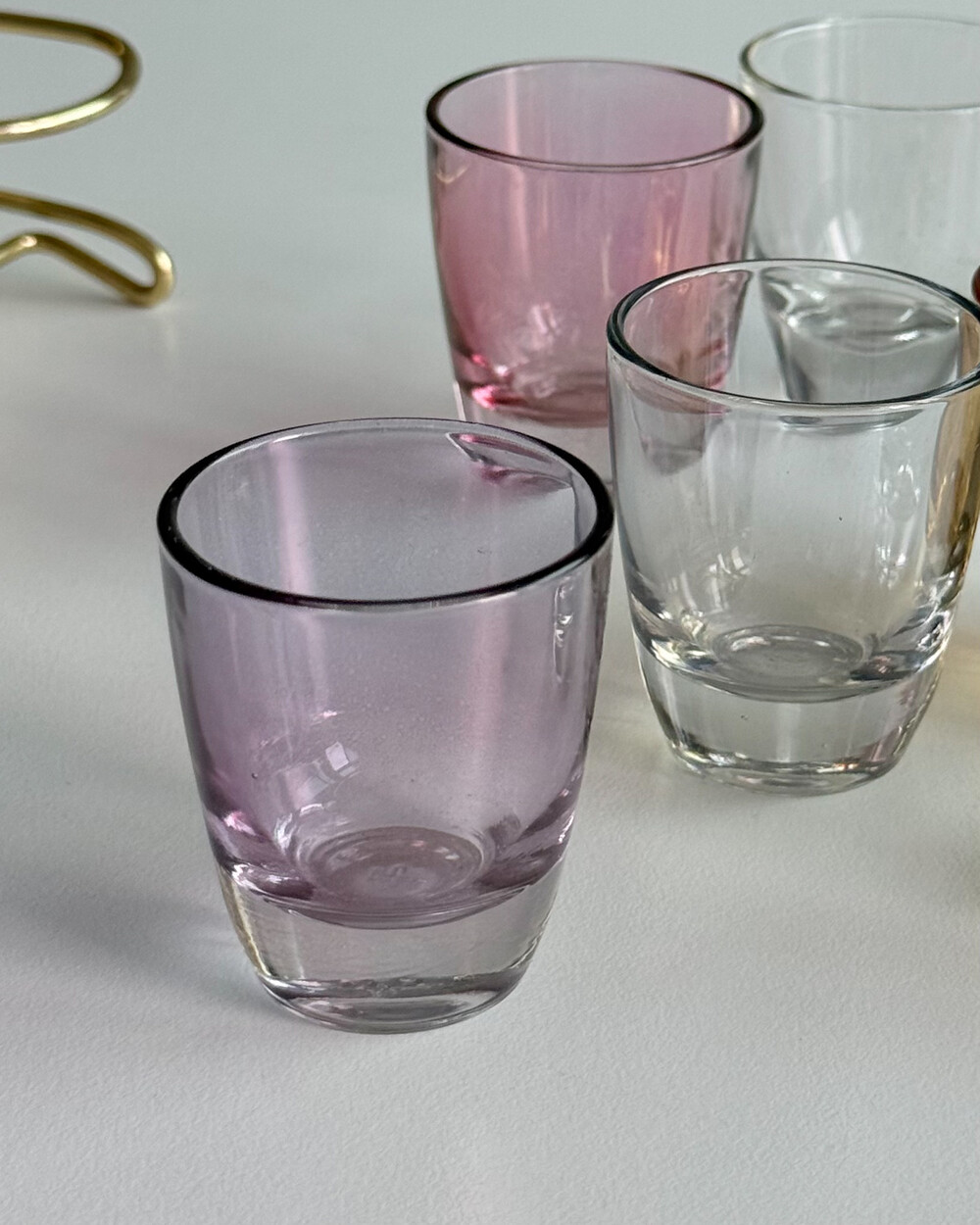 1960년대 동독에서 제작된 빈티지 쁘띠 글라스 잔 세트입니다. 당시 독일에서 손님 접대용으로 식전주 또는 디저트 리큐어를 소량씩 즐기기 위한 슈냅스(Schnaps) 잔으로 사용되었습니다. 앙증맞은 사이즈(약 30ml)로 소주잔이나 리큐르잔으로 사용은 물론, 작은 디저트나 앙트레를 담아 서빙하는 용도로 활용하기에도 좋습니다. 컬러감 있는 유리잔 하나하나가 독특한 존재감을 지니고 있어 테이블 위에 놓기만 해도 특별한 분위기를 더해주는 매력적인 오브제가 되어줍니다. 2가지 타입의 디자인으로 입고되었습니다.