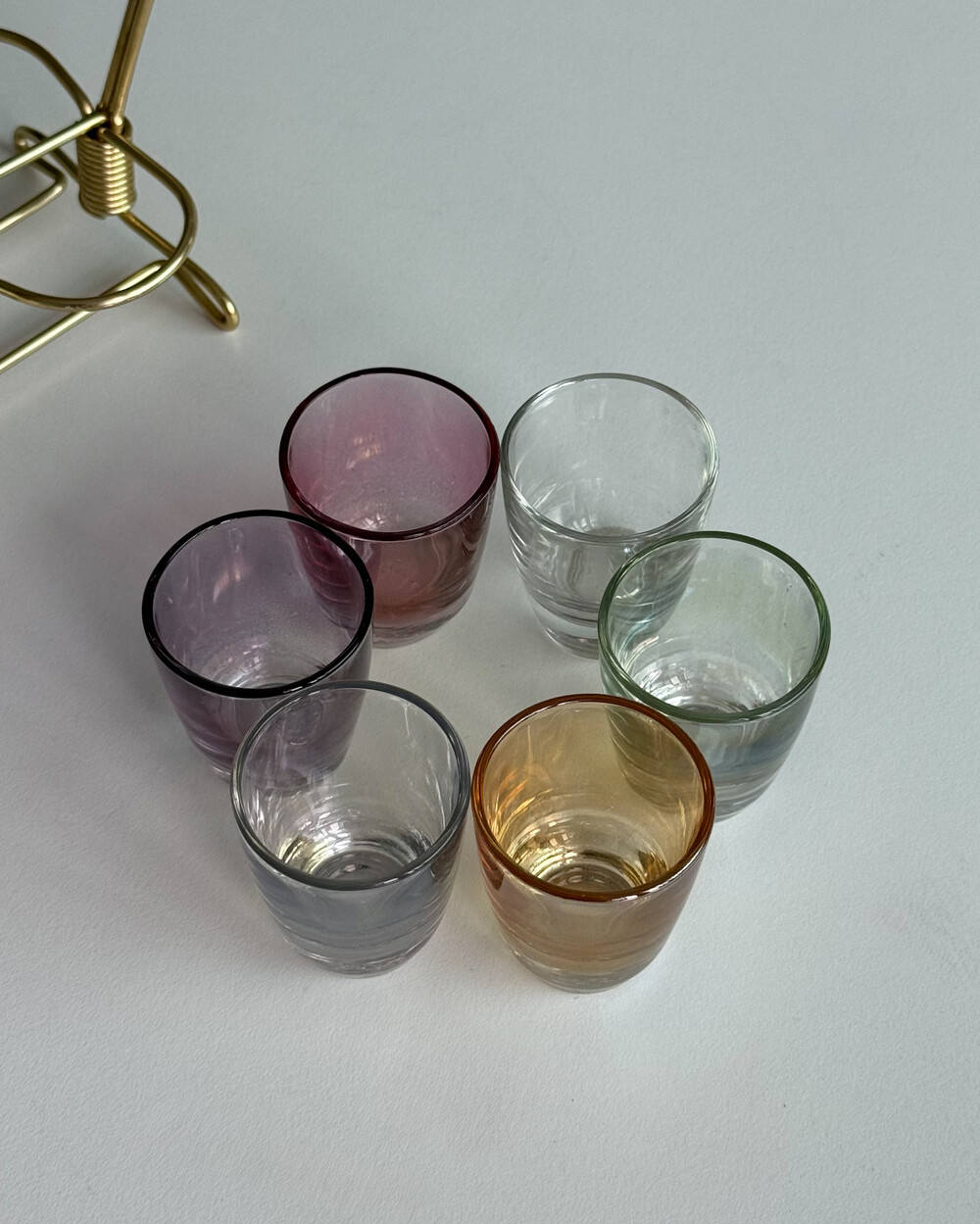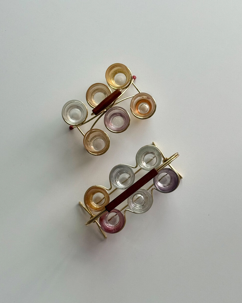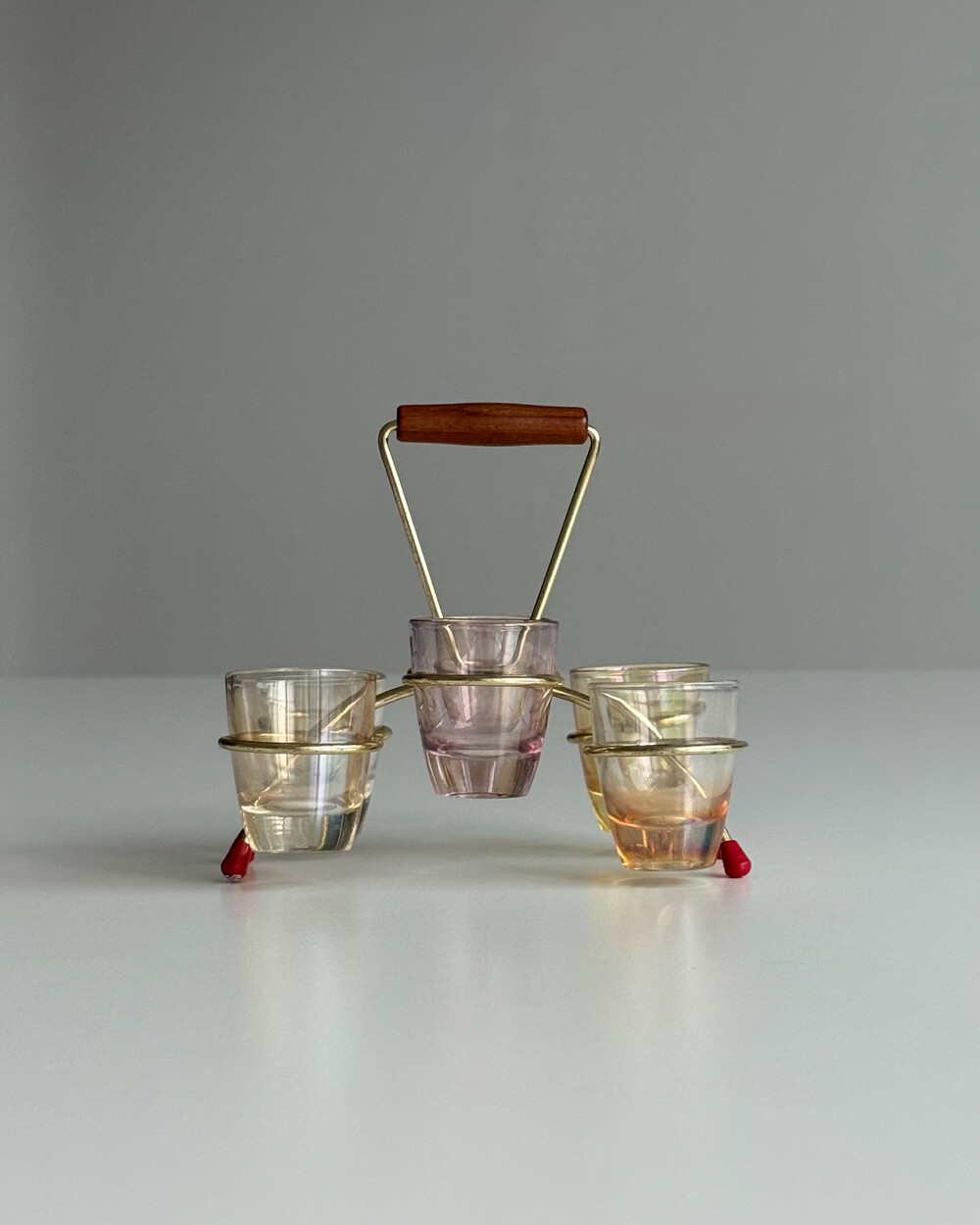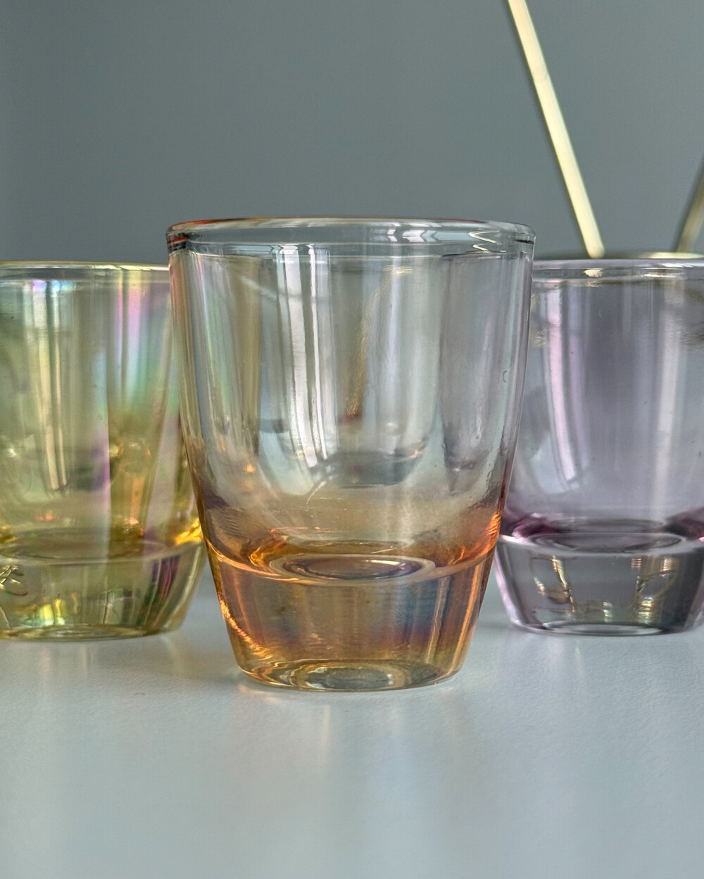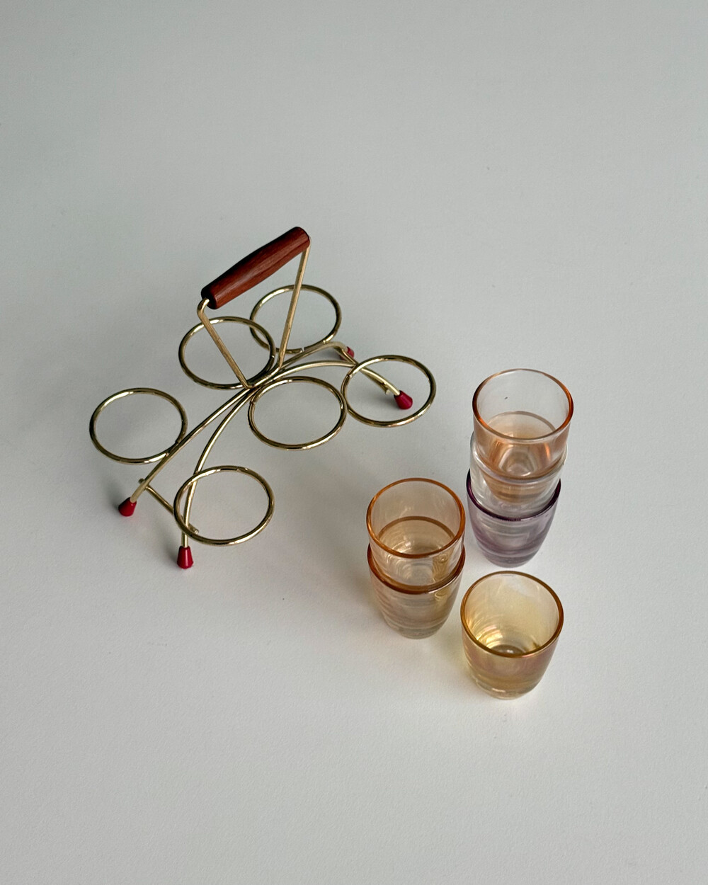 1960년대 동독에서 제작된 빈티지 쁘띠 글라스 잔 세트입니다. 당시 독일에서 손님 접대용으로 식전주 또는 디저트 리큐어를 소량씩 즐기기 위한 슈냅스(Schnaps) 잔으로 사용되었습니다. 앙증맞은 사이즈(약 30ml)로 소주잔이나 리큐르잔으로 사용은 물론, 작은 디저트나 앙트레를 담아 서빙하는 용도로 활용하기에도 좋습니다. 컬러감 있는 유리잔 하나하나가 독특한 존재감을 지니고 있어 테이블 위에 놓기만 해도 특별한 분위기를 더해주는 매력적인 오브제가 되어줍니다. 2가지 타입의 디자인으로 입고되었습니다.