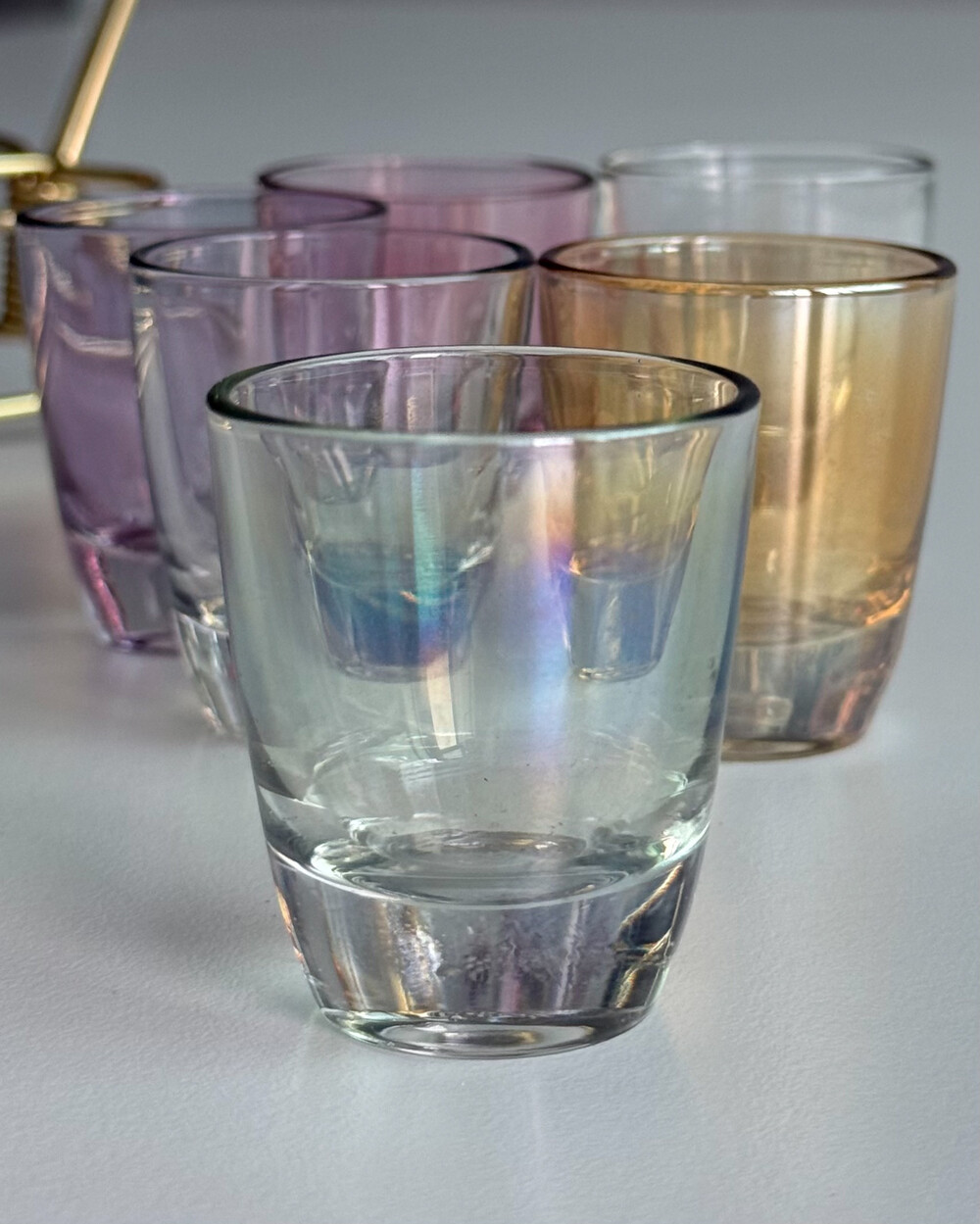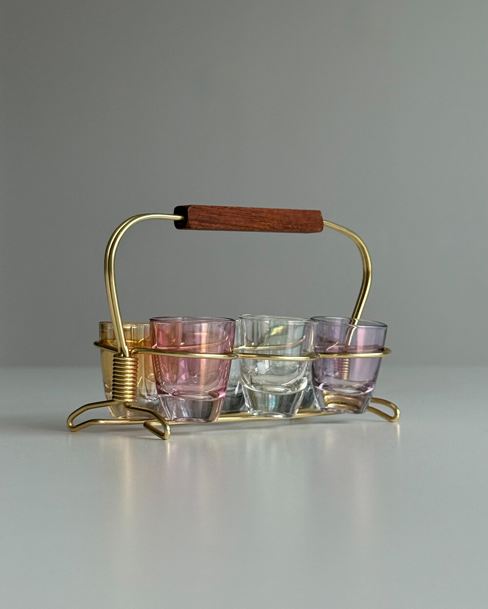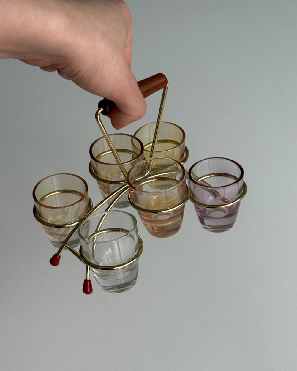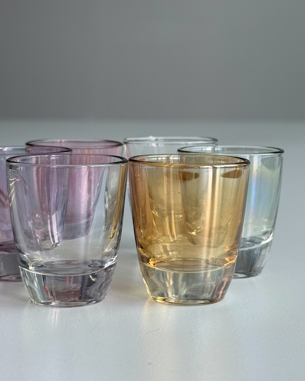1960년대 동독에서 제작된 빈티지 쁘띠 글라스 잔 세트입니다. 당시 독일에서 손님 접대용으로 식전주 또는 디저트 리큐어를 소량씩 즐기기 위한 슈냅스(Schnaps) 잔으로 사용되었습니다. 앙증맞은 사이즈(약 30ml)로 소주잔이나 리큐르잔으로 사용은 물론, 작은 디저트나 앙트레를 담아 서빙하는 용도로 활용하기에도 좋습니다. 컬러감 있는 유리잔 하나하나가 독특한 존재감을 지니고 있어 테이블 위에 놓기만 해도 특별한 분위기를 더해주는 매력적인 오브제가 되어줍니다. 2가지 타입의 디자인으로 입고되었습니다.
