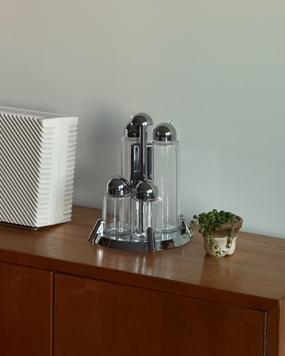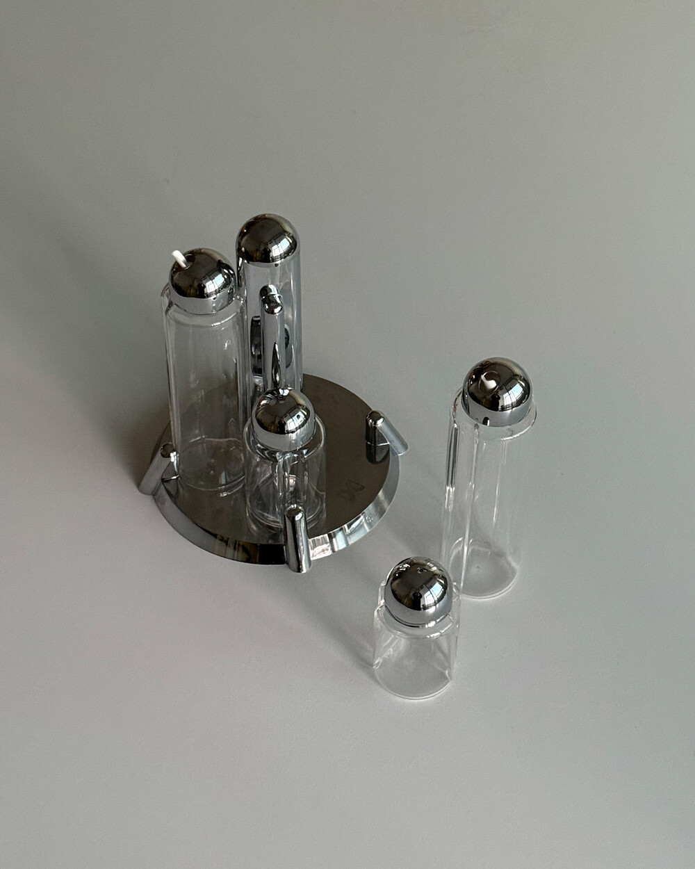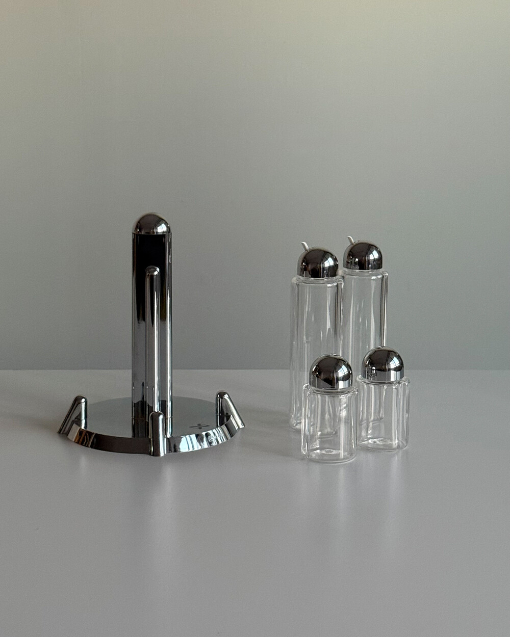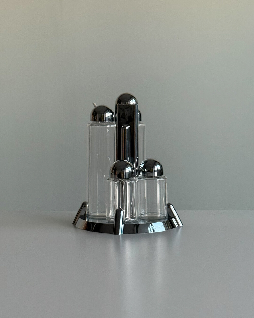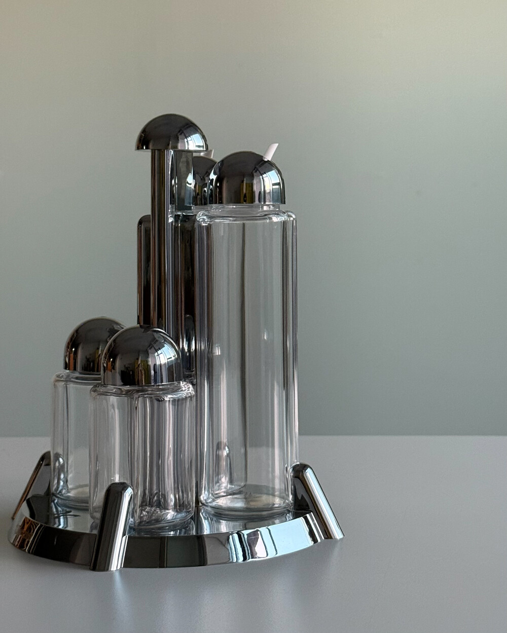 1980년대 A.Rossari에 의해 디자인된 구찌니(GUZZINI)에서 생산된 주방 크루엣 세트입니다. 구찌니는 1912년 이탈리아에서 시작된 브랜드로, 인체에 무해한 특수 고급 아크릴 제작 기술로 유명한 기업으로, 현재까지도 주방용품, 시계, 조명 등 다양한 제품을 생산해내고 있습니다. ‚룩(Look)‘ 이라는 제품명에 걸맞게 거울을 활용한 디자인으로, 구찌니 만의 모던한 디자인이 돋보이는 제품입니다. 긴 보틀 2개, 짧은 보틀 2개, 홀더 1개로 구성되어있습니다.