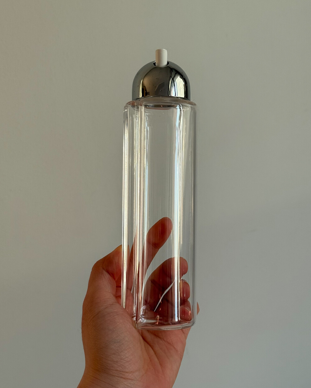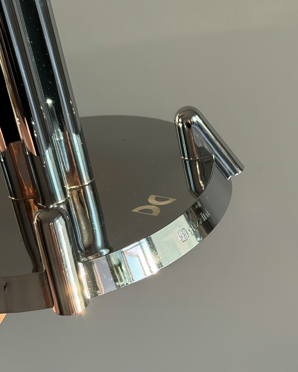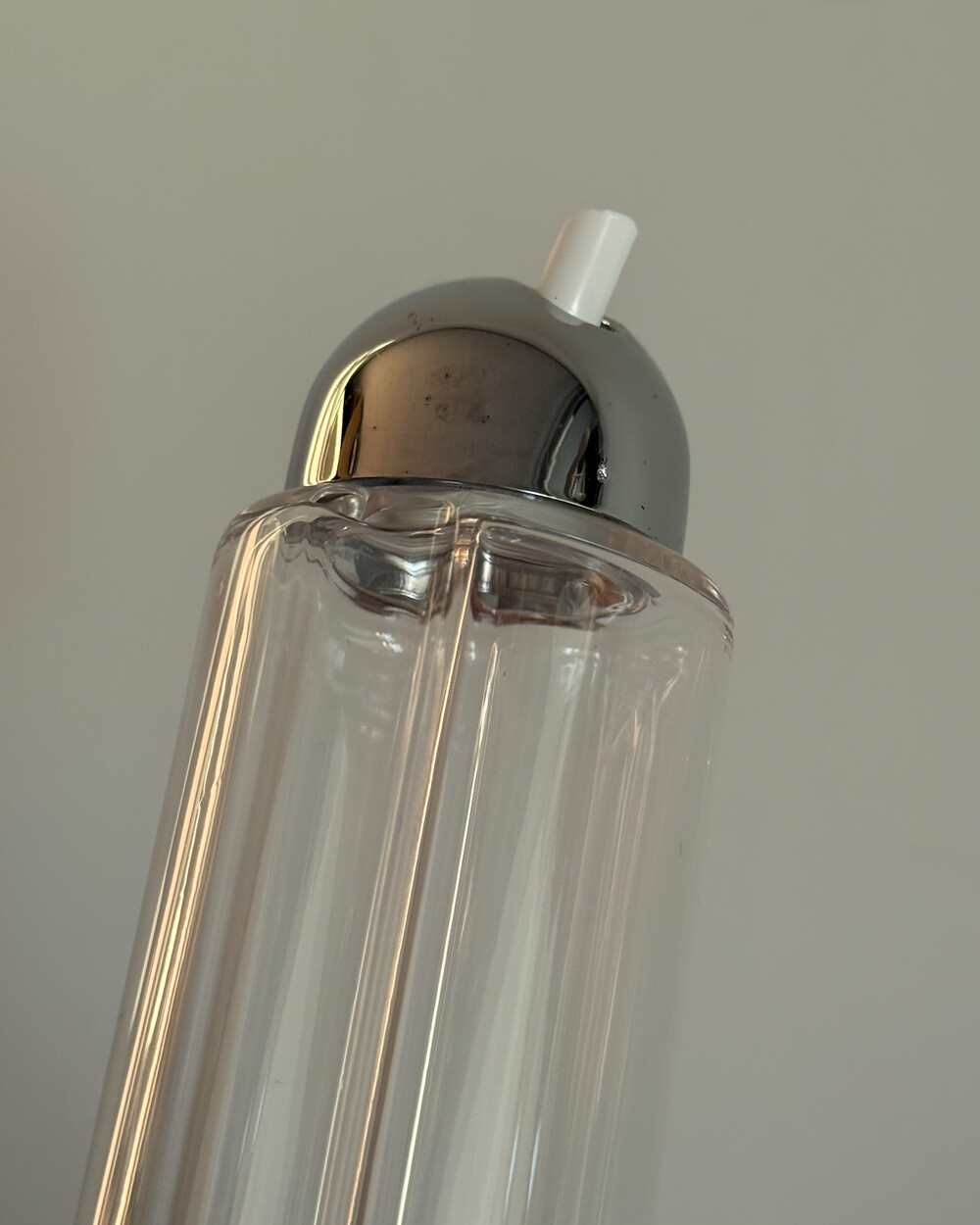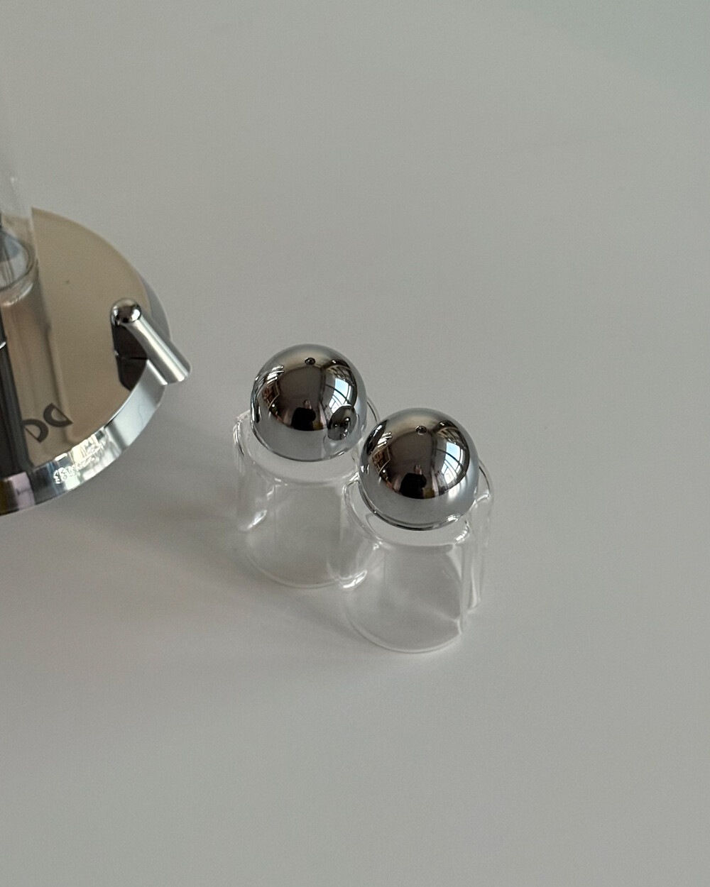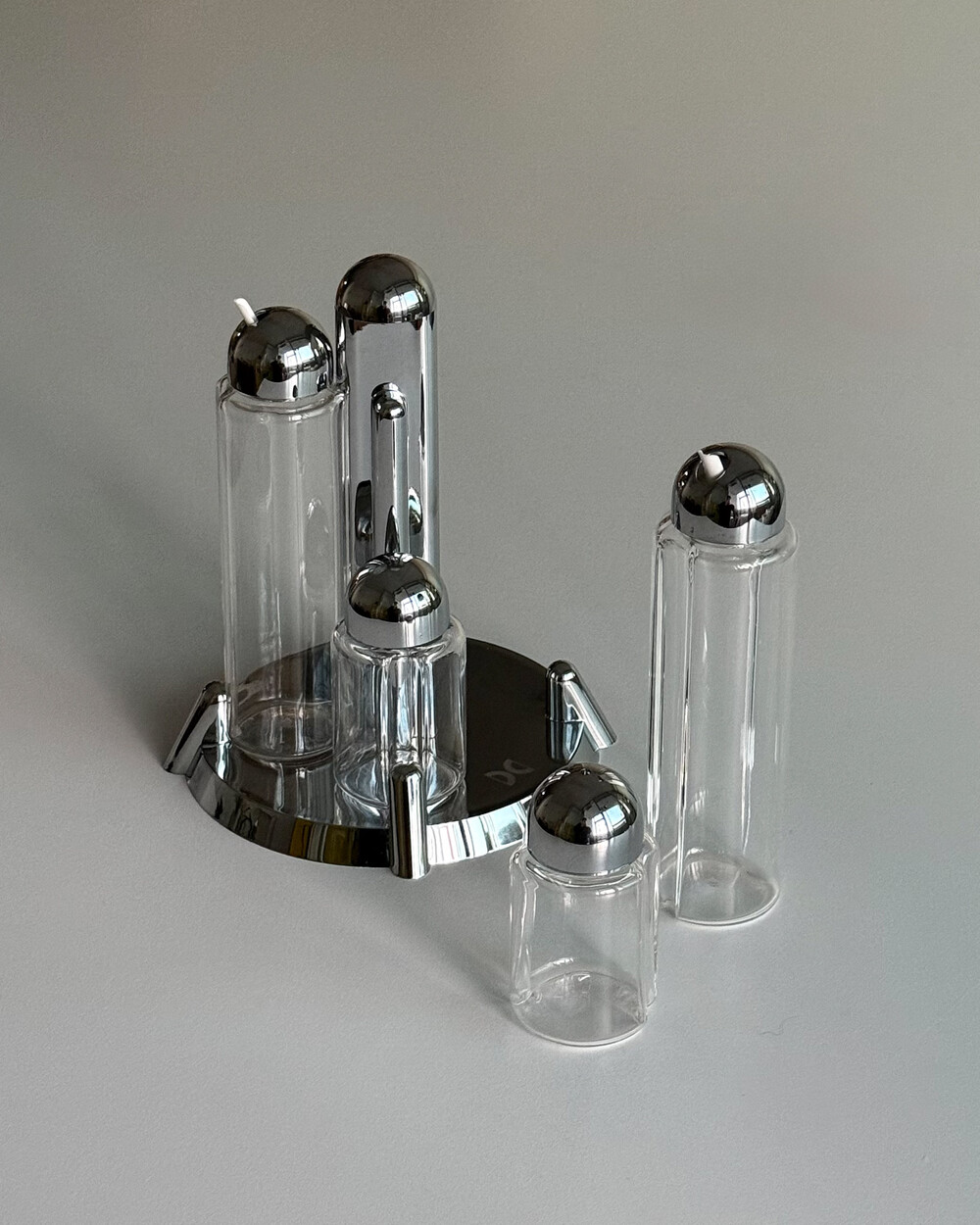 1980년대 A.Rossari에 의해 디자인된 구찌니(GUZZINI)에서 생산된 주방 크루엣 세트입니다. 구찌니는 1912년 이탈리아에서 시작된 브랜드로, 인체에 무해한 특수 고급 아크릴 제작 기술로 유명한 기업으로, 현재까지도 주방용품, 시계, 조명 등 다양한 제품을 생산해내고 있습니다. ‚룩(Look)‘ 이라는 제품명에 걸맞게 거울을 활용한 디자인으로, 구찌니 만의 모던한 디자인이 돋보이는 제품입니다. 긴 보틀 2개, 짧은 보틀 2개, 홀더 1개로 구성되어있습니다.