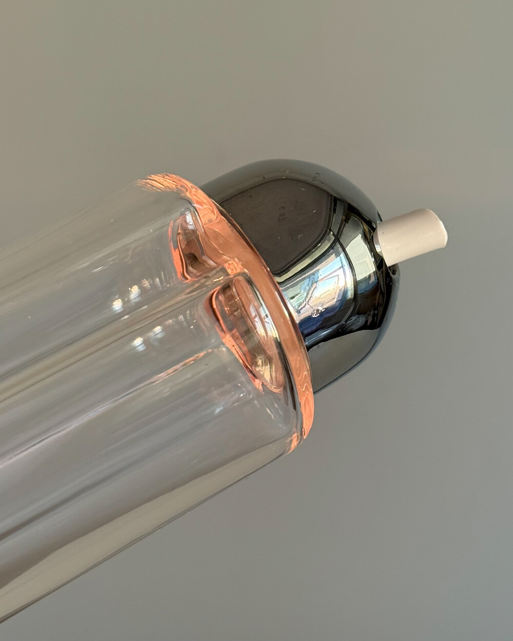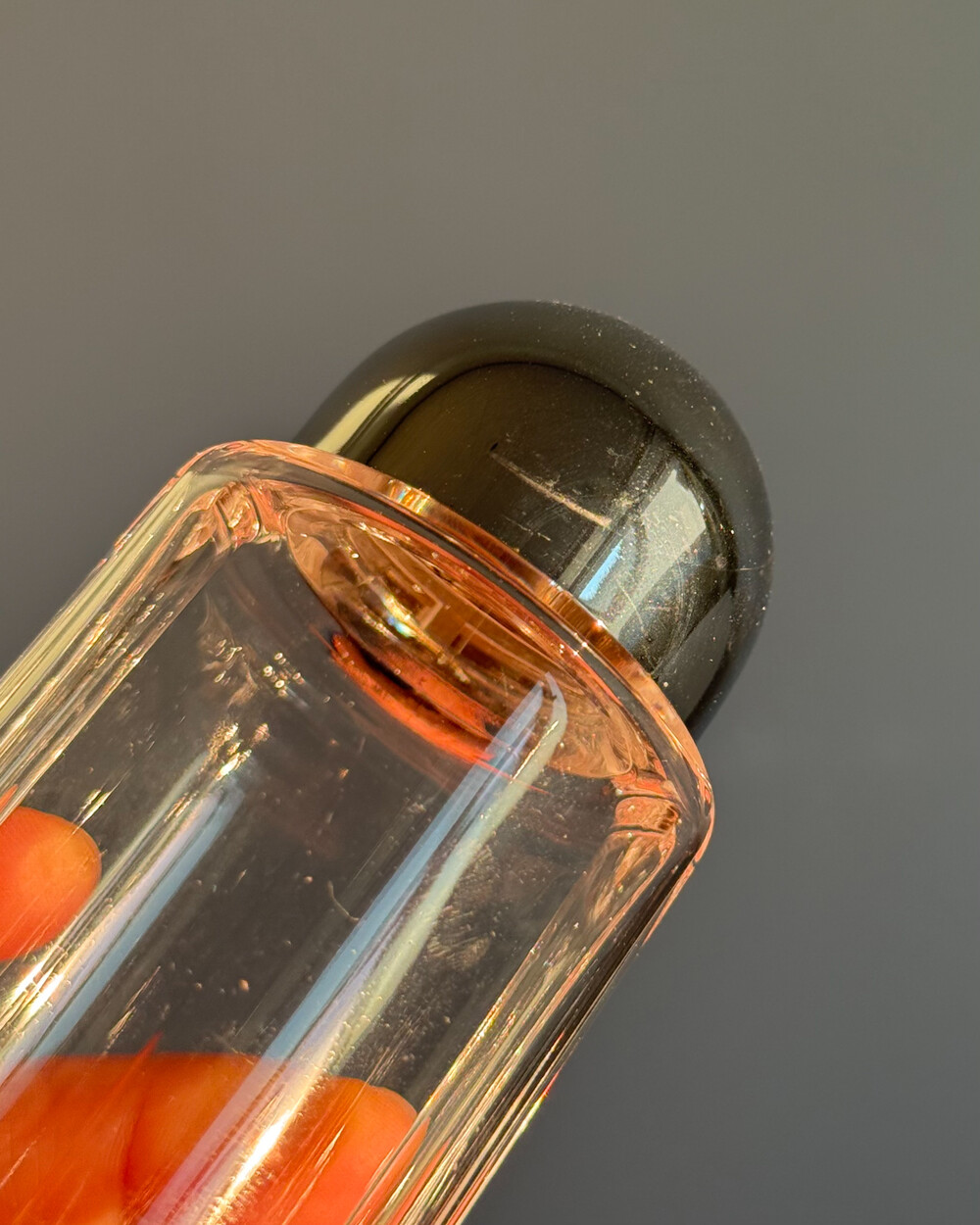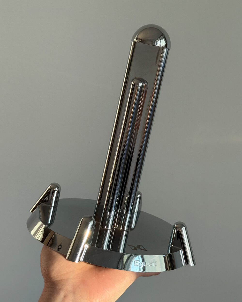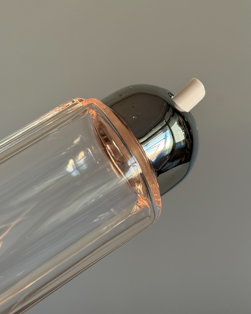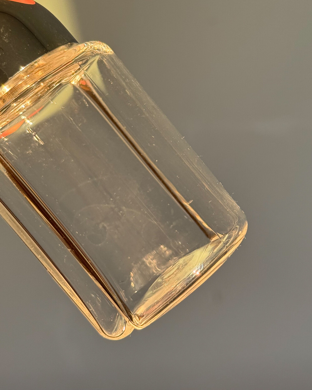 1980년대 A.Rossari에 의해 디자인된 구찌니(GUZZINI)에서 생산된 주방 크루엣 세트입니다. 구찌니는 1912년 이탈리아에서 시작된 브랜드로, 인체에 무해한 특수 고급 아크릴 제작 기술로 유명한 기업으로, 현재까지도 주방용품, 시계, 조명 등 다양한 제품을 생산해내고 있습니다. ‚룩(Look)‘ 이라는 제품명에 걸맞게 거울을 활용한 디자인으로, 구찌니 만의 모던한 디자인이 돋보이는 제품입니다. 긴 보틀 2개, 짧은 보틀 2개, 홀더 1개로 구성되어있습니다.