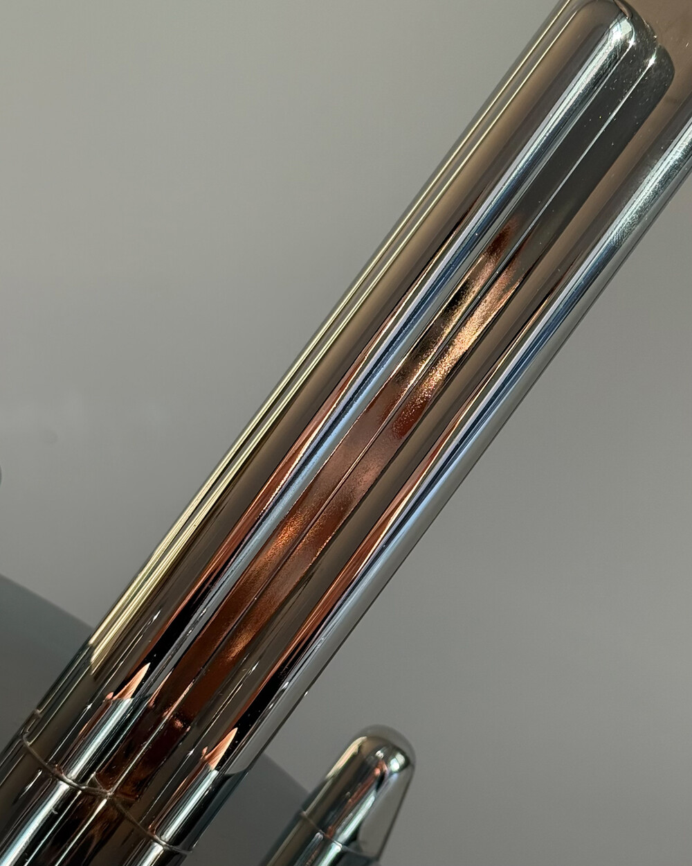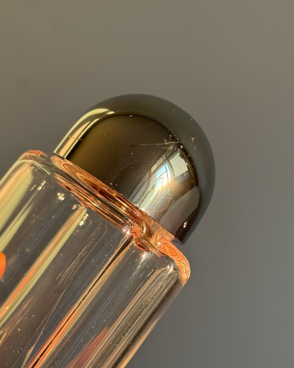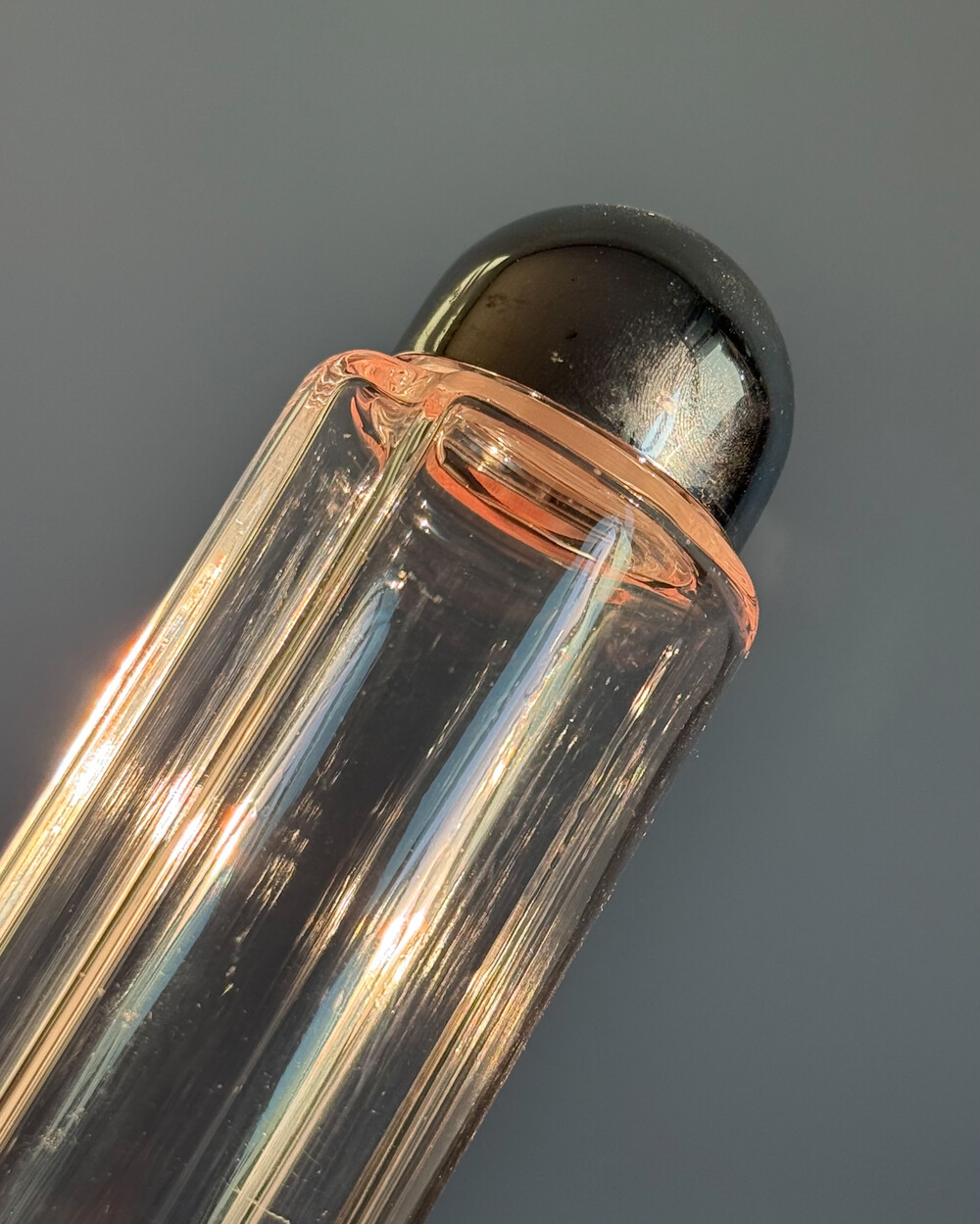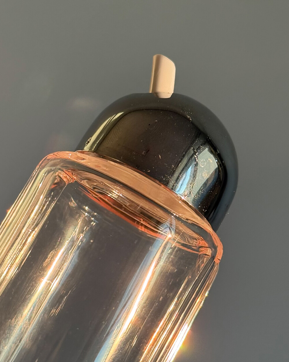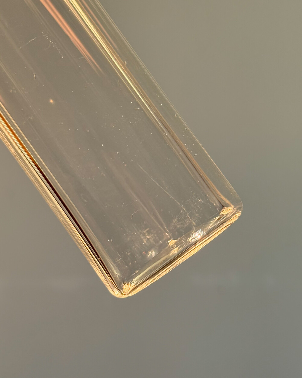 1980년대 A.Rossari에 의해 디자인된 구찌니(GUZZINI)에서 생산된 주방 크루엣 세트입니다. 구찌니는 1912년 이탈리아에서 시작된 브랜드로, 인체에 무해한 특수 고급 아크릴 제작 기술로 유명한 기업으로, 현재까지도 주방용품, 시계, 조명 등 다양한 제품을 생산해내고 있습니다. ‚룩(Look)‘ 이라는 제품명에 걸맞게 거울을 활용한 디자인으로, 구찌니 만의 모던한 디자인이 돋보이는 제품입니다. 긴 보틀 2개, 짧은 보틀 2개, 홀더 1개로 구성되어있습니다.