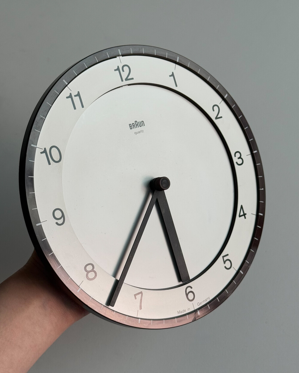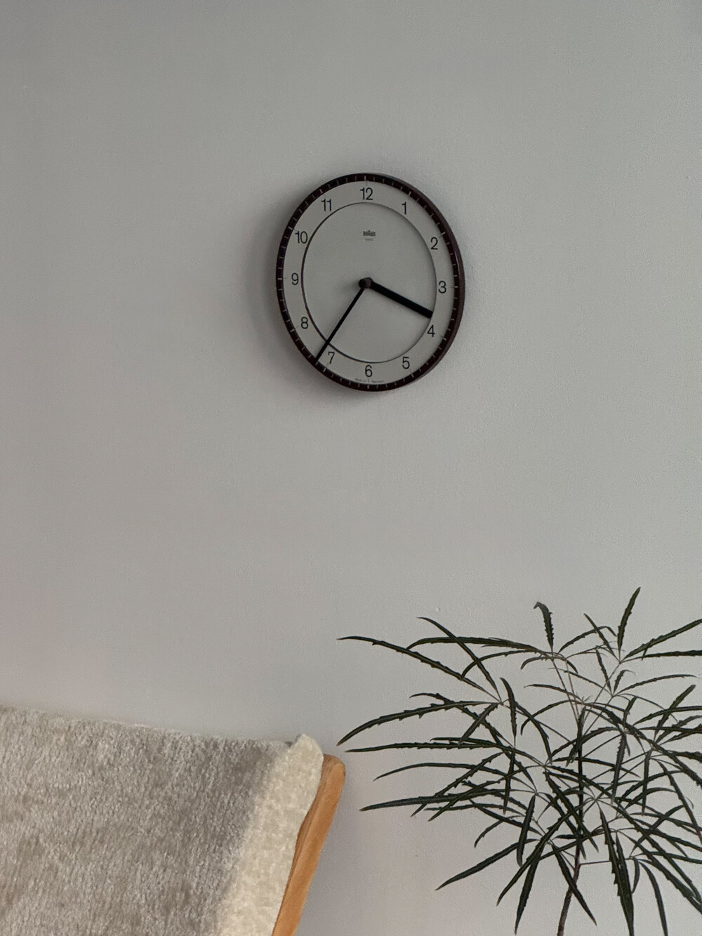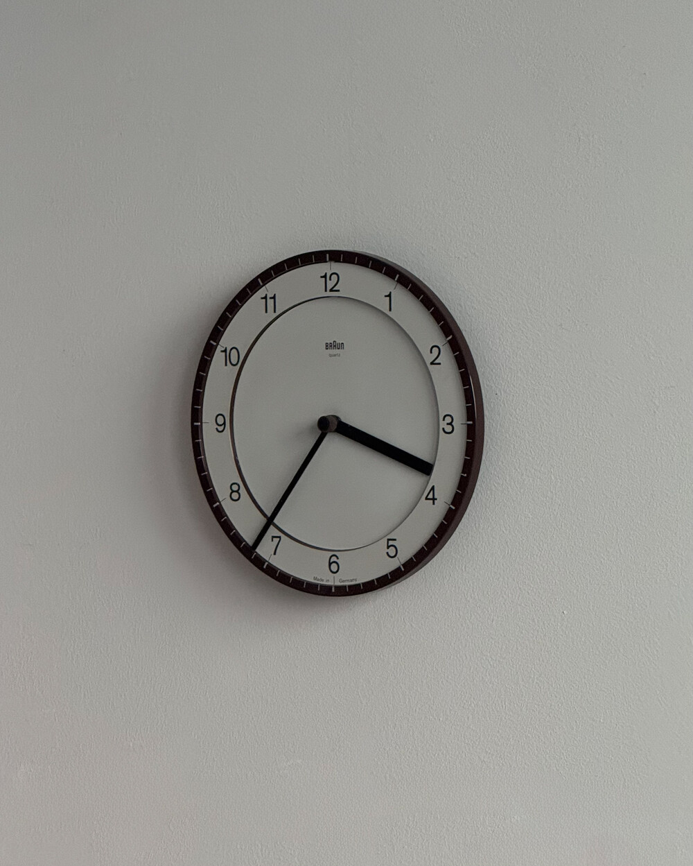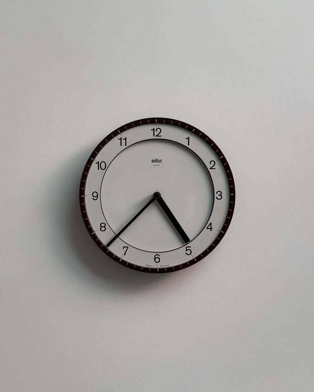 1980년대 Dietrich Lubs에 의해 디자인 된 브라운 사의 ABK 30 벽시계 입니다. 브라운의 미니멀리즘 철학이 잘 나타나는 대표 모델 중 하나로, 현재 단종되어 더욱 소장가치가 높은 모델입니다. 다양한 컬러로 출시되었으며, 해당 제품은 자연스럽게 태닝된 버터 컬러 프레임으로 이루어져 있습니다. 전면부 커버가 없는 디자인으로 중앙의 레버를 돌려 시간을 조정할 수 있습니다.