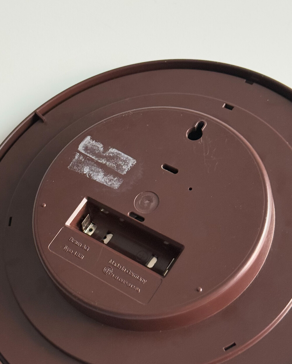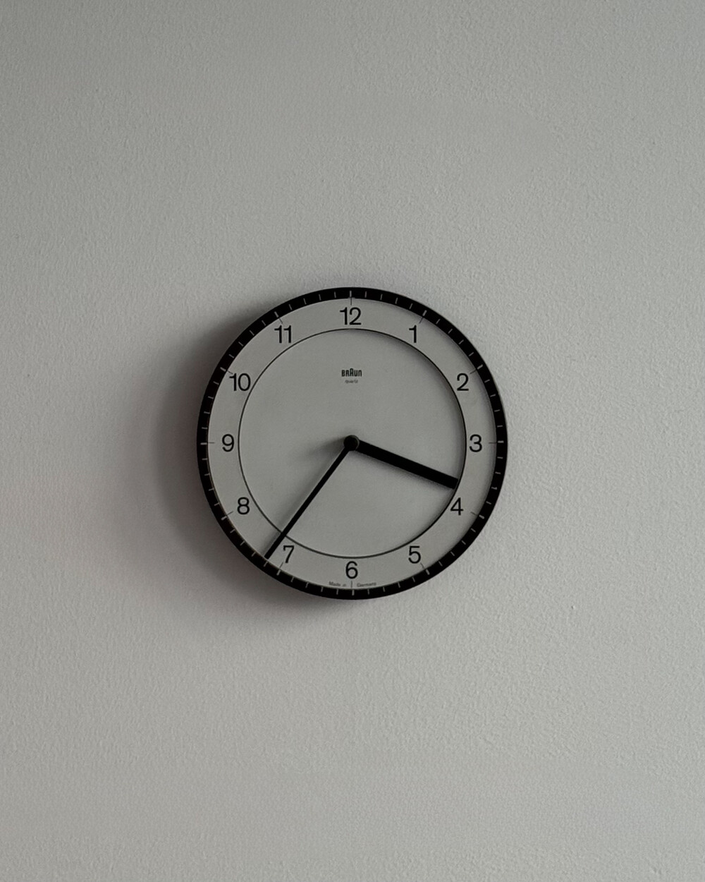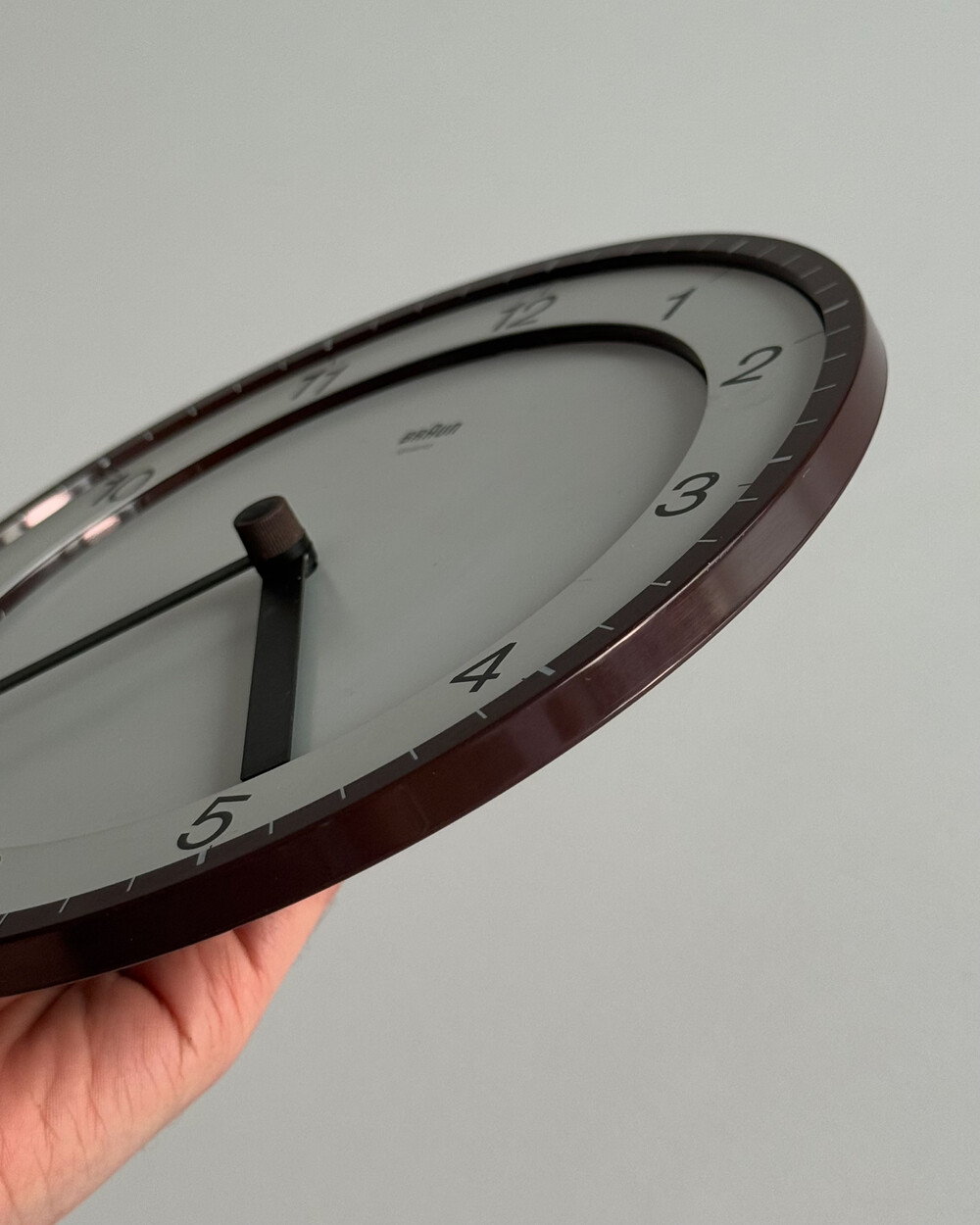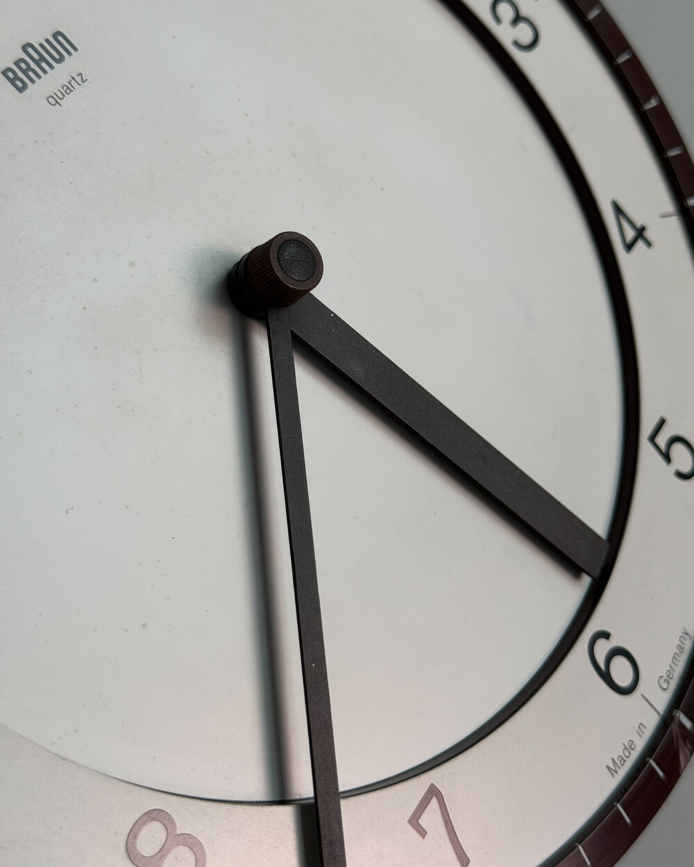 1980년대 Dietrich Lubs에 의해 디자인 된 브라운 사의 ABK 30 벽시계 입니다. 브라운의 미니멀리즘 철학이 잘 나타나는 대표 모델 중 하나로, 현재 단종되어 더욱 소장가치가 높은 모델입니다. 다양한 컬러로 출시되었으며, 해당 제품은 자연스럽게 태닝된 버터 컬러 프레임으로 이루어져 있습니다. 전면부 커버가 없는 디자인으로 중앙의 레버를 돌려 시간을 조정할 수 있습니다.