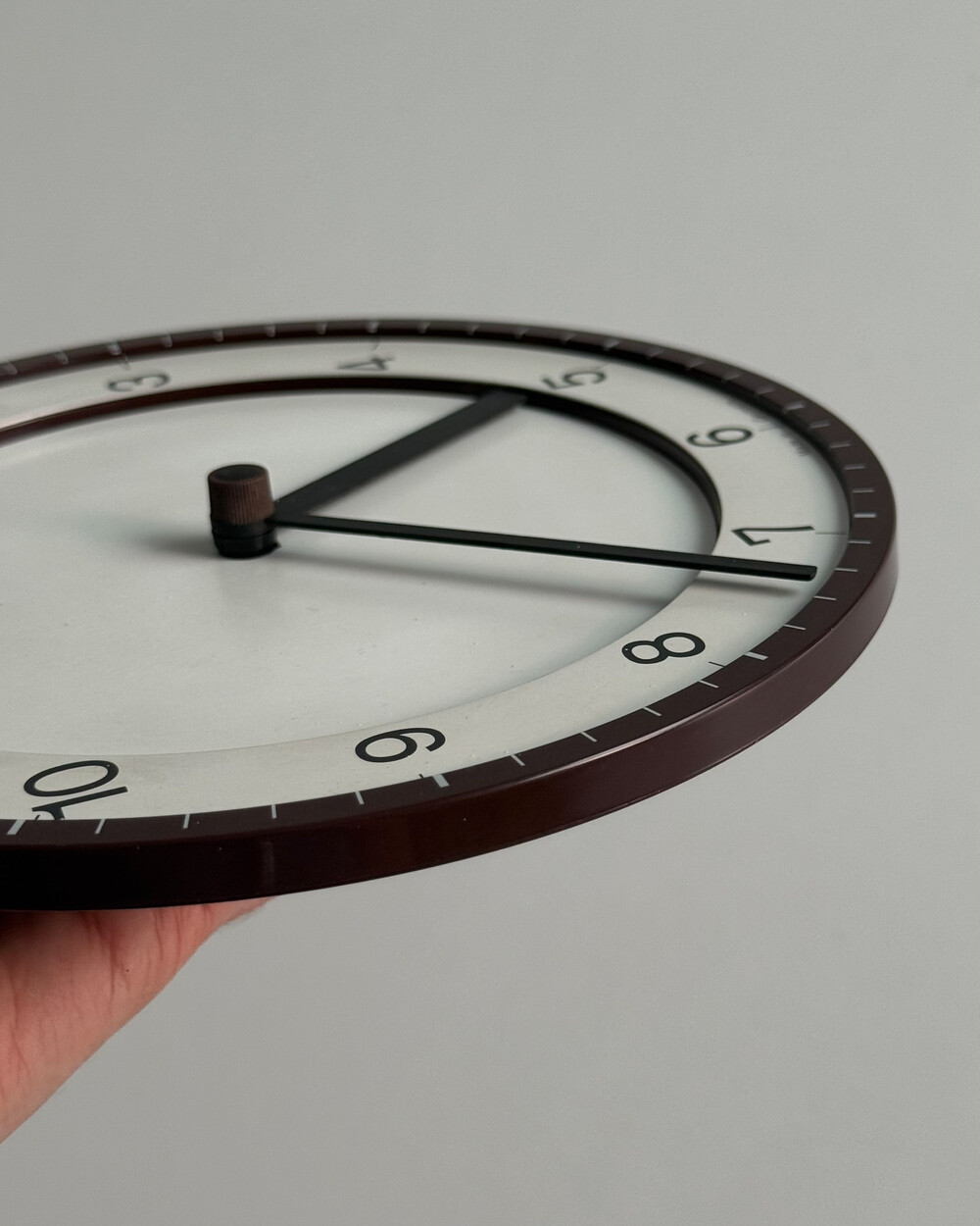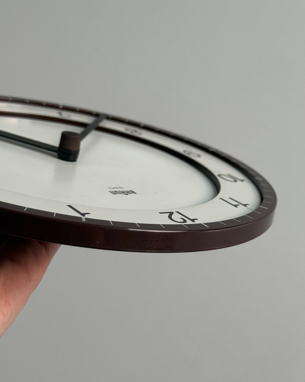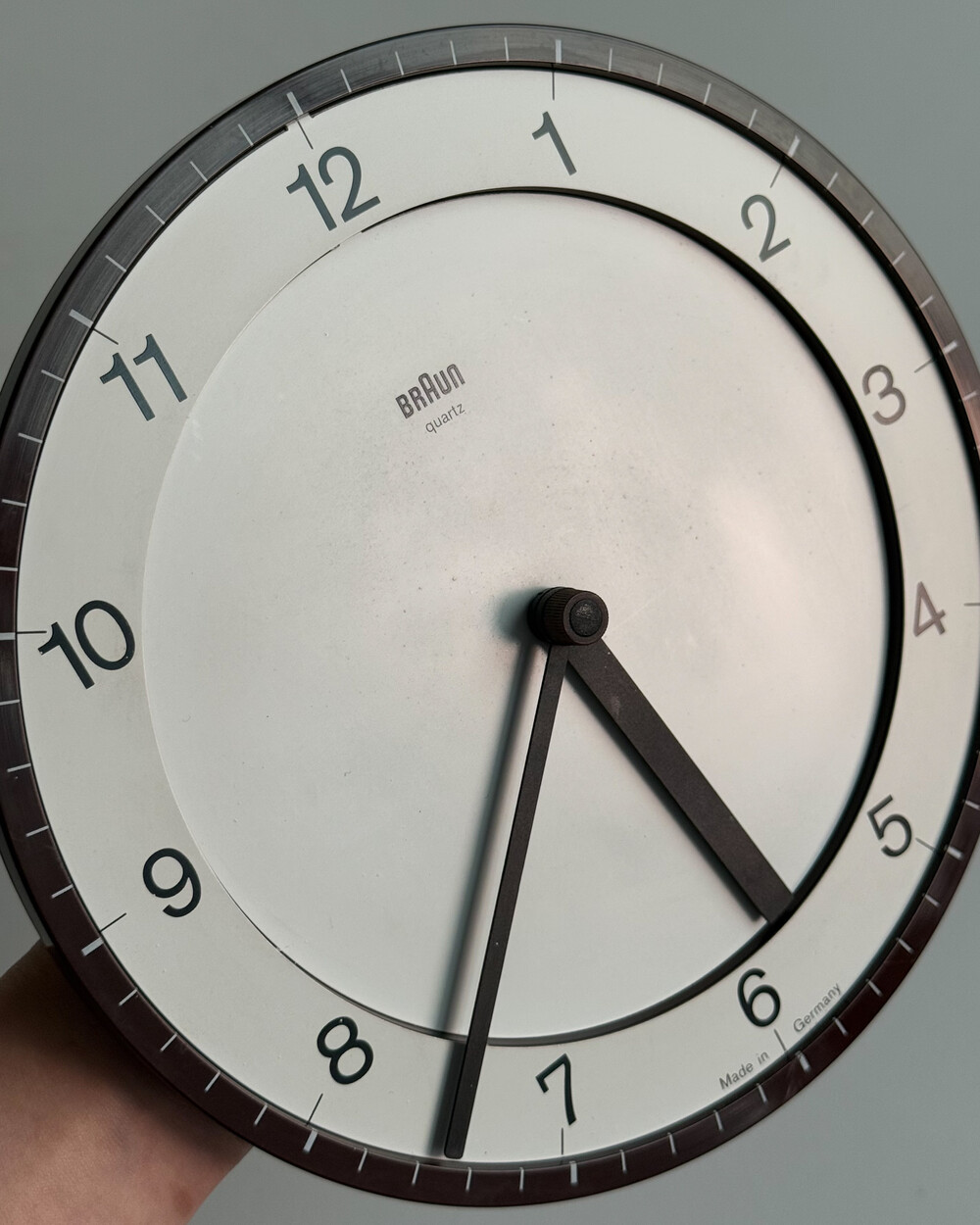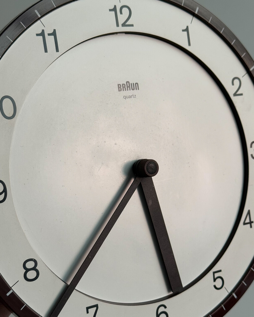 1980년대 Dietrich Lubs에 의해 디자인 된 브라운 사의 ABK 30 벽시계 입니다. 브라운의 미니멀리즘 철학이 잘 나타나는 대표 모델 중 하나로, 현재 단종되어 더욱 소장가치가 높은 모델입니다. 다양한 컬러로 출시되었으며, 해당 제품은 자연스럽게 태닝된 버터 컬러 프레임으로 이루어져 있습니다. 전면부 커버가 없는 디자인으로 중앙의 레버를 돌려 시간을 조정할 수 있습니다.