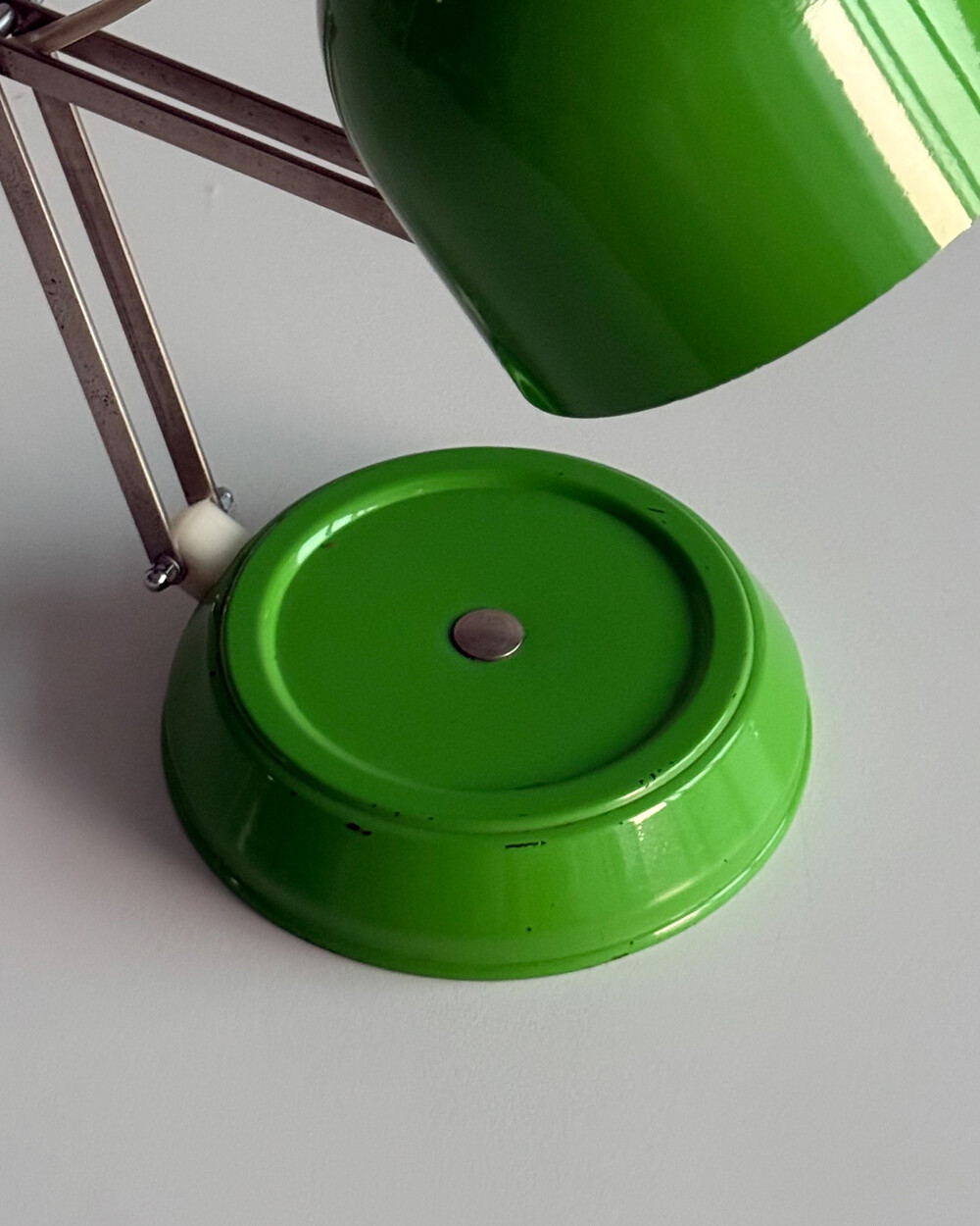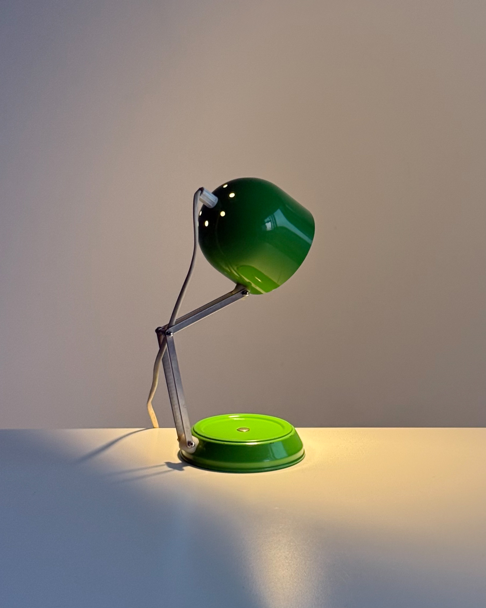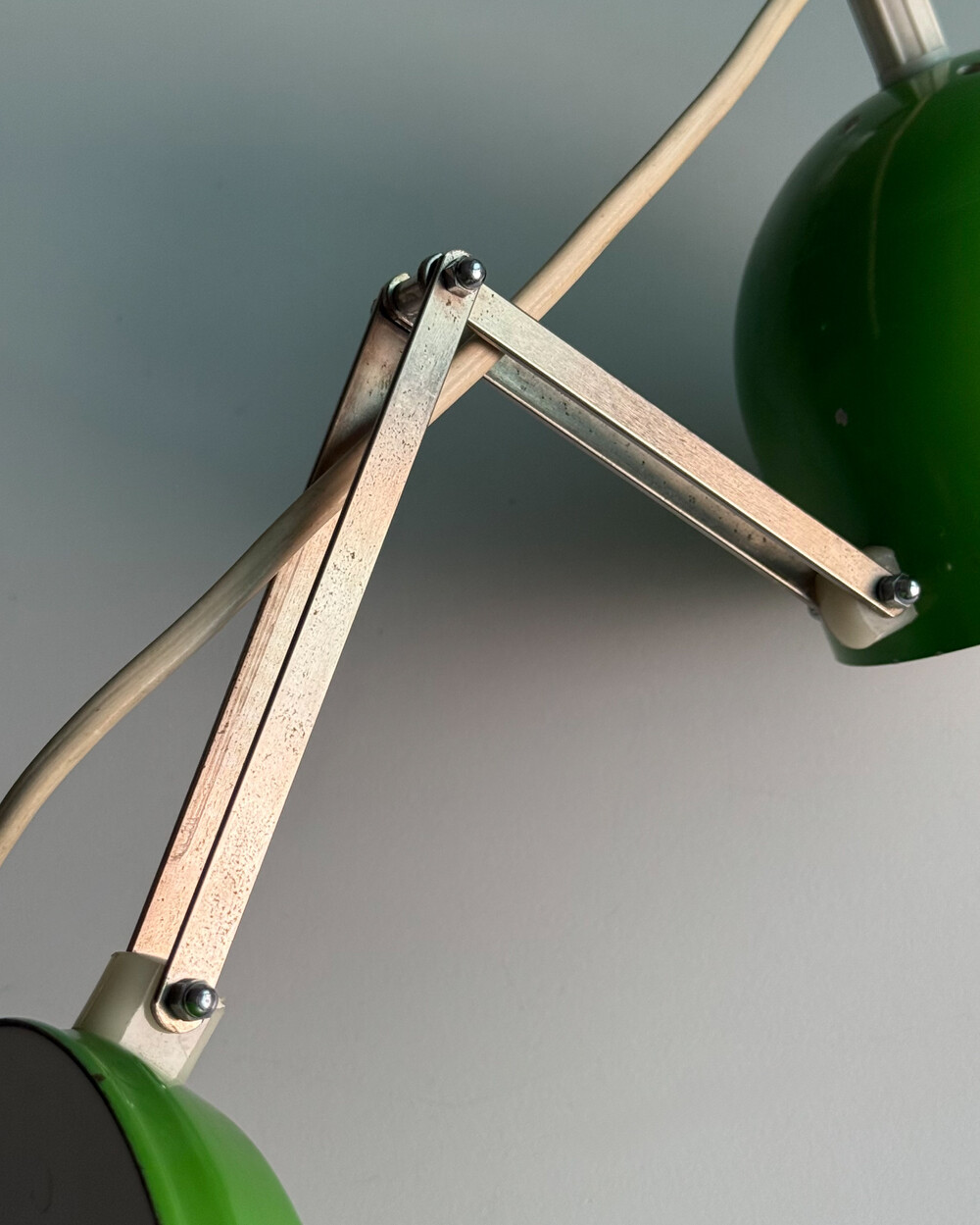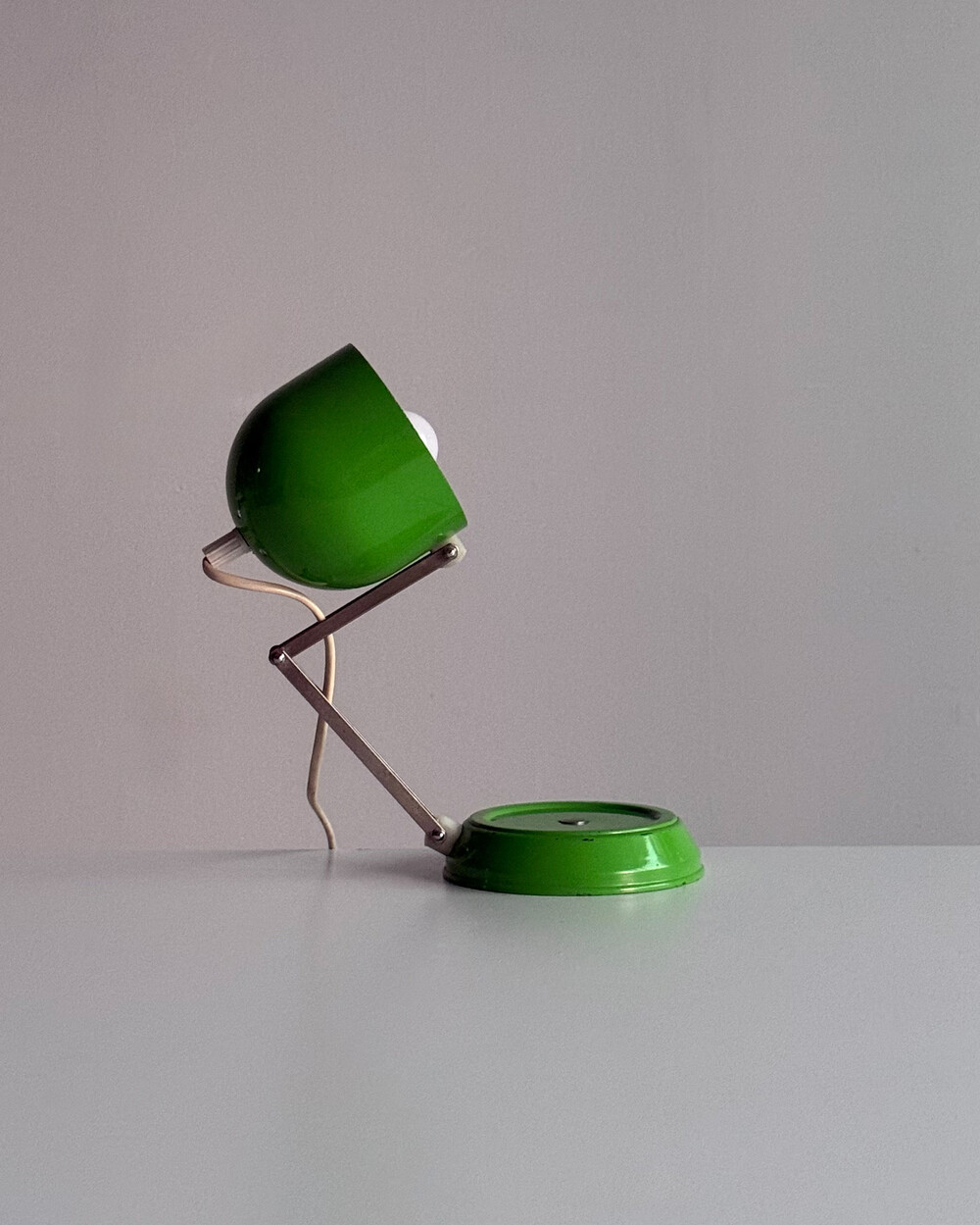 1970년대 독일에서 제작된 빈티지 데스크 램프입니다. 그린 컬러의 원형 메탈 베이스로 이루어져 있습니다. 접이식으로 각도 조절이 자유로운 암 구조로 다양한 연출이 가능합니다.